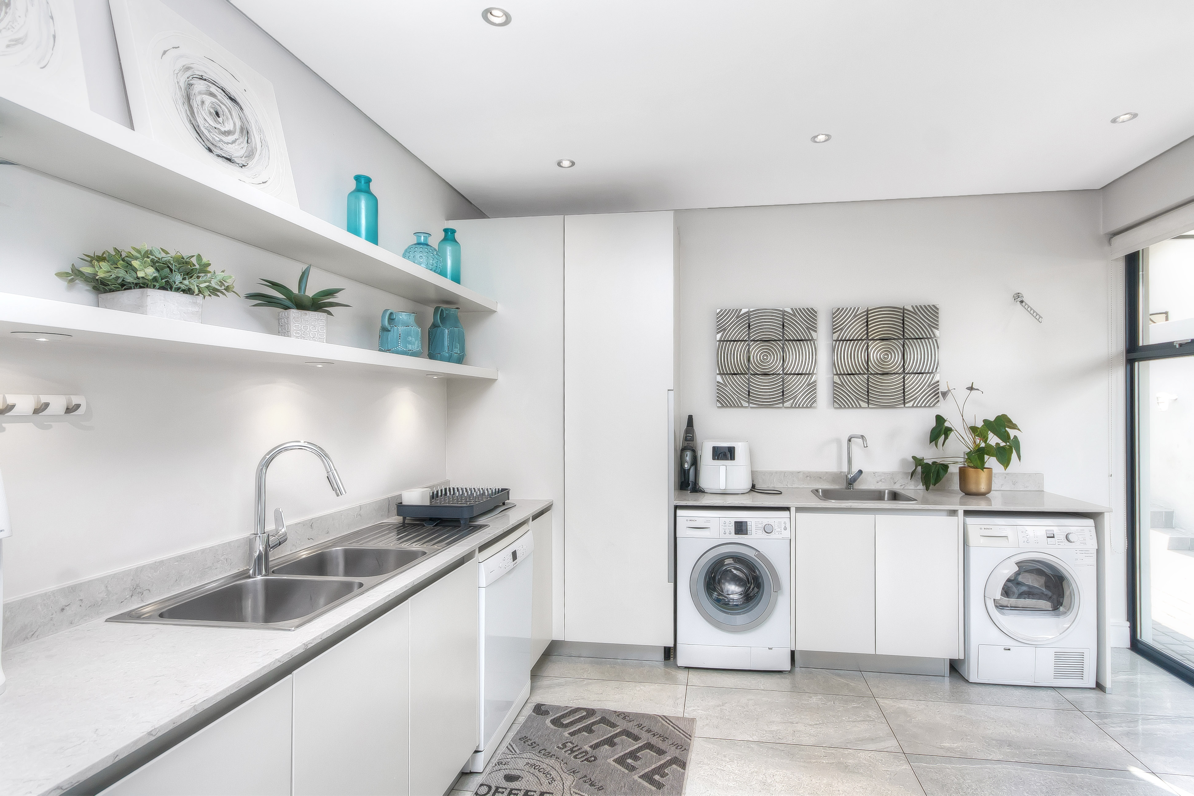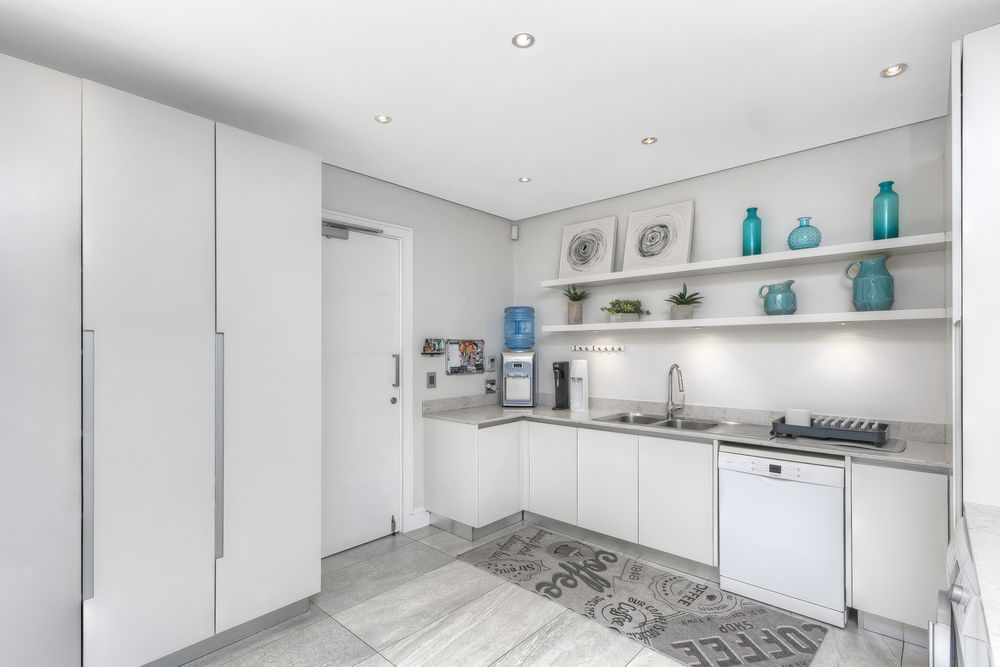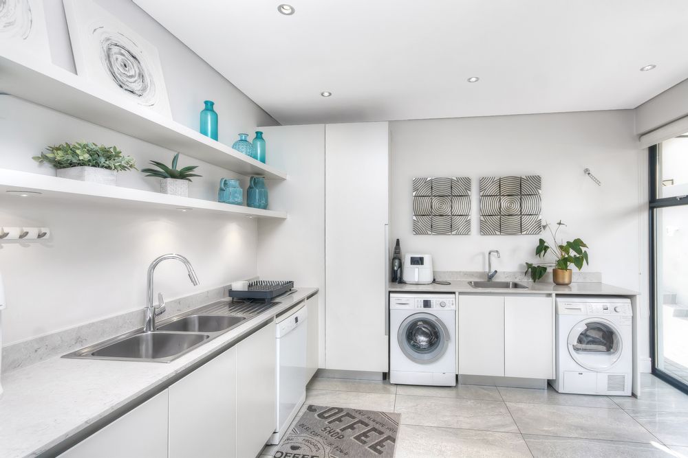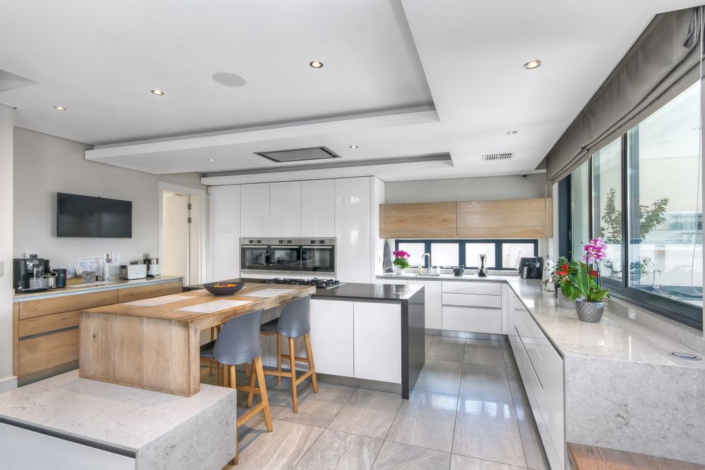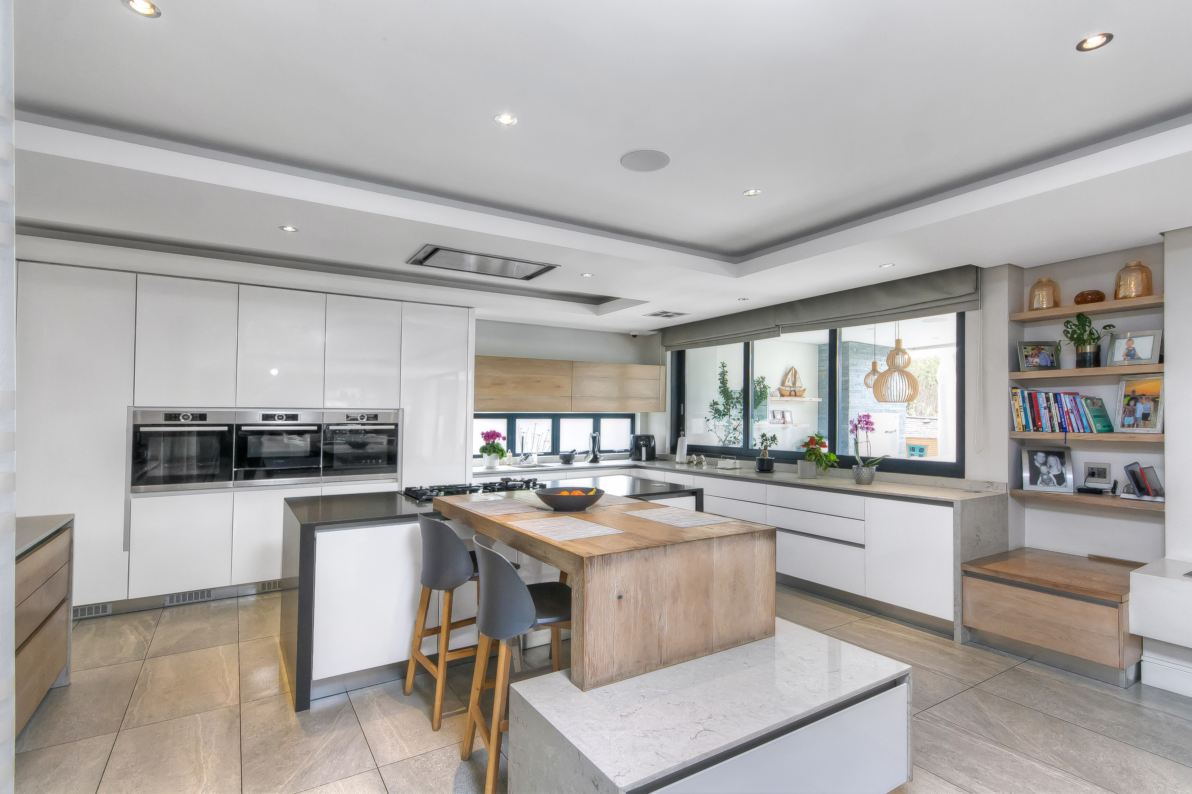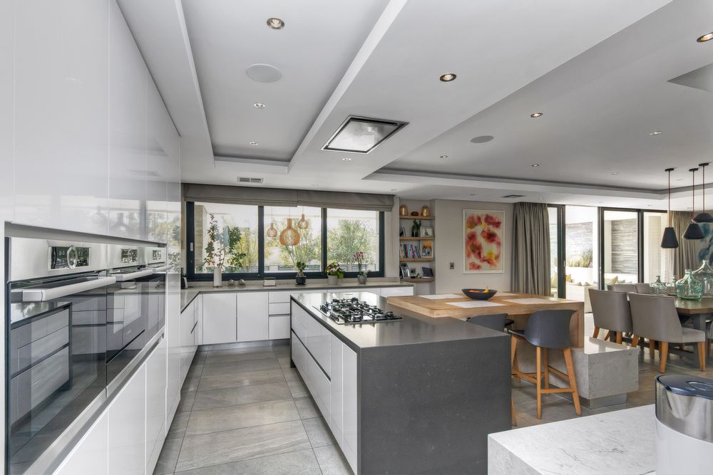 At the heart of the home, the kitchen is a masterpiece of form and function. Designed with sleek white and grey high-gloss cabinetry and a warm wood-inlay breakfast bench, it is fitted with top-tier appliances: dual eye-level convection ovens with warming drawer, integrated microwave, fridge/freezer, and a five-burner gas hob. The adjacent scullery and laundry offer abundant storage, multiple wash bays, and a dry pantry. The dining area, set alongside the kitchen, features a cozy built-in gas fireplace — ensuring everyone stays connected during meals and conversation.