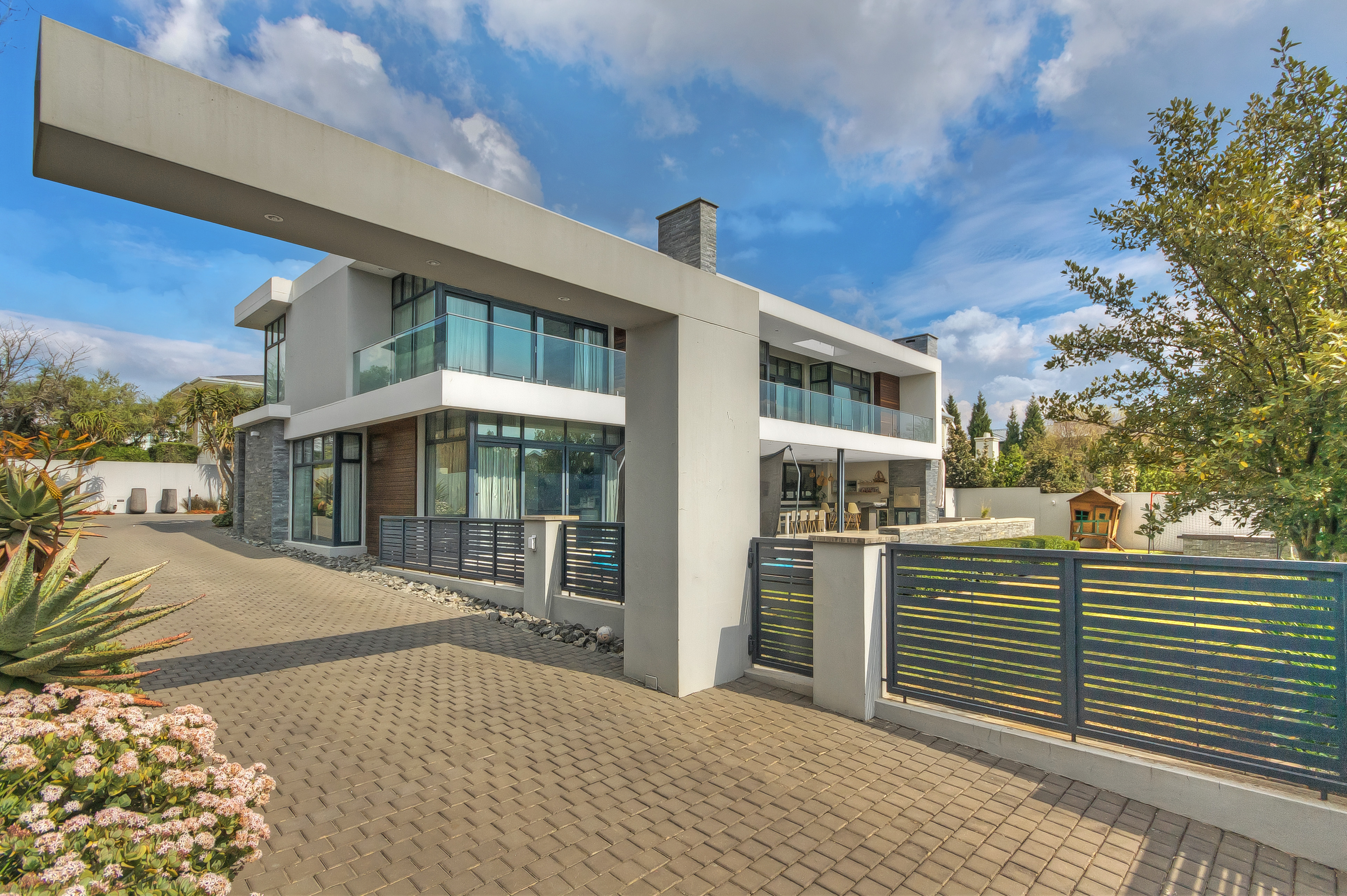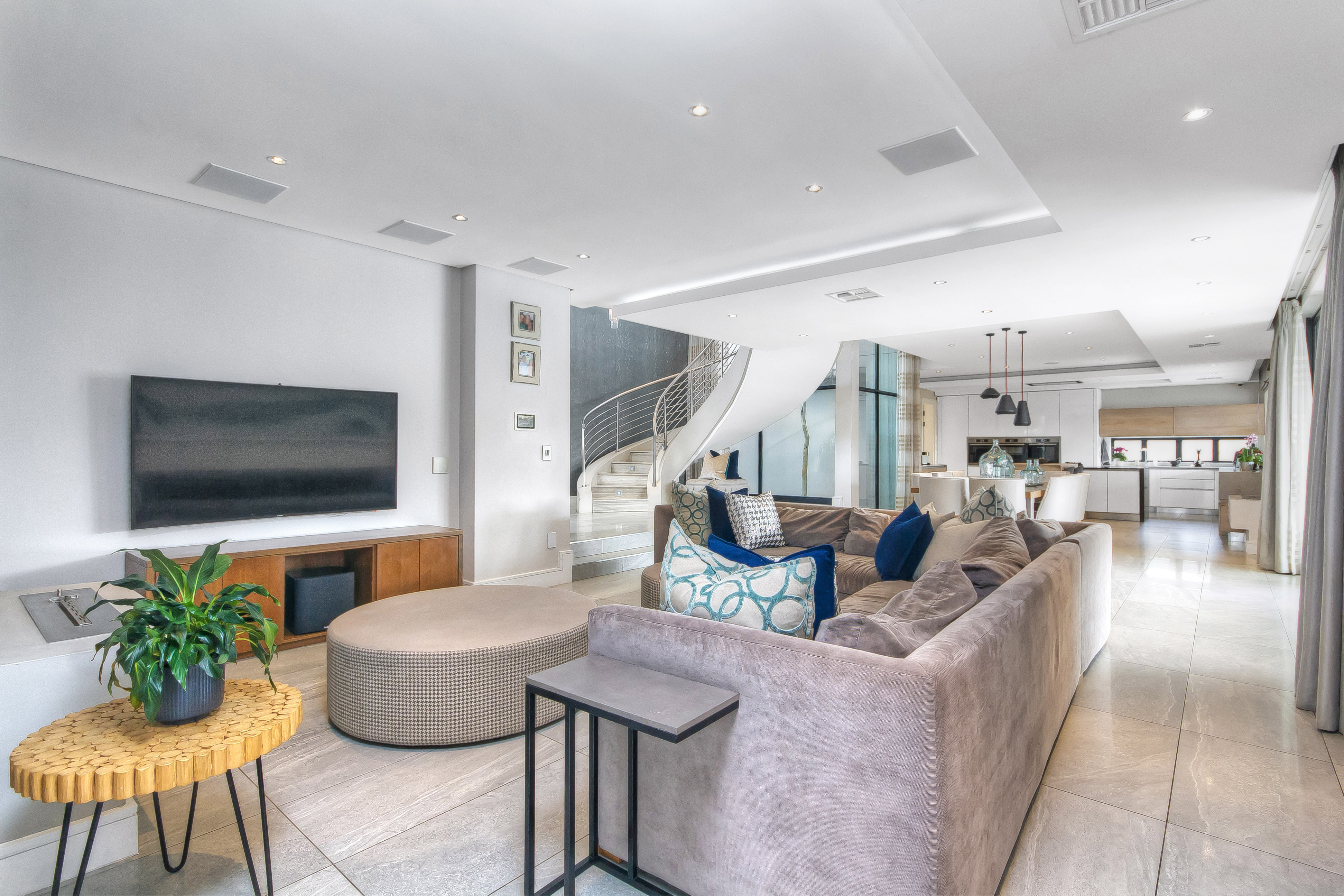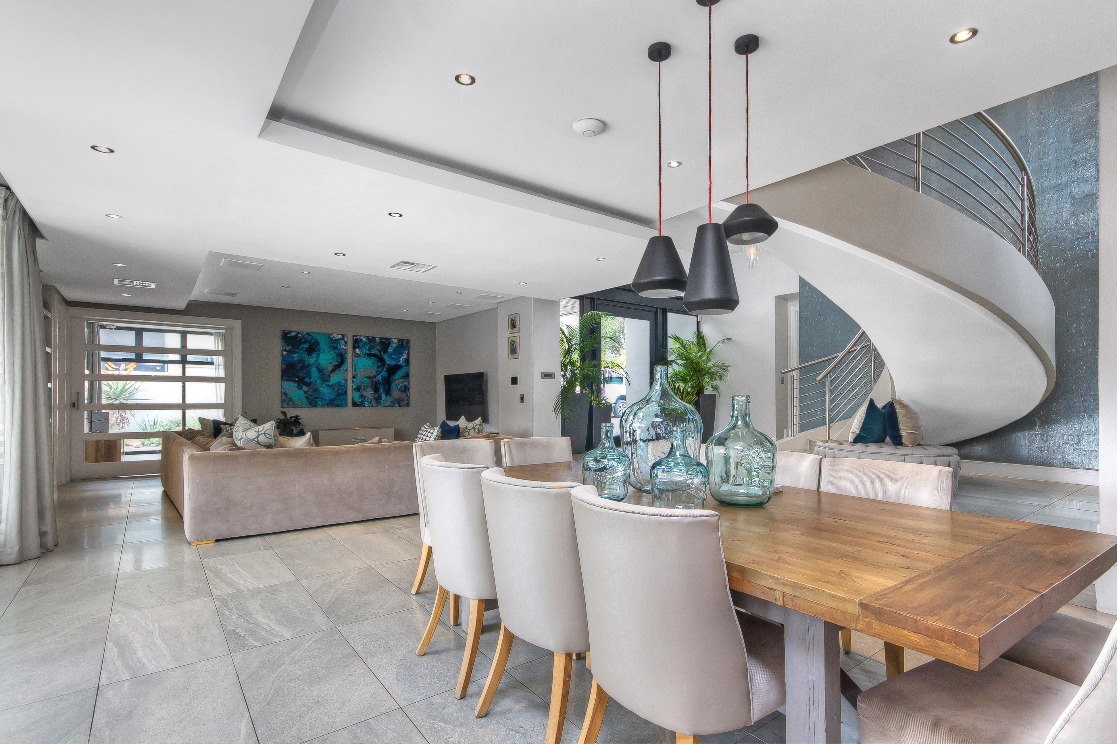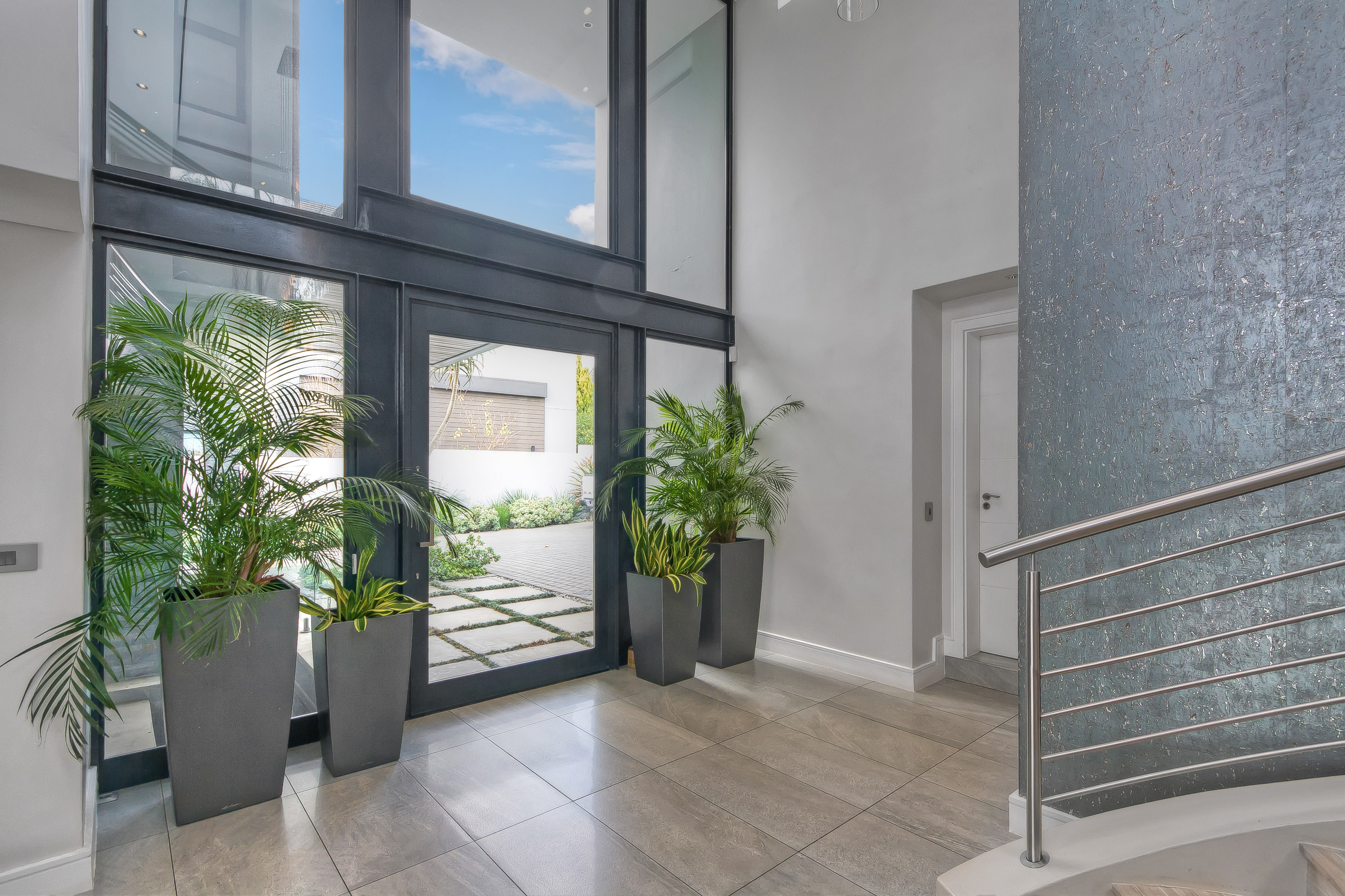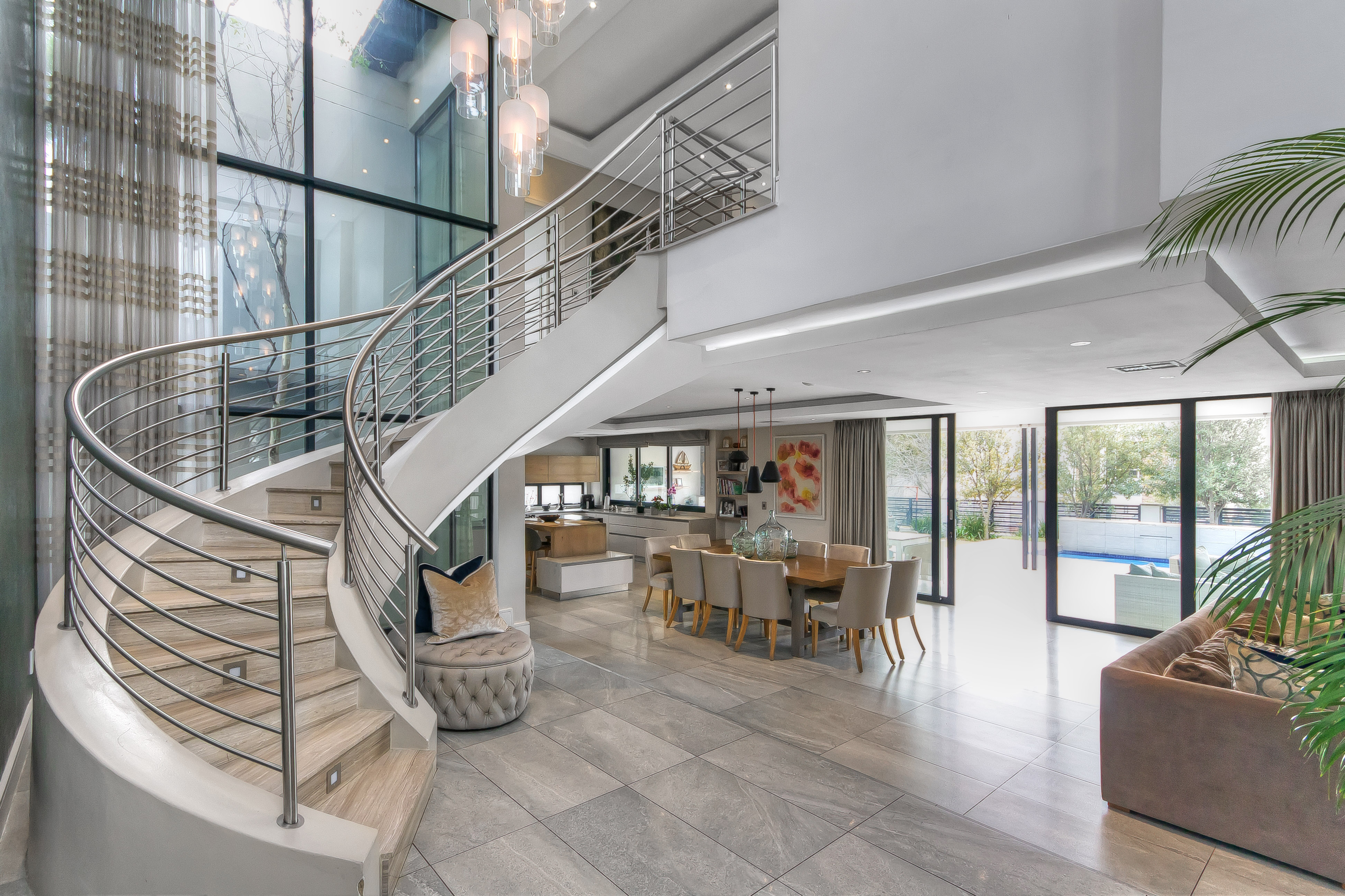 A manicured, covered stepping-stone pathway — framed by a striking stone-clad accent wall — leads you to a grand, metal-framed glass front door. Step inside and be greeted by a breathtaking double-volume entrance hall, where a sweeping spiral staircase commands attention as the centrepiece. From the moment you enter, the uncompromising quality of fittings and finishes is evident, setting this home apart as a true showpiece.