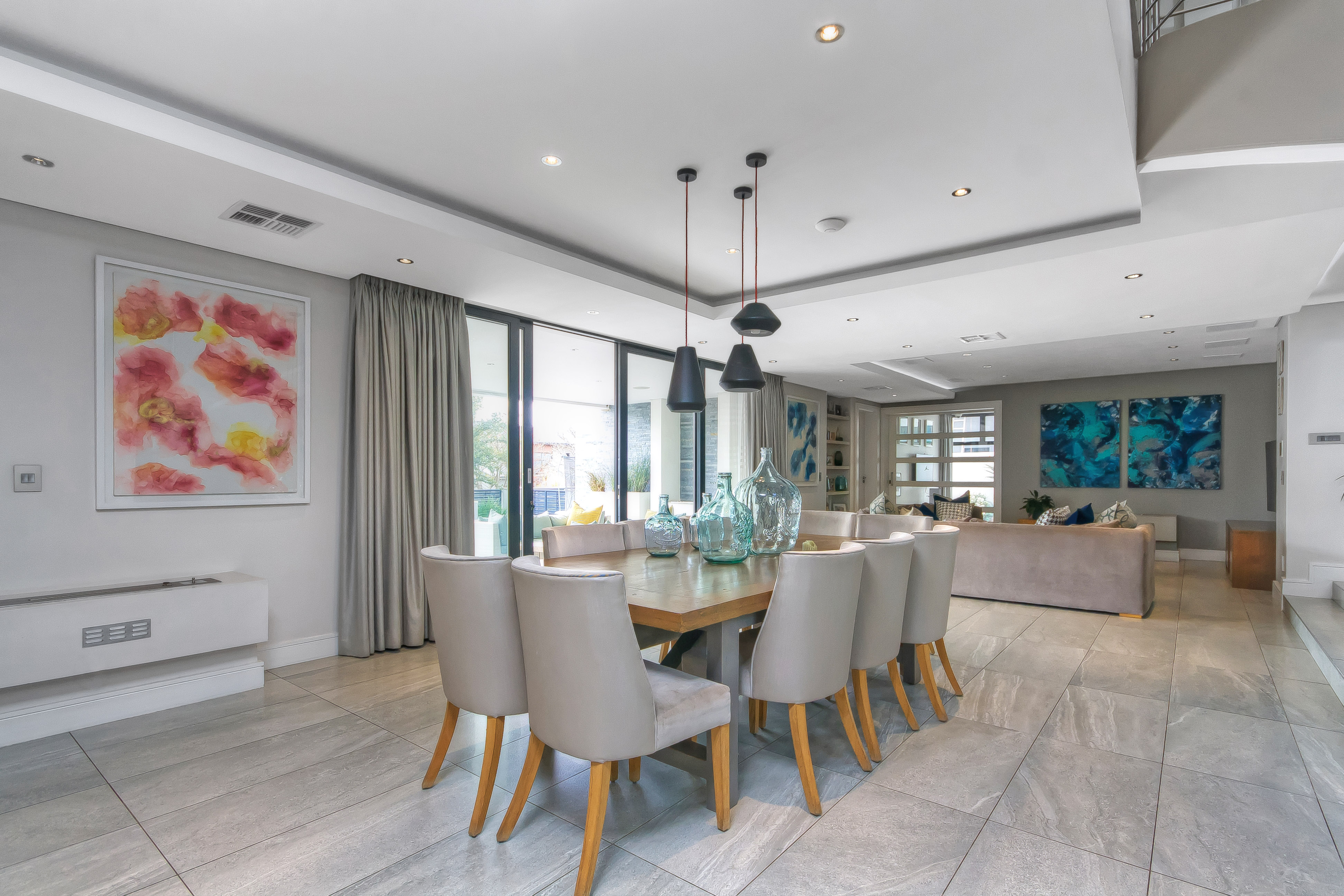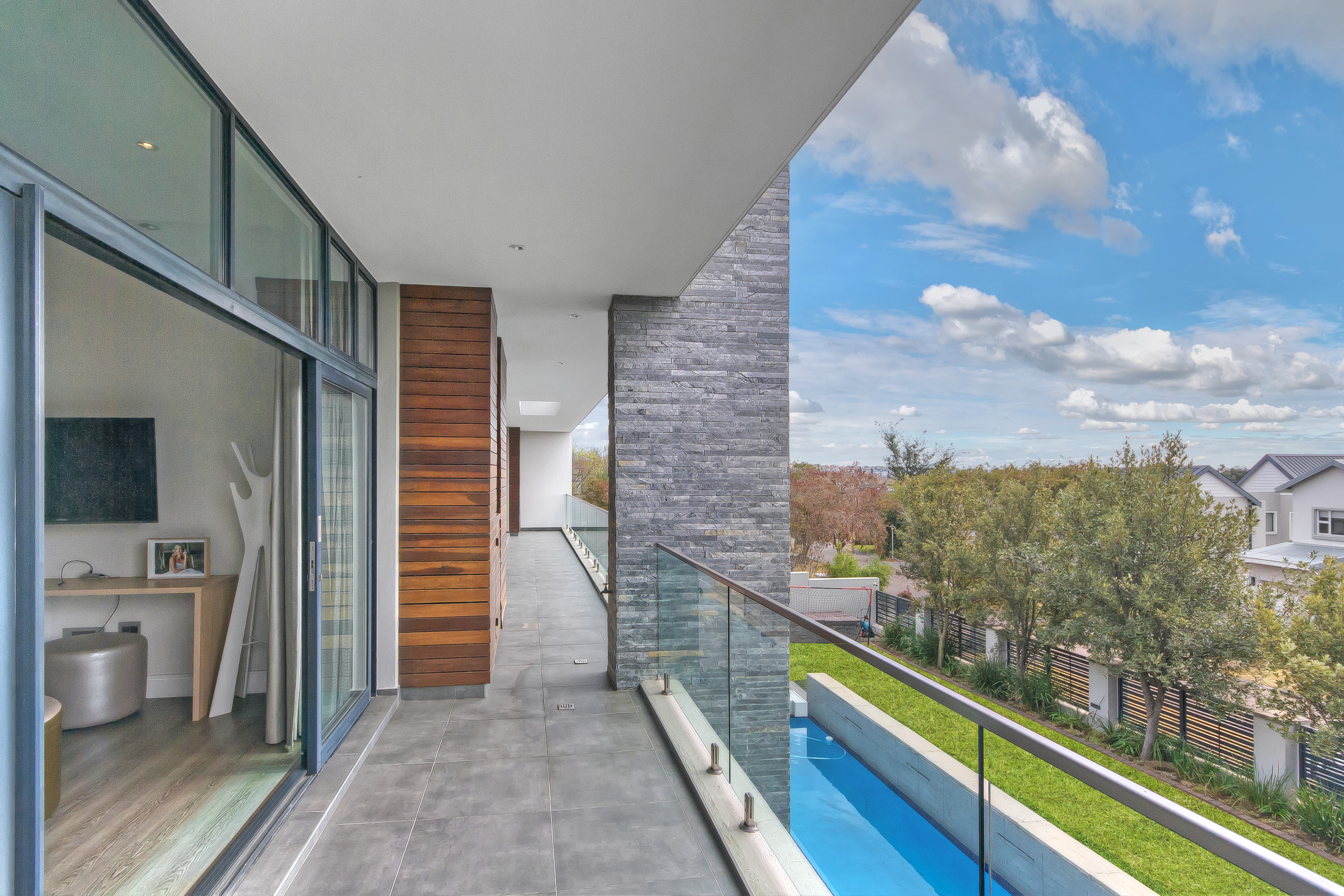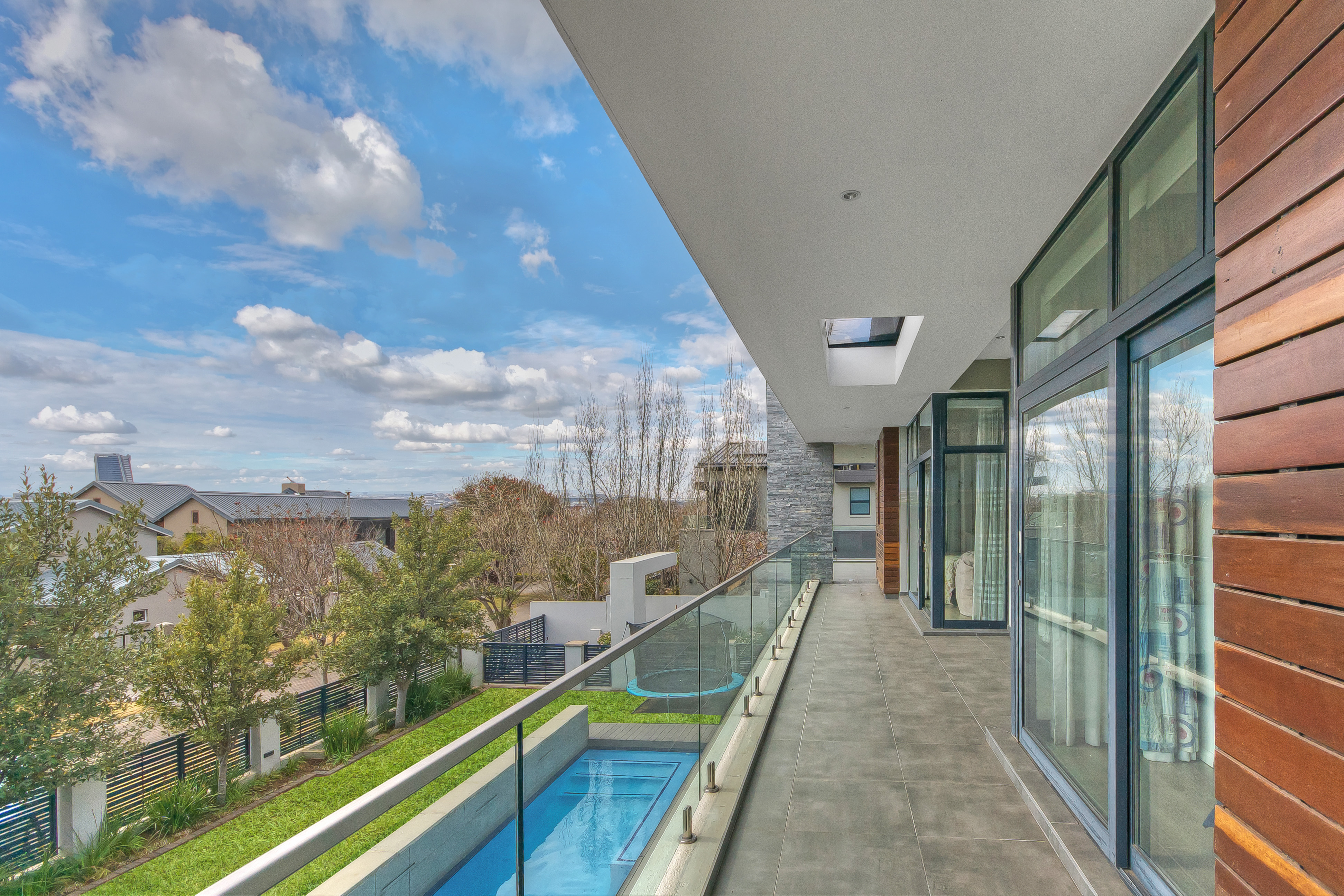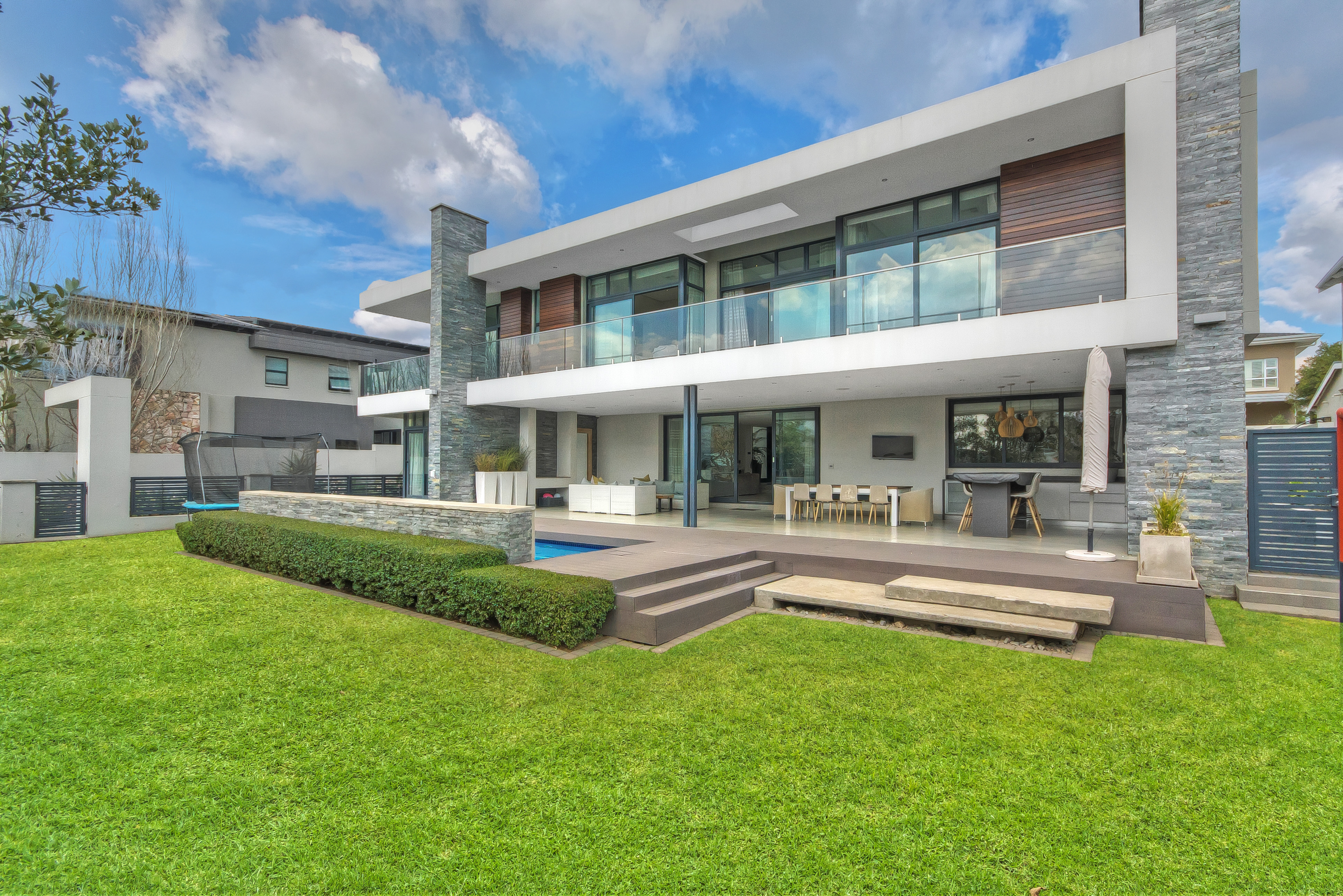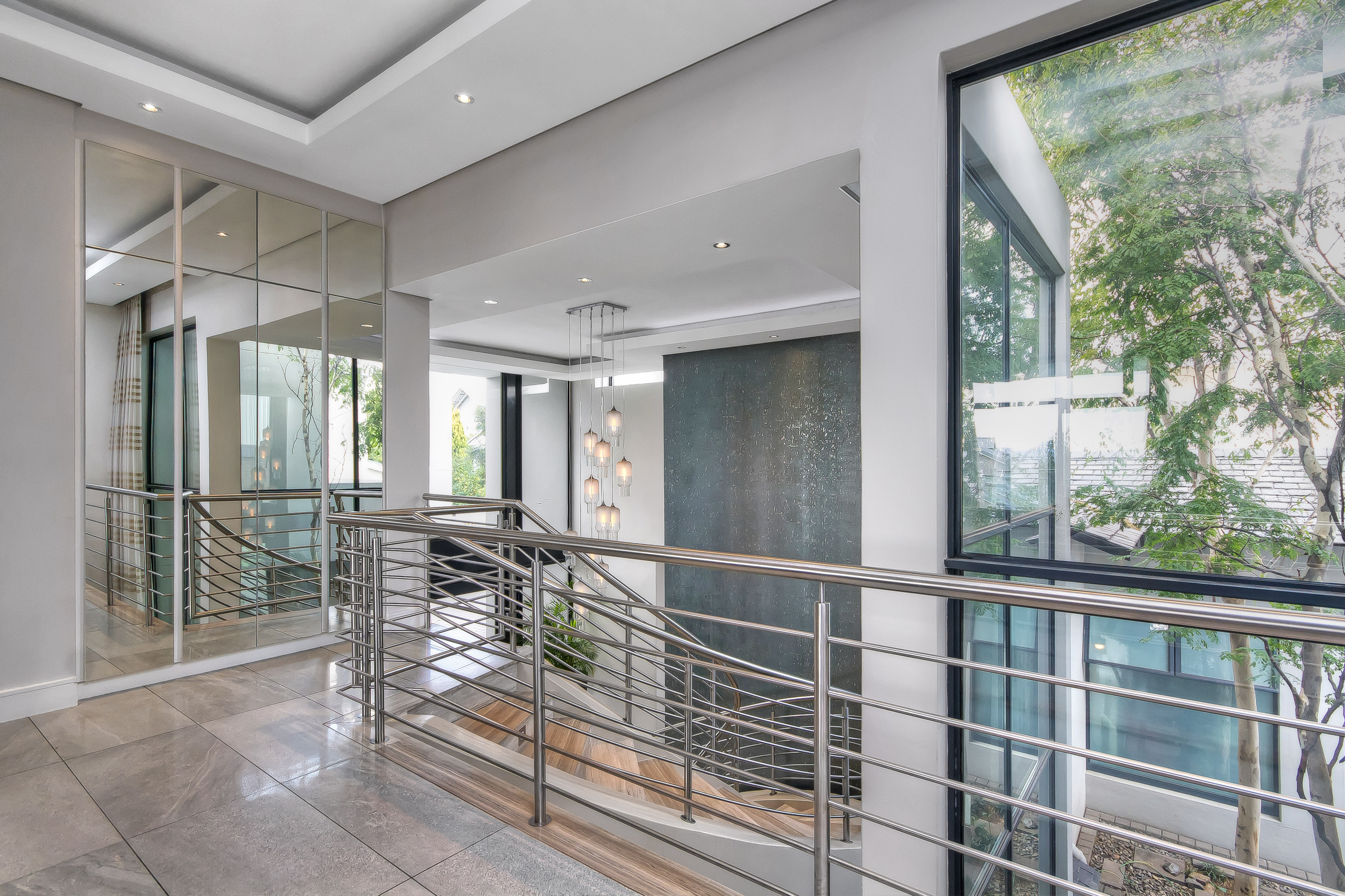 A manicured, covered stepping-stone pathway — framed by a striking stone-clad accent wall — leads you to a grand, metal-framed glass front door. Step inside and be greeted by a breathtaking double-volume entrance hall, where a sweeping spiral staircase commands attention as the centrepiece. From the moment you enter, the uncompromising quality of fittings and finishes is evident, setting this home apart as a true showpiece.
