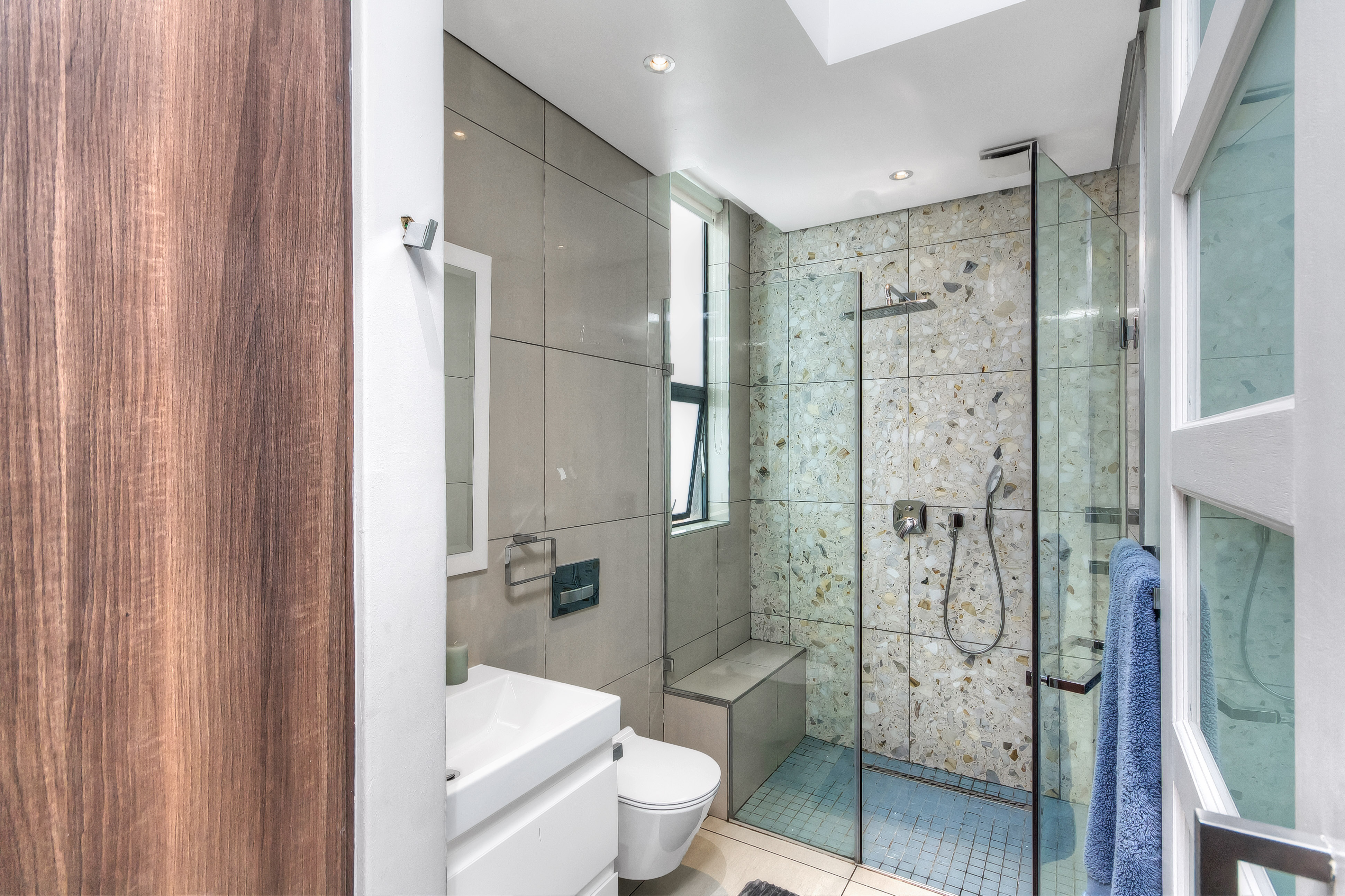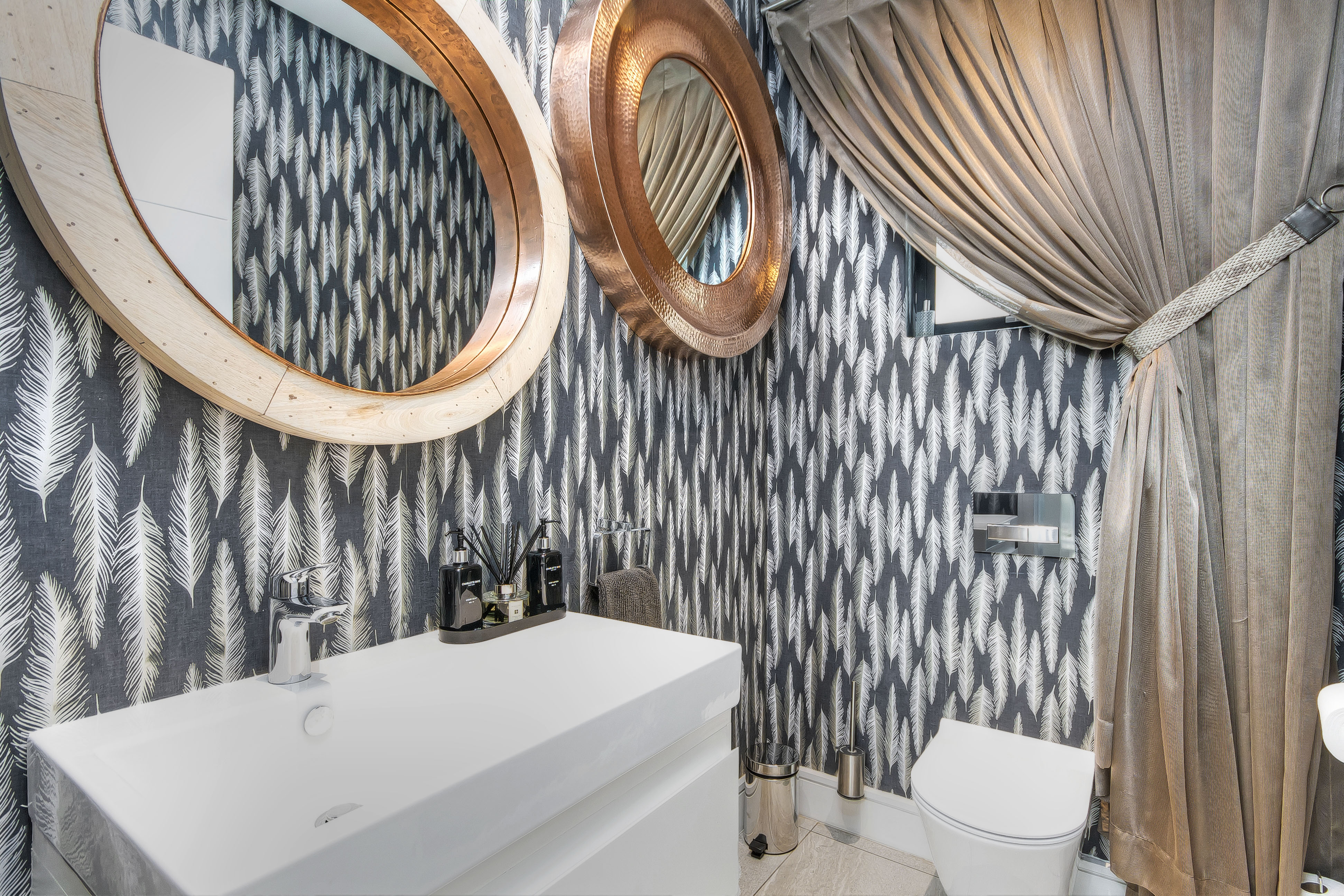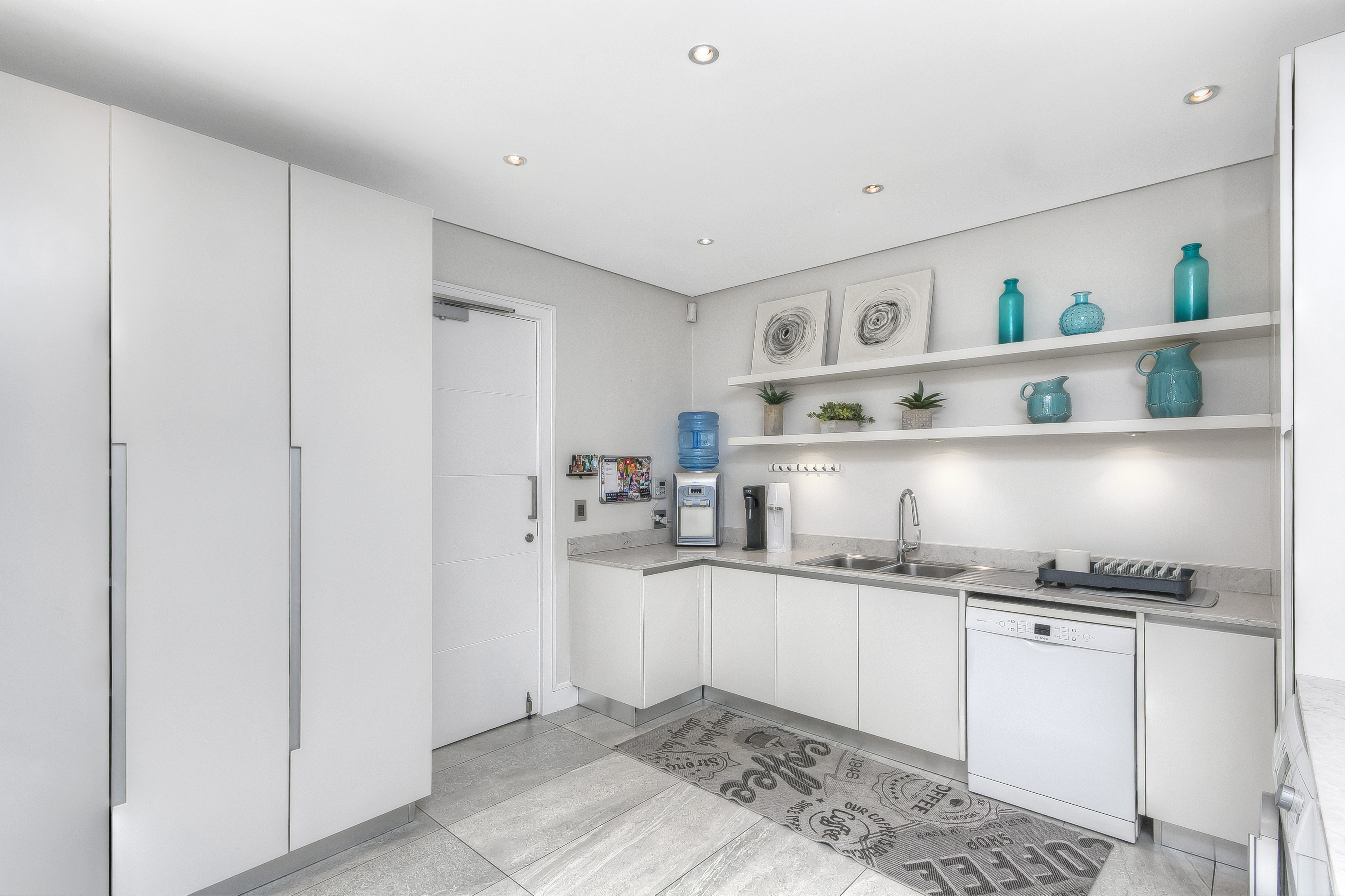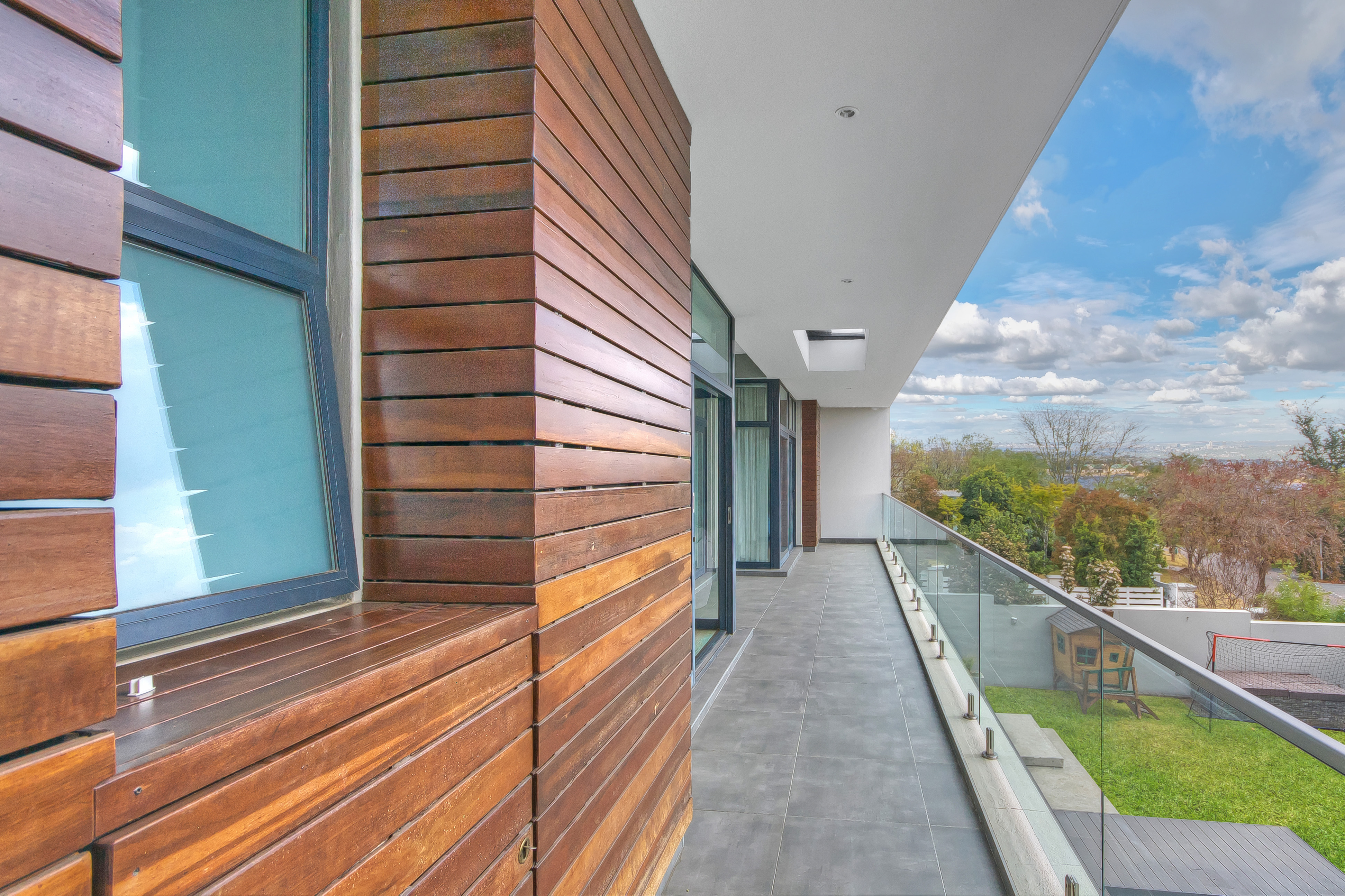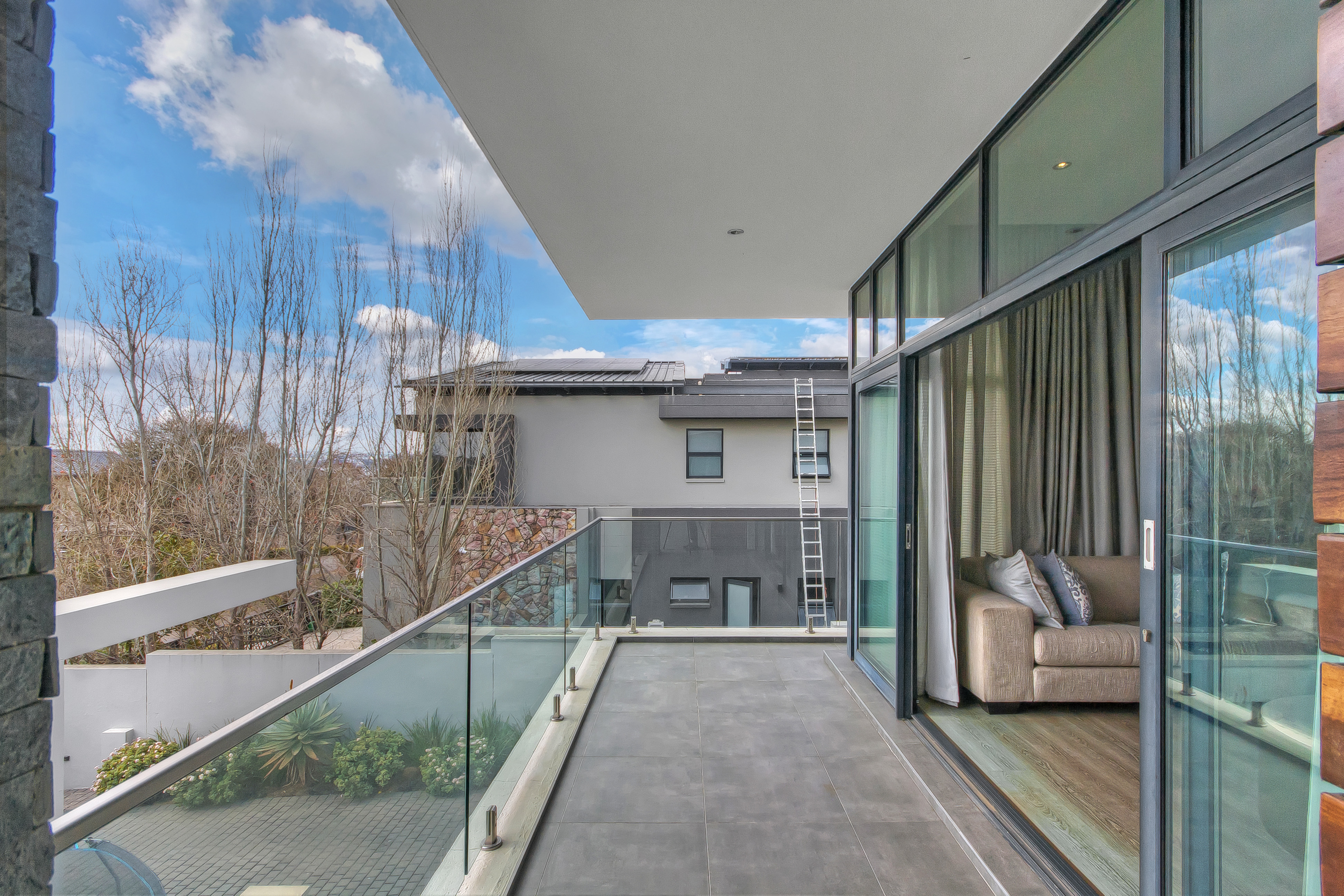 A manicured, covered stepping-stone pathway — framed by a striking stone-clad accent wall — leads you to a grand, metal-framed glass front door. Step inside and be greeted by a breathtaking double-volume entrance hall, where a sweeping spiral staircase commands attention as the centrepiece. From the moment you enter, the uncompromising quality of fittings and finishes is evident, setting this home apart as a true showpiece.