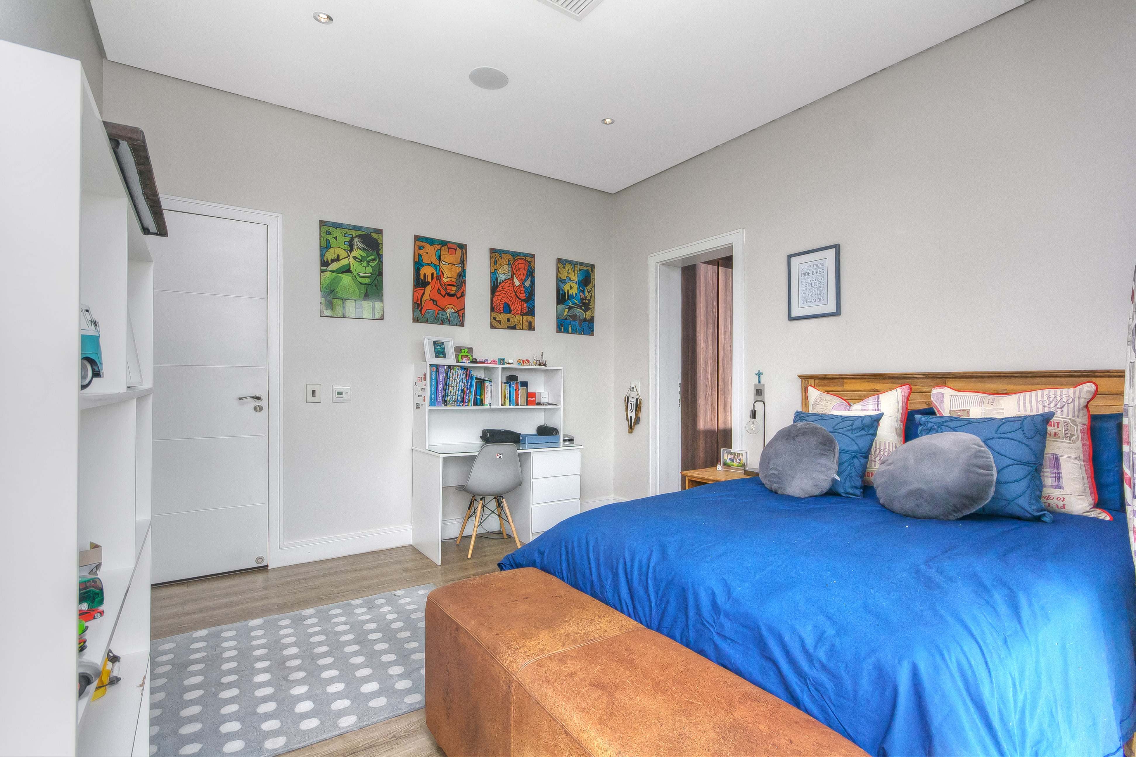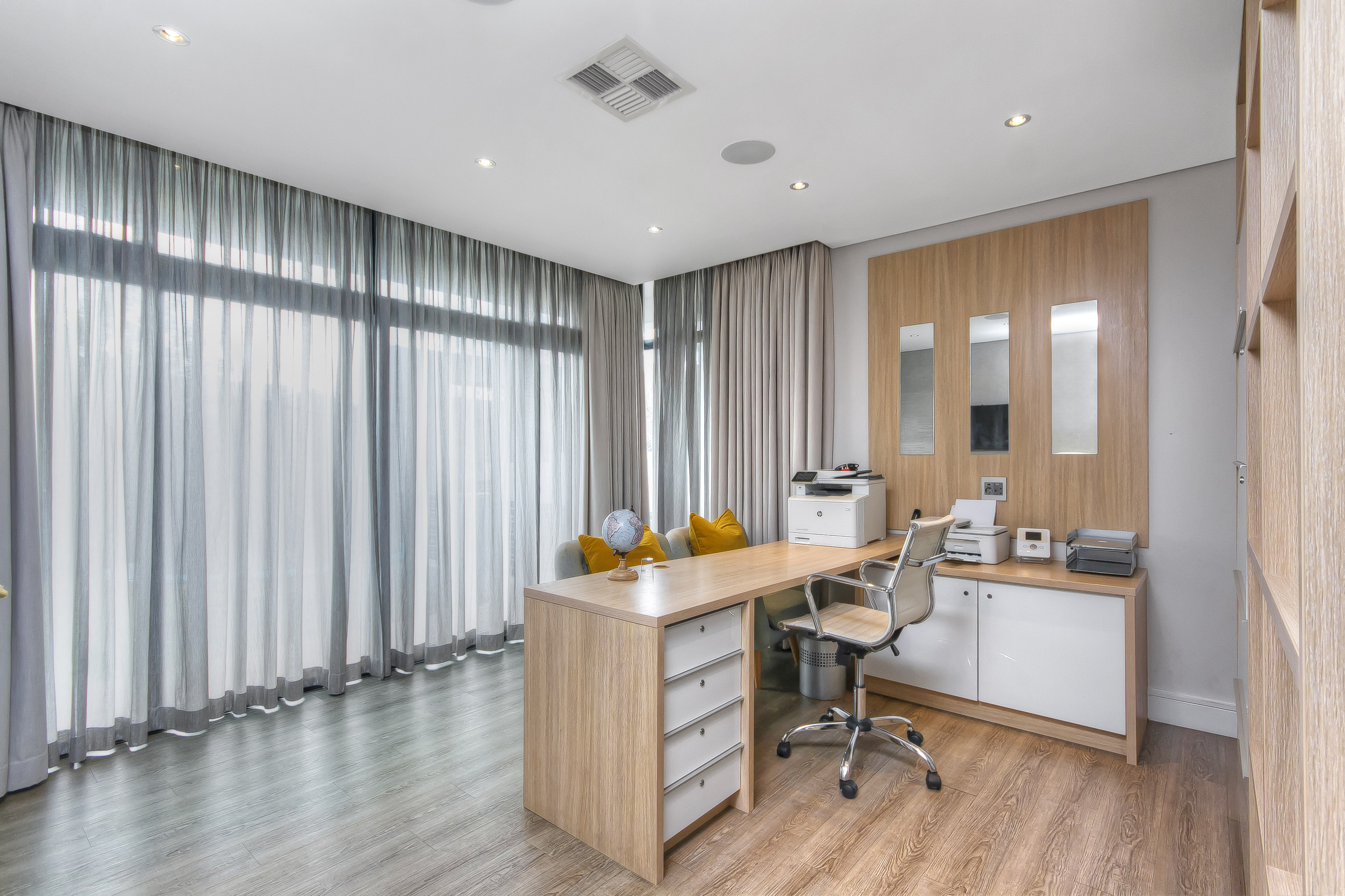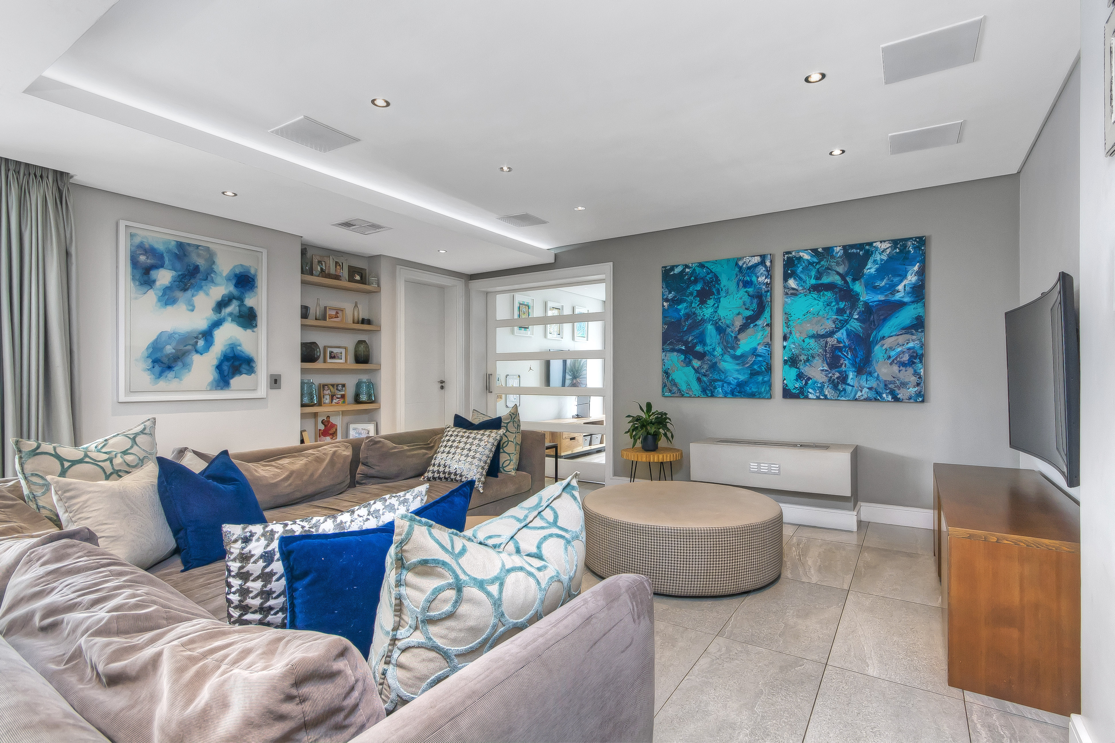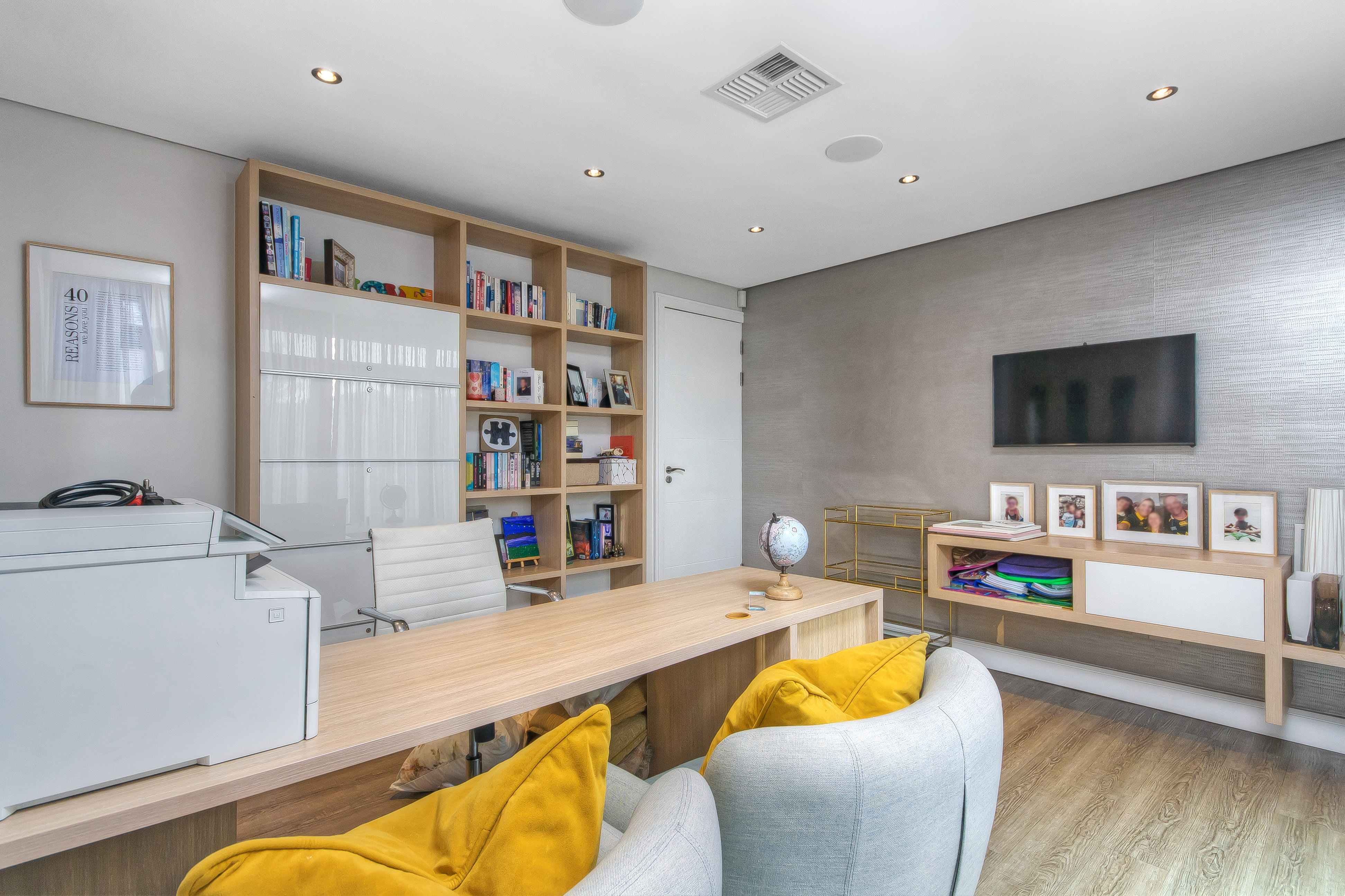 The lower level also includes a comfortable TV lounge, an additional private lounge/playroom with elegant sliding doors for separation, and a sophisticated home office complete with custom cabinetry, warm wood flooring, and direct garden and pool access via glass sliders.