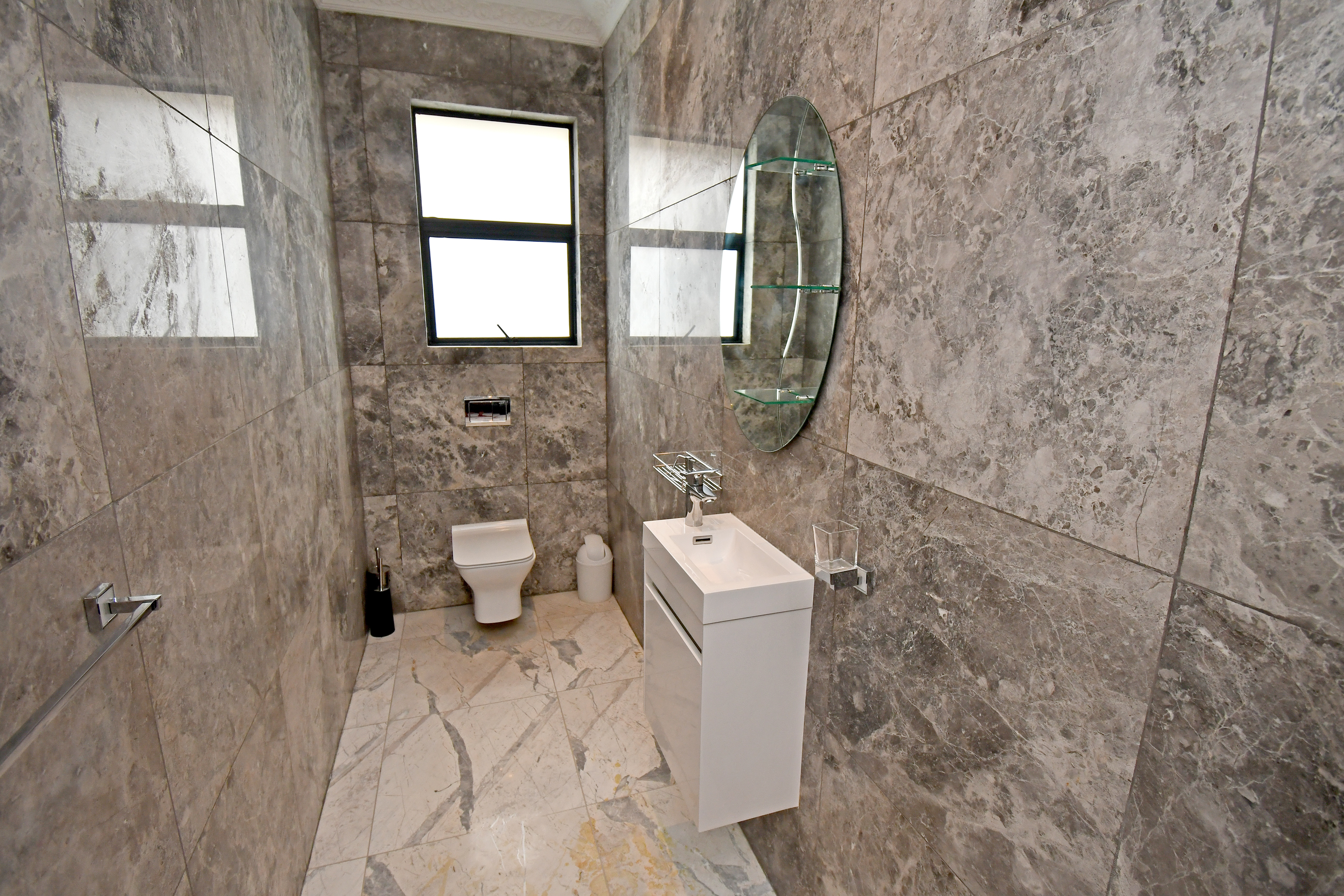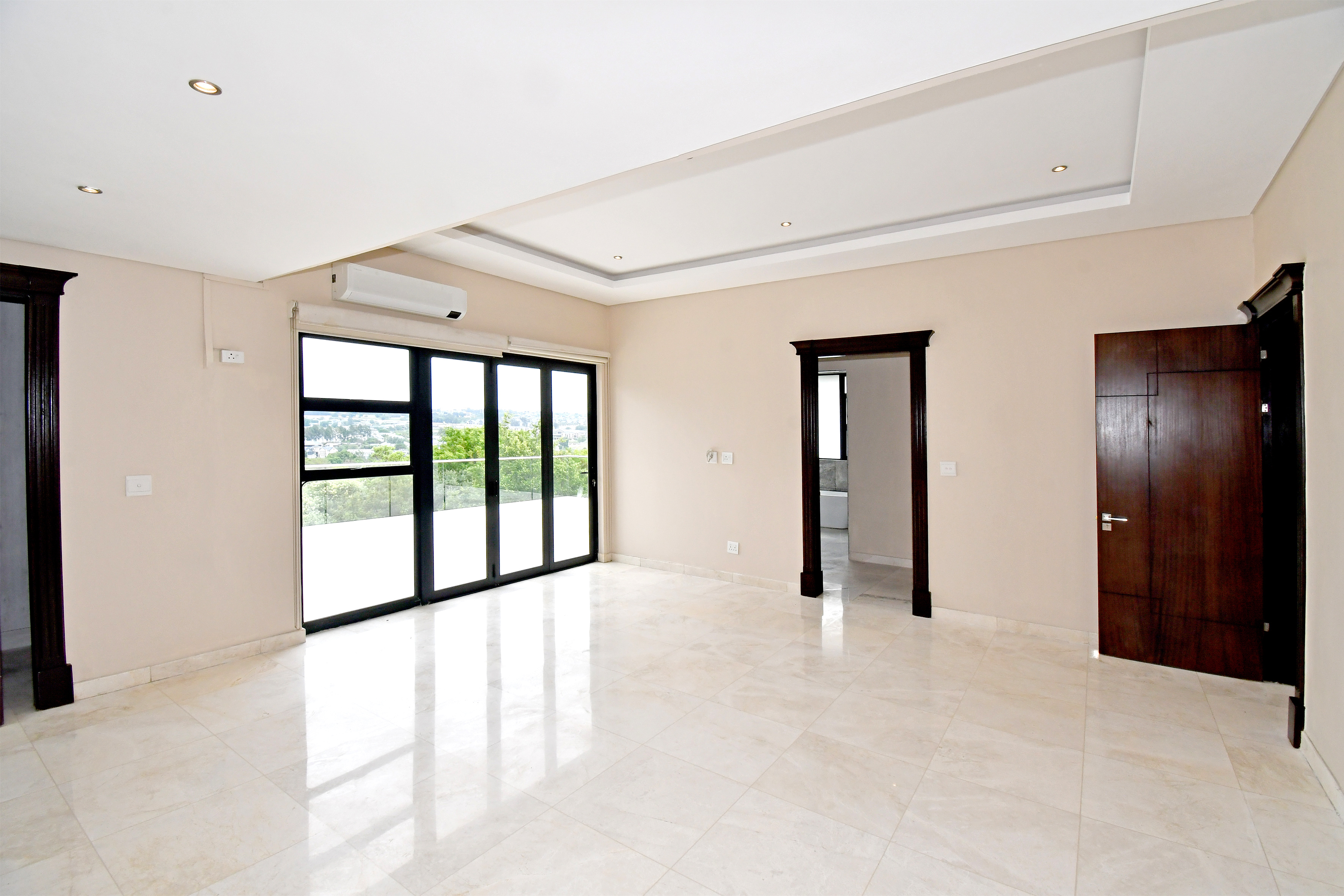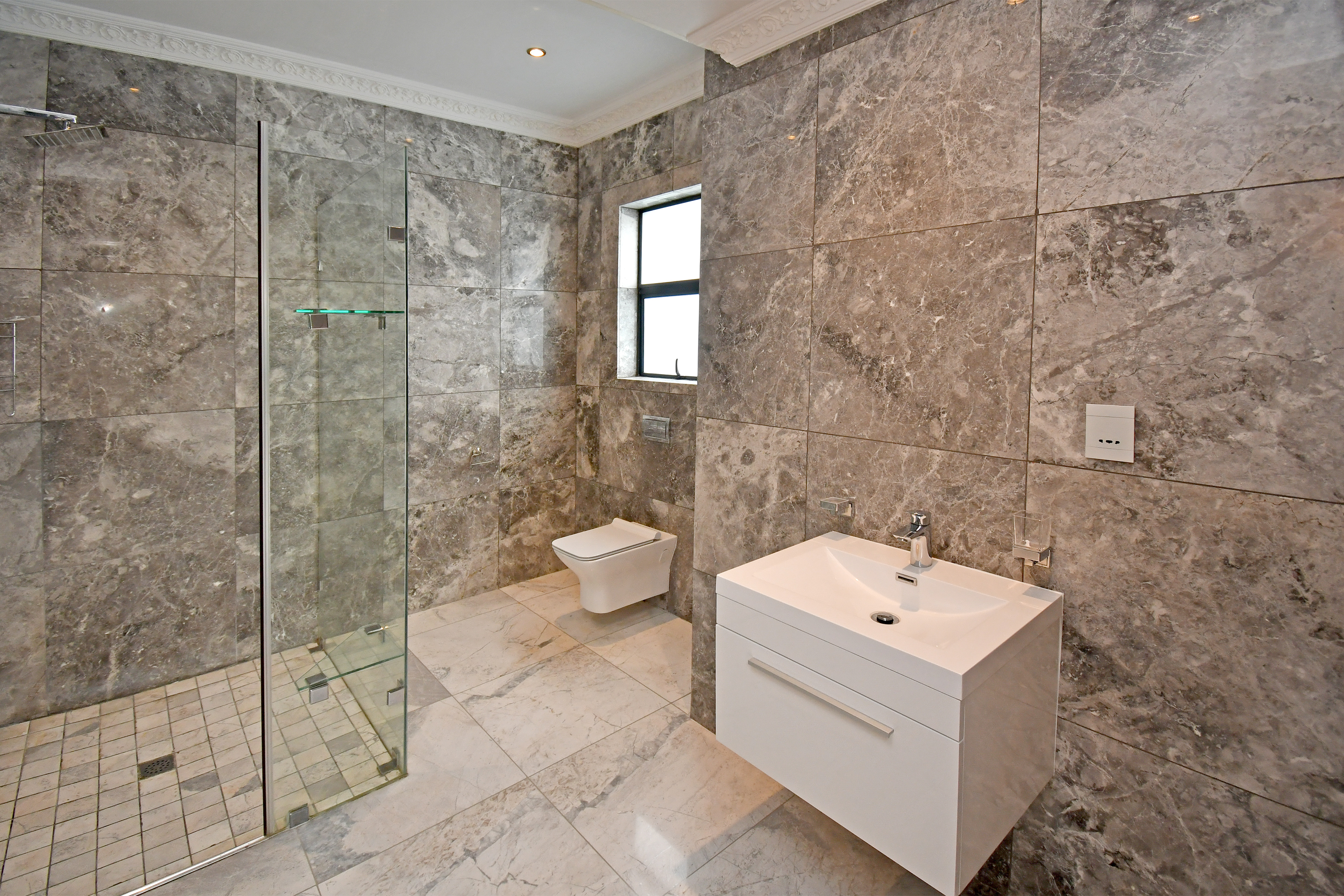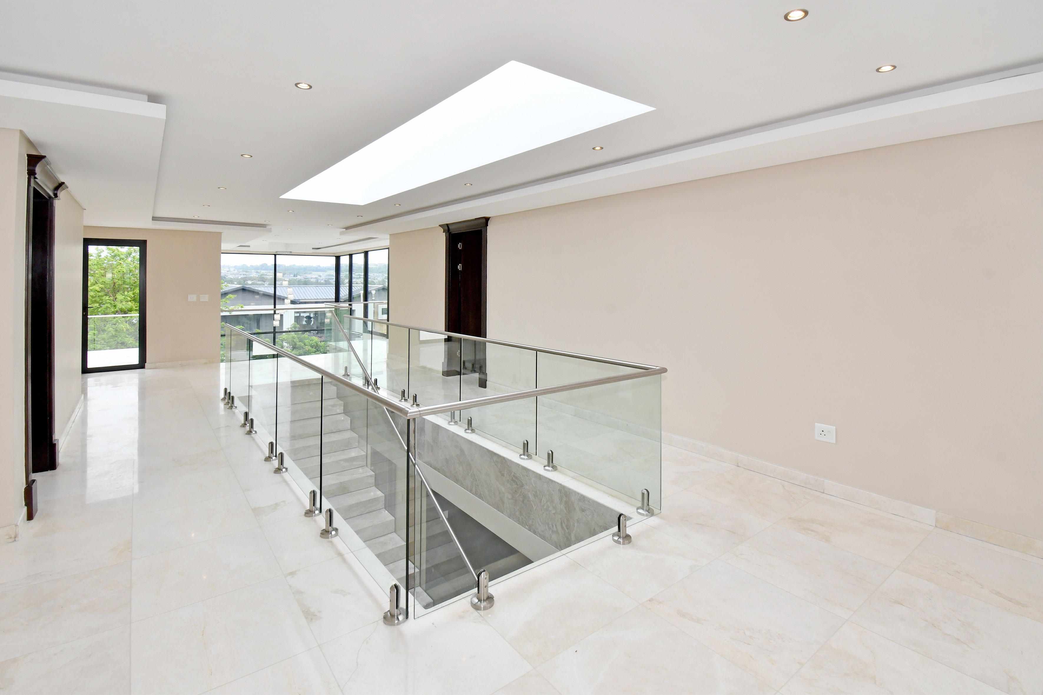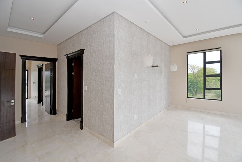 Ascending the beautifully crafted stone-tiled staircase to the upper level, you’ll find a spacious lounge area with travertine flooring and glass stacker doors opening to a large shared balcony overlooking the lush garden and pool below. The upper level houses five generous bedrooms, each with its own luxuriously appointed ensuite bathroom and built-in wardrobes. Some of the bedrooms also enjoy private balcony access with panoramic views of the Waterfall skyline. The Main bedroom is really spacious and boasts a walk-in wardrobe, balcony access through large glass stacker doors and a stunning full bathroom complete with a large shower and stand alone tub, perfect for those long, hard days that require a long, quiet soak in the tub.