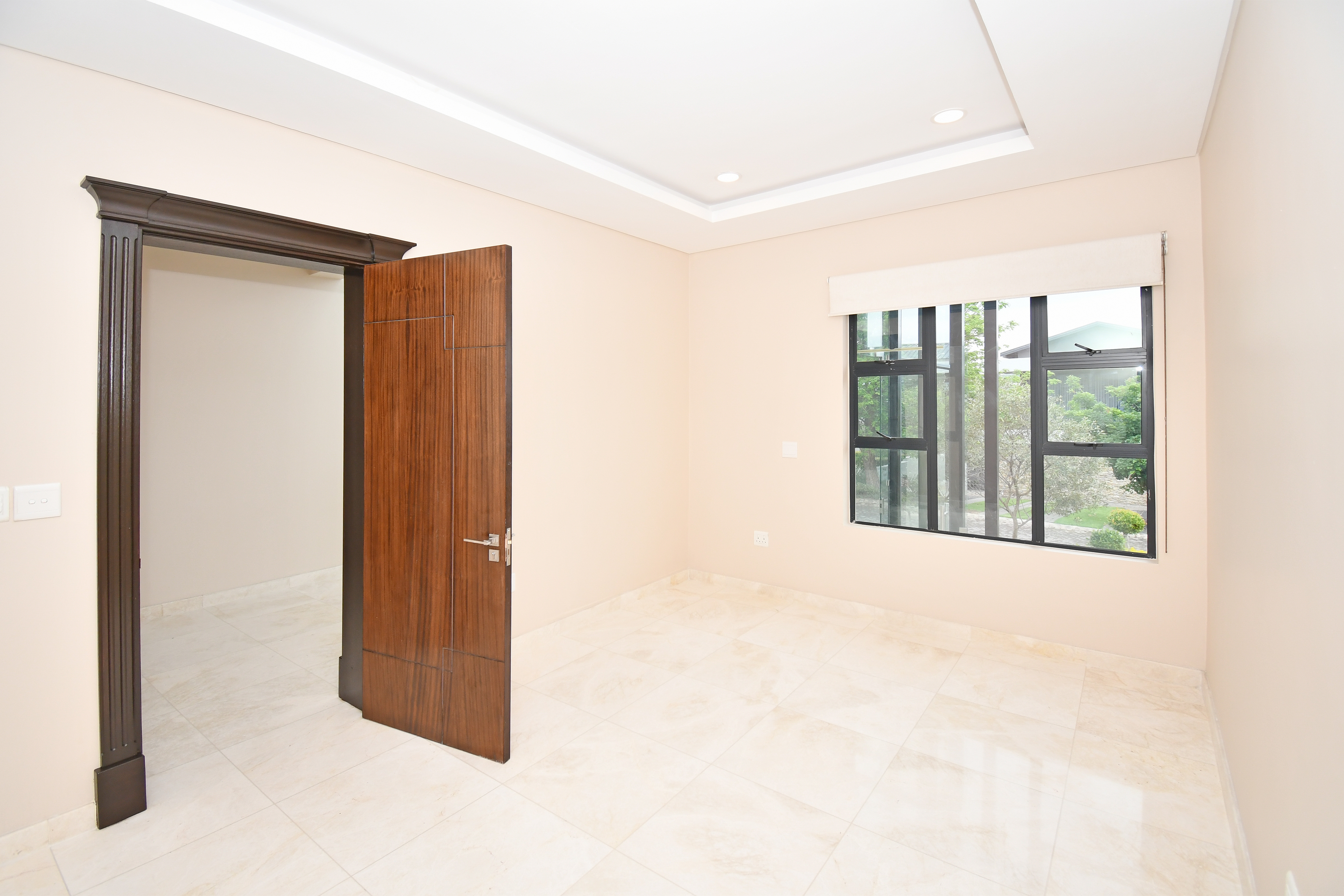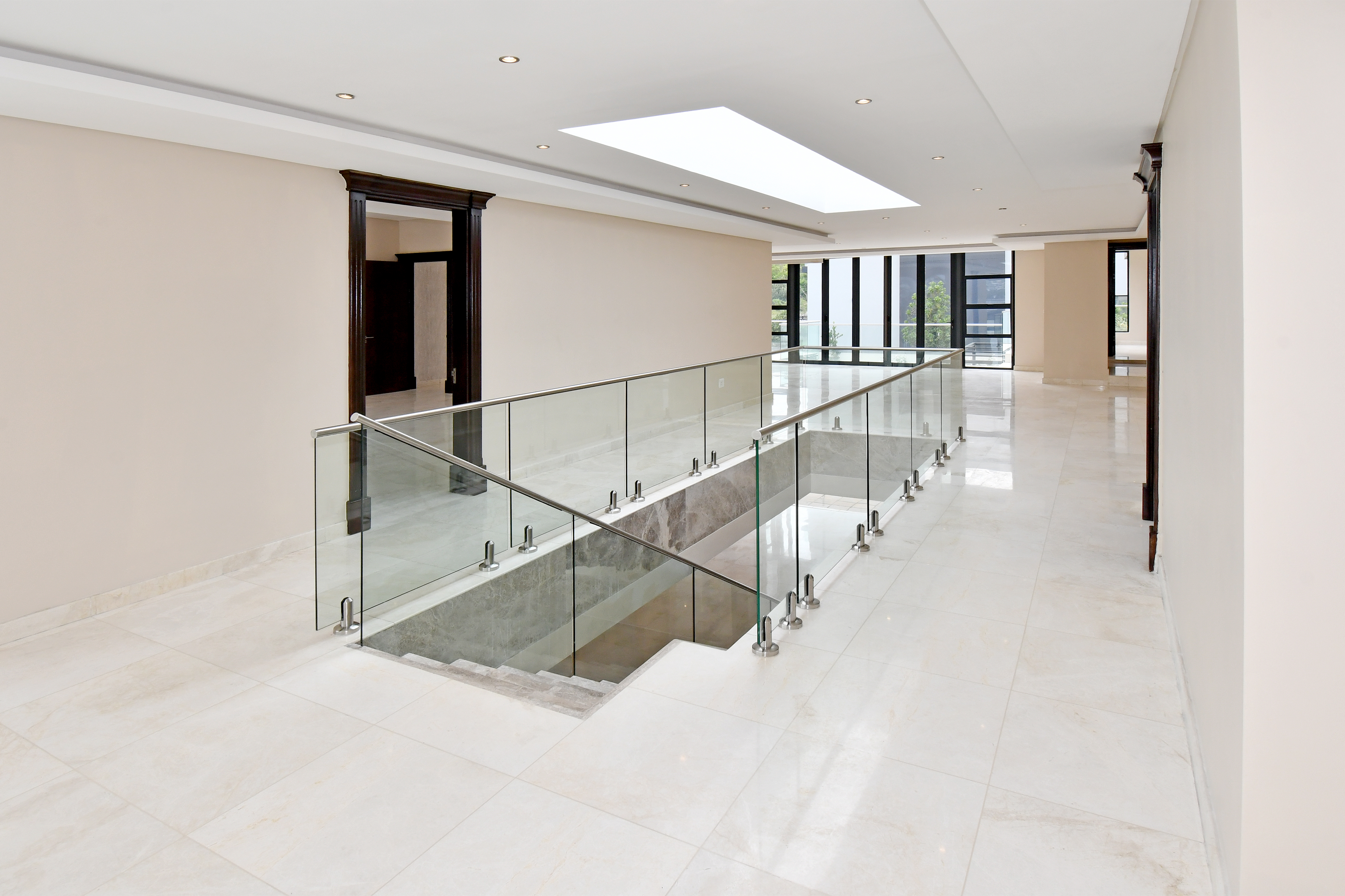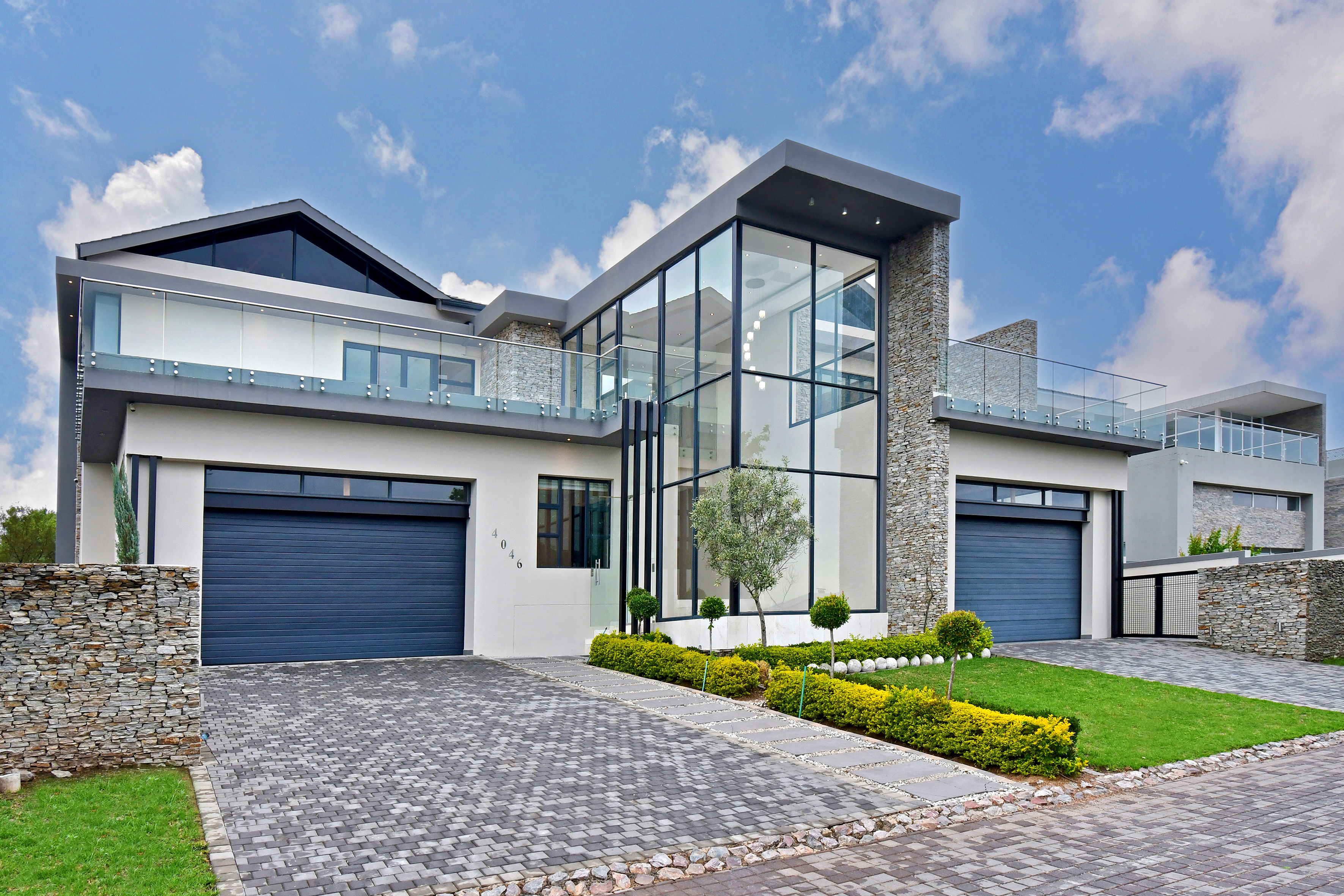 The grand arrival begins with a split paved driveway, each side featuring a double automated garage — providing parking for up to four vehicles — along with additional off-road parking to the left wing of the home. The double-volume glass cubical entrance hall makes an unforgettable first impression, setting the tone for the elegance and scale that unfold within.
