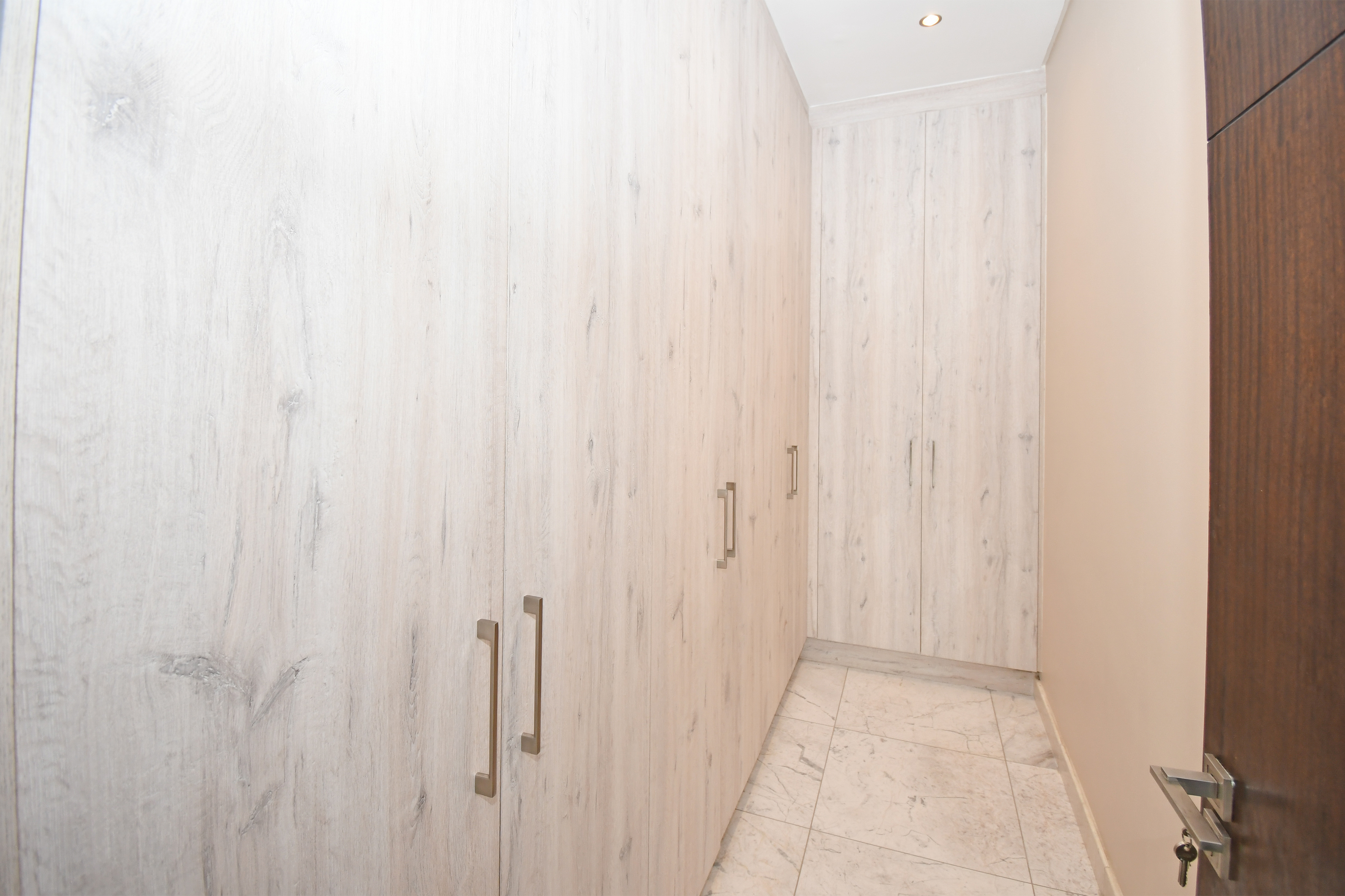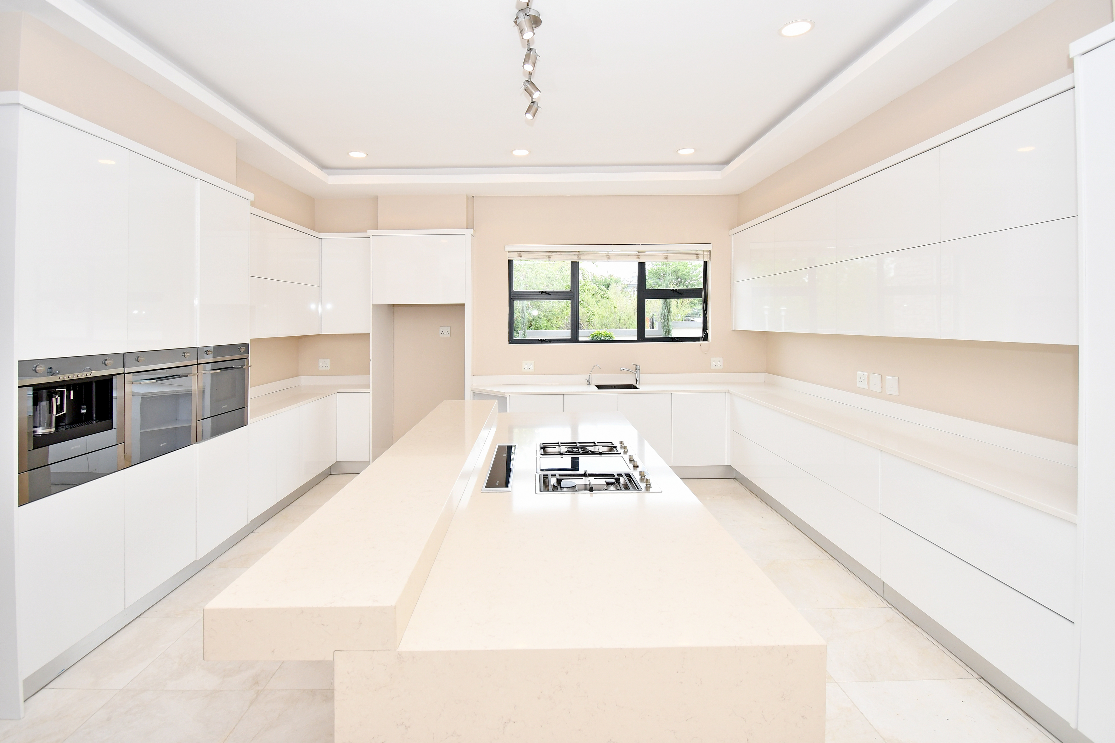 The designer kitchen is a showstopper — perfectly positioned at the heart of the home so that no one is left out of the fun while cooking or hosting. It features modern beige and sleek white cabinetry, a large stone-top island with a breakfast bar, integrated SMEG appliances, and ample counter and storage space. A convenient scullery is tucked neatly to the side.