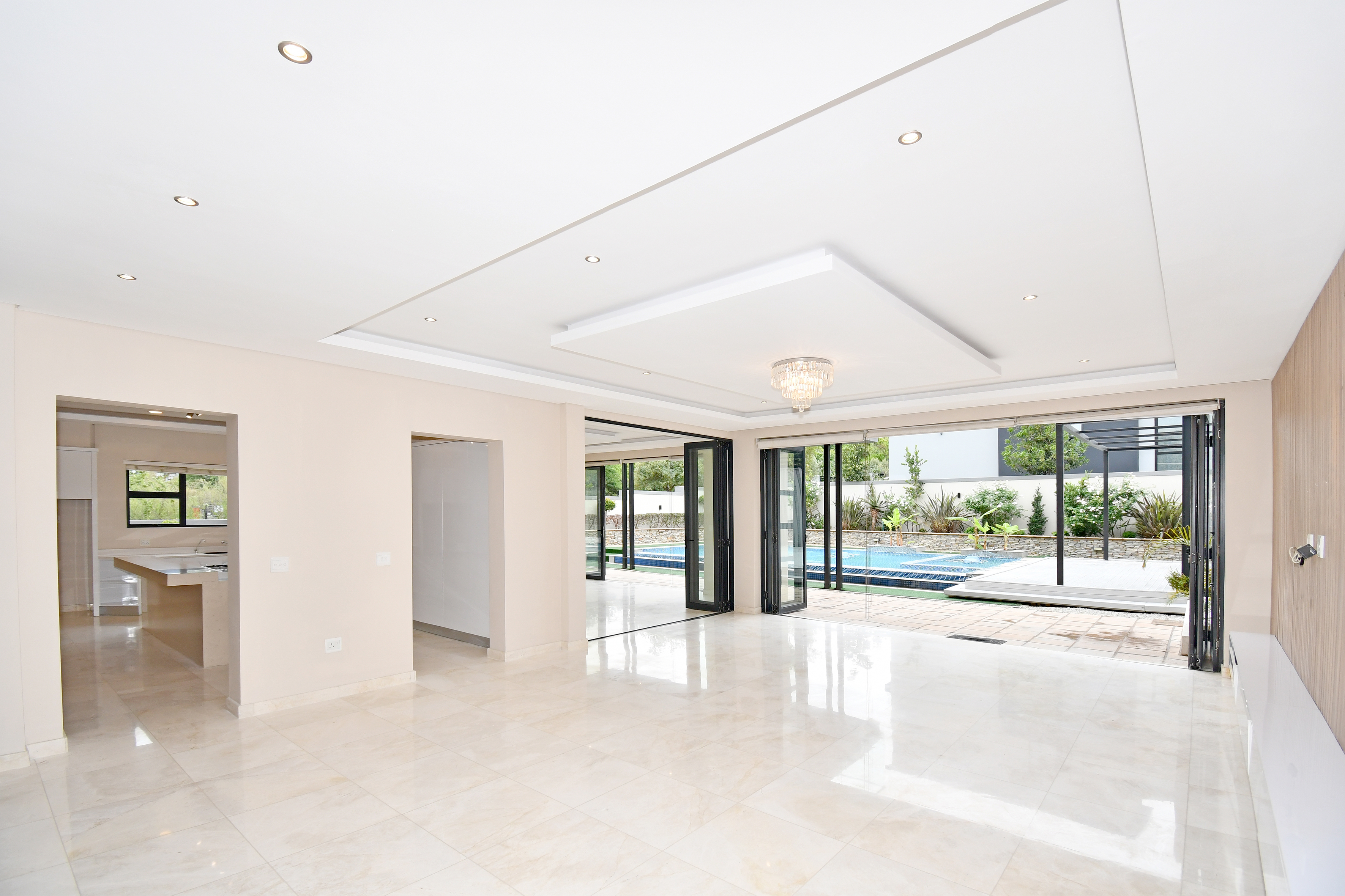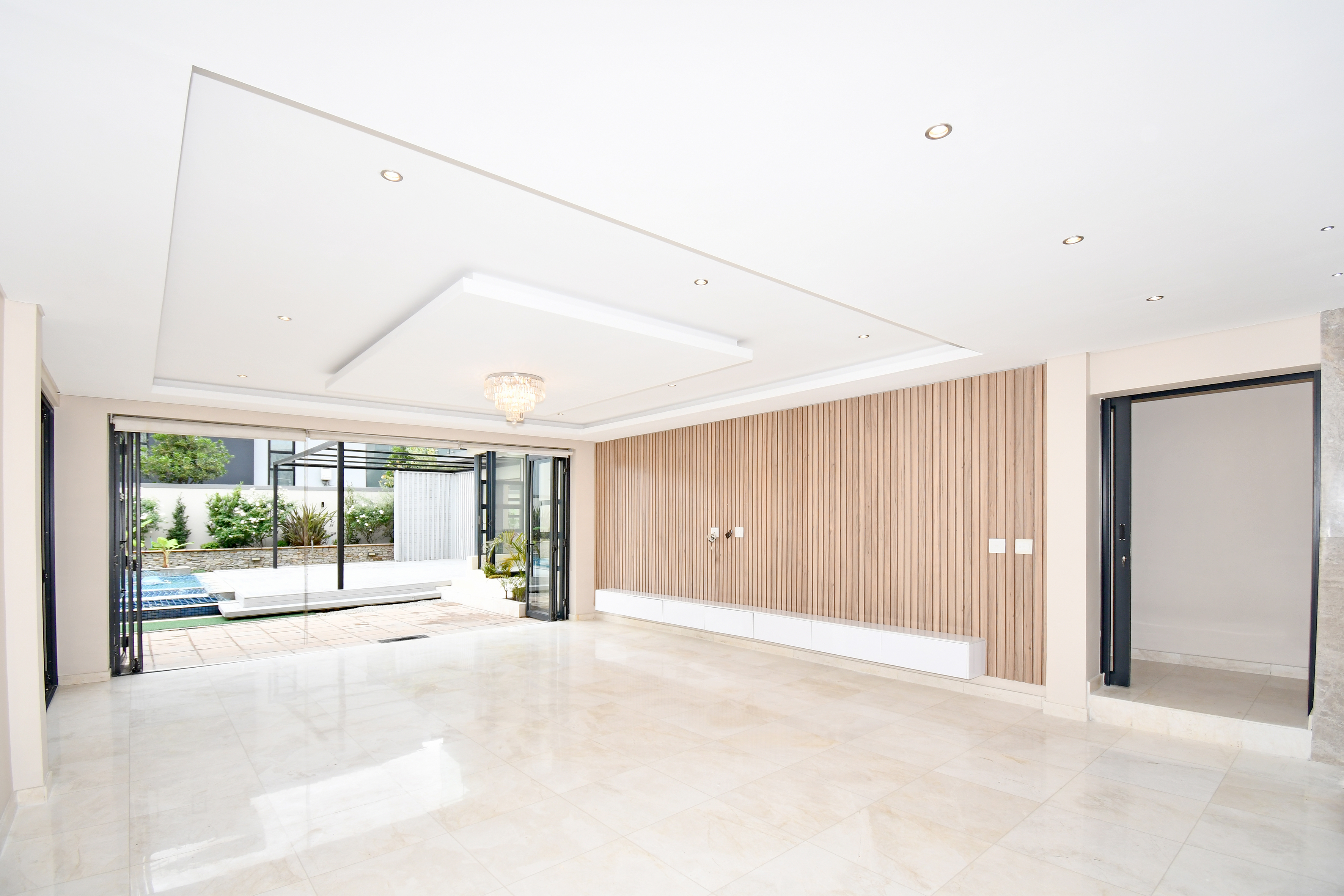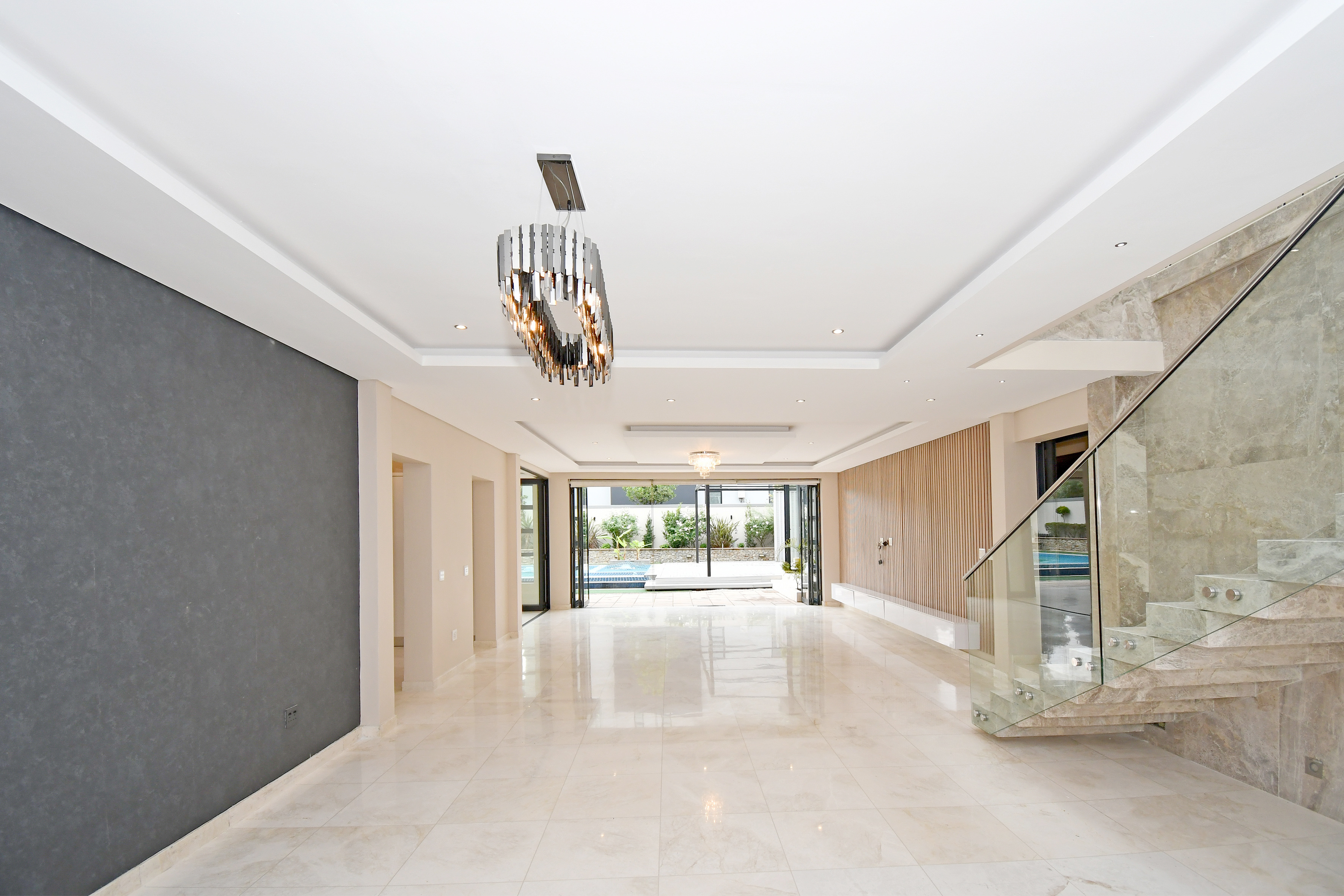 Stepping into the expansive, fully tiled lower level, your eyes are immediately drawn to the abundance of natural light streaming through floor-to-ceiling glass stacker doors that open along the entire length of the home. These doors seamlessly connect the indoor and outdoor spaces, creating a breathtaking open-plan entertainment area that includes the formal lounge, family room, dining area, and kitchen — all enhanced by wood-slat panelled feature walls, fireplace, striking chandeliers, and ambient recessed lighting. The established garden is neat and tidy and features a good-sized swimming pool and a large entertainment deck for those festive family gatherings all year round.