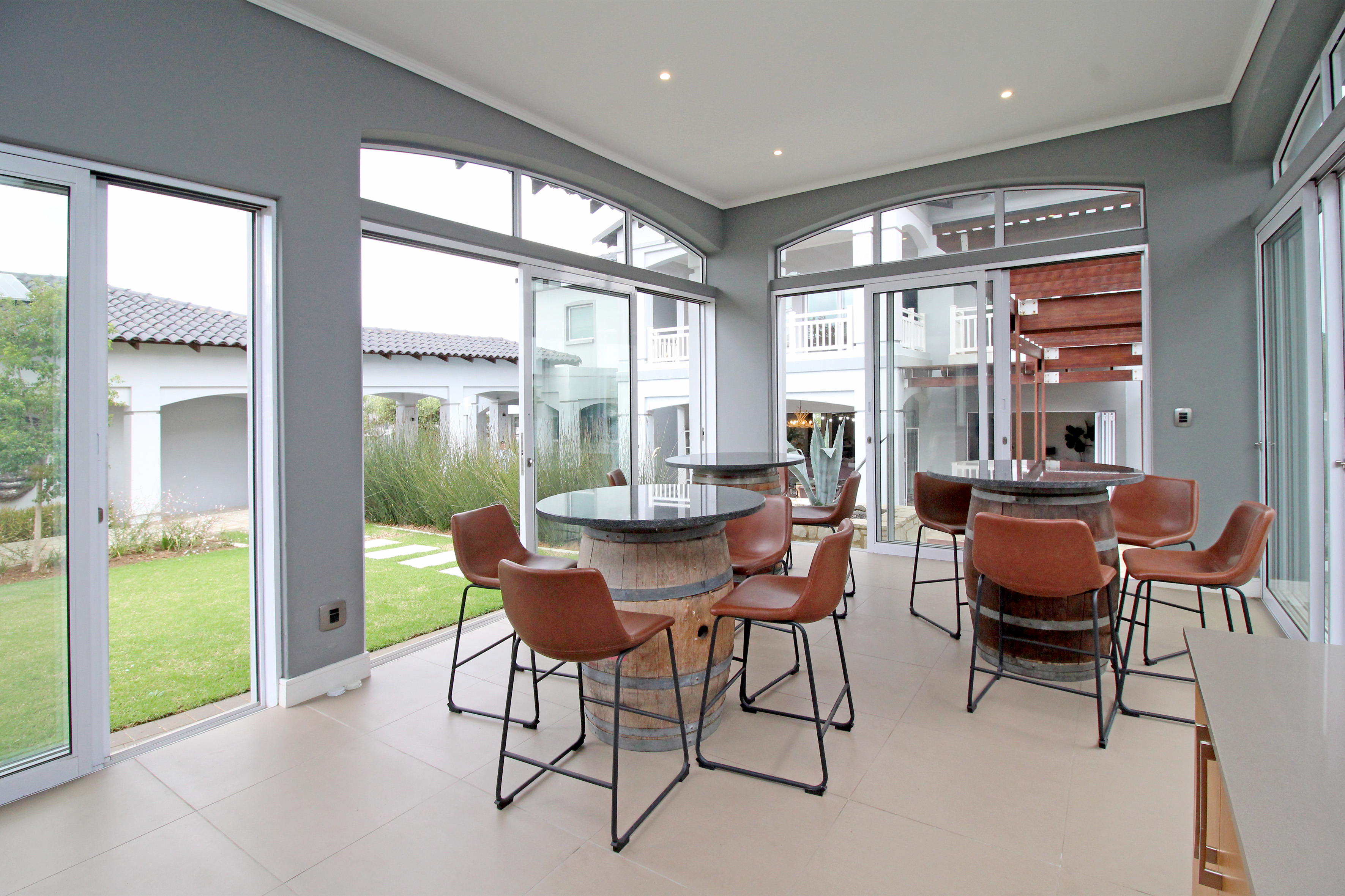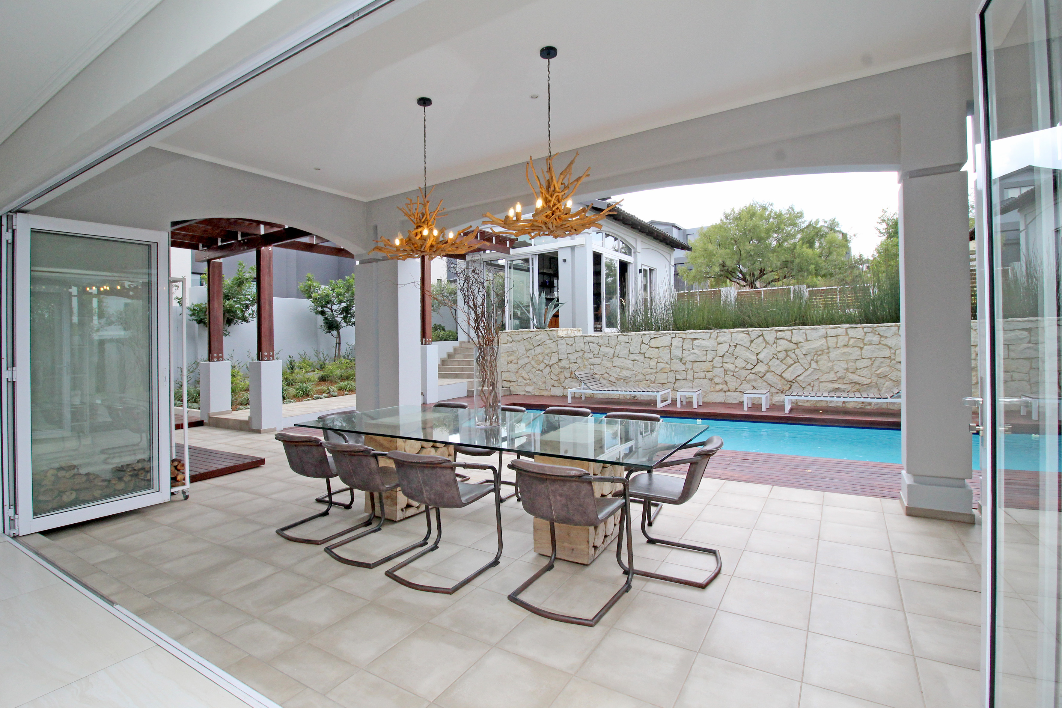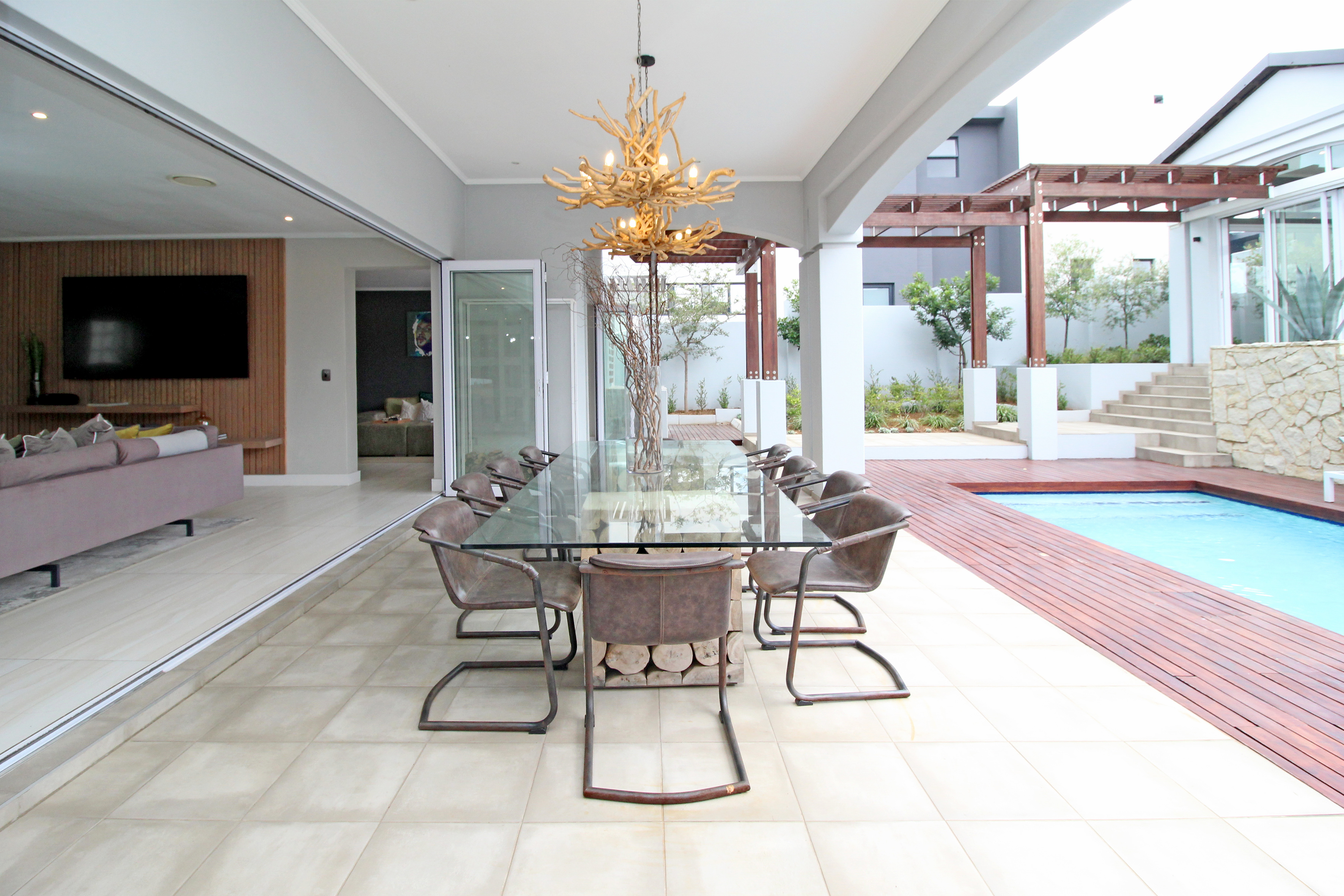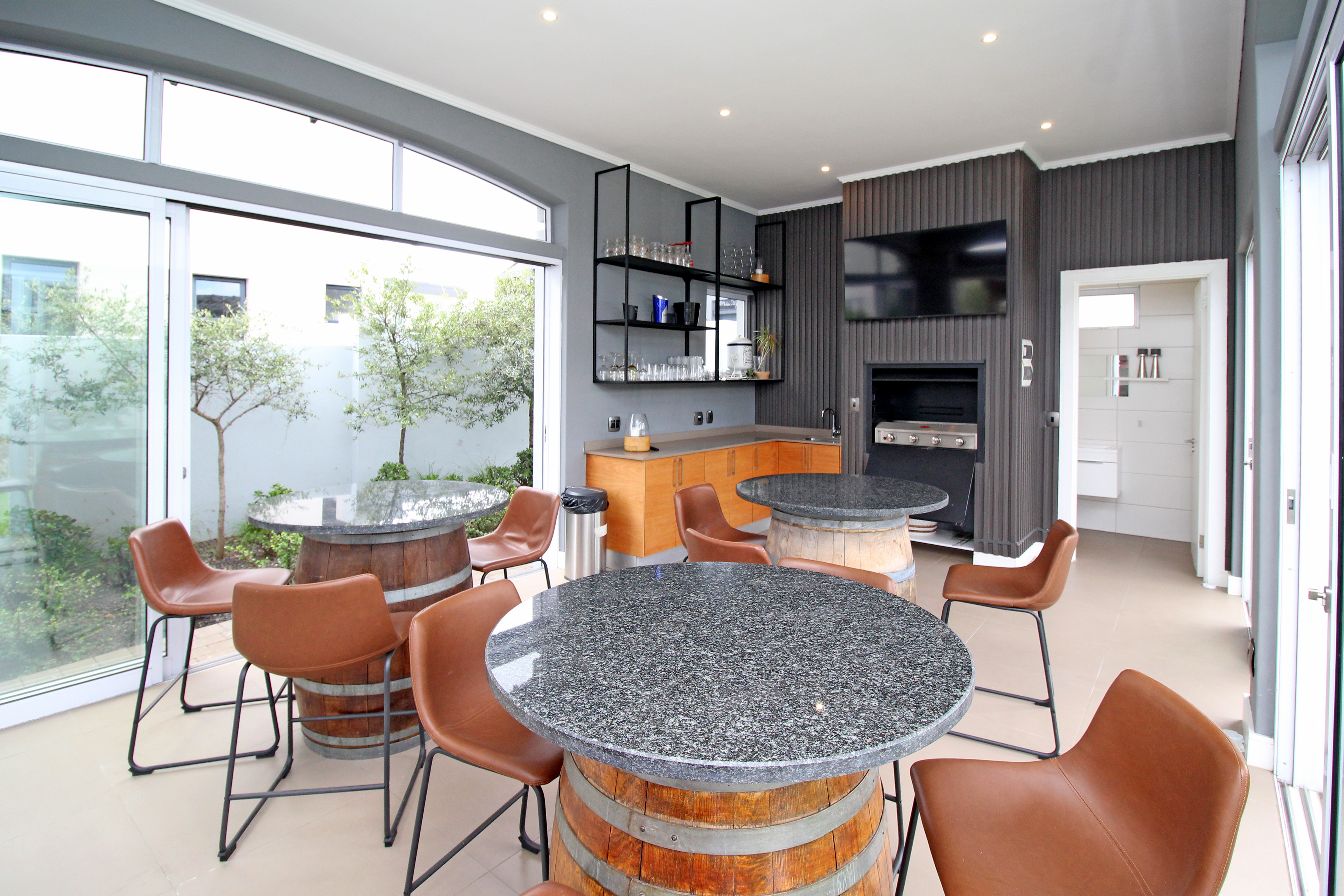 The covered patio is ideal for entertaining, comfortably accommodating a 10-seater dining table and featuring a separate charcoal braai area. Overlooking the inviting pool and wooden deck, this space is perfectly suited for long, relaxed summer evenings with family and friends. there is also a fully fitted and equipped clubhouse featuring a half bathroom, kitchenette and large glass sliders on two sides that all open up to the lush green garden and pool area below.