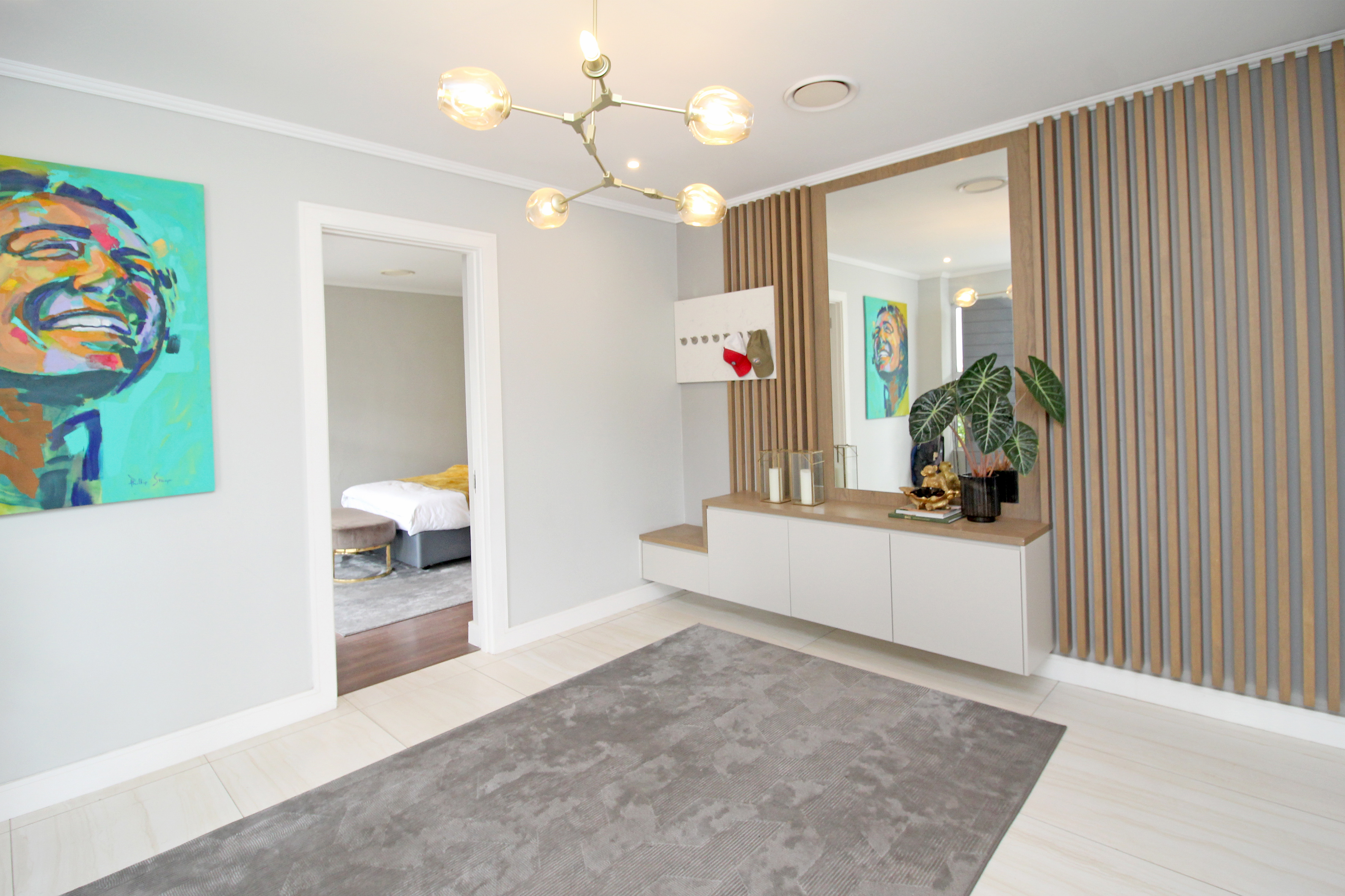 A gently paved walkway leads you past manicured gardens and the nearby clubhouse, drawing you toward the impressive double-door entrance. Step inside and you’re greeted by a spacious entrance hall where soft ambient lighting and a striking wood-panelled feature wall immediately set the tone for the elegance that unfolds within.