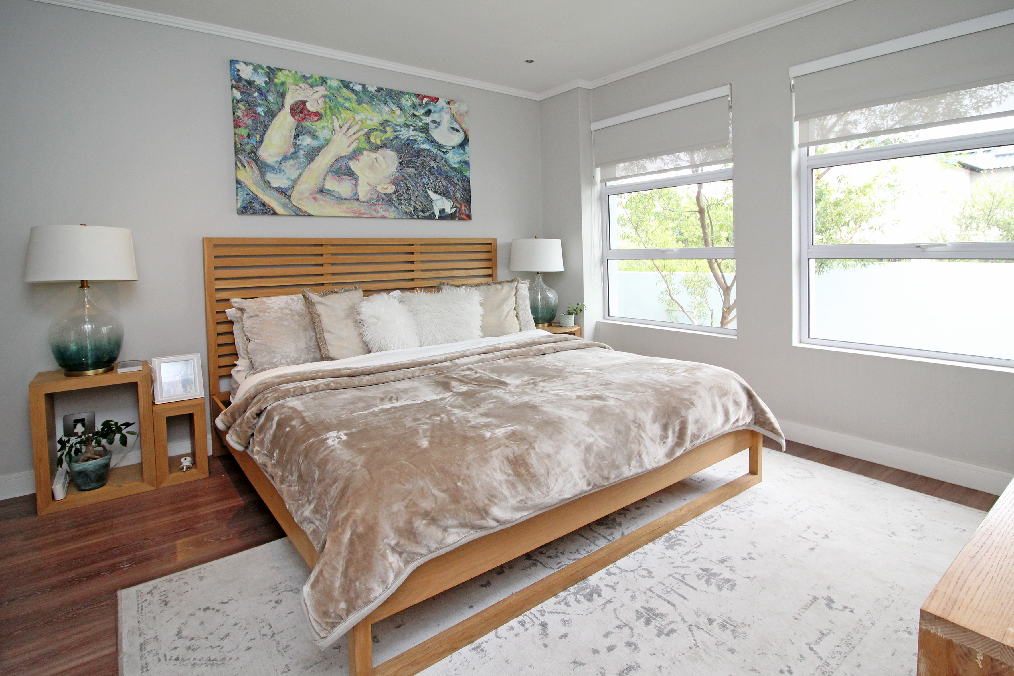 To the left, a beautifully appointed full en-suite bedroom offers a private haven for guests or family members. Custom cabinetry and warm laminate flooring add a sense of refinement, while glass sliding doors open onto its own garden retreat — a peaceful space to relax and recharge.