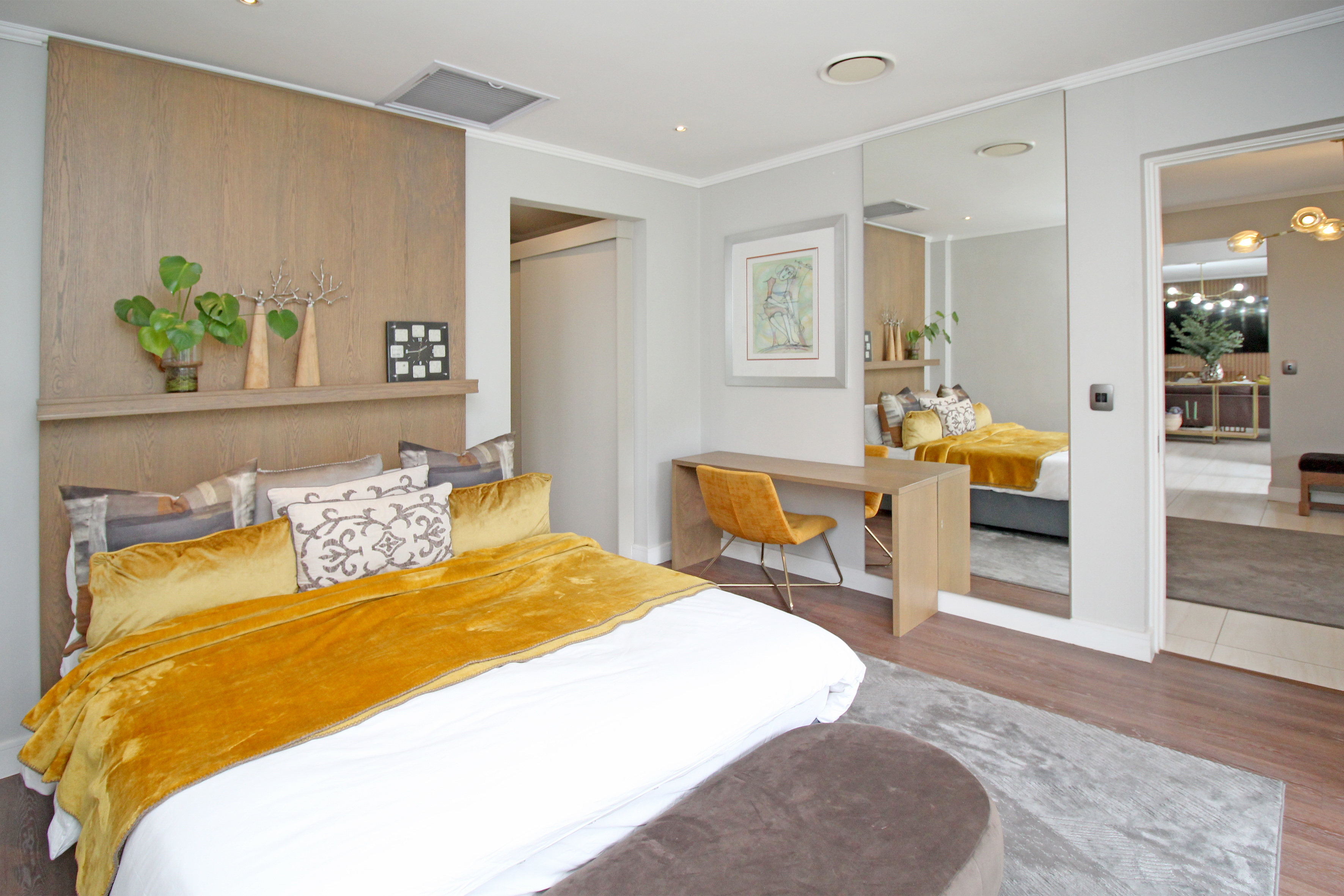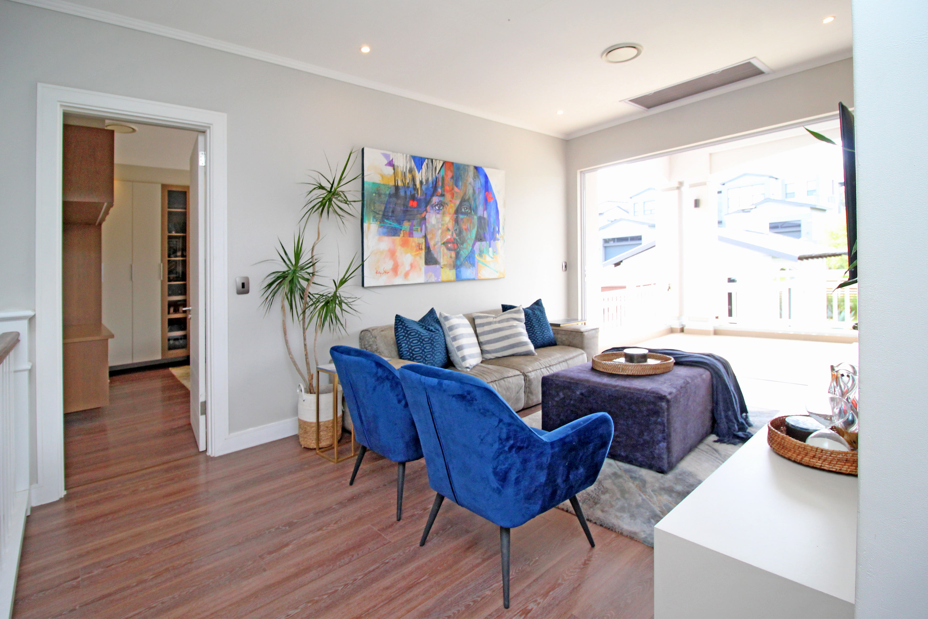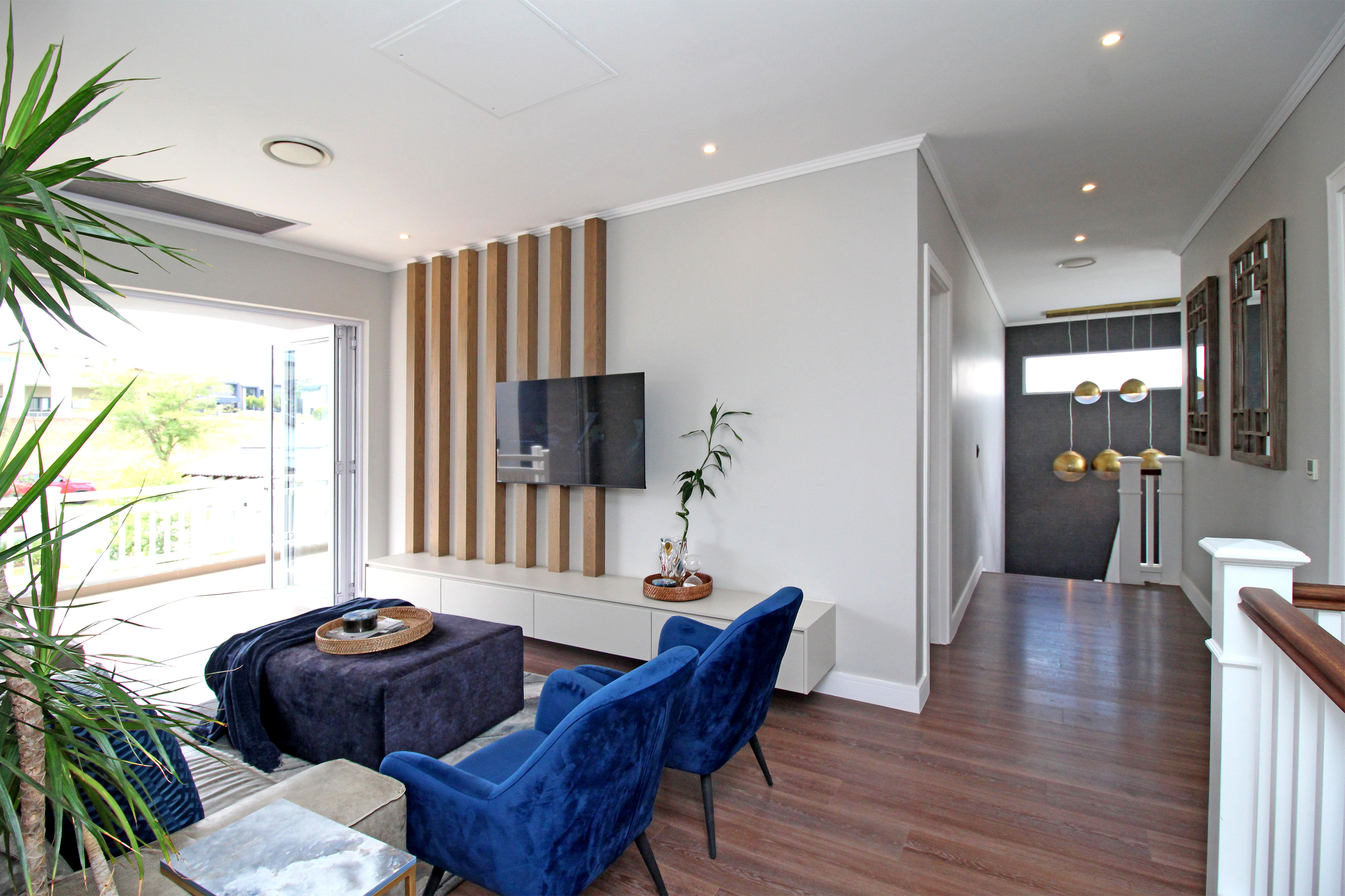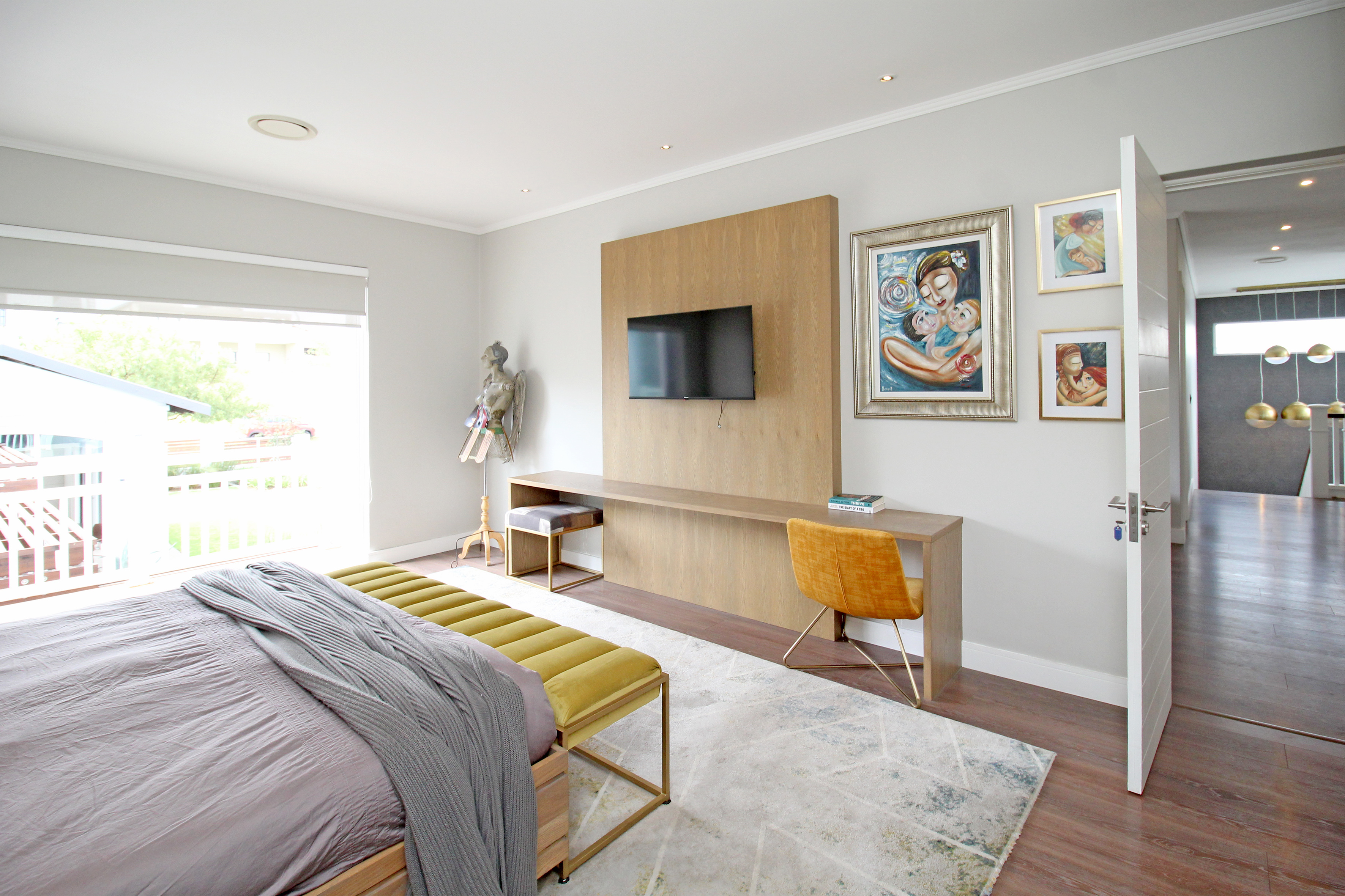A cleverly designed wooden open wine cellar beneath the staircase adds a touch of understated sophistication as you make your way upstairs. Here, a cosy pyjama lounge opens via glass sliders onto a private balcony with views over the pool and clubhouse — a tranquil spot to unwind. Three additional en-suite bedrooms, each finished with luxurious bathrooms and quality custom cabinetry, complete the upper level, ensuring comfort and elegance for every member of the household.