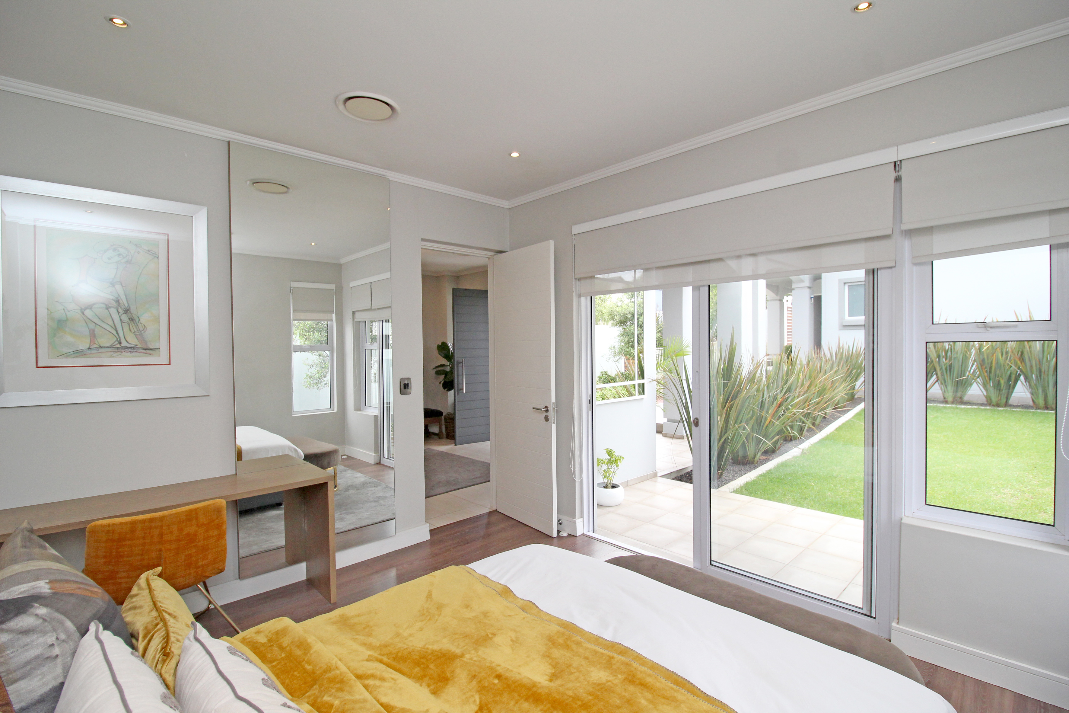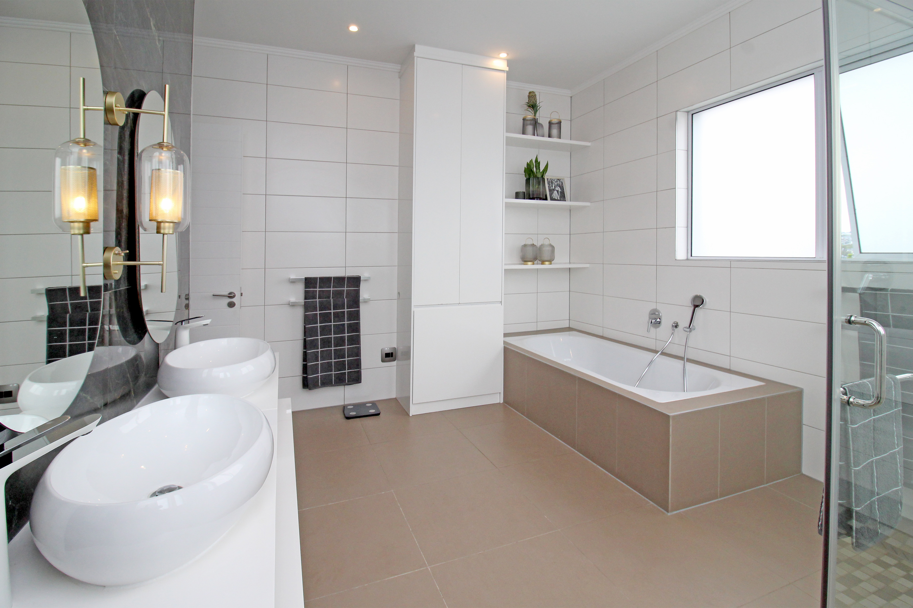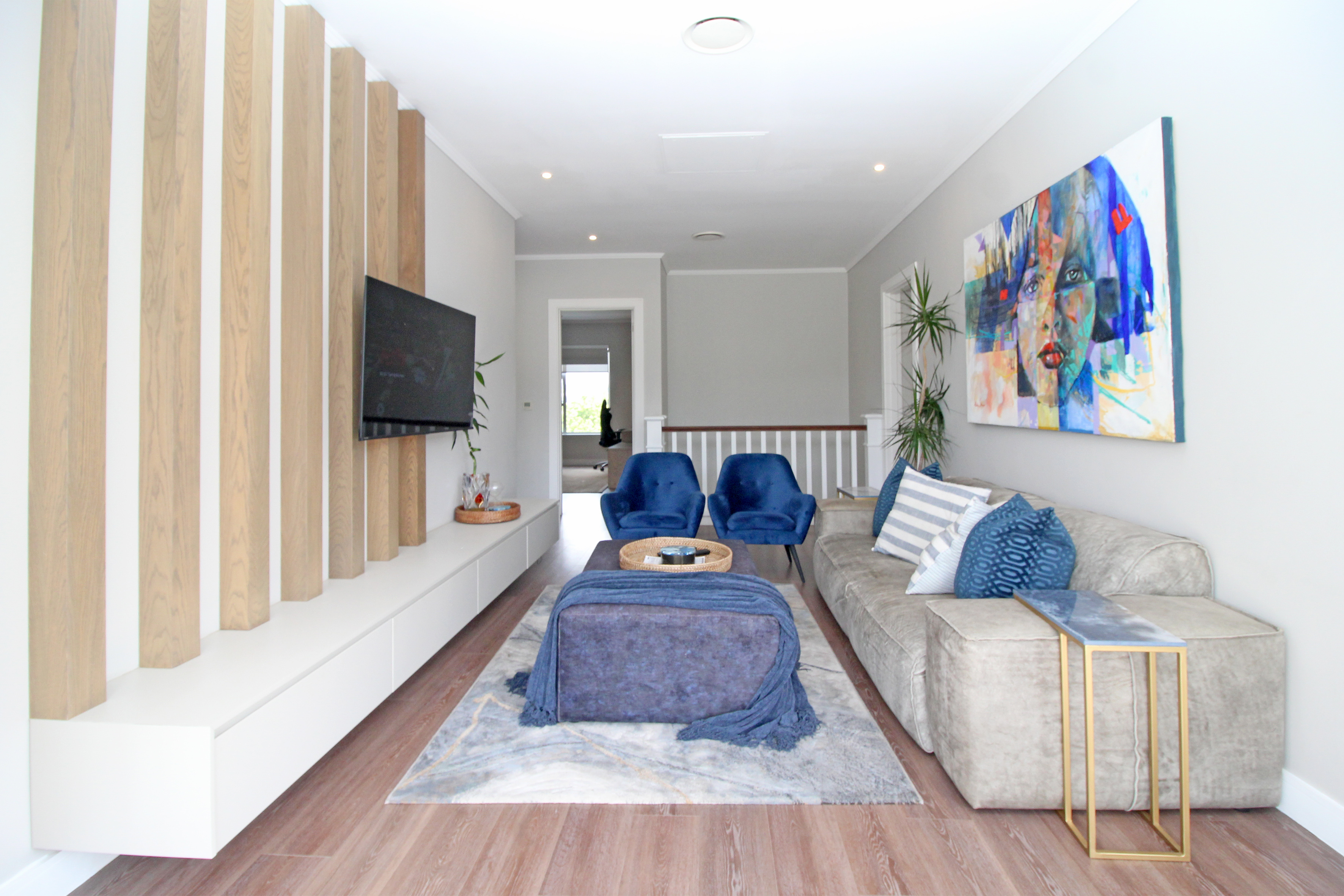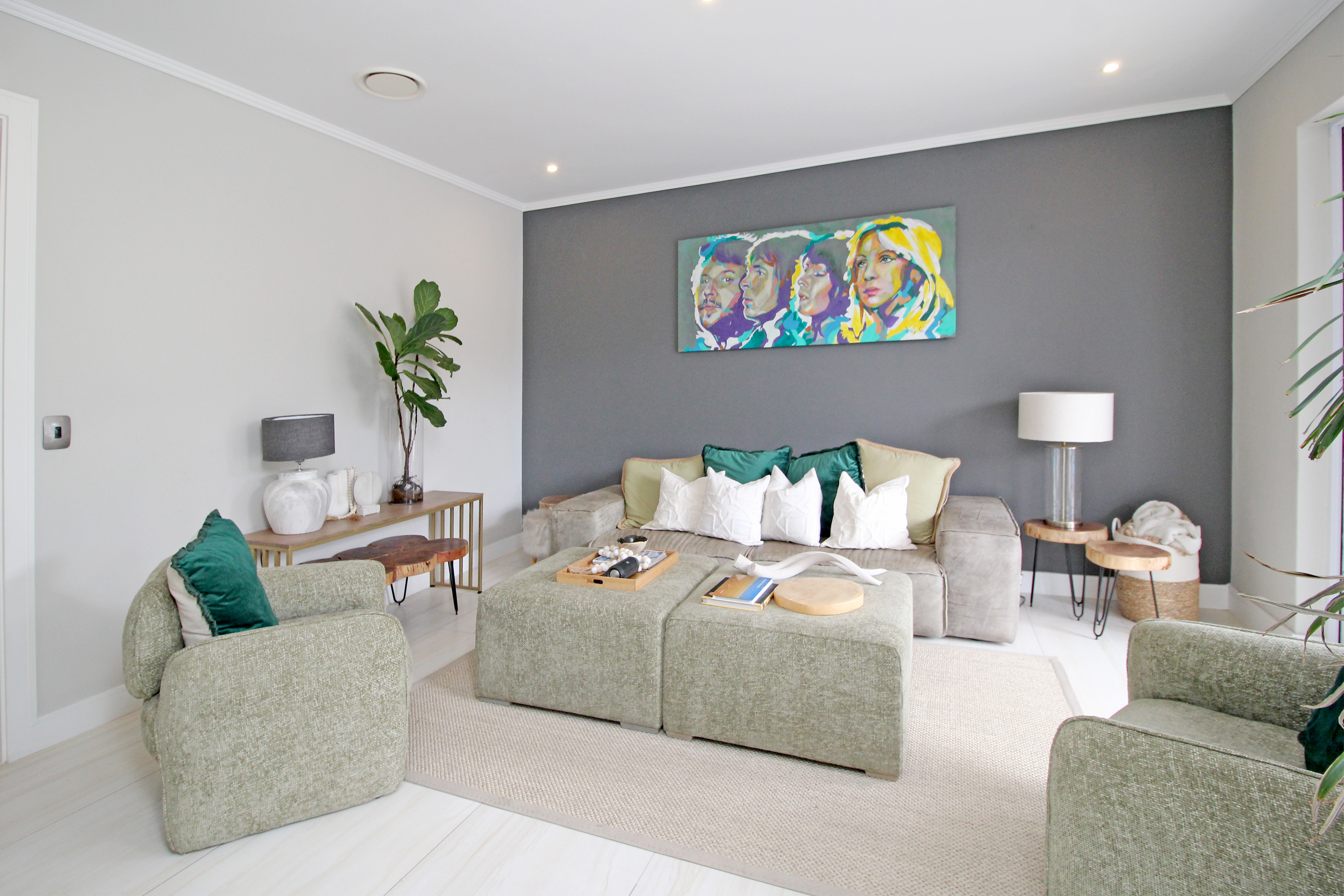A cleverly designed wooden open wine cellar beneath the staircase adds a touch of understated sophistication as you make your way upstairs. Here, a cosy pyjama lounge opens via glass sliders onto a private balcony with views over the pool and clubhouse — a tranquil spot to unwind. Three additional en-suite bedrooms, each finished with luxurious bathrooms and quality custom cabinetry, complete the upper level, ensuring comfort and elegance for every member of the household.