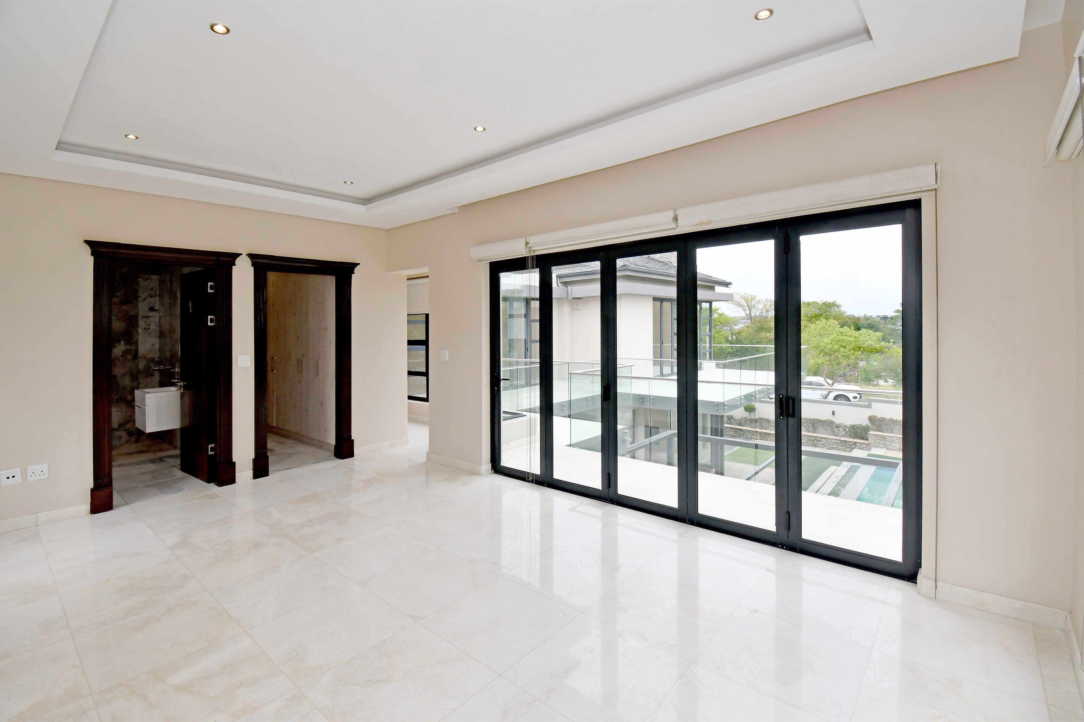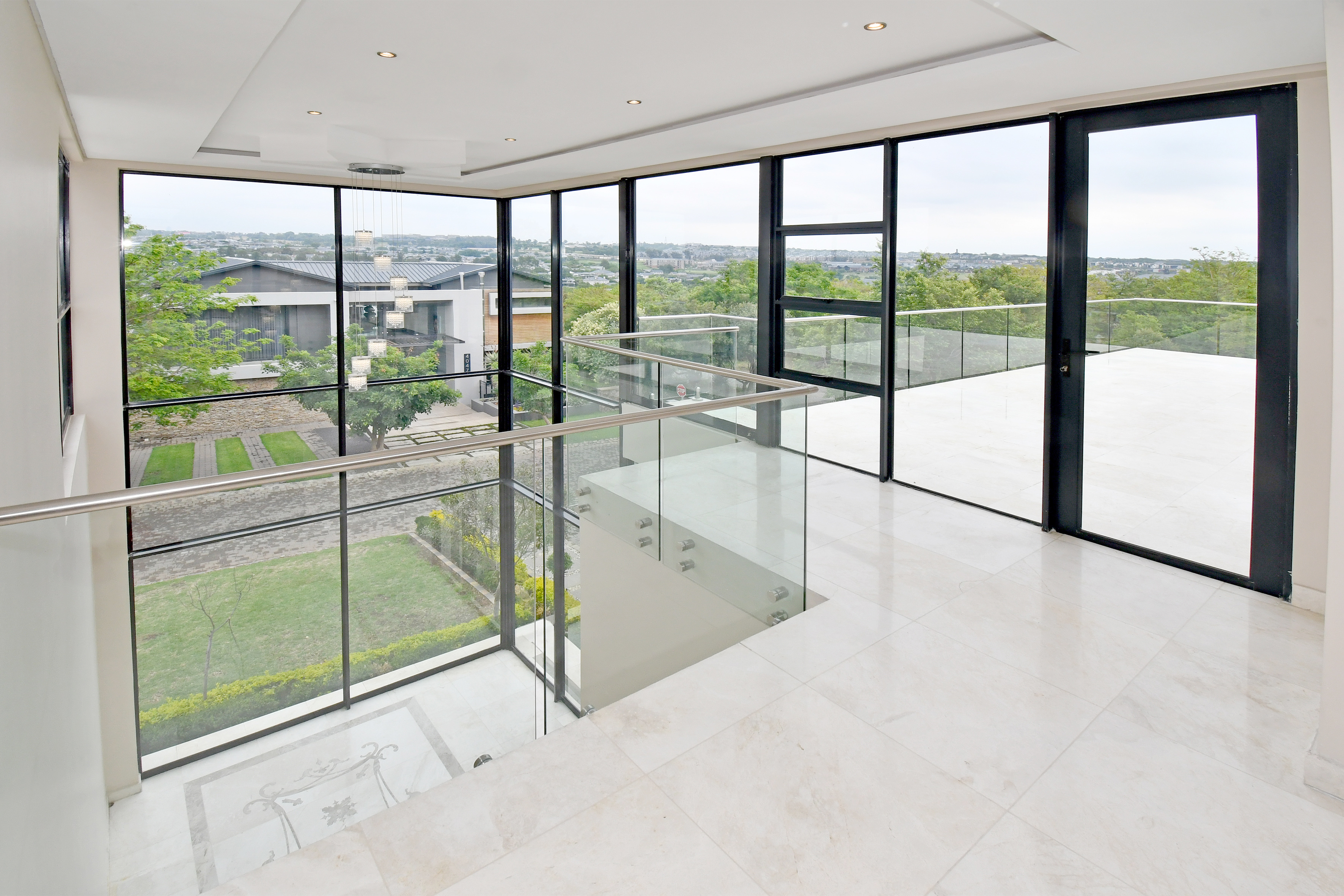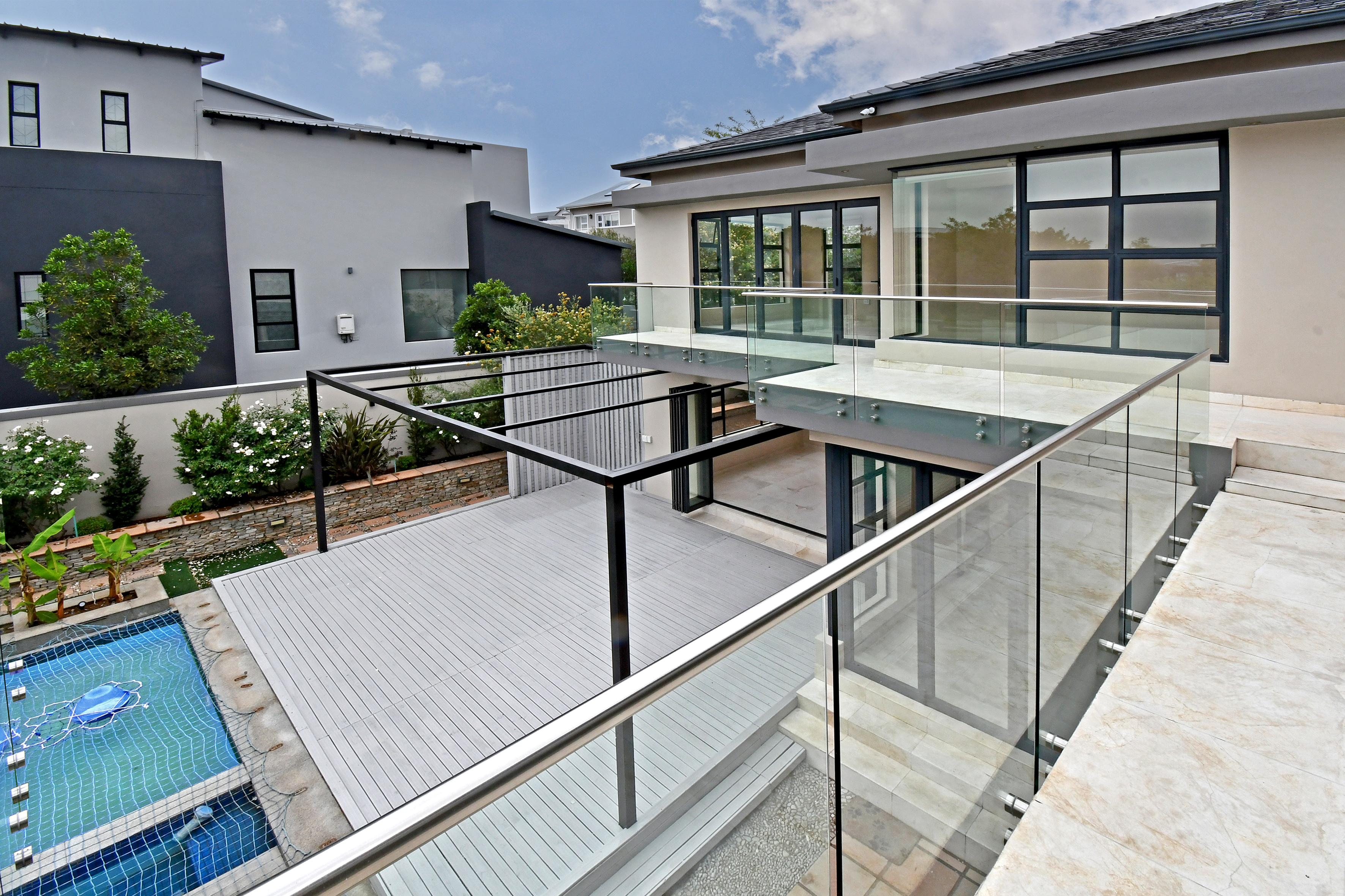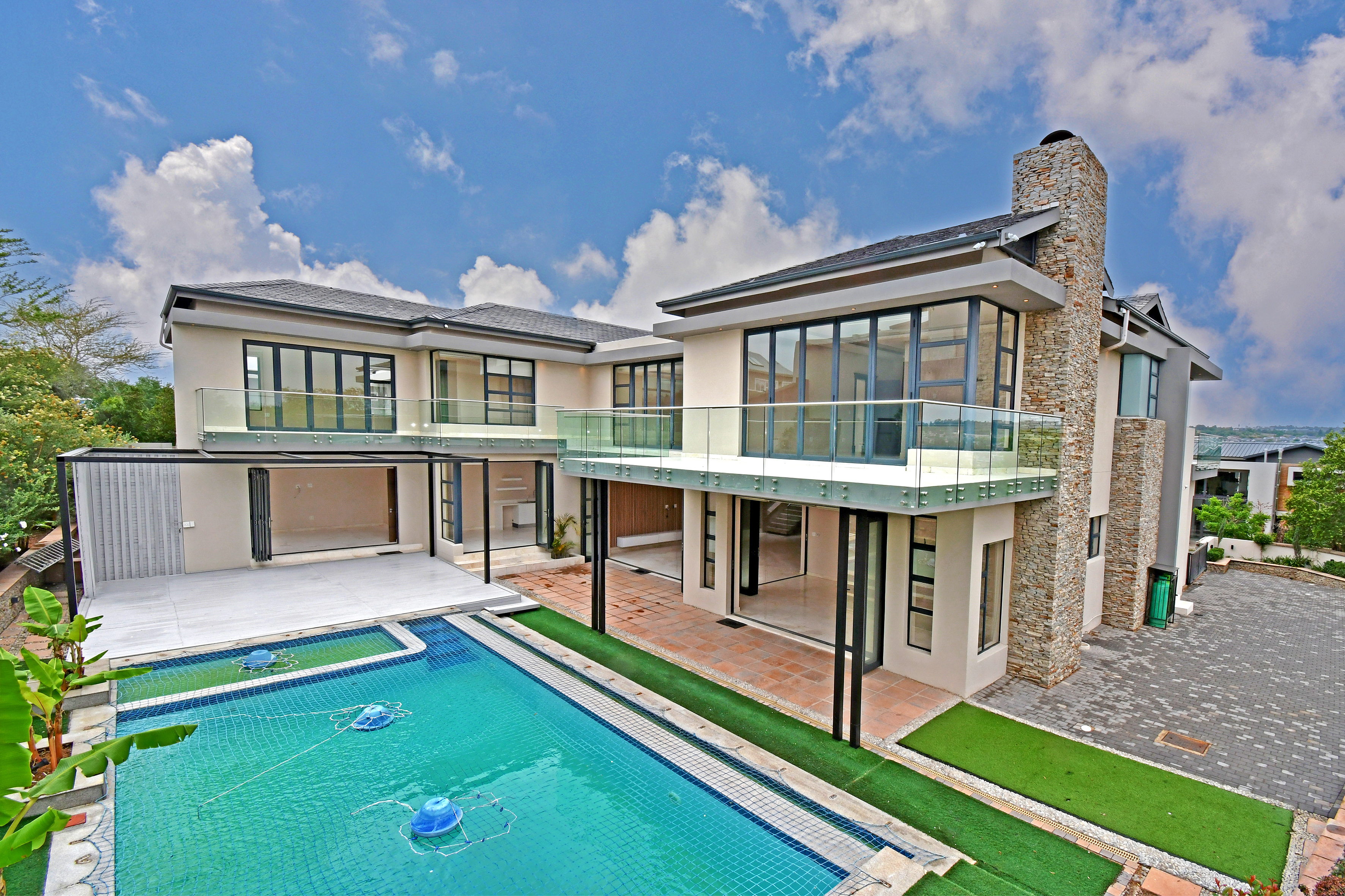 Ascending the beautifully crafted stone-tiled staircase to the upper level, you’ll find a spacious lounge area with travertine flooring and glass stacker doors opening to a large shared balcony overlooking the lush garden and pool below. The upper level houses five generous bedrooms, each with its own luxuriously appointed ensuite bathroom and built-in wardrobes. Some of the bedrooms also enjoy private balcony access with panoramic views of the Waterfall skyline. The Main bedroom is really spacious and boasts a walk-in wardrobe, balcony access through large glass stacker doors and a stunning full bathroom complete with a large shower and stand alone tub, perfect for those long, hard days that require a long, quiet soak in the tub.