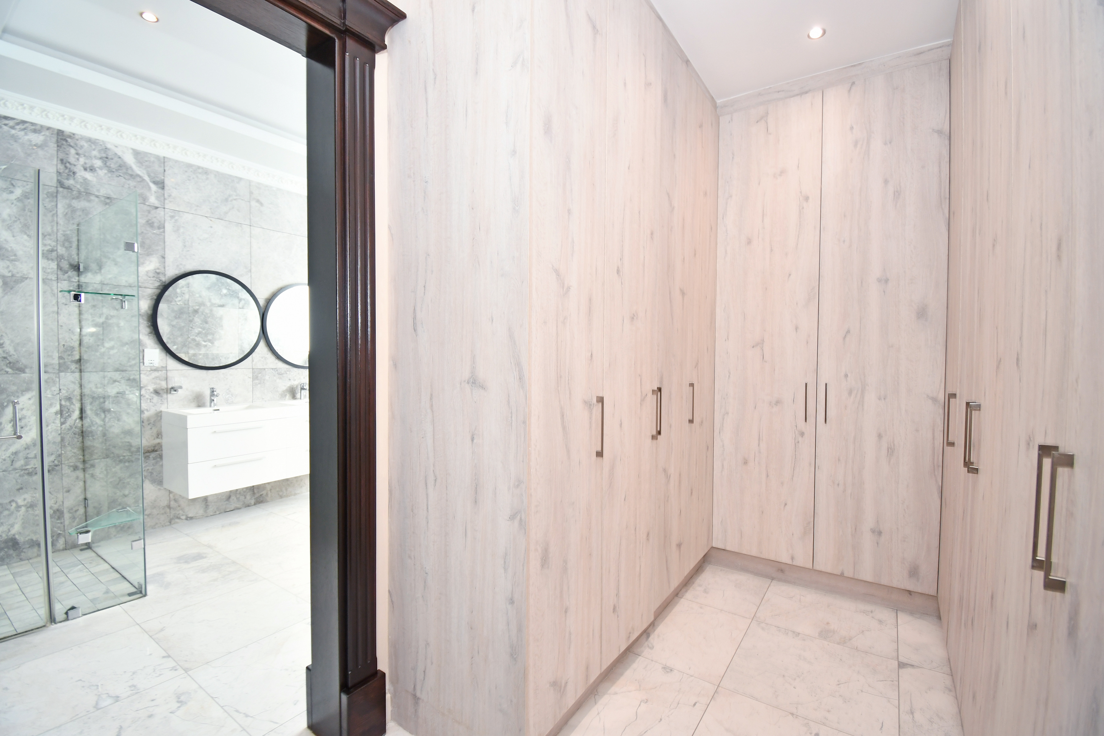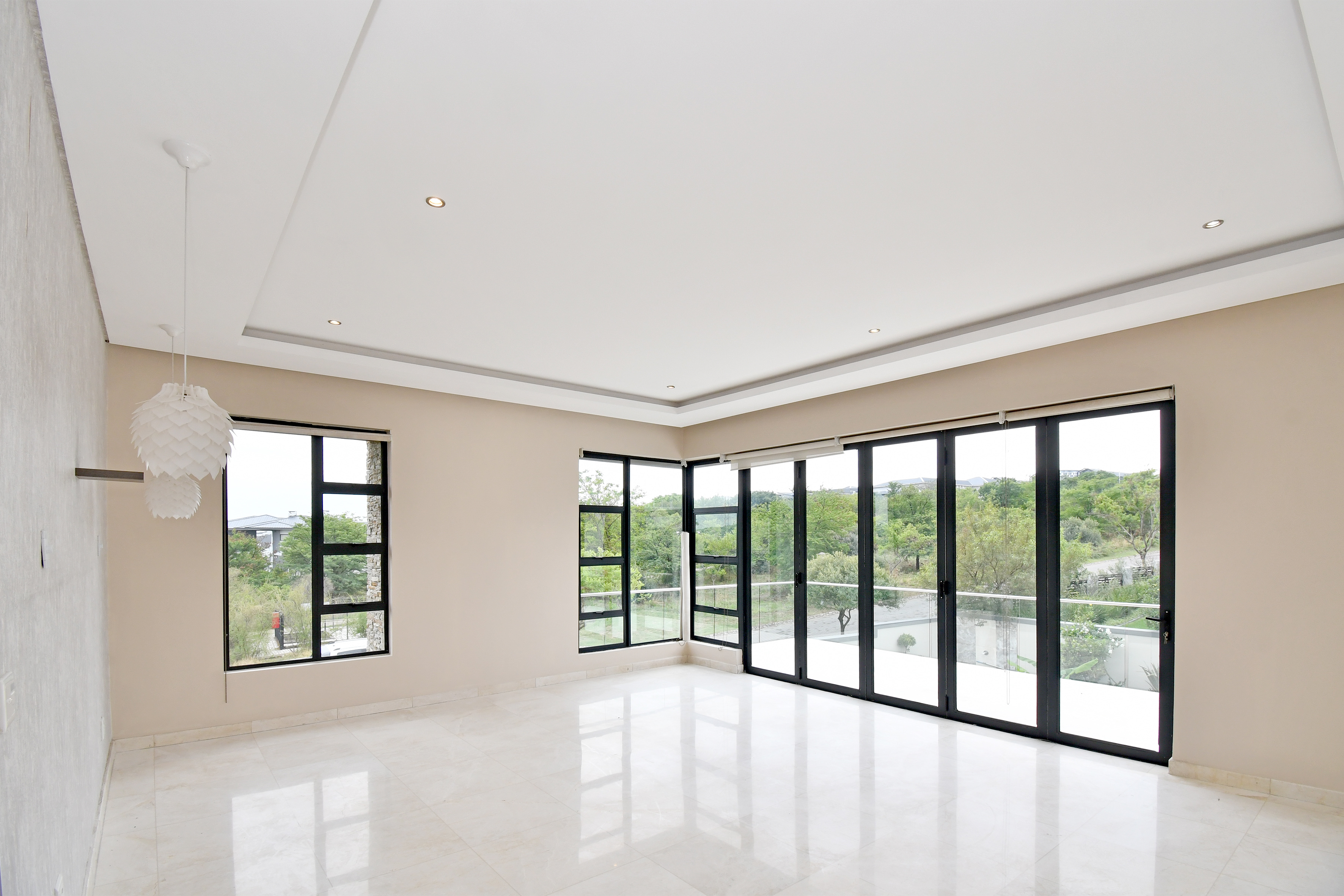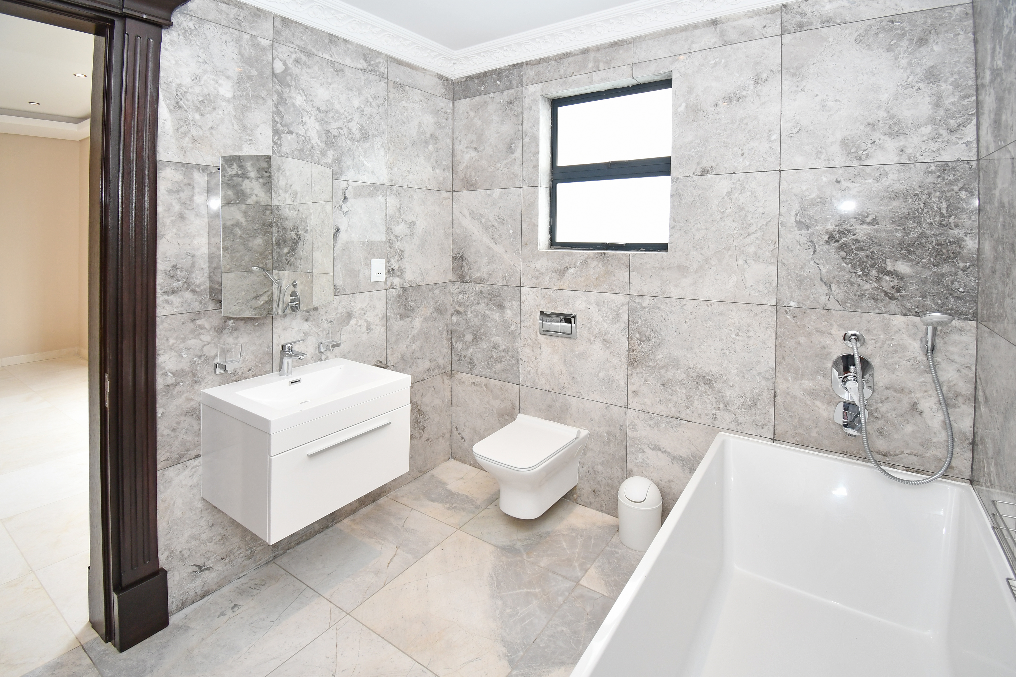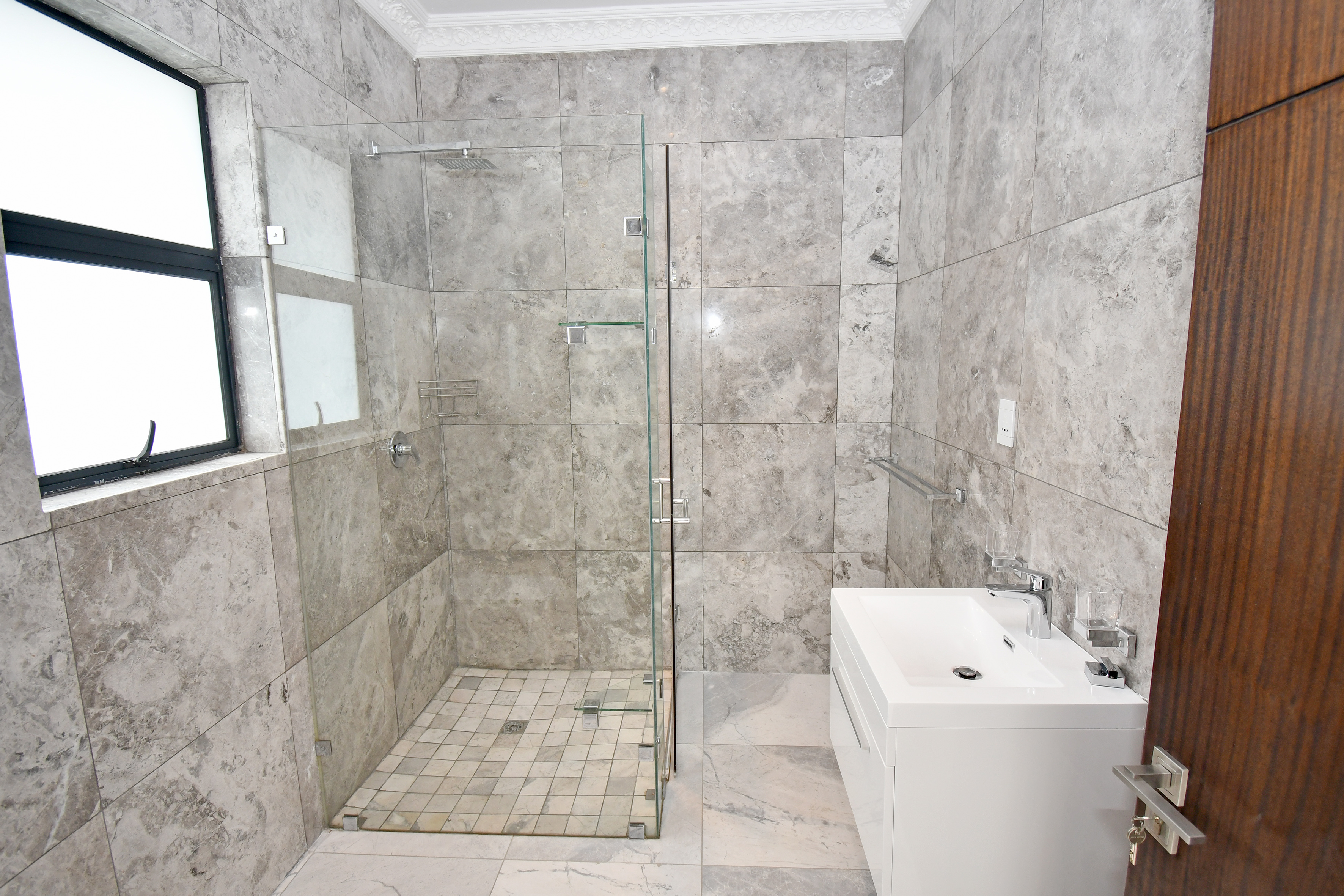 Ascending the beautifully crafted stone-tiled staircase to the upper level, you’ll find a spacious lounge area with travertine flooring and glass stacker doors opening to a large shared balcony overlooking the lush garden and pool below. The upper level houses five generous bedrooms, each with its own luxuriously appointed ensuite bathroom and built-in wardrobes. Some of the bedrooms also enjoy private balcony access with panoramic views of the Waterfall skyline. The Main bedroom is really spacious and boasts a walk-in wardrobe, balcony access through large glass stacker doors and a stunning full bathroom complete with a large shower and stand alone tub, perfect for those long, hard days that require a long, quiet soak in the tub.