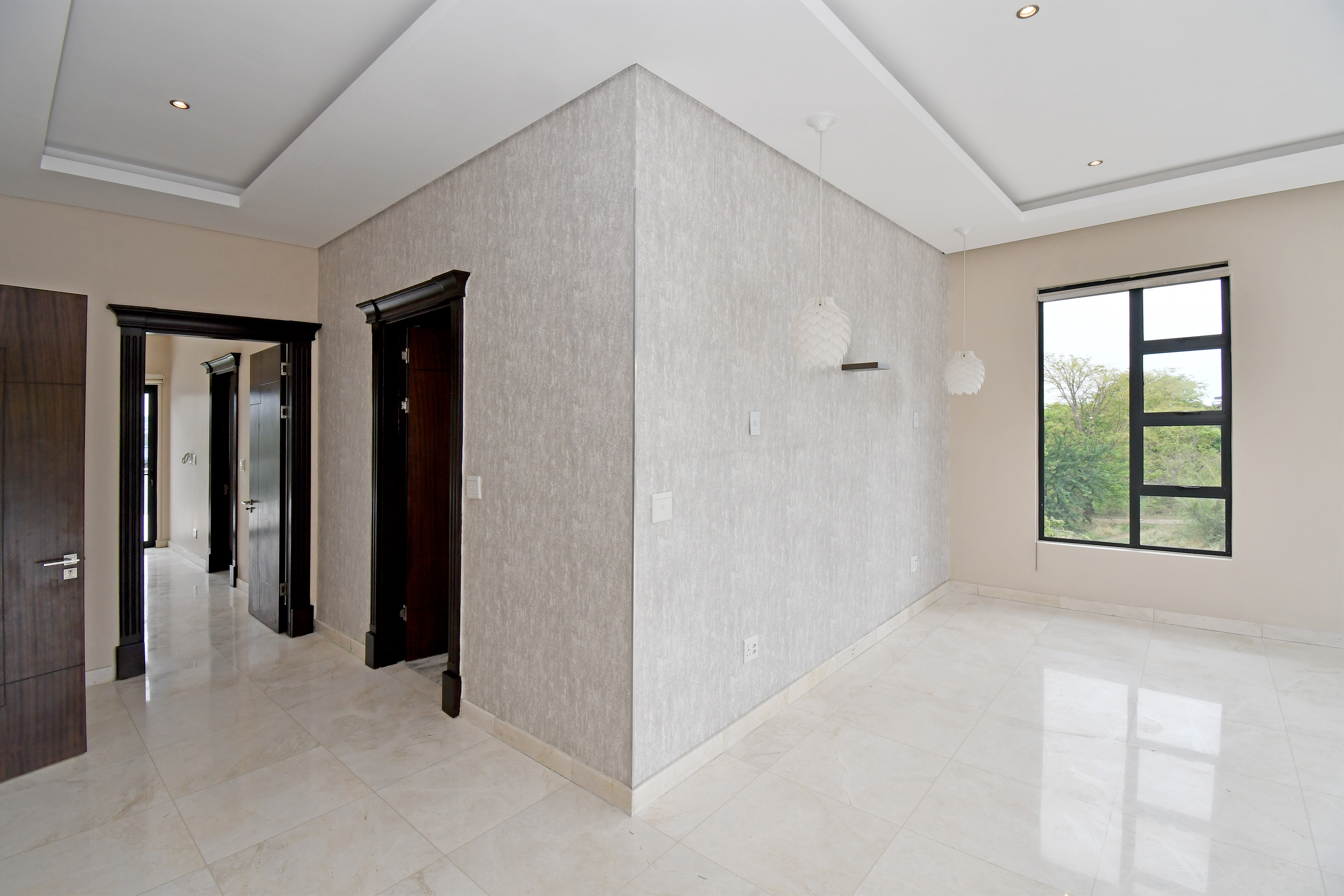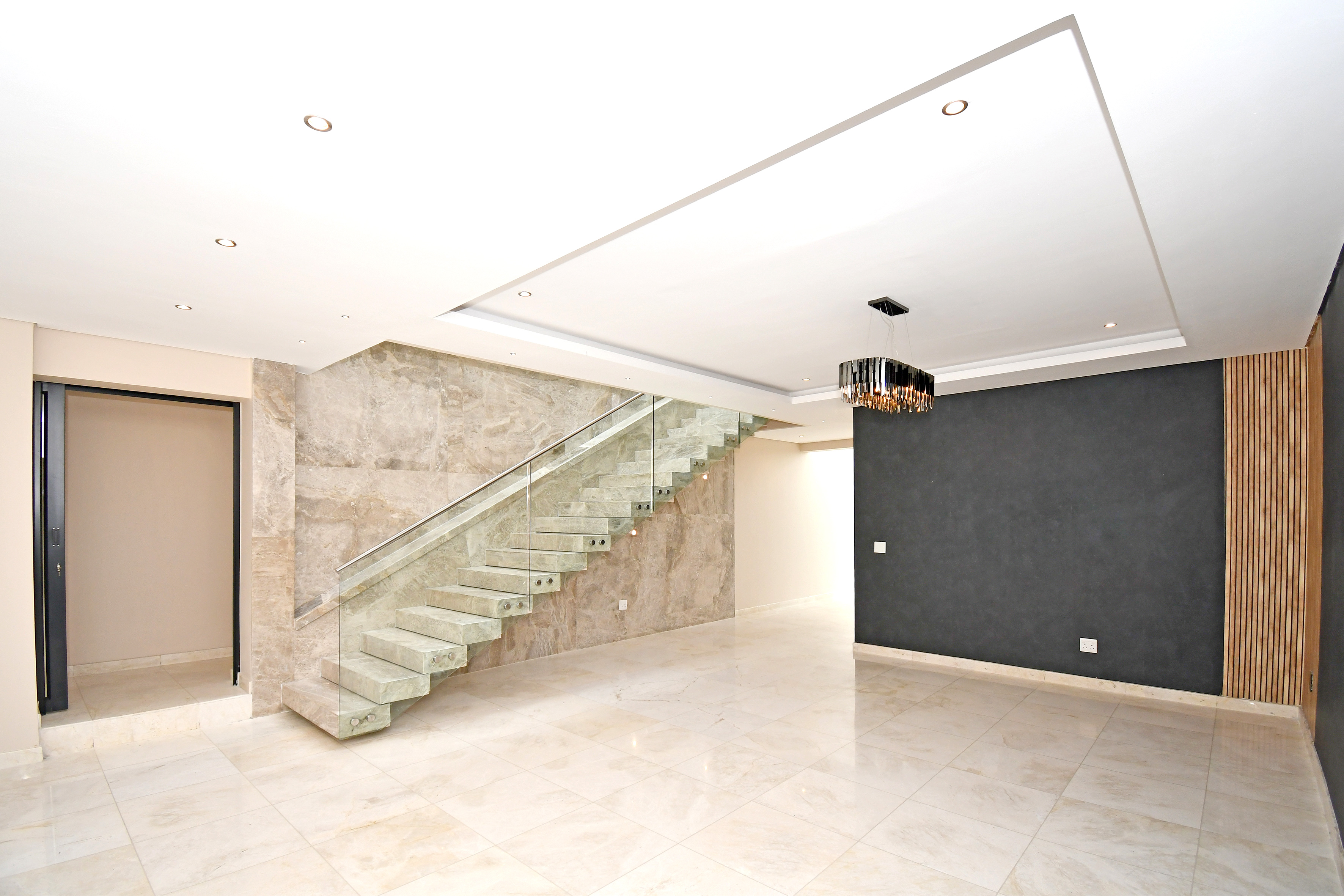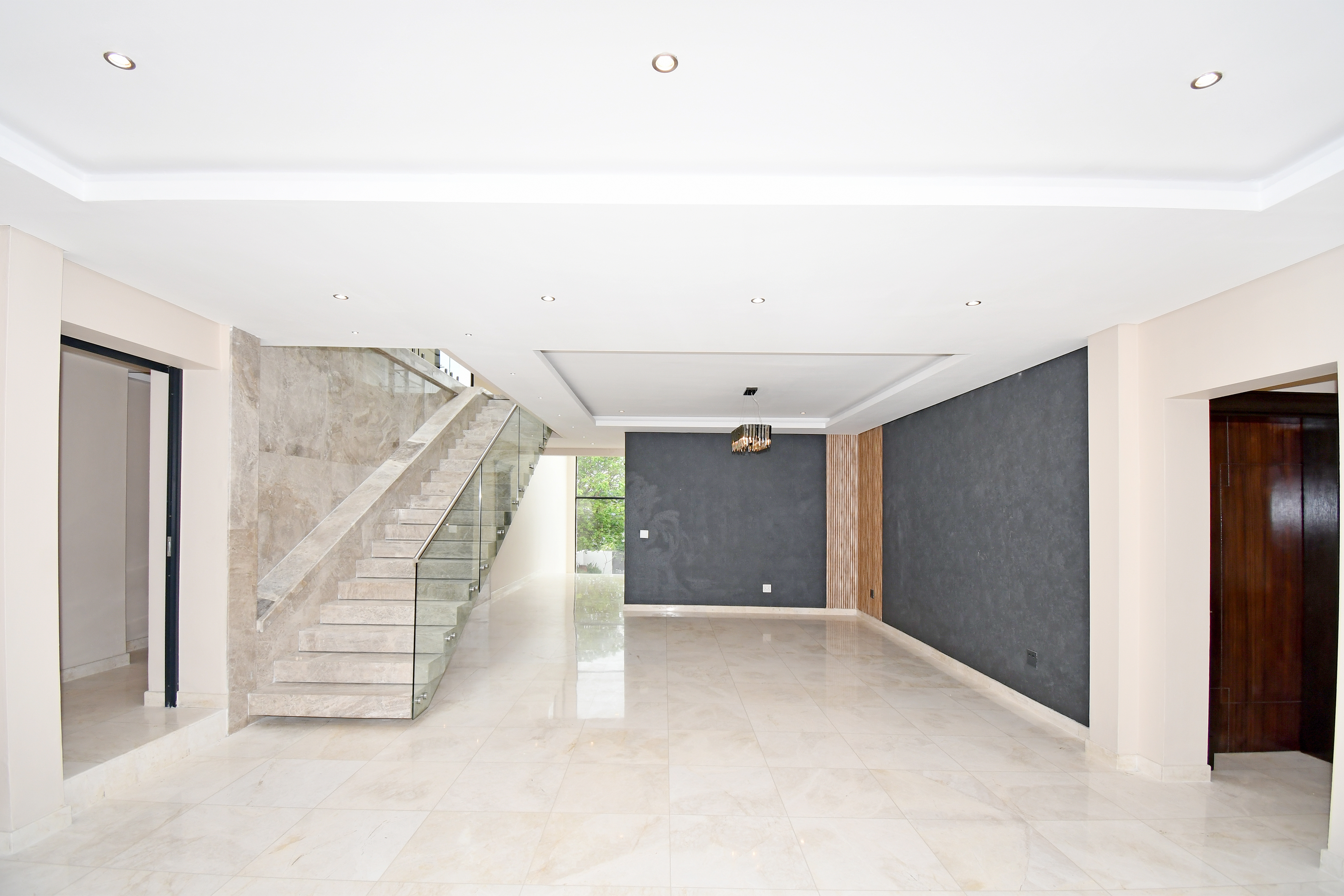 The grand arrival begins with a split paved driveway, each side featuring a double automated garage — providing parking for up to four vehicles — along with additional off-road parking to the left wing of the home. The double-volume glass cubical entrance hall makes an unforgettable first impression, setting the tone for the elegance and scale that unfold within.