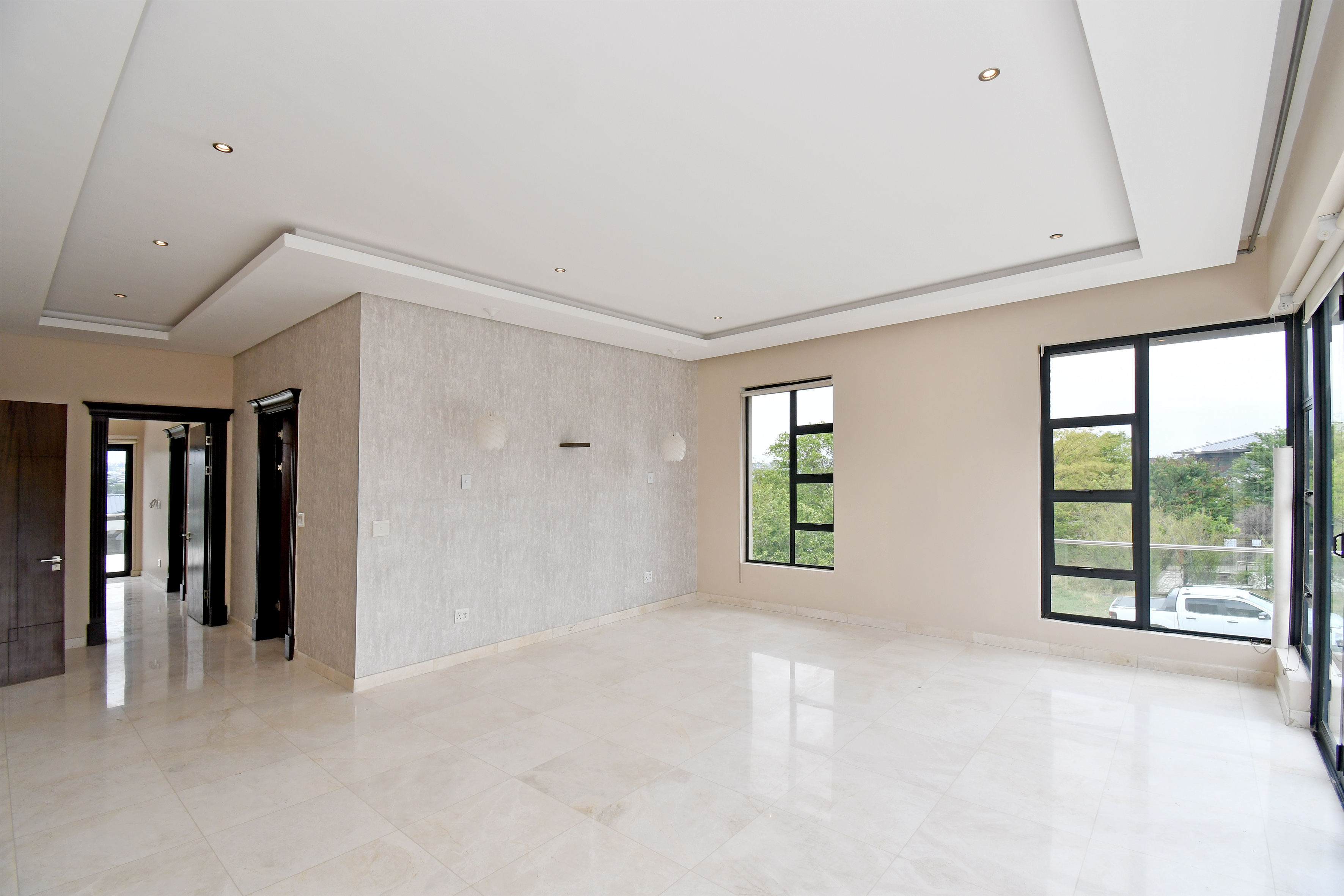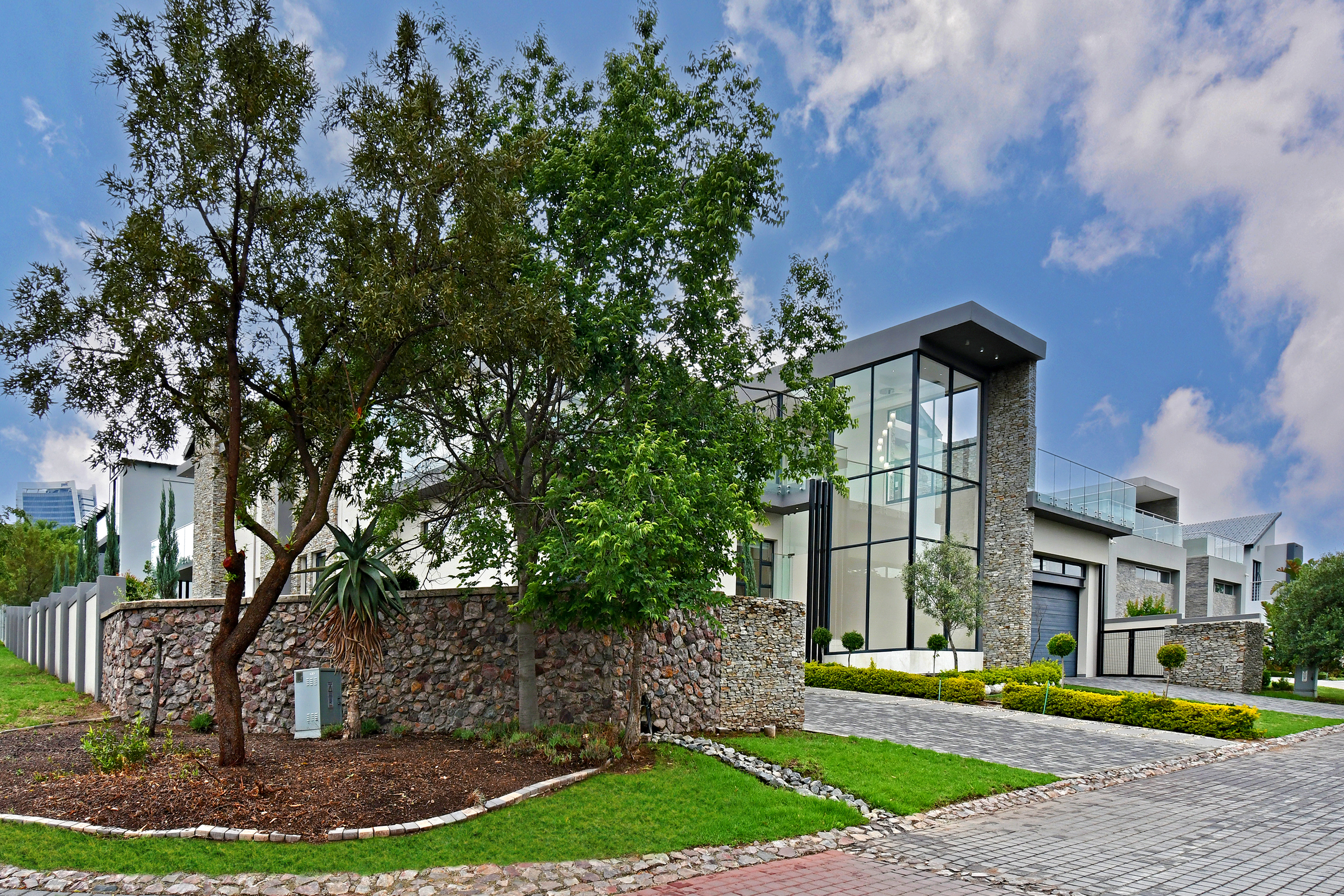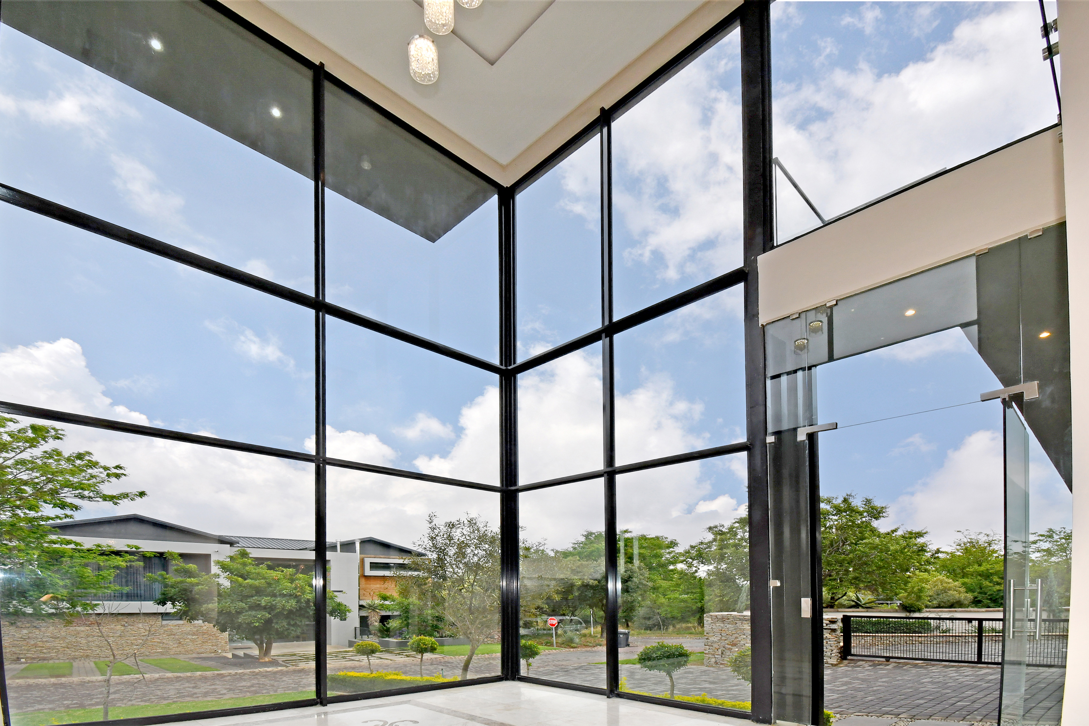 The grand arrival begins with a split paved driveway, each side featuring a double automated garage — providing parking for up to four vehicles — along with additional off-road parking to the left wing of the home. The double-volume glass cubical entrance hall makes an unforgettable first impression, setting the tone for the elegance and scale that unfold within.