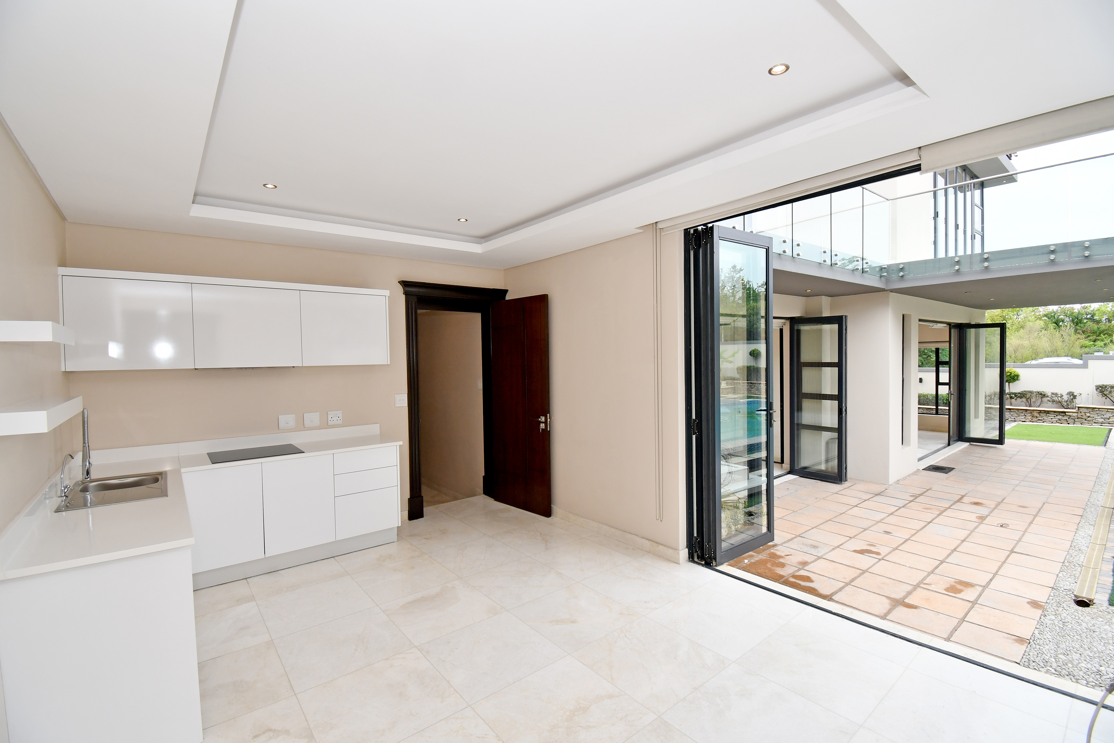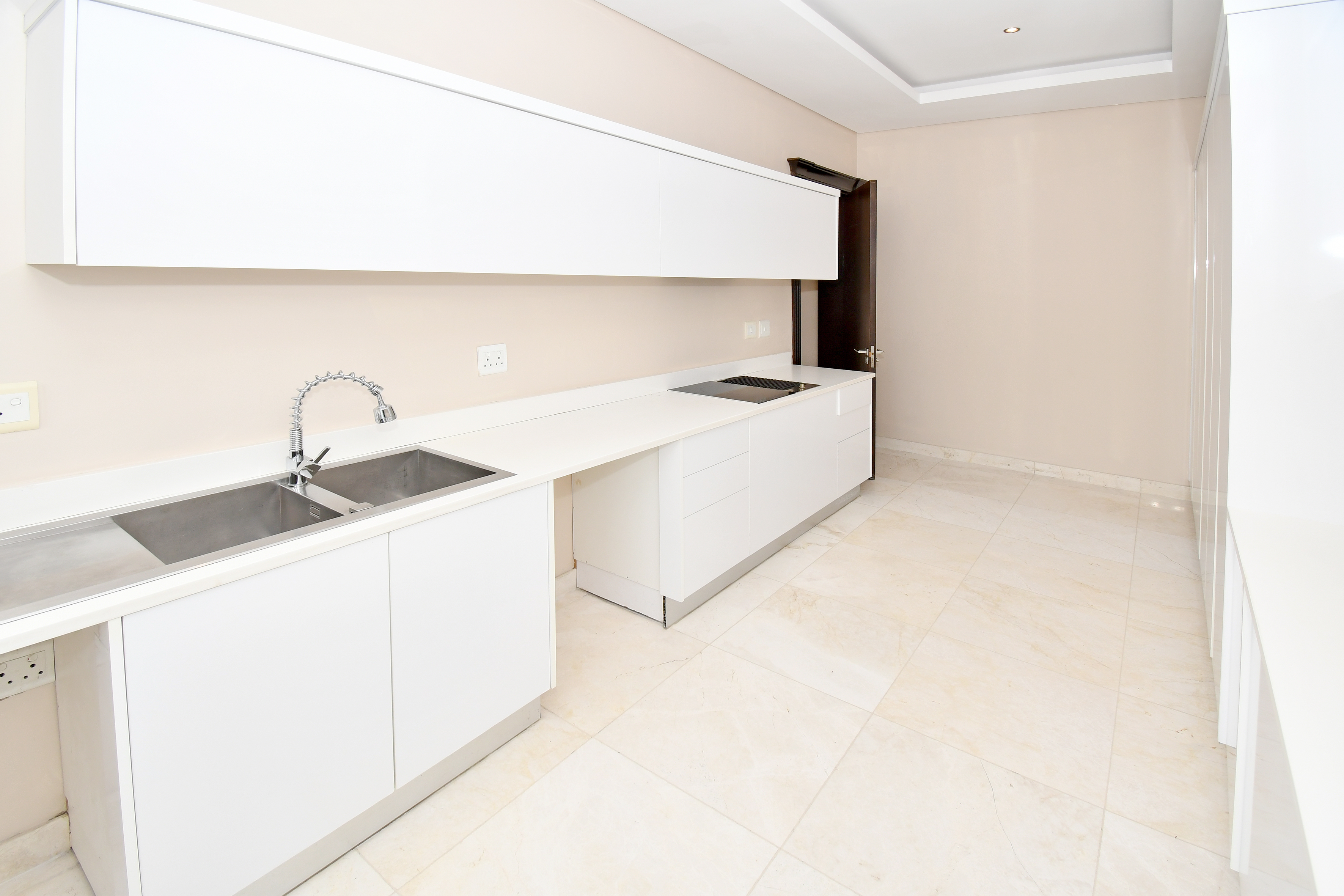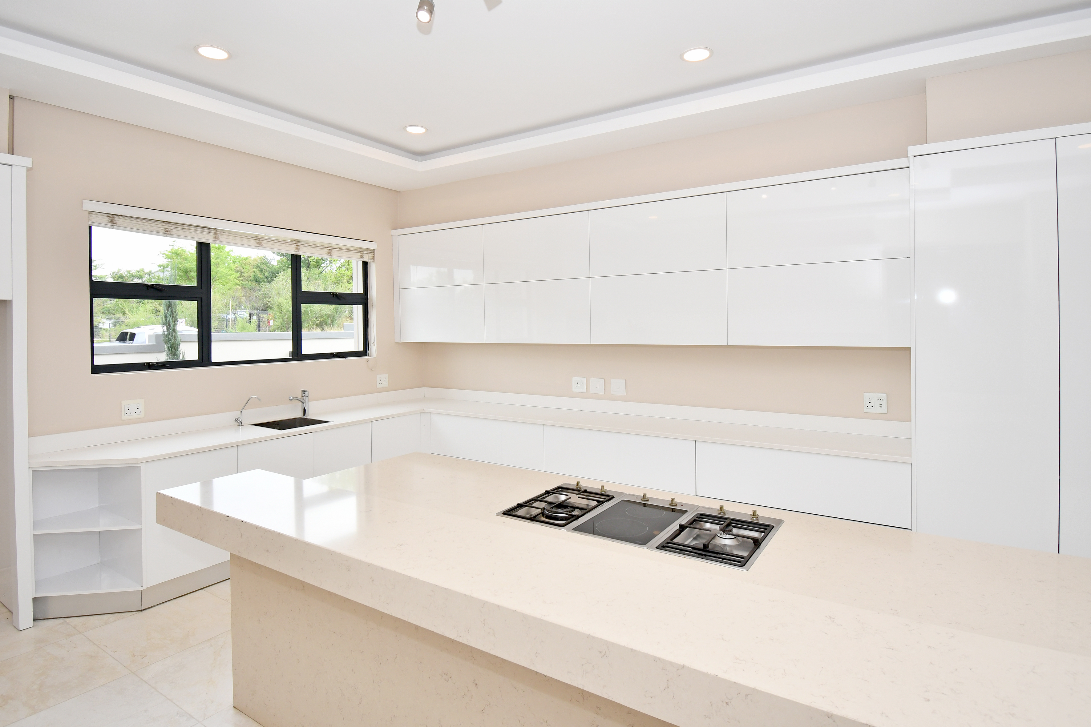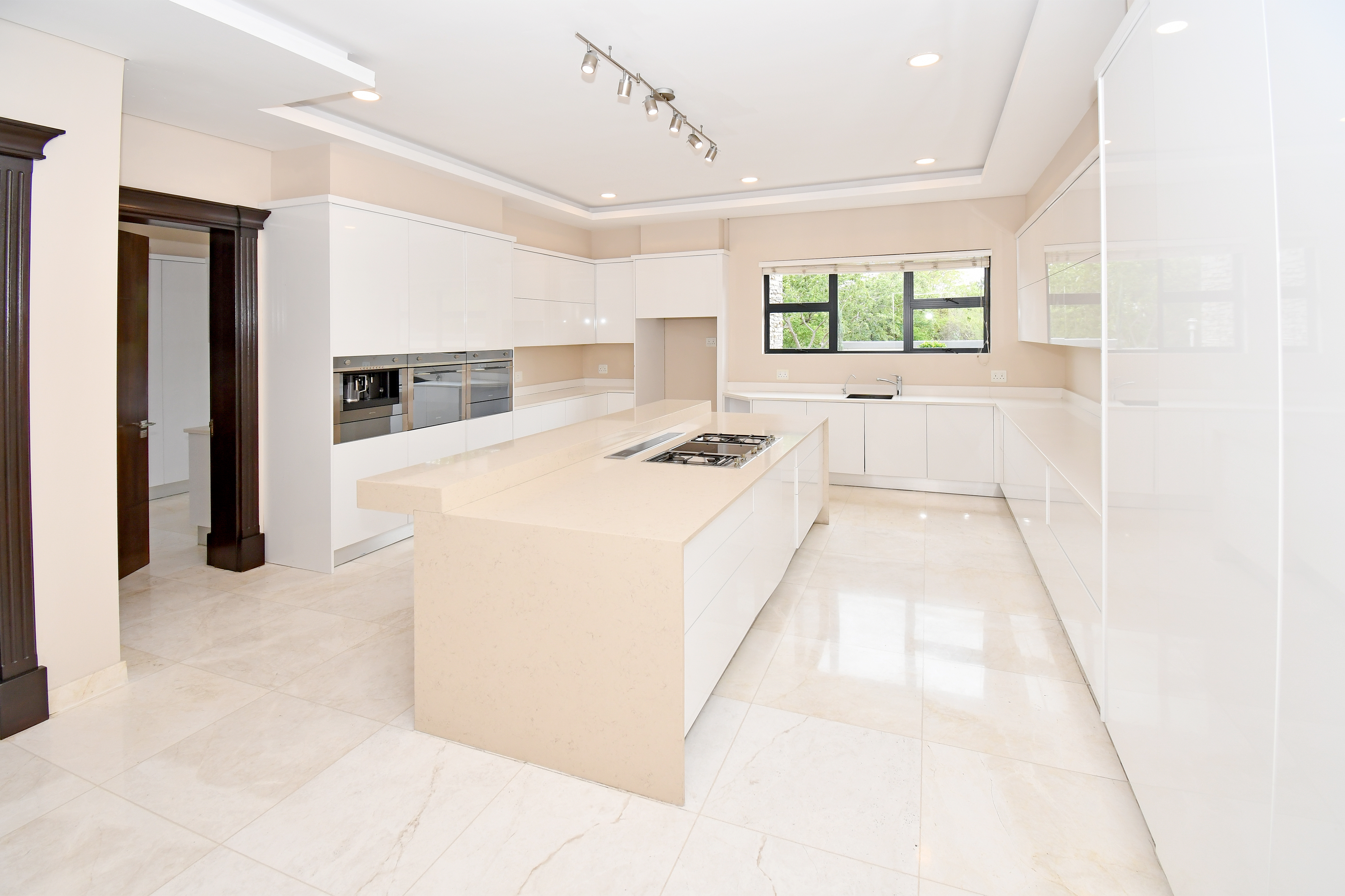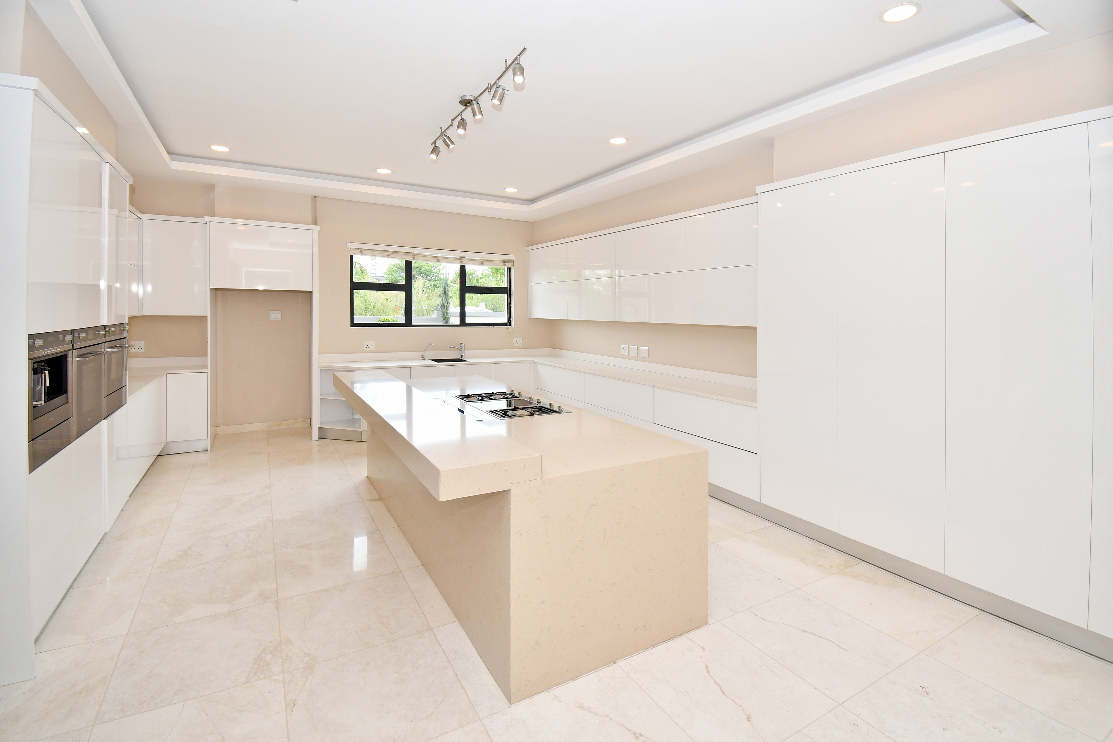 The designer kitchen is a showstopper — perfectly positioned at the heart of the home so that no one is left out of the fun while cooking or hosting. It features modern beige and sleek white cabinetry, a large stone-top island with a breakfast bar, integrated SMEG appliances, and ample counter and storage space. A convenient scullery is tucked neatly to the side.