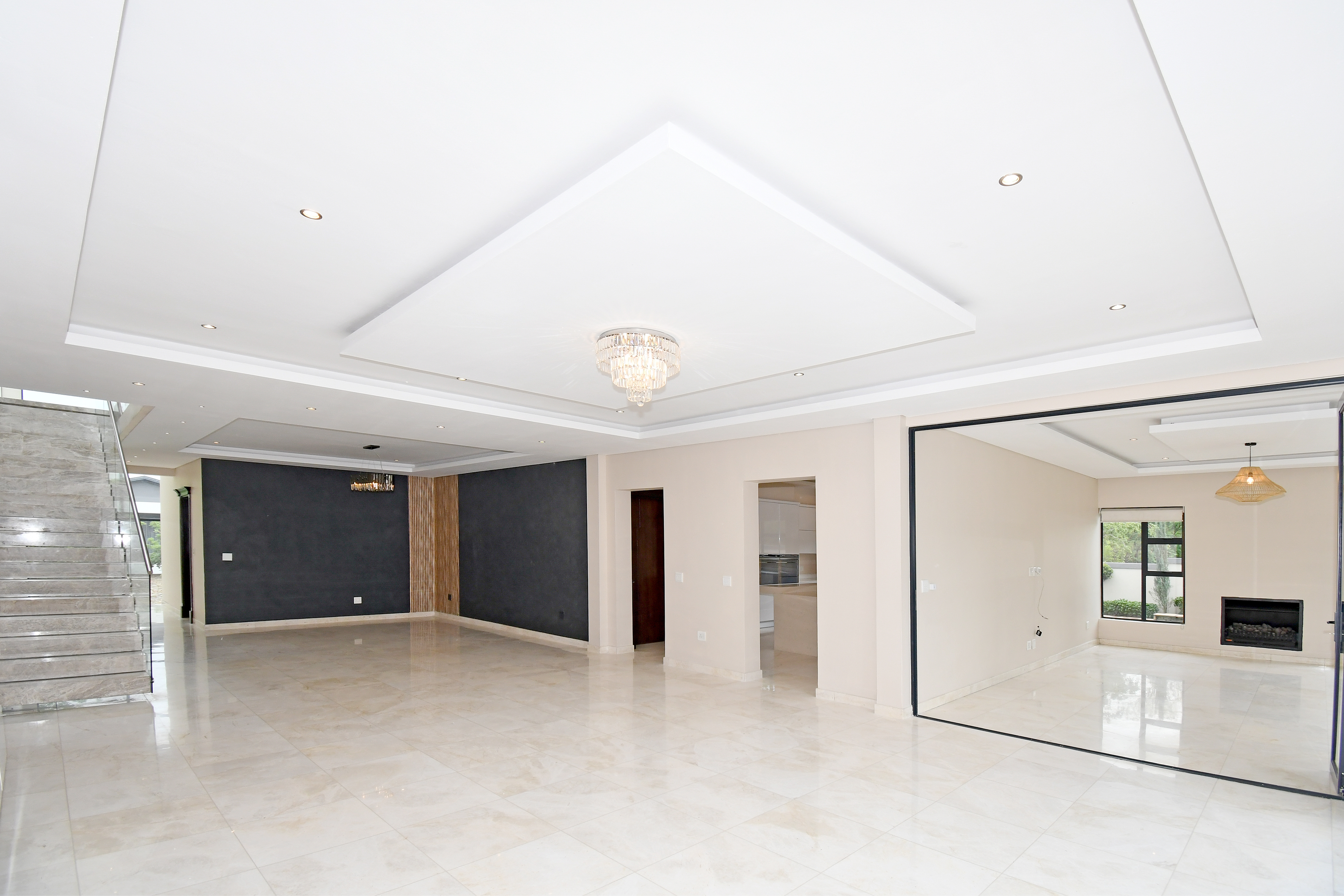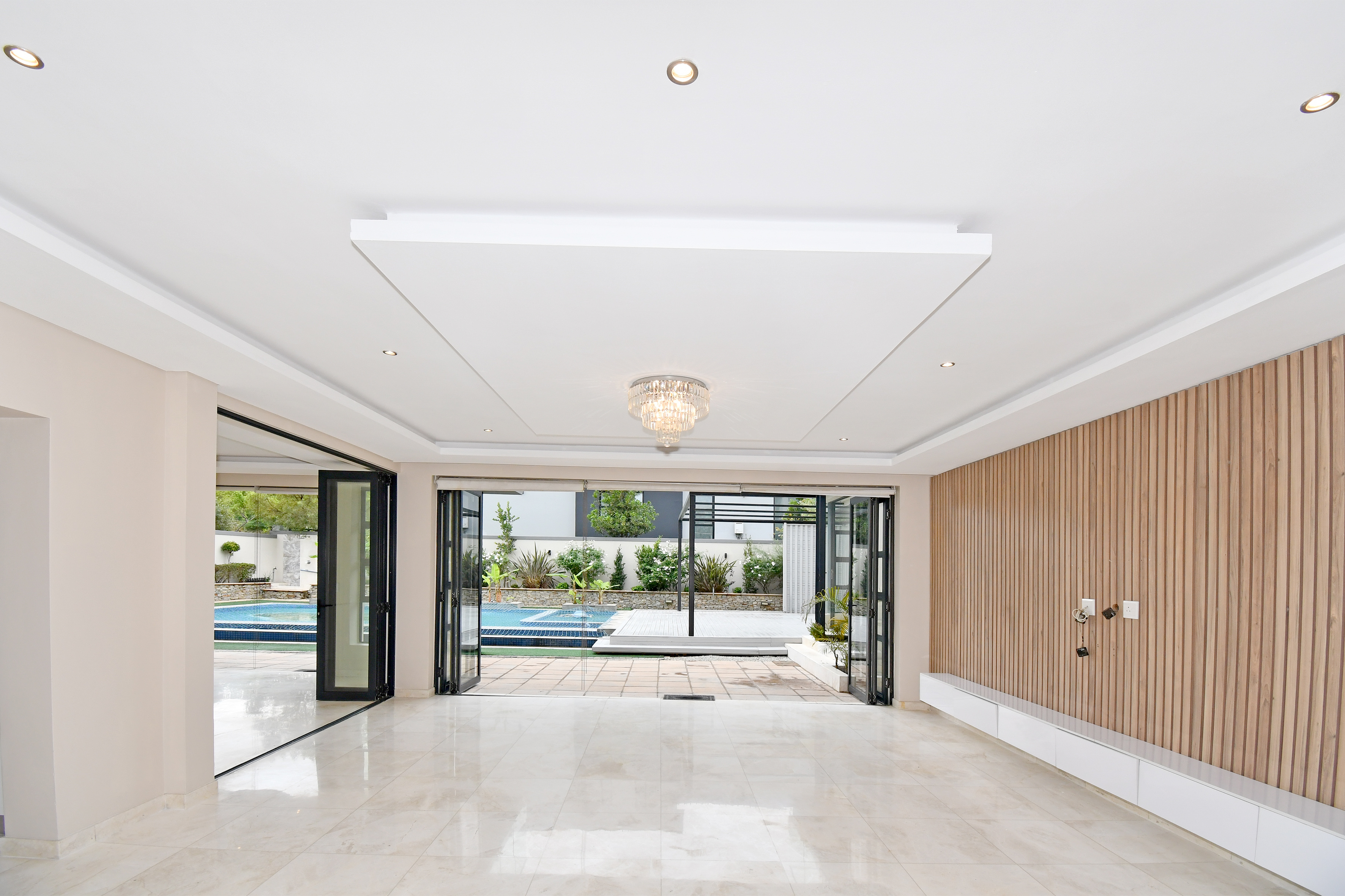 Stepping into the expansive, fully tiled lower level, your eyes are immediately drawn to the abundance of natural light streaming through floor-to-ceiling glass stacker doors that open along the entire length of the home. These doors seamlessly connect the indoor and outdoor spaces, creating a breathtaking open-plan entertainment area that includes the formal lounge, family room, dining area, and kitchen — all enhanced by wood-slat panelled feature walls, fireplace, striking chandeliers, and ambient recessed lighting. The established garden is neat and tidy and features a good-sized swimming pool and a large entertainment deck for those festive family gatherings all year round.