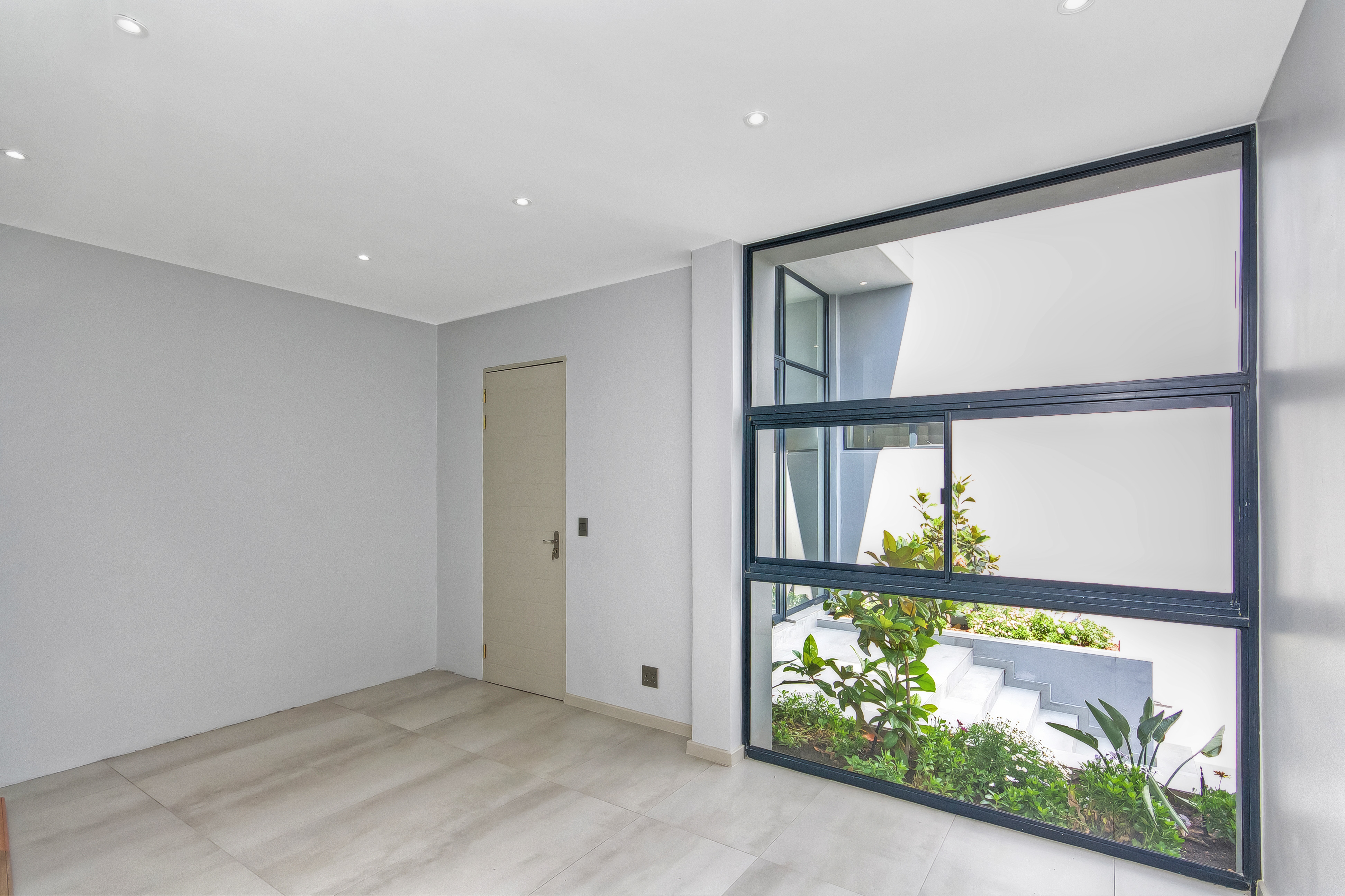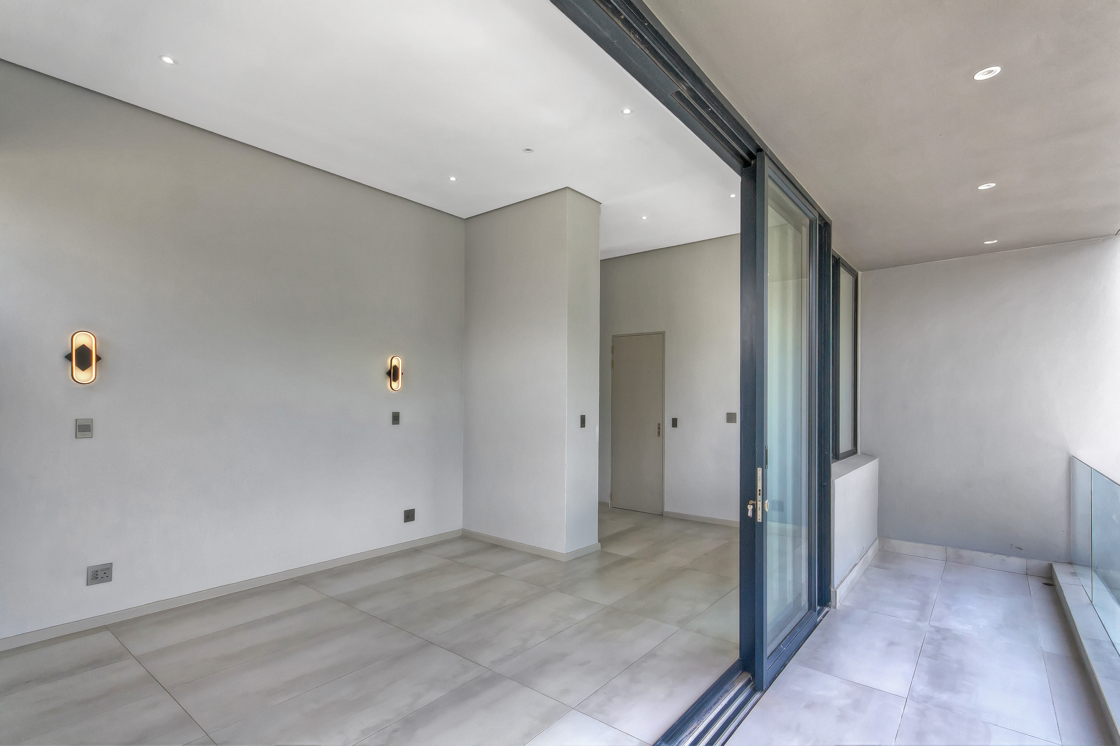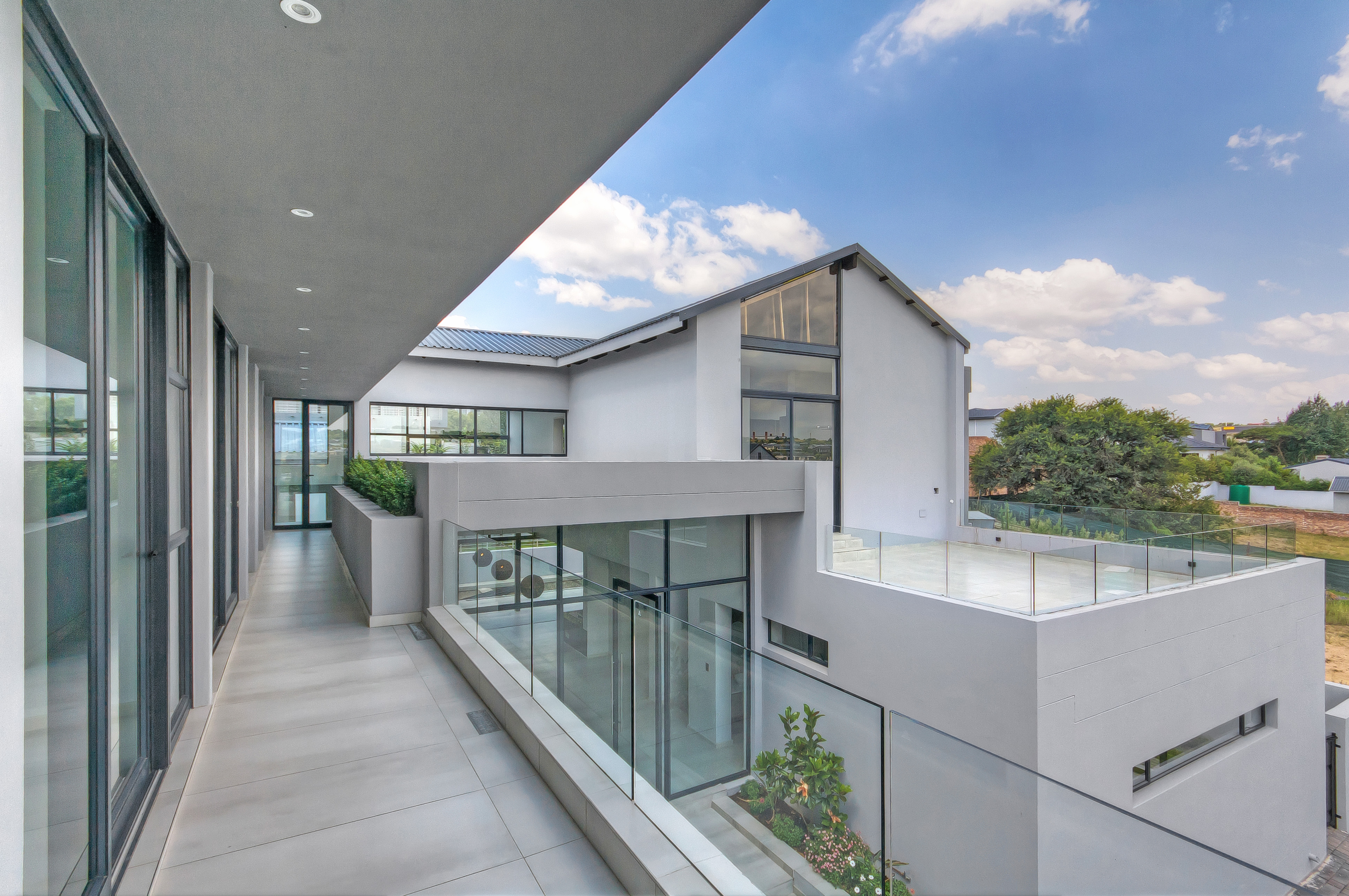 A striking glass and chrome balustrade staircase, enhanced by a dramatic wall of glass panels, leads you to the upper level. Here, a generous pyjama lounge with floor-to-ceiling windows overlooks the pool and garden below.