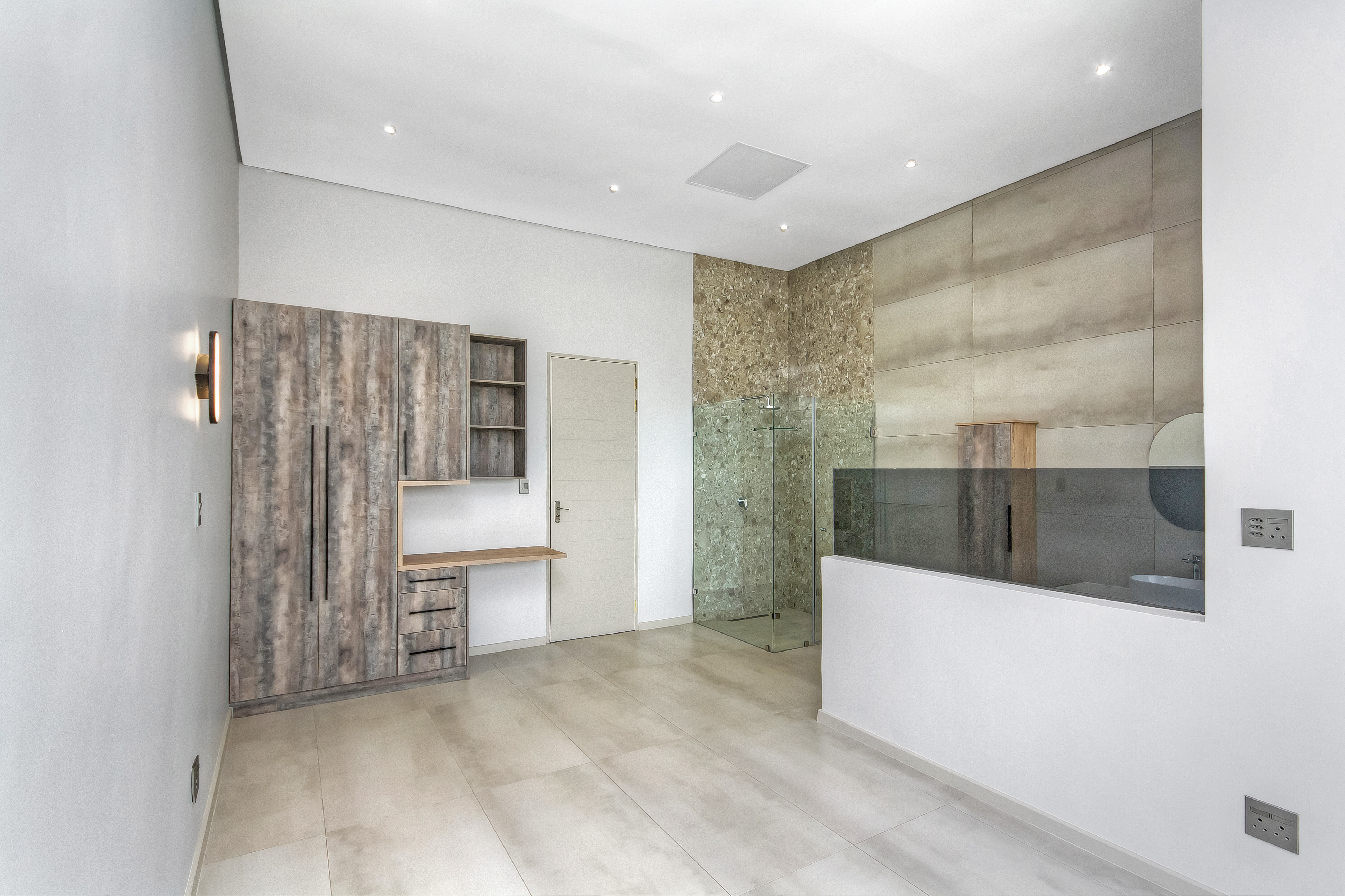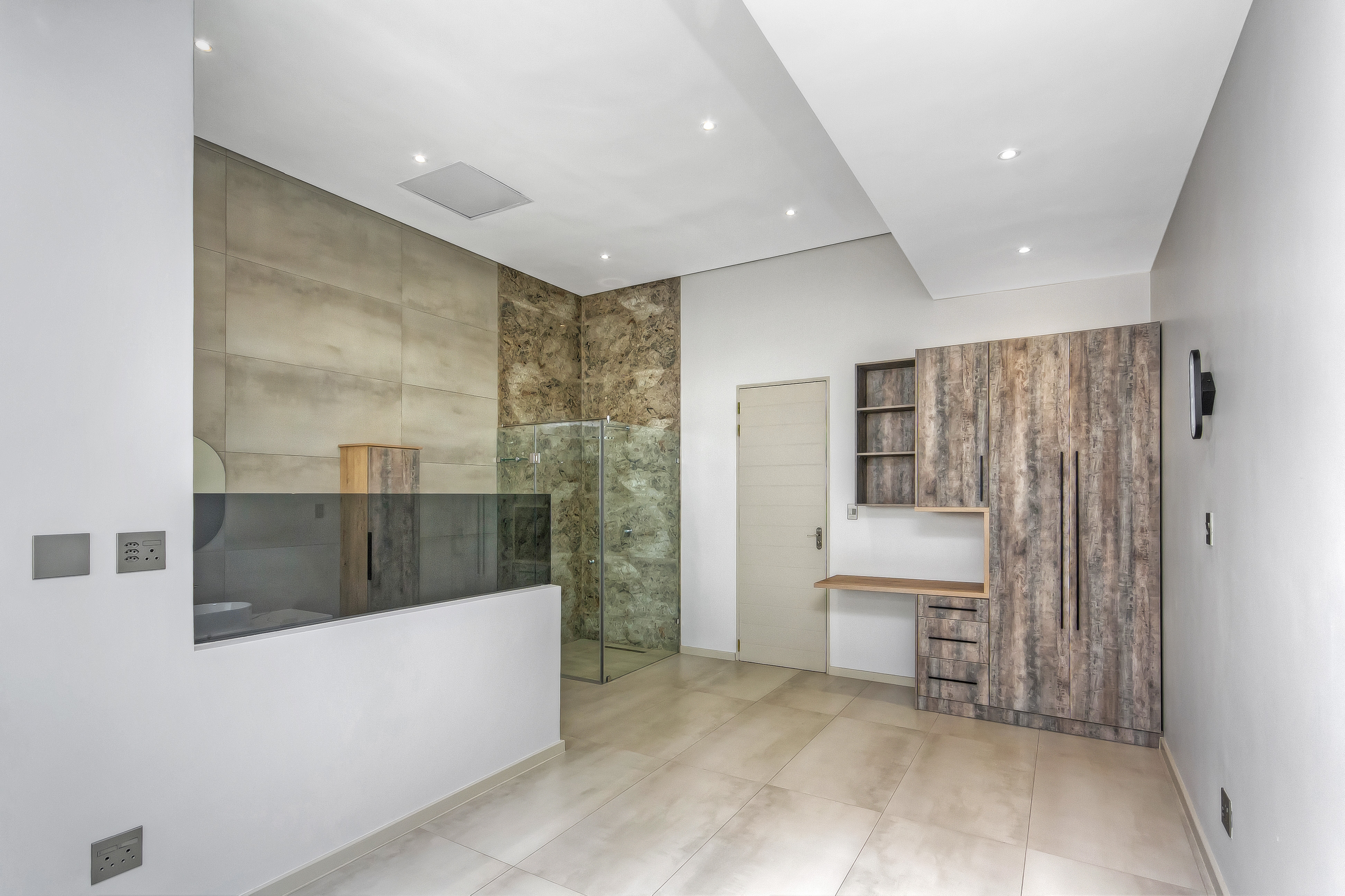 The lower level also hosts a home gym room with its own loo and vanity, as well as a private guest suite discreetly positioned to one side of the home. This suite offers a spacious bedroom with built-in cupboards, a full en-suite bathroom, and its own lounge and kitchenette—perfect for extended family or visitors.