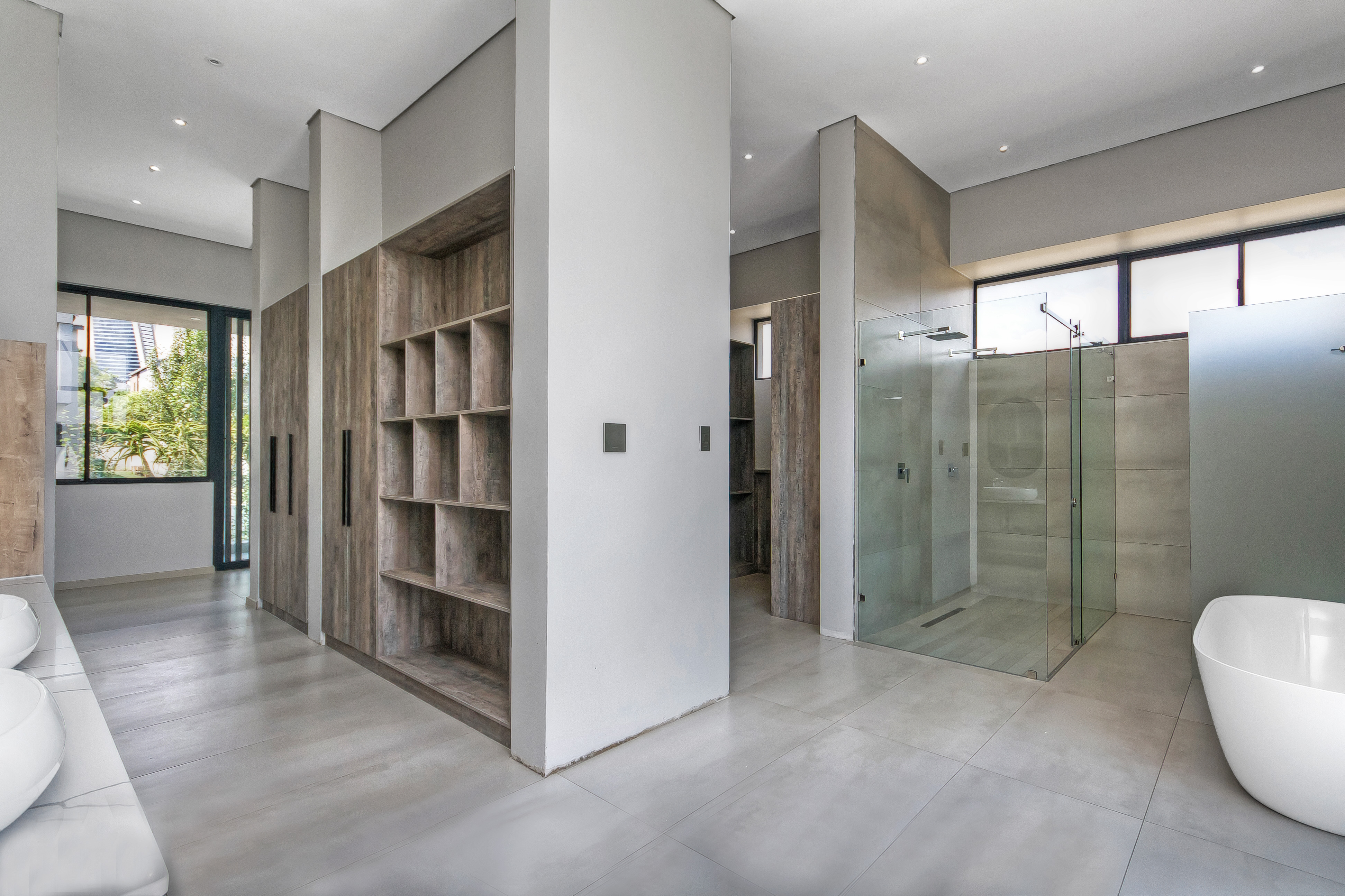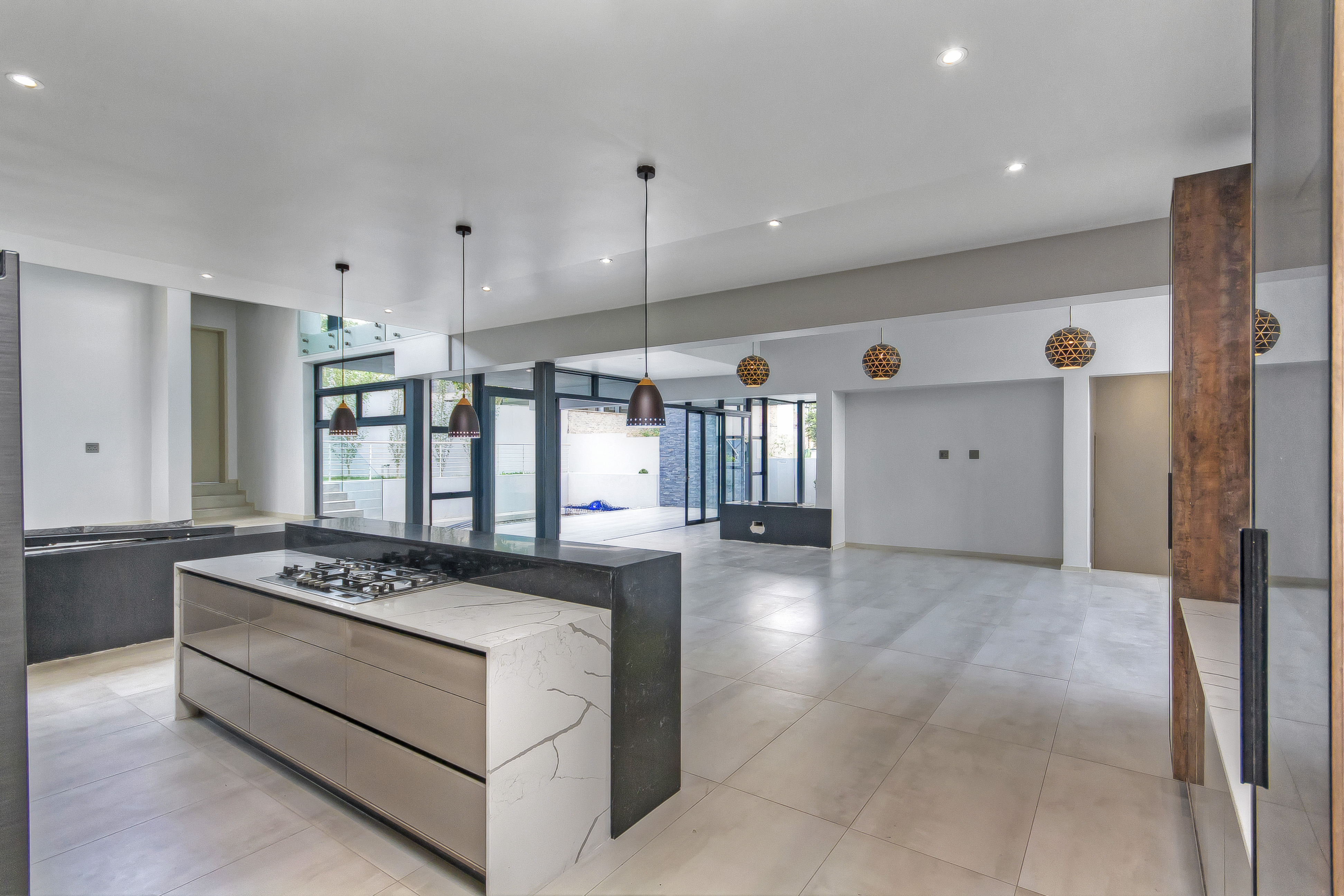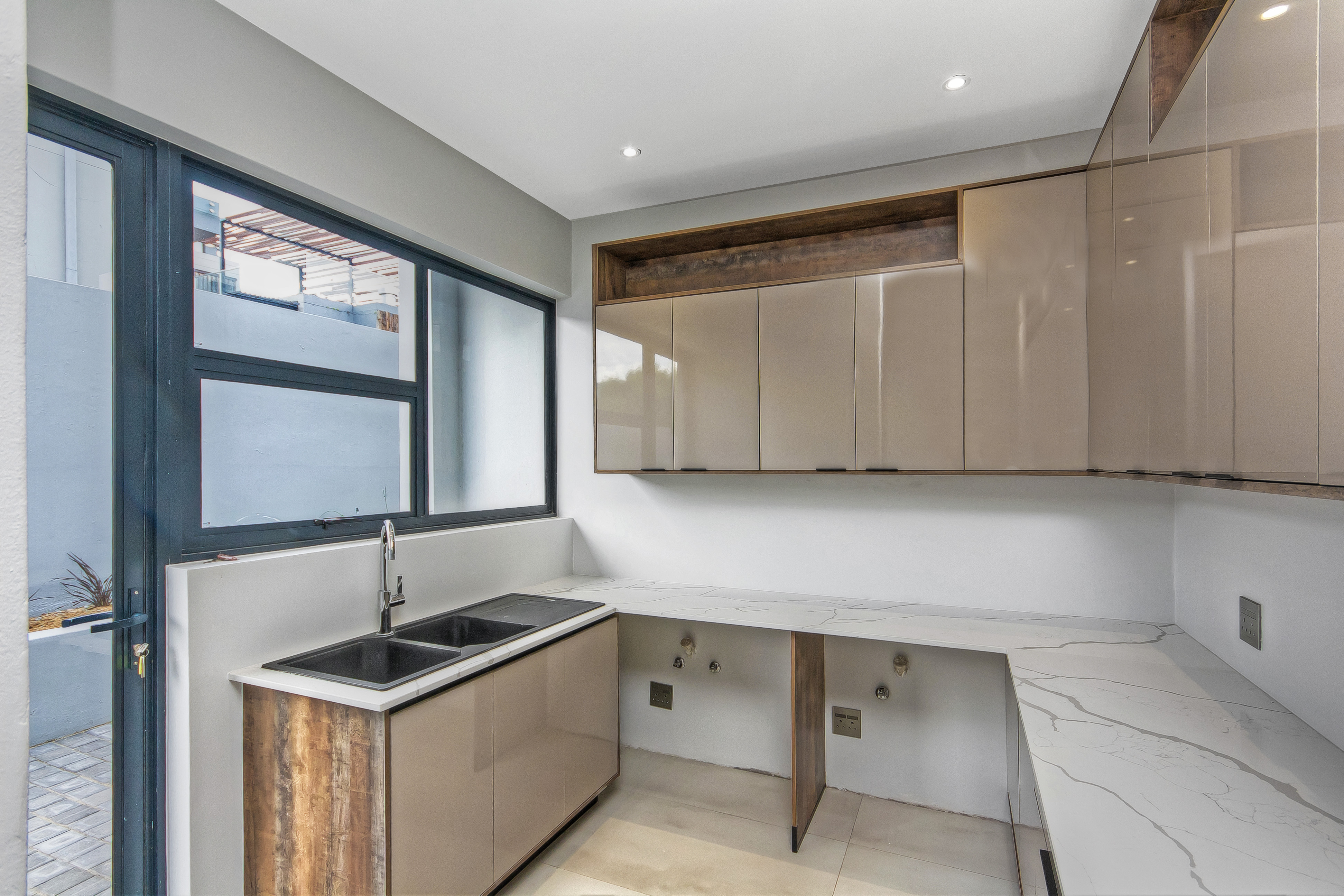 The kitchen is truly divine—centrally positioned so the host is always part of the conversation. It showcases a refined blend of crafted wood niches, soft beige cabinetry with smoked glass doors, and top-tier integrated Bosch appliances. A generous Caesarstone island offers ample prep space, complemented by a 5-burner gas hob and additional breakfast-bar seating. Just off the kitchen, the scullery features an open pantry, extra cabinetry, a double wash-up basin, and space for laundry appliances.