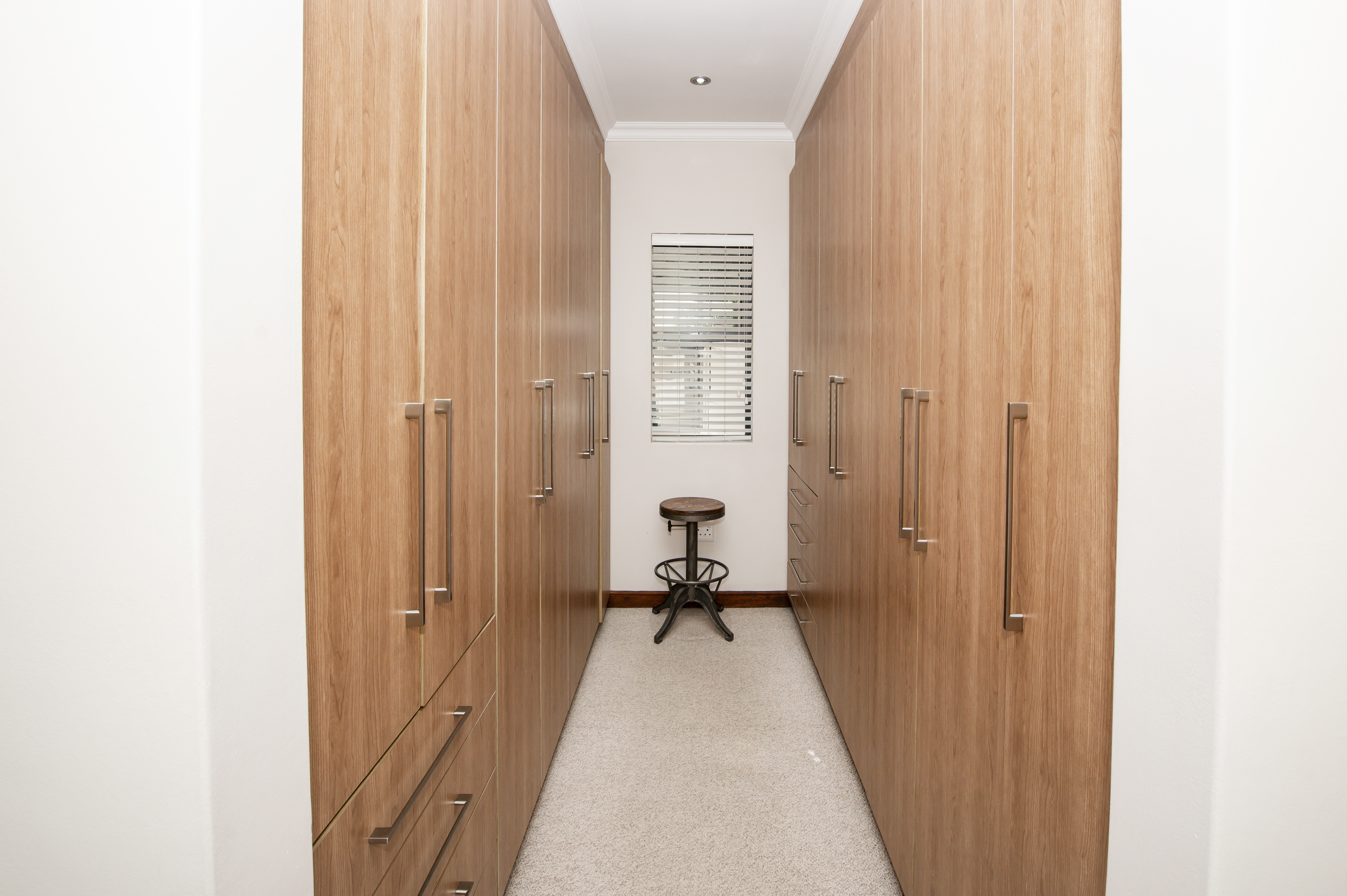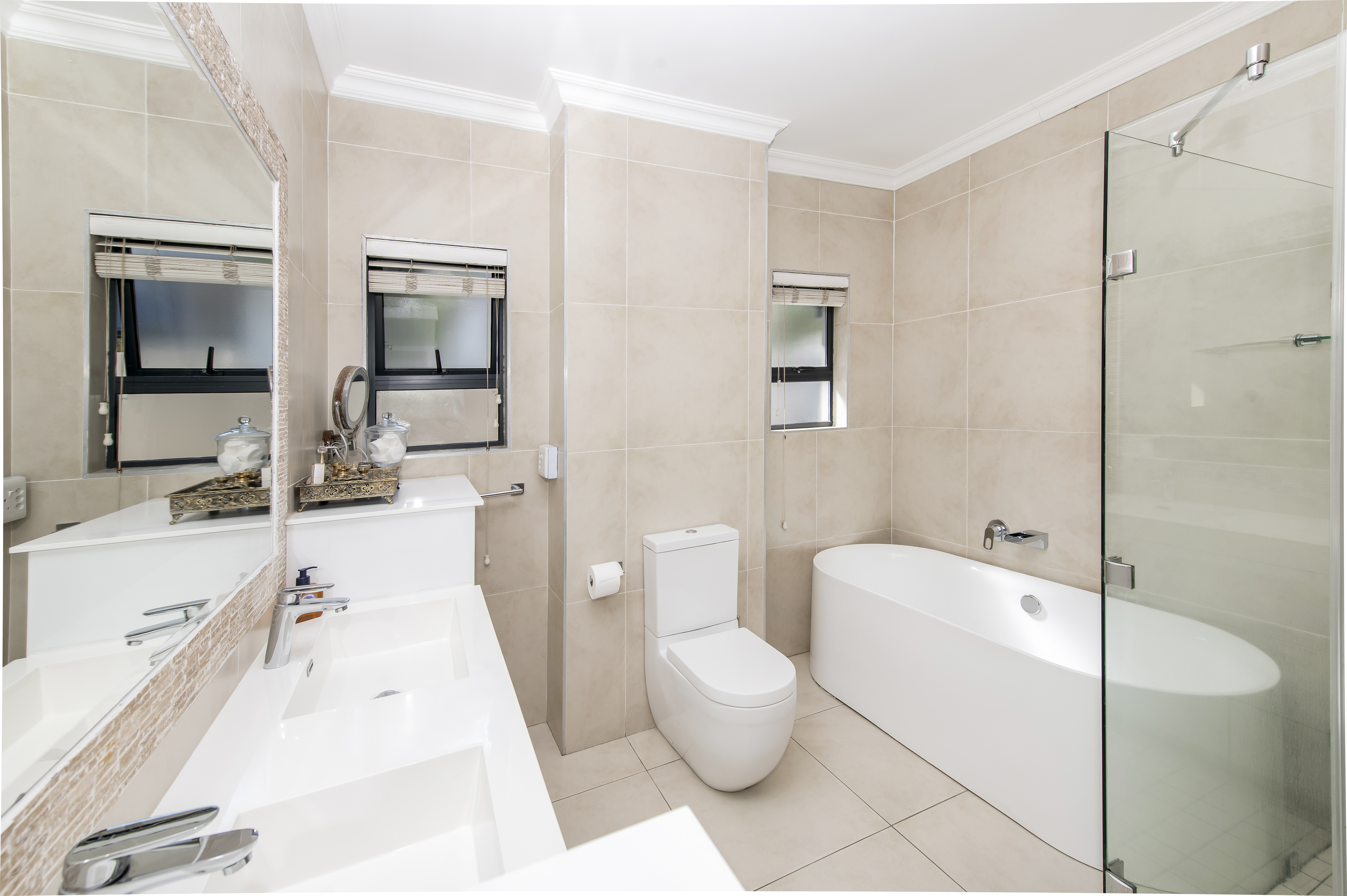 Just down the passage and up three steps lies the master suite—a serene retreat featuring plush carpeting, air conditioning, a ceiling fan, and a glass slider opening onto a private patio. The suite includes a luxurious ensuite bathroom with a freestanding soaking tub, a large shower, and sleek white vanity cupboards with soft-close fittings. A well-lit his-and-hers walk-in wardrobe completes this tranquil space.