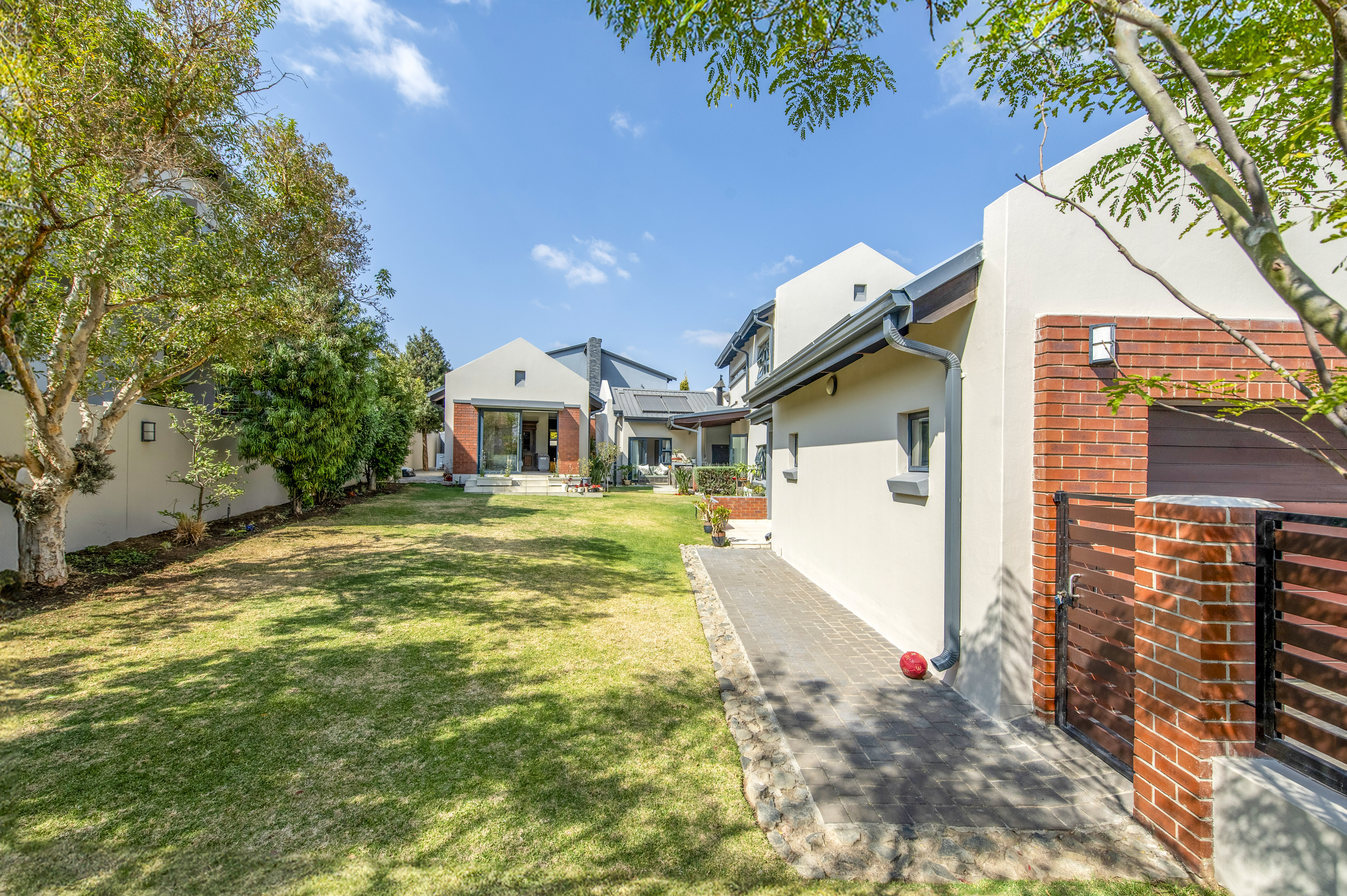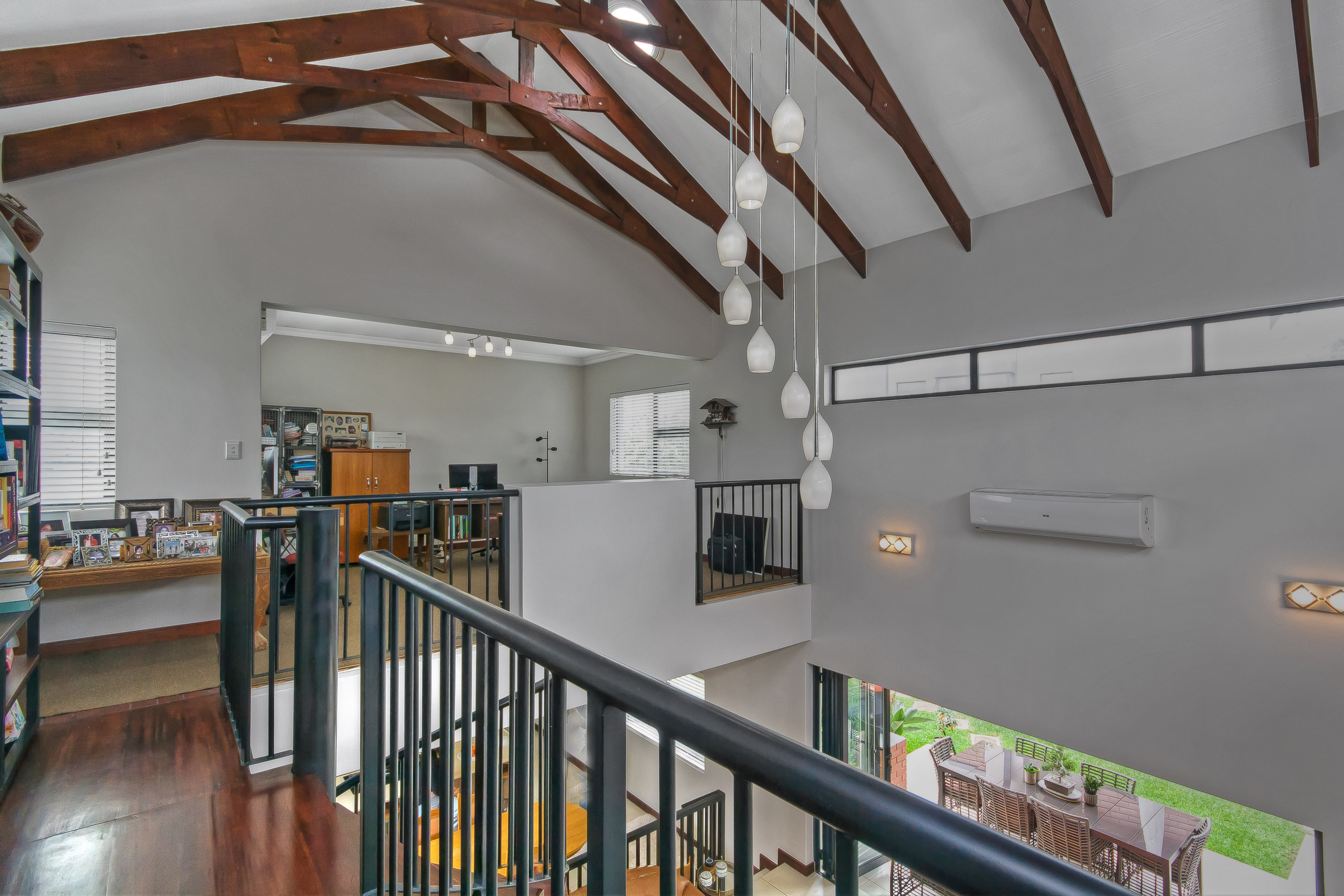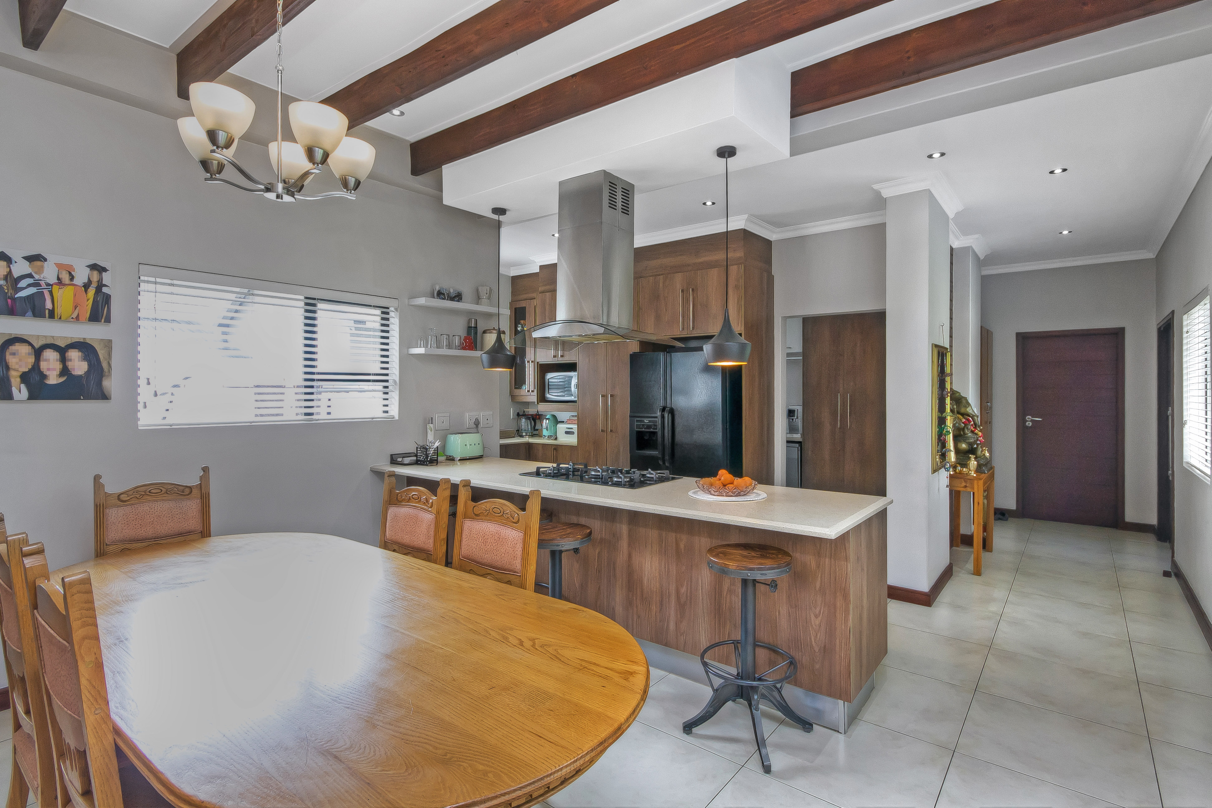 This home is brimming with efficiency and modern conveniences. Highlights include a Double automated garage with direct entrance to the home as well as additional paved parking, a 5kV inverter system with 12 solar panels, 5 strategically placed jet air conditioners, Fenster double-glazed windows fitted with shutter blinds, a gas geyser with pressure pump, and a backup water system. A grey water system keeps the garden lush and green year-round. There is also a staff ablution facility set alon the side of the house.