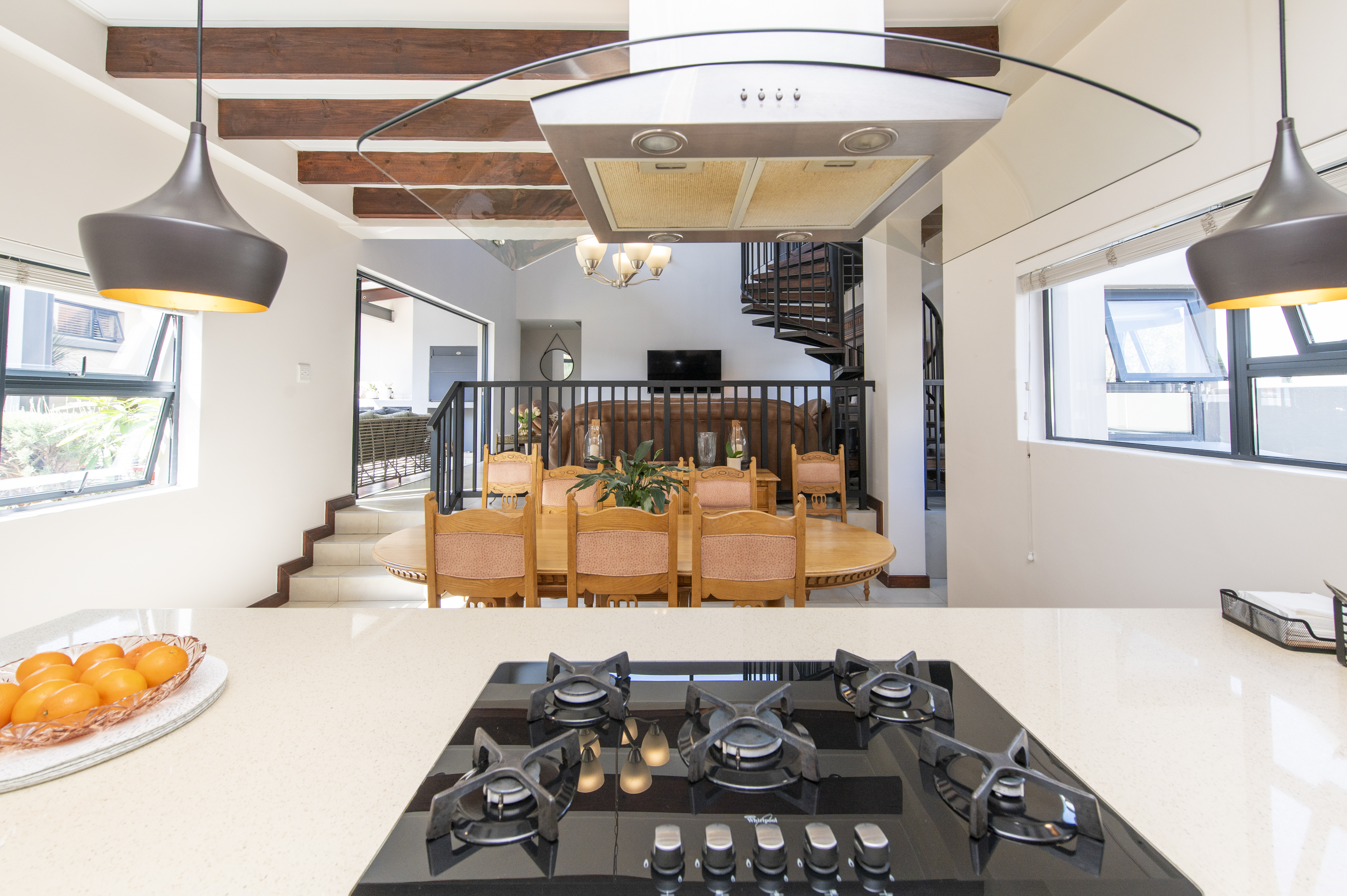 A short entrance passage leads to double-volume, open-plan entertainment areas, featuring exposed wood beams that enhance the spacious, inviting atmosphere. The all-tiled living space includes a beautifully appointed kitchen with a central stone-top island, perfect for casual meals with seating for four. Furthermore he kitchen boasts a gas stove top, hob, ample wood-accented drawers, and built-in cabinetry, with space for a double-door fridge, microwave, and other essentials. Adjacent is a practical scullery with built-in cupboards, a wash-up bay, and additional prep space, keeping your kitchen clutter-free.