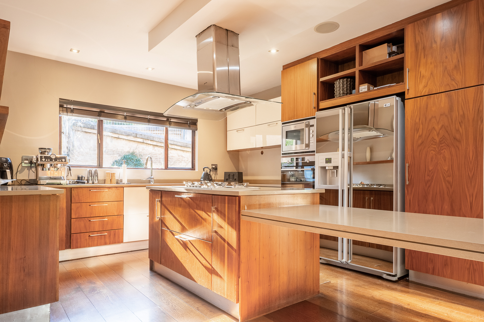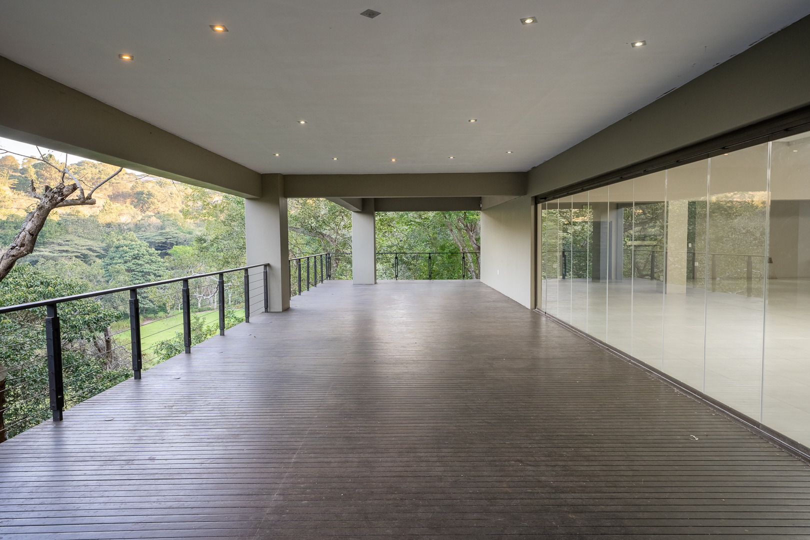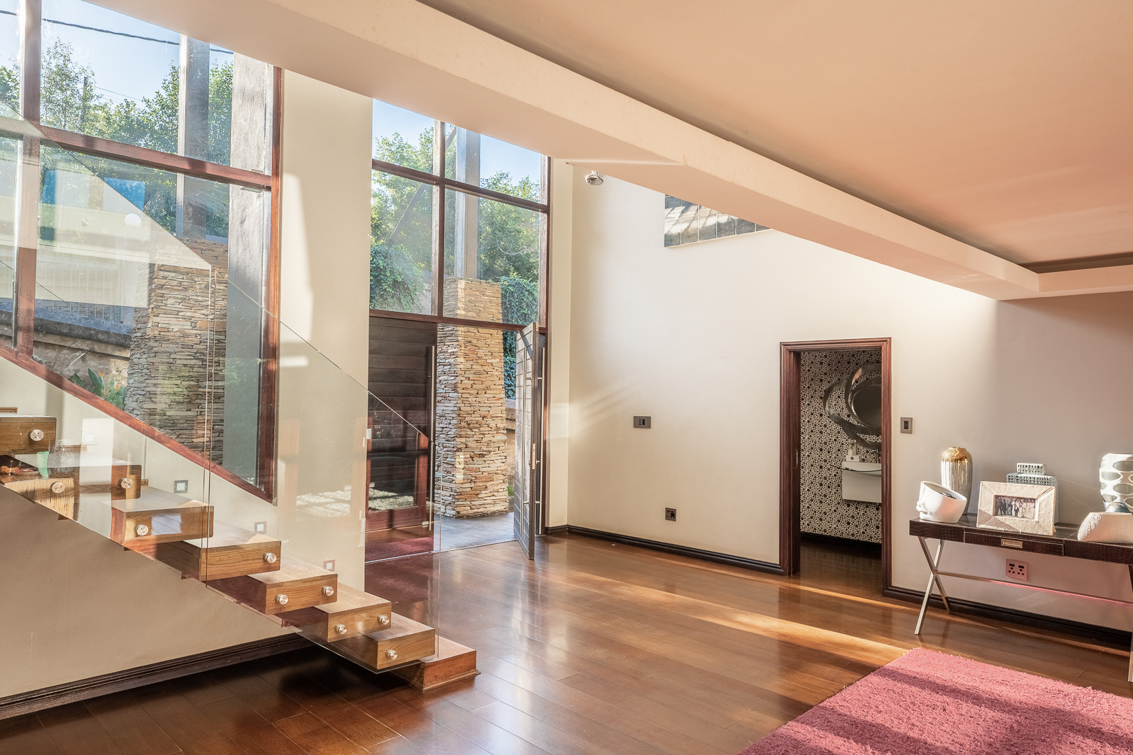 The entrance of the main house is aligned with a large koi pond and as you enter through the large wooden doors you are greeted with a warm and modern open plan living space. A smart house incorporating an FF Home automation system which overlooks the entire property. The high ceilings, open spaces and large windows allow the natural light to filter in and light up all aspects and modern fixtures of the home. The kitchen has been designed with elegance and full functionality in mind with kiaat cabinets, quartz counter tops and a center island together with a separate pantry and scullery. The first level also showcases the family lounge, spacious guest suite, formal lounge and dinning room featuring a gorgeous fireplace which leads through stacking doors onto a lovely undercover patio with braai and entertainment area overlooking the sparkling pool and serene gardens. The modern glass and wooden staircase leads to an informal TV lounge, study and four impressive bedrooms all en suite with beautiful views of the gardens. The large master bedroom is truly a couples dream with a walk in wardrobe, modern fireplace and bathroom designed for two. The top level also opens onto a balcony where you can enjoy the amazing views of the property. There is a secret staircase which leads to the lower level of the main house where you will find a huge training facility that could be used for many purposes, a private boardroom and bar, all opening onto a covered patio overlooking the sparkling pool and jacuzzi.