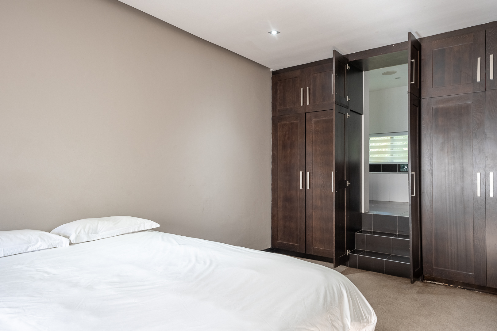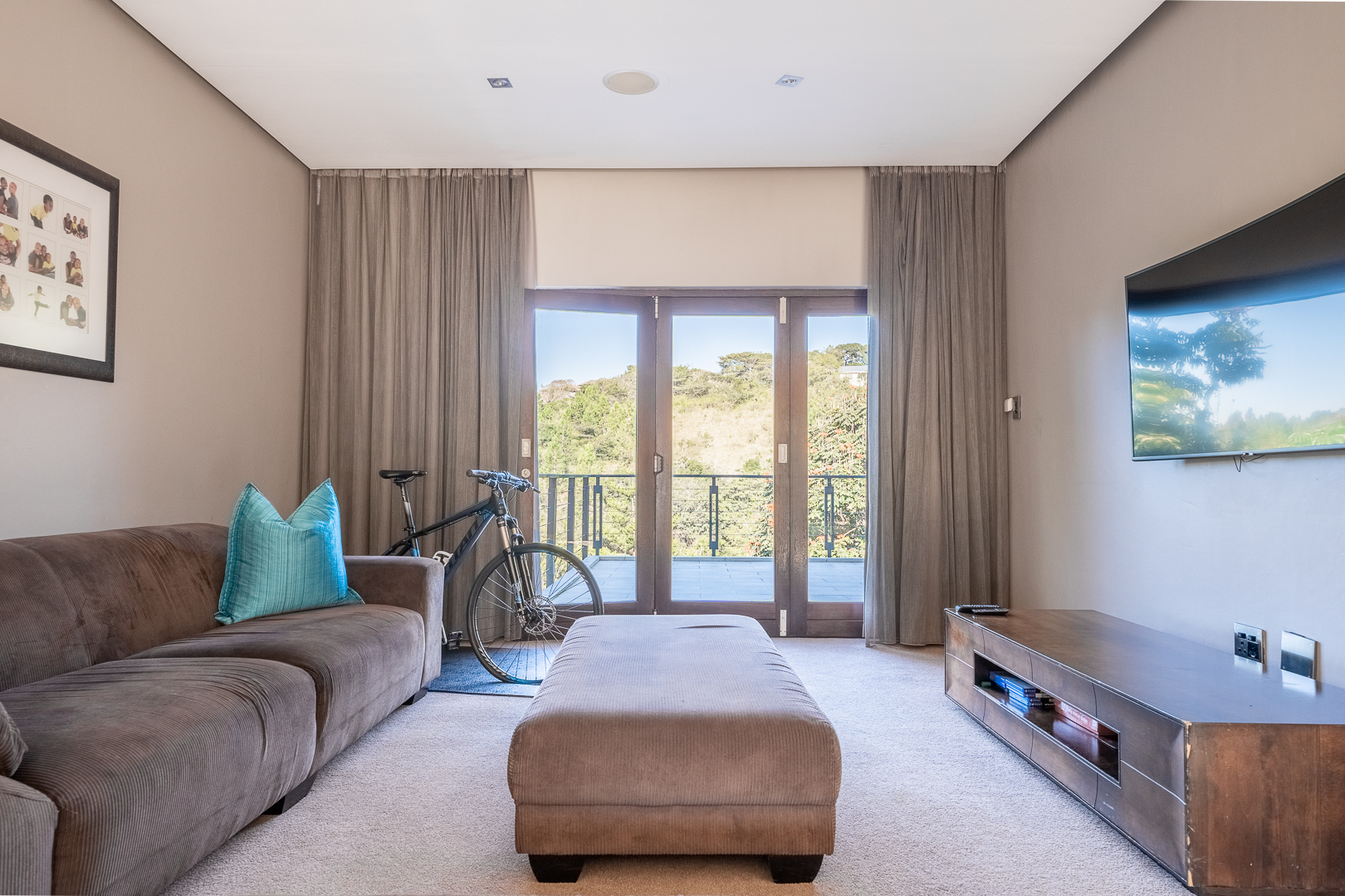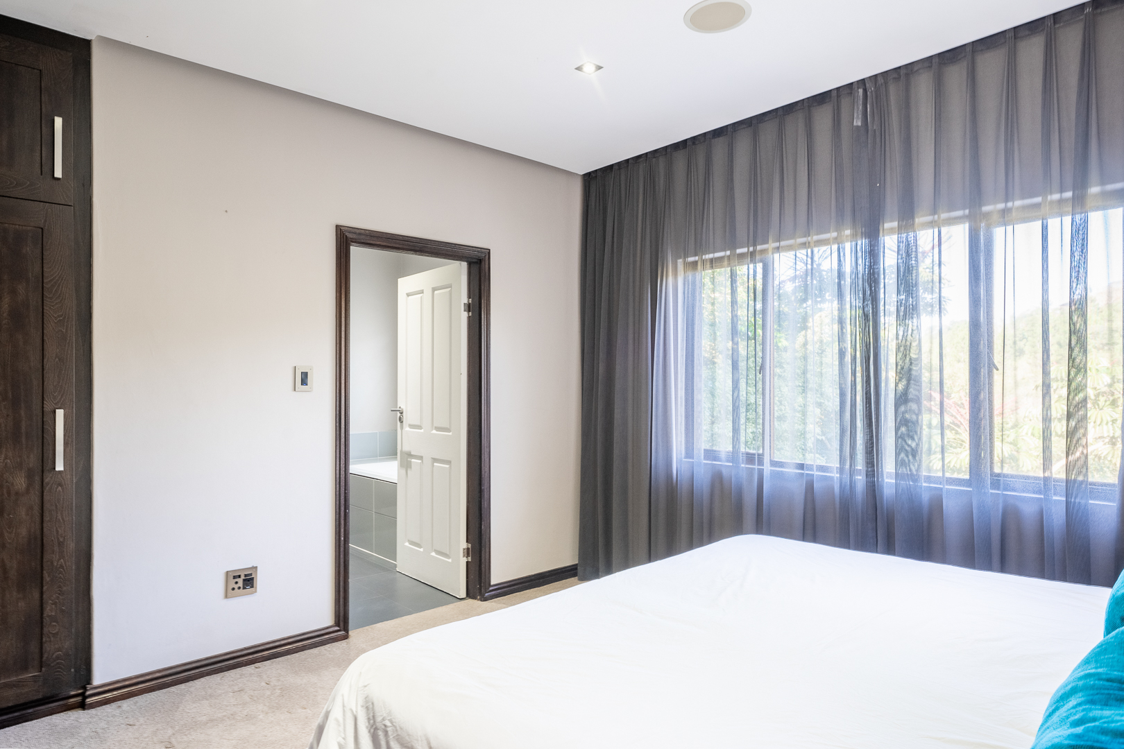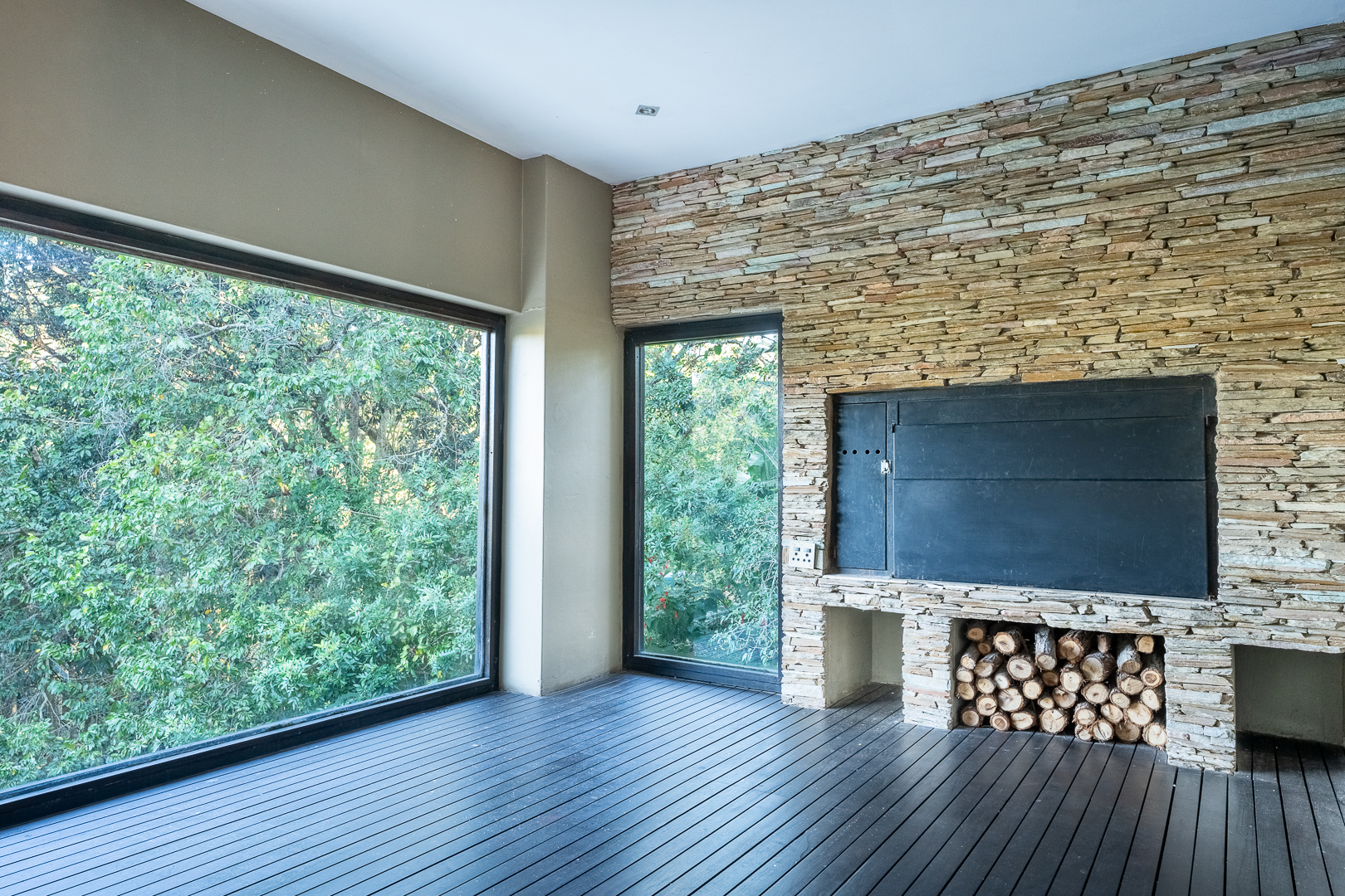 The entrance of the main house is aligned with a large koi pond and as you enter through the large wooden doors you are greeted with a warm and modern open plan living space. A smart house incorporating an FF Home automation system which overlooks the entire property. The high ceilings, open spaces and large windows allow the natural light to filter in and light up all aspects and modern fixtures of the home. The kitchen has been designed with elegance and full functionality in mind with kiaat cabinets, quartz counter tops and a center island together with a separate pantry and scullery. The first level also showcases the family lounge, spacious guest suite, formal lounge and dinning room featuring a gorgeous fireplace which leads through stacking doors onto a lovely undercover patio with braai and entertainment area overlooking the sparkling pool and serene gardens. The modern glass and wooden staircase leads to an informal TV lounge, study and four impressive bedrooms all en suite with beautiful views of the gardens. The large master bedroom is truly a couples dream with a walk in wardrobe, modern fireplace and bathroom designed for two. The top level also opens onto a balcony where you can enjoy the amazing views of the property. There is a secret staircase which leads to the lower level of the main house where you will find a huge training facility that could be used for many purposes, a private boardroom and bar, all opening onto a covered patio overlooking the sparkling pool and jacuzzi.