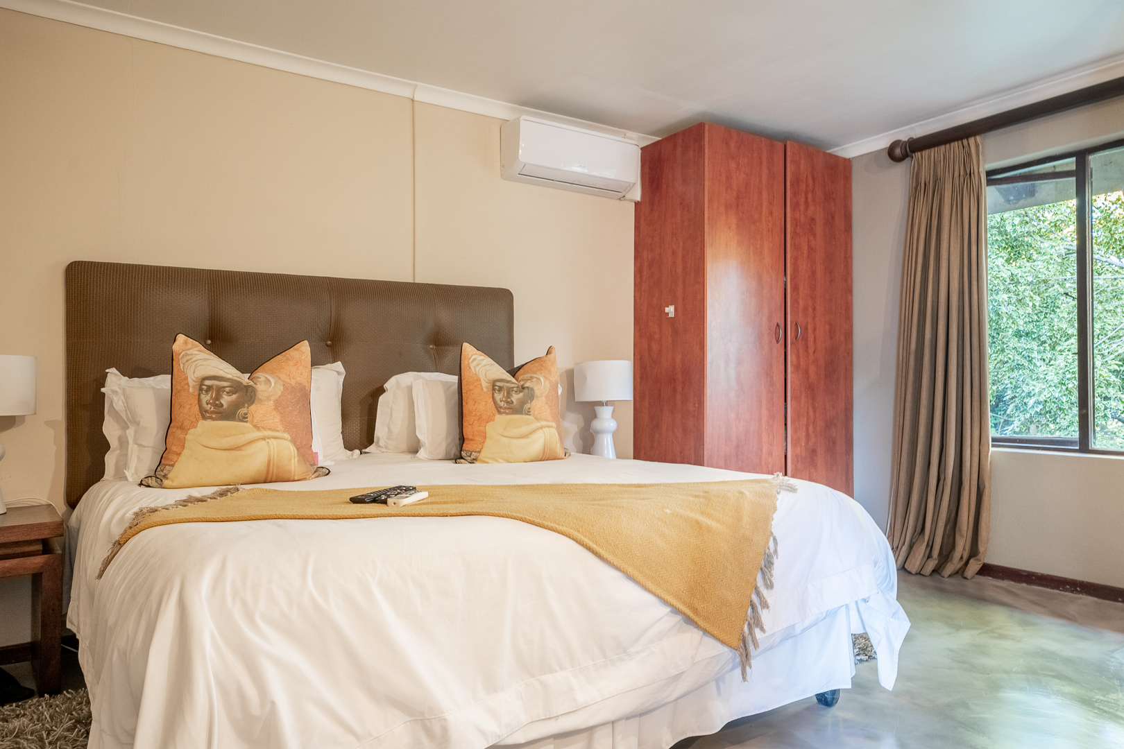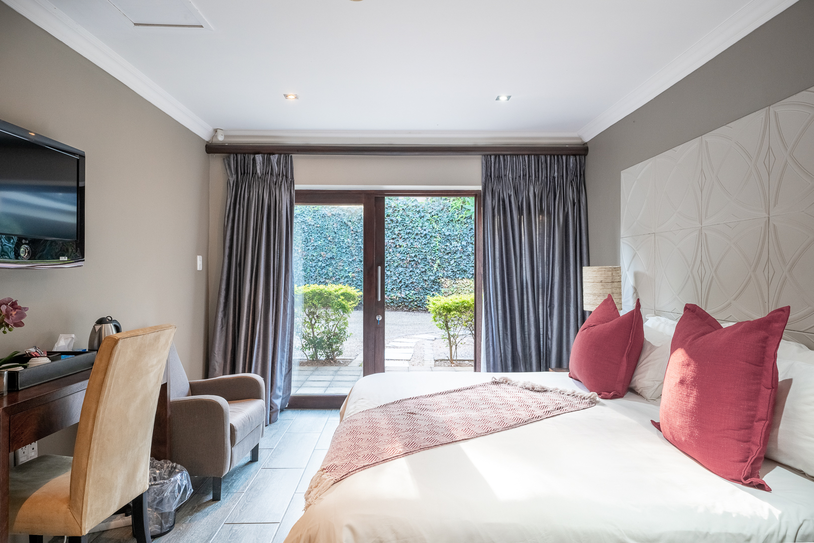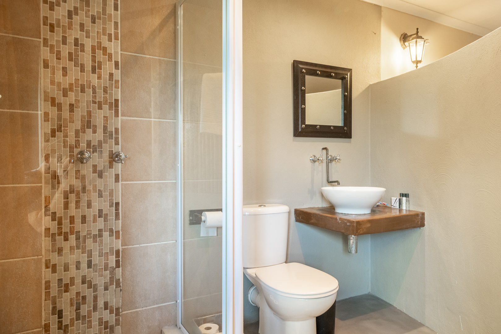 Amidst the immaculate grounds are the 10 beautiful en suite luxurious rooms each individually decorated and fully equipped with modern facilities. The appointed rooms all have satellite TV, air-conditioning and heating, electronic safes and tea/coffee stations. There is also a beautifully designed dining room and common lounge, a well equipped kitchen, guest toilet and lovely patios to enjoy the fresh air. There is a romantic separate honeymoon suite with a king sized bedroom, lounge and bathroom at the bottom of the property offering its guests privacy, quiet and a beautiful view of the wide open spaces of the property. Guests can check in at the separate reception office whilst enjoying the sounds of nature and the view of the impressive water fountain.