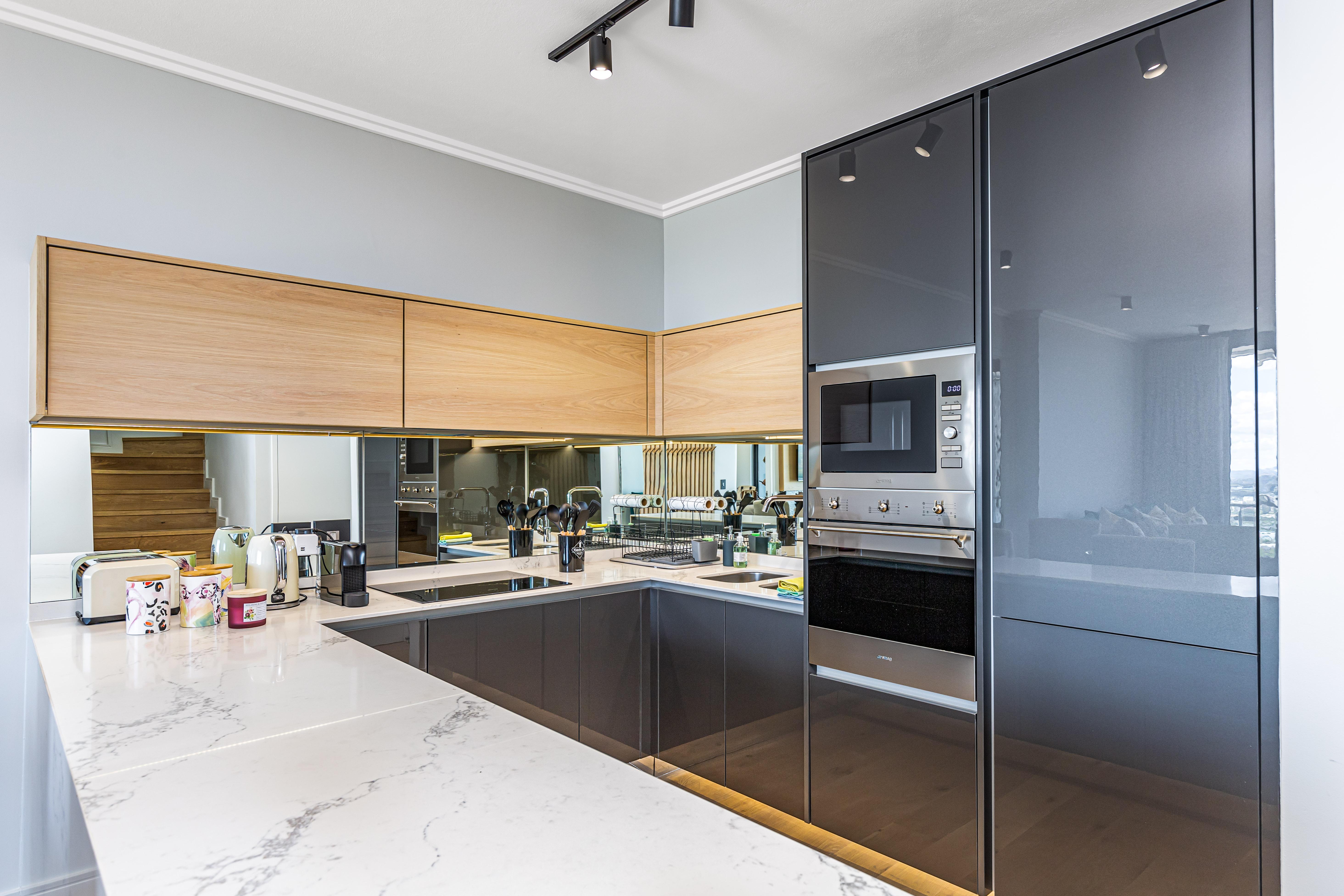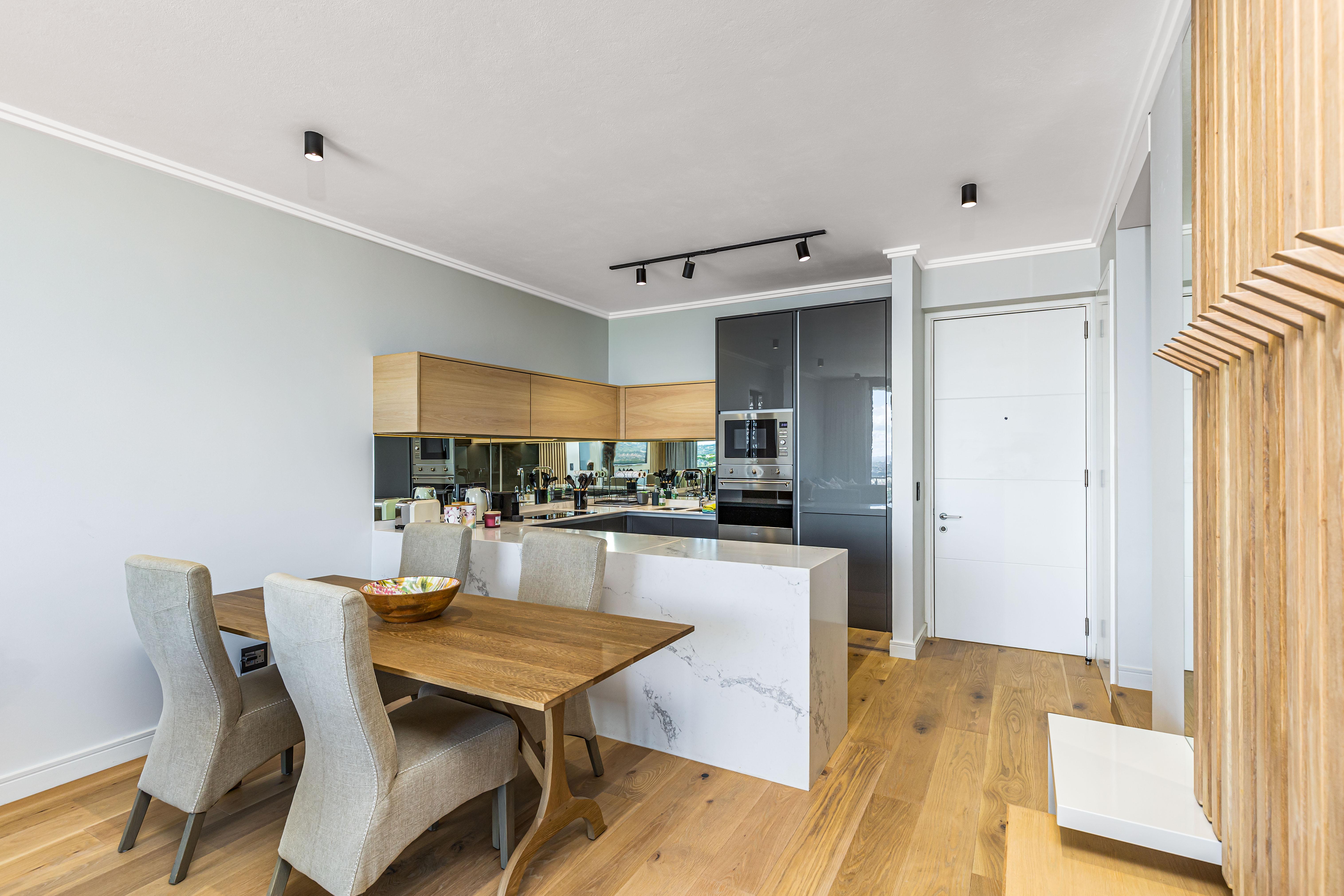 The stylish modern kitchen has marble countertops and is equipped with top-of-the-line Smeg appliances and comes complete with a built-in dishwasher, fridge/freezer, microwave, oven and separate space for your washing machine. Plenty of cupboard space finishes off this immaculate kitchen. Flowing off the kitchen is your open-plan lounge/dining area, which opens out onto a balcony that stretches the length of the apartment and offers a view second to none.