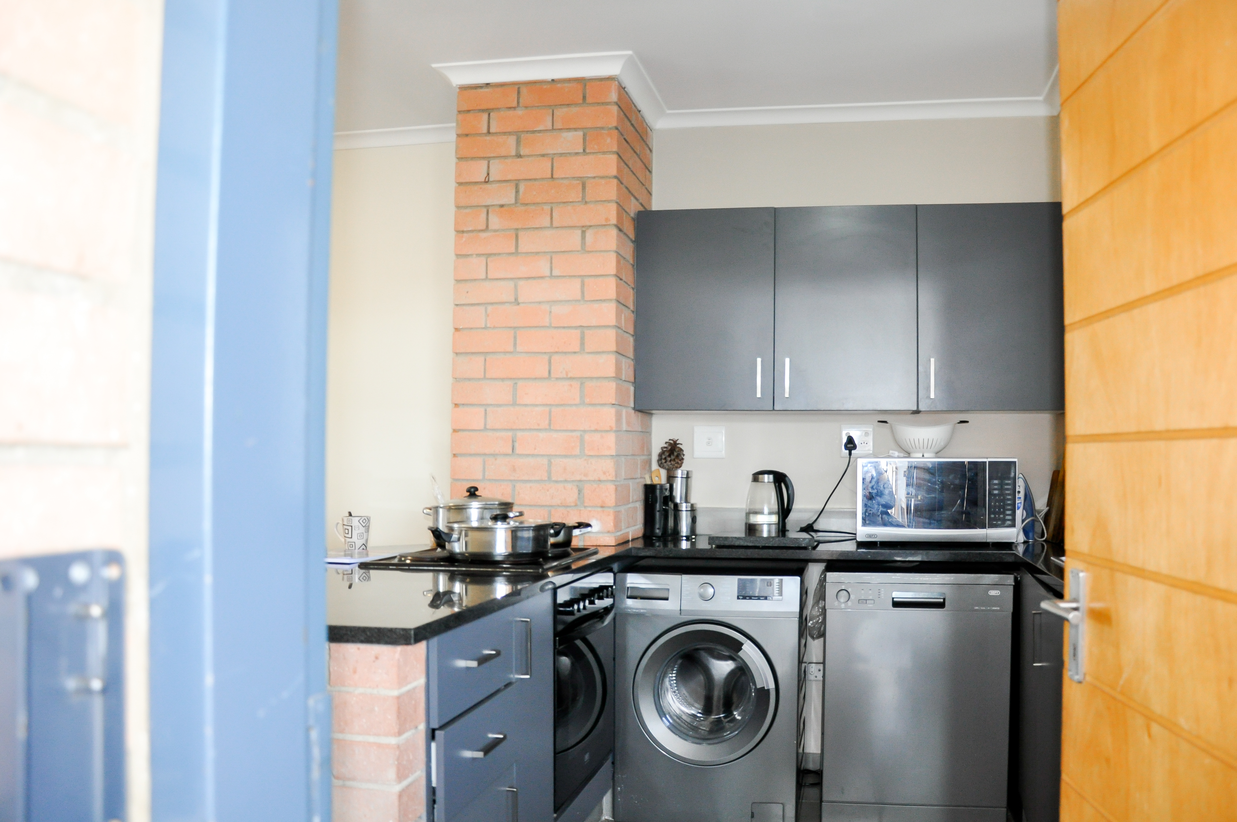 This unit boasts a large open-plan living area with a modern open-plan kitchen. The kitchen comes with a DEFY fridge, washing machine, dishwasher, and microwave.