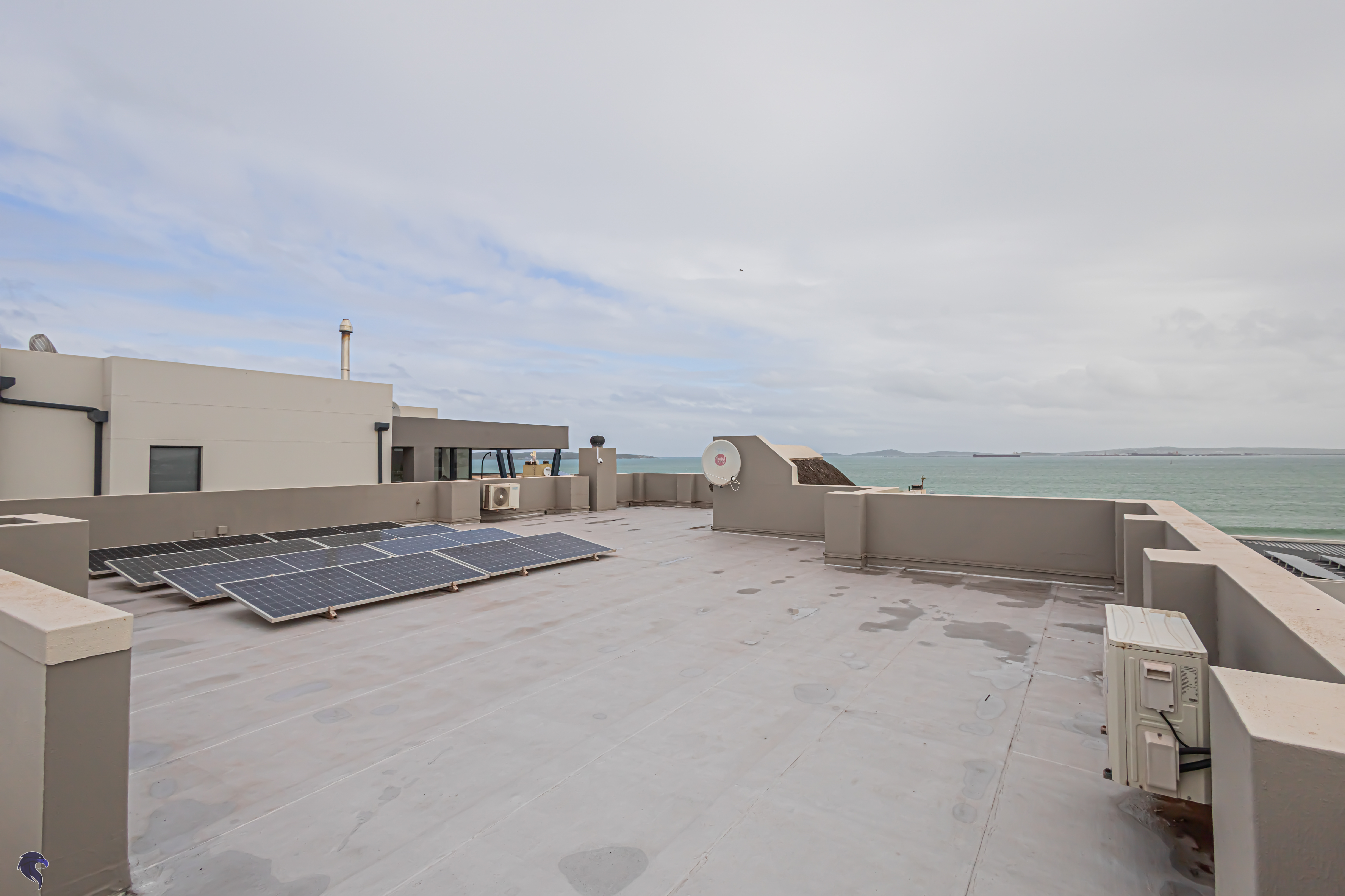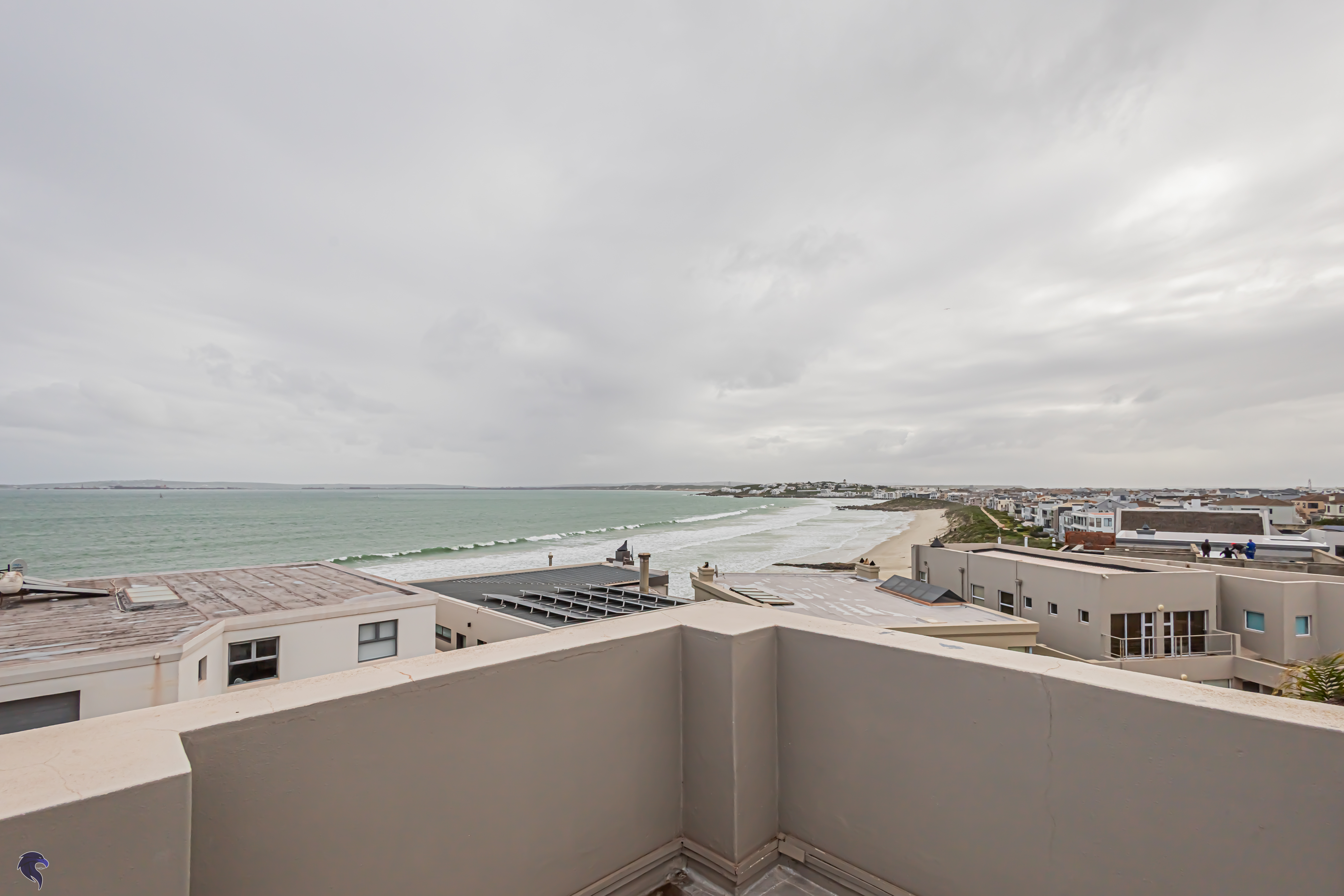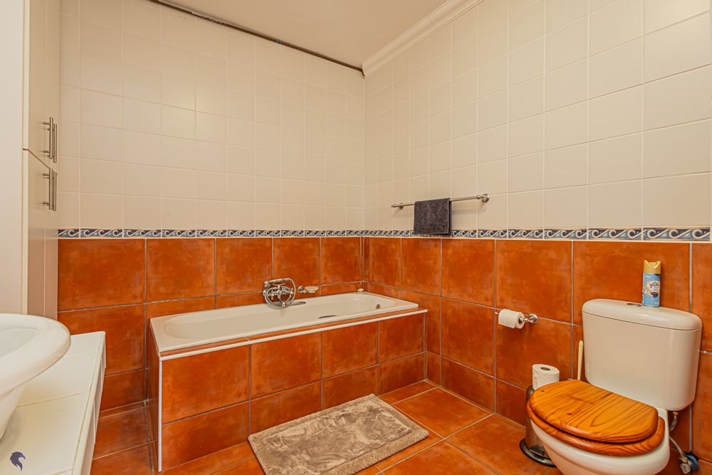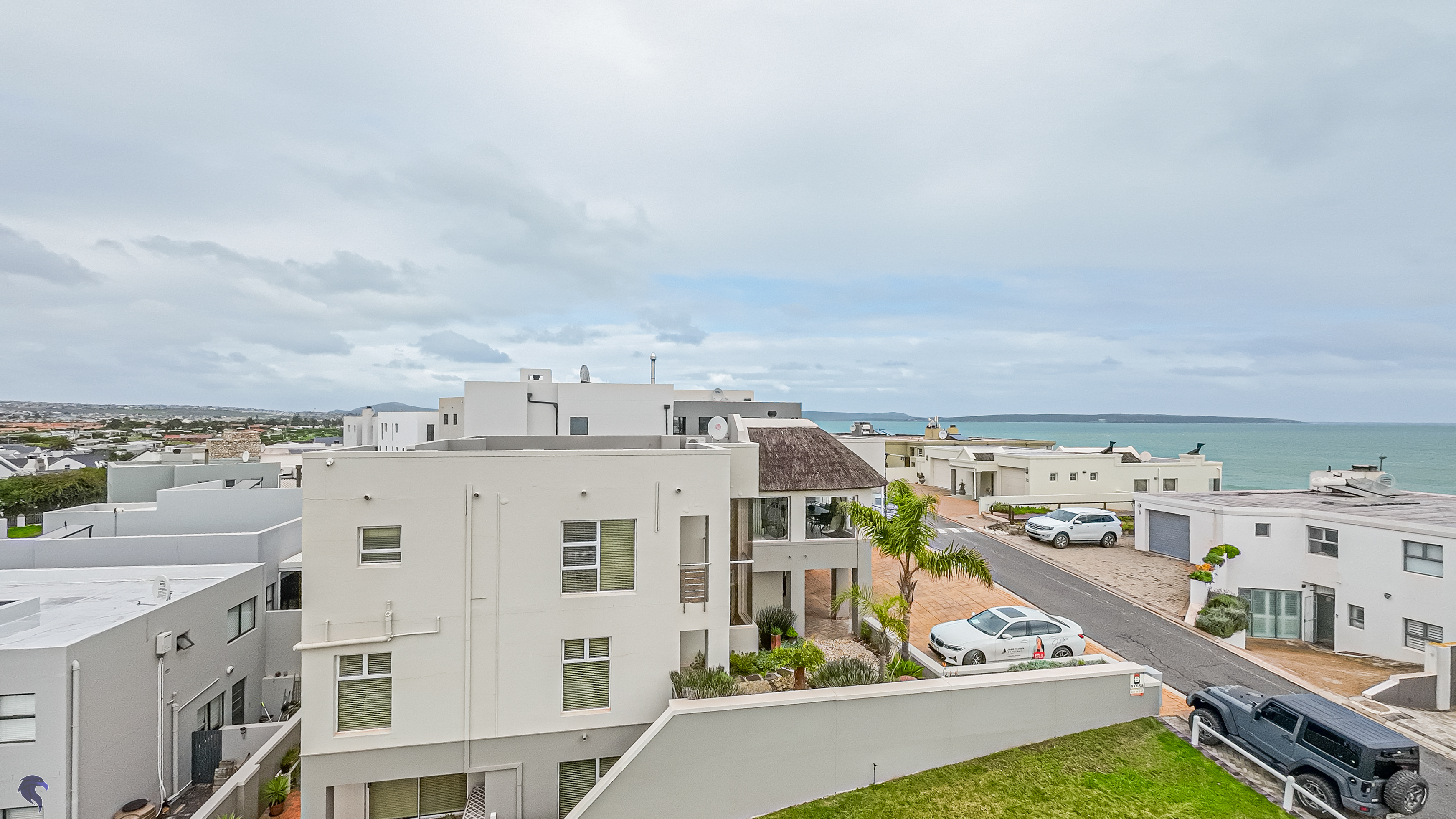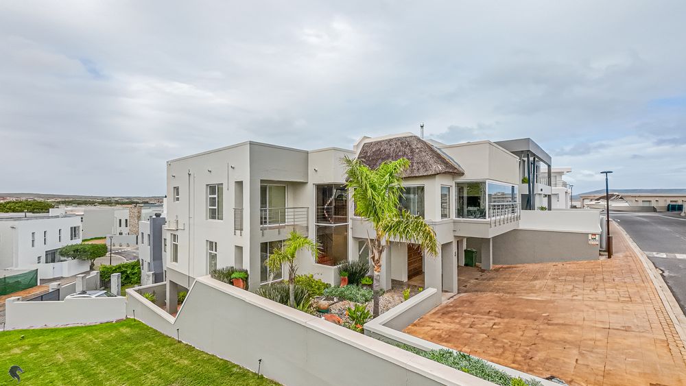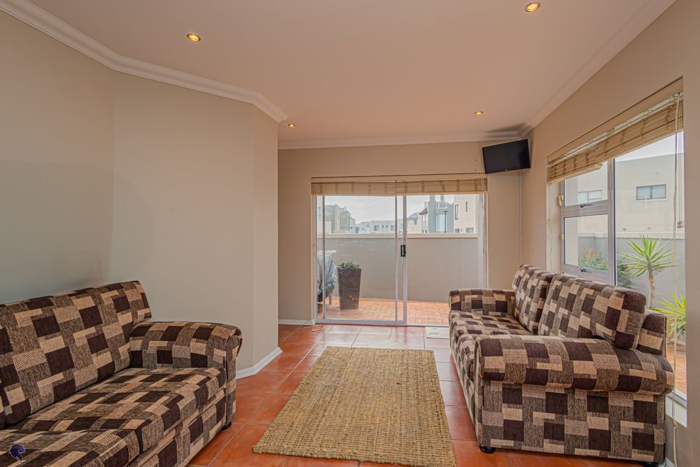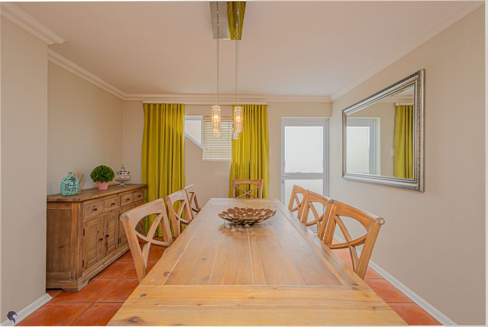Designed for comfortable family living, the main residence spans two levels. The middle level features two spacious bedrooms, a full family bathroom, and a private study – perfect for working from home. Upstairs, the expansive open-plan living area includes a stylish lounge, dining space, and a fully fitted kitchen with separate scullery. The enclosed braai stoep is a true highlight, offering showstopping views across the bay. The master suite on this level boasts a walk-in closet and modern en-suite, while external stairs lead up to a rooftop terrace with panoramic sea views.