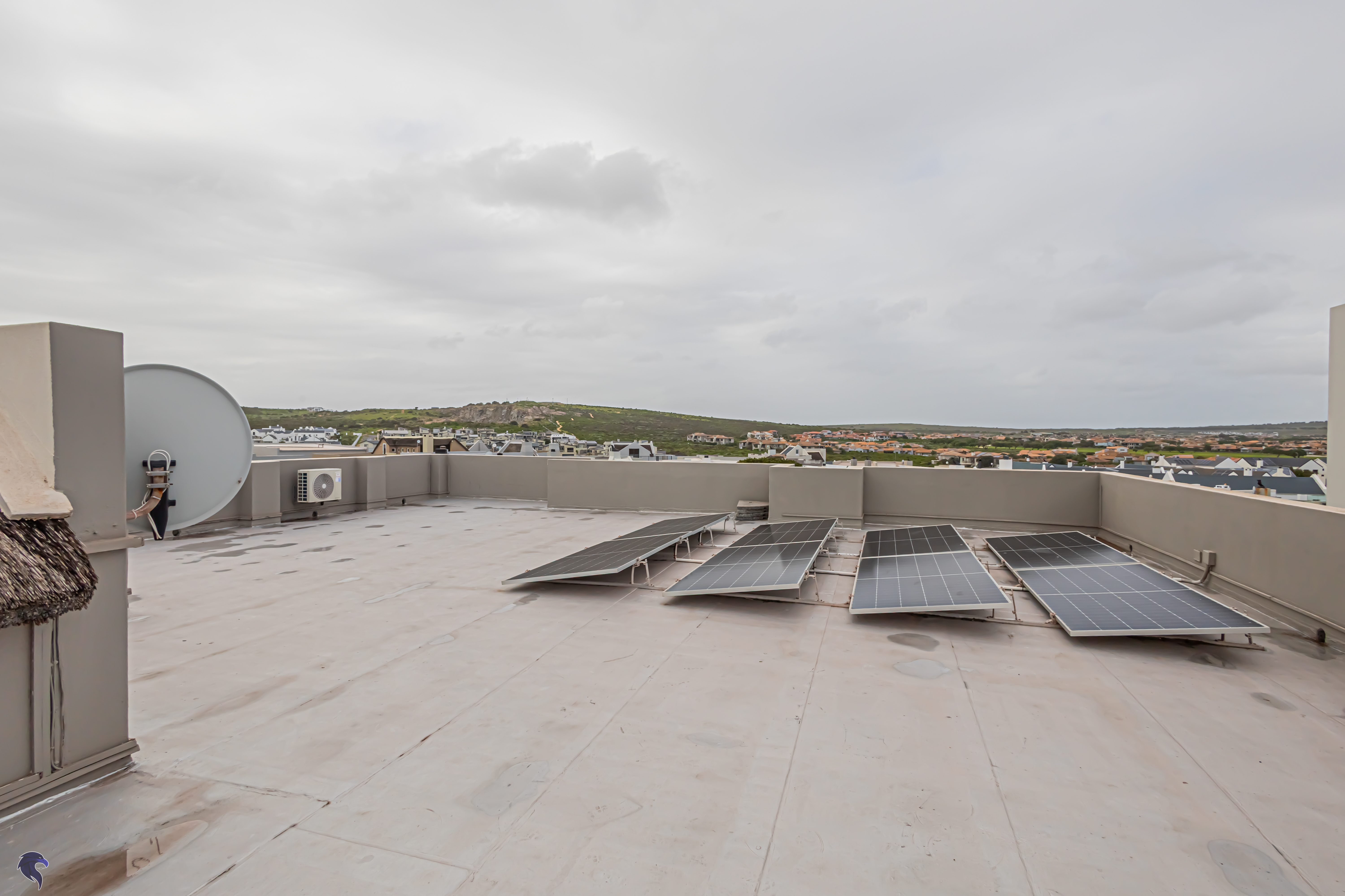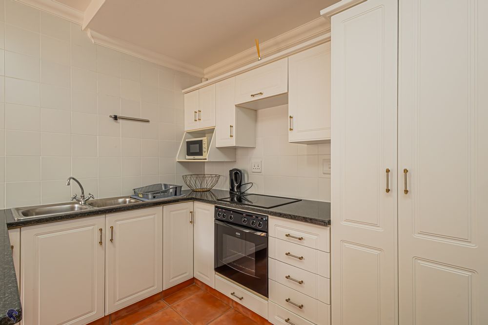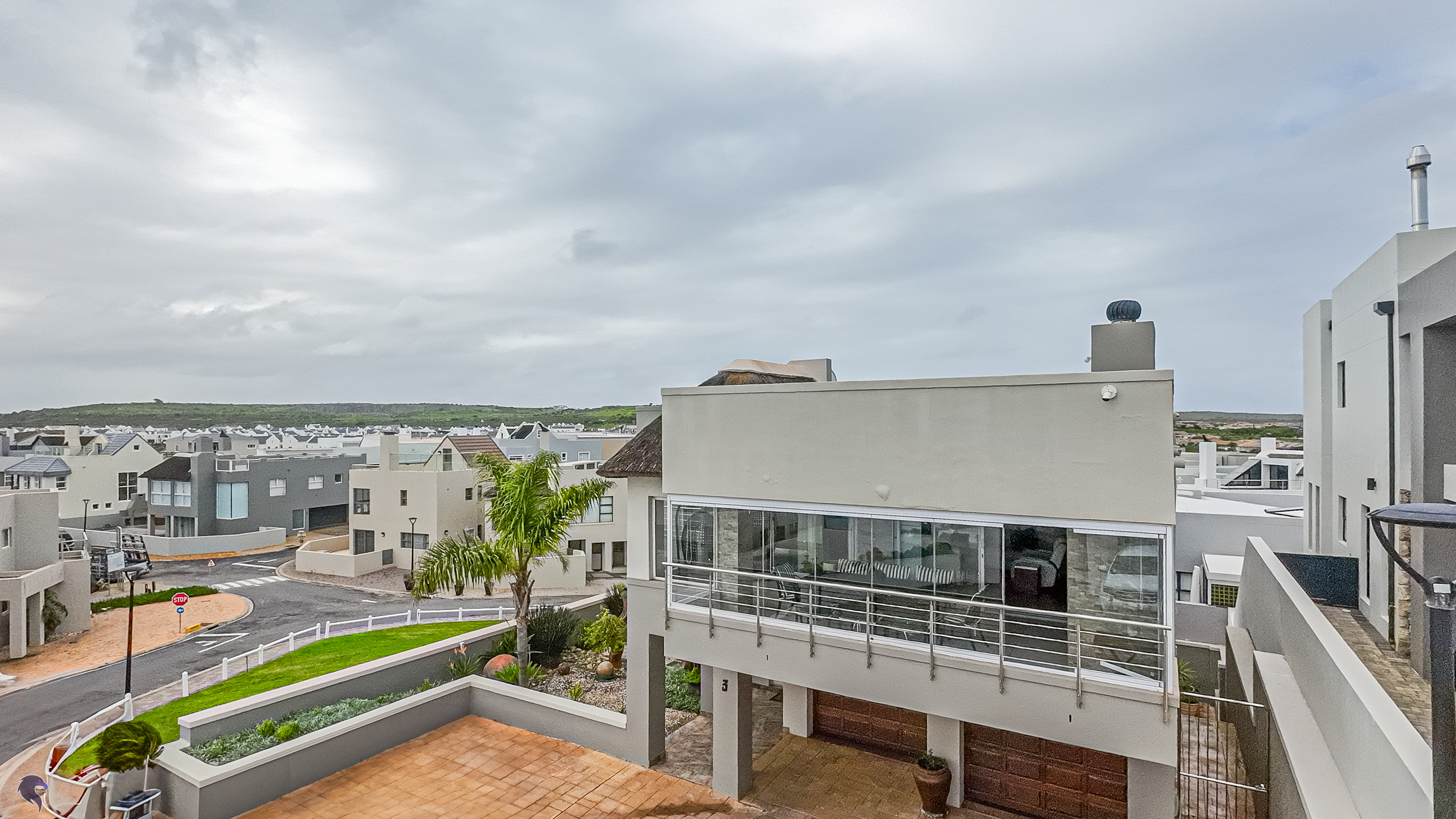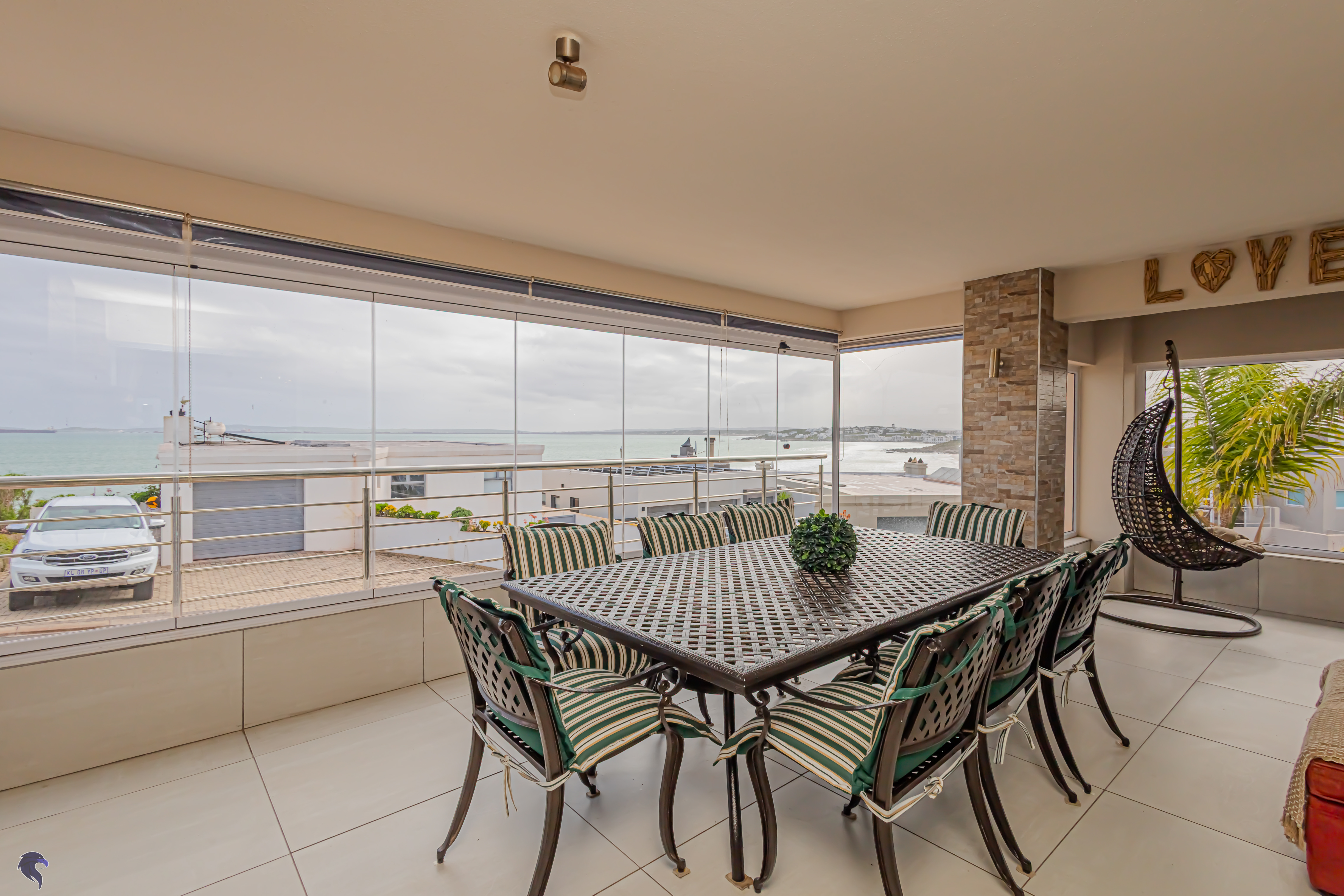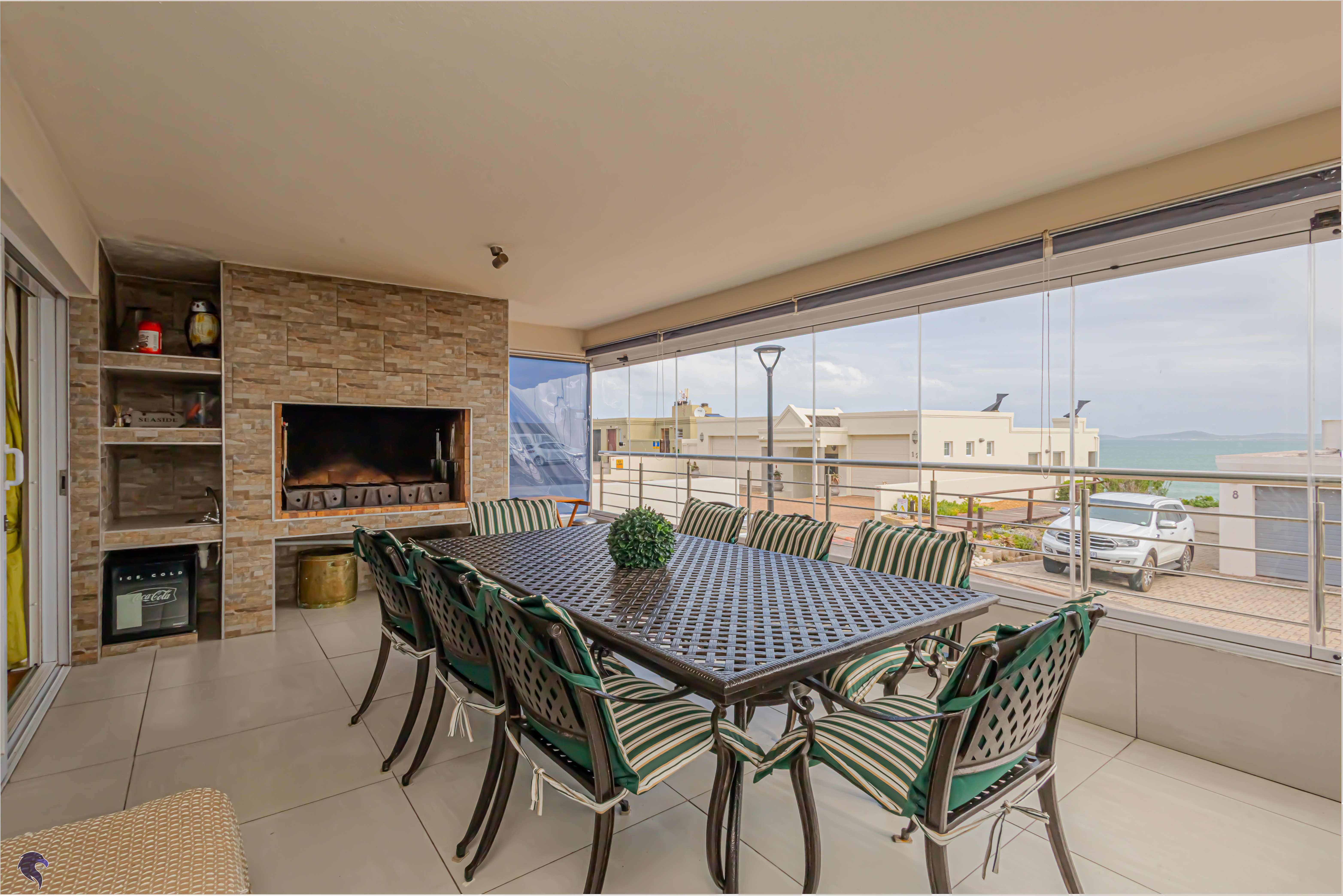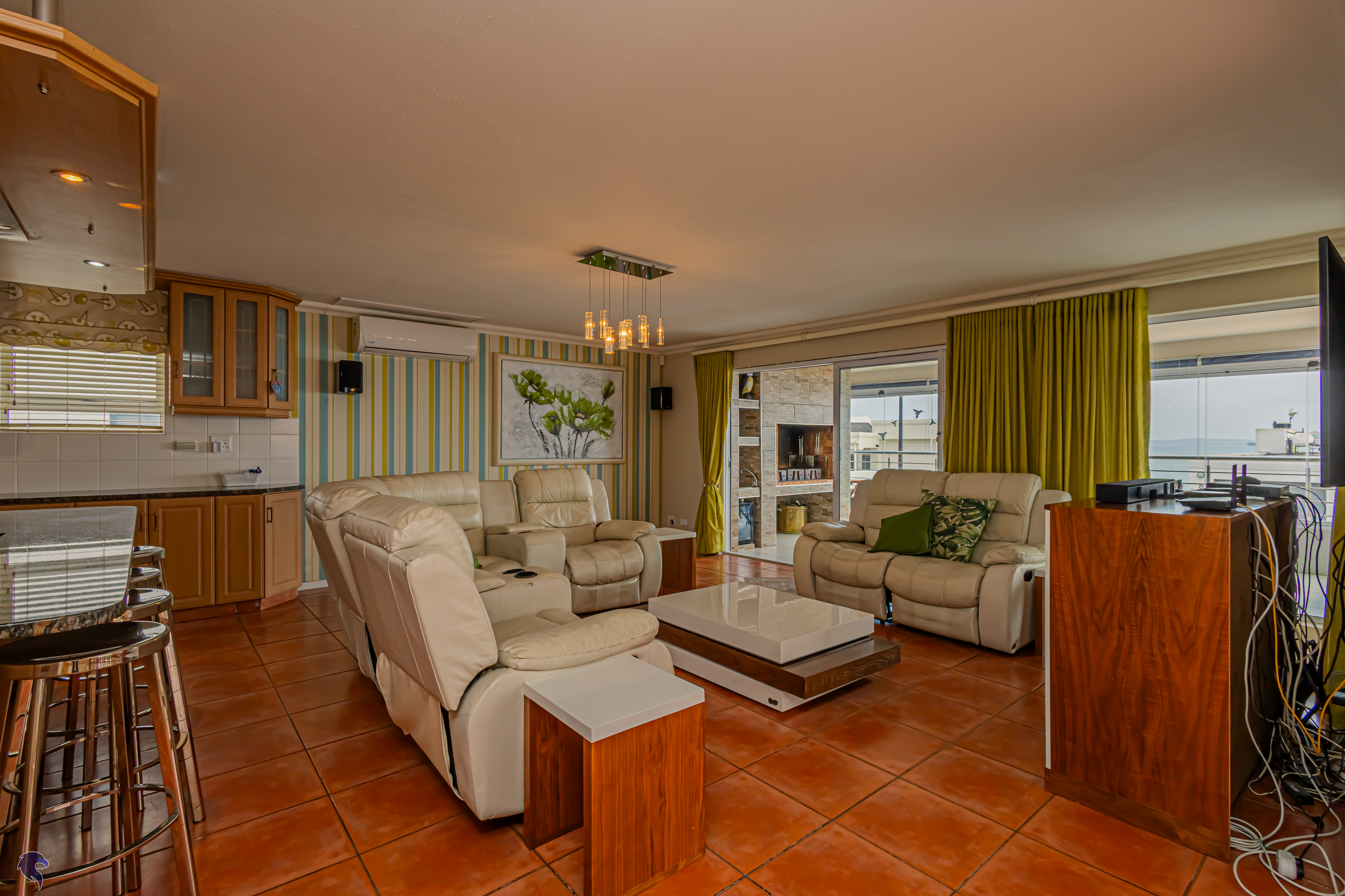 Designed for comfortable family living, the main residence spans two levels. The middle level features two spacious bedrooms, a full family bathroom, and a private study – perfect for working from home. Upstairs, the expansive open-plan living area includes a stylish lounge, dining space, and a fully fitted kitchen with separate scullery. The enclosed braai stoep is a true highlight, offering showstopping views across the bay. The master suite on this level boasts a walk-in closet and modern en-suite, while external stairs lead up to a rooftop terrace with panoramic sea views.