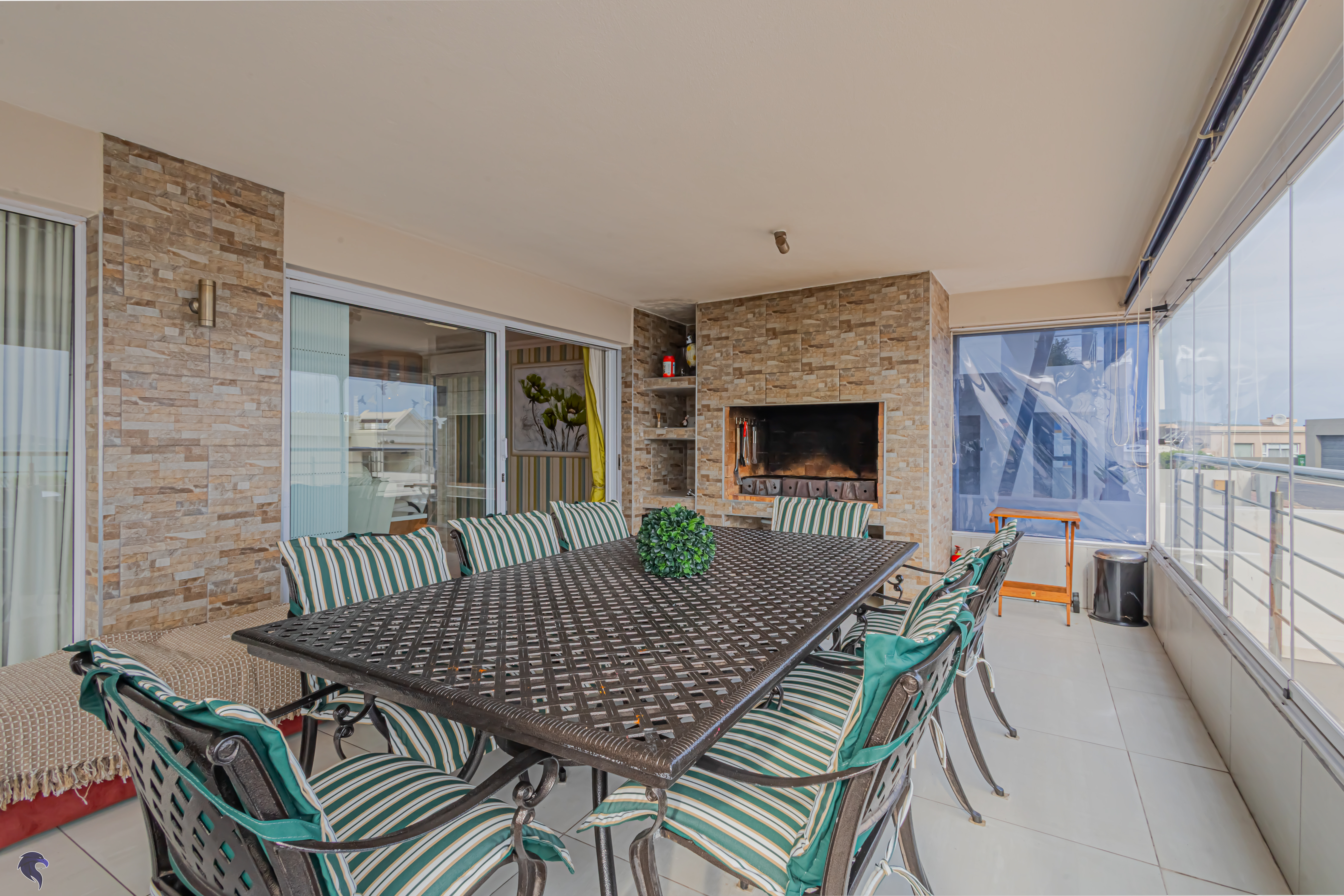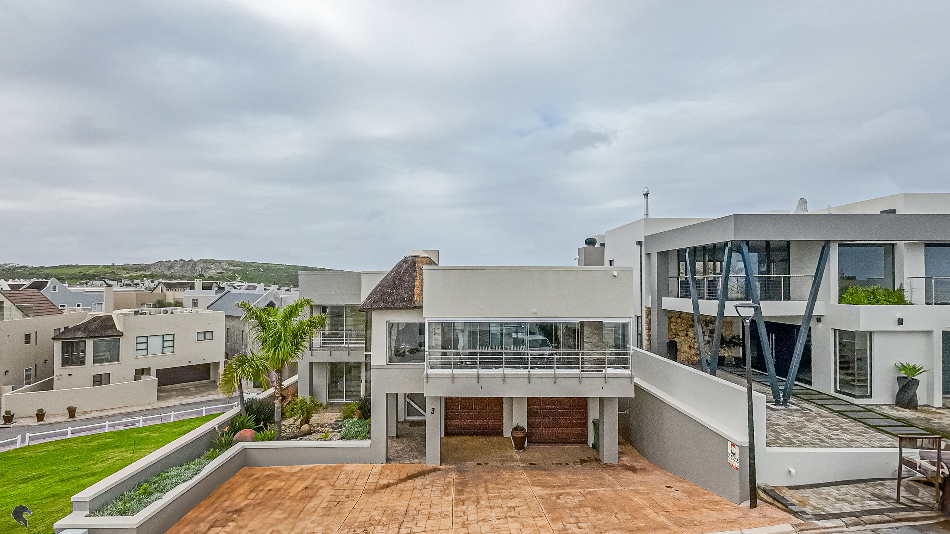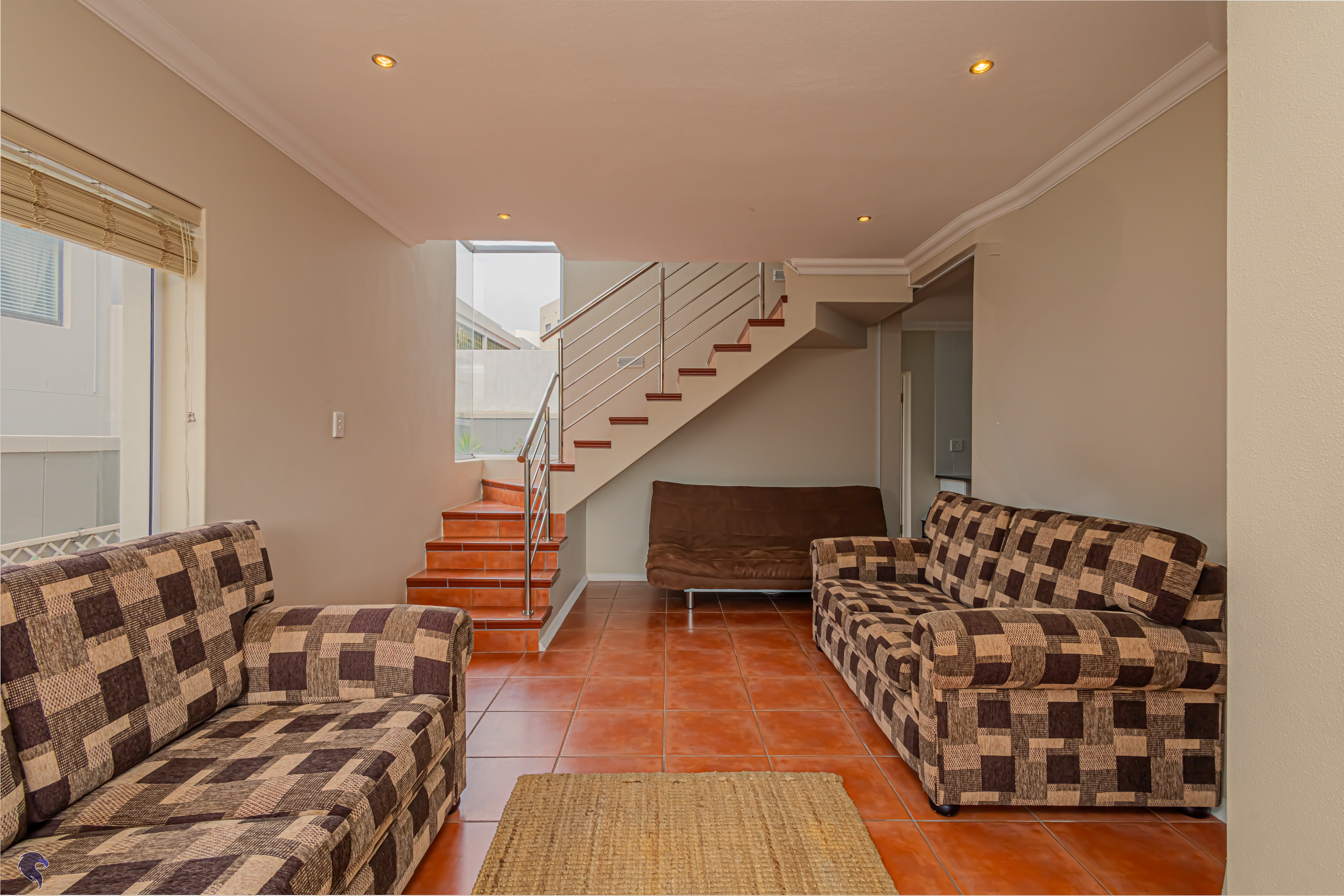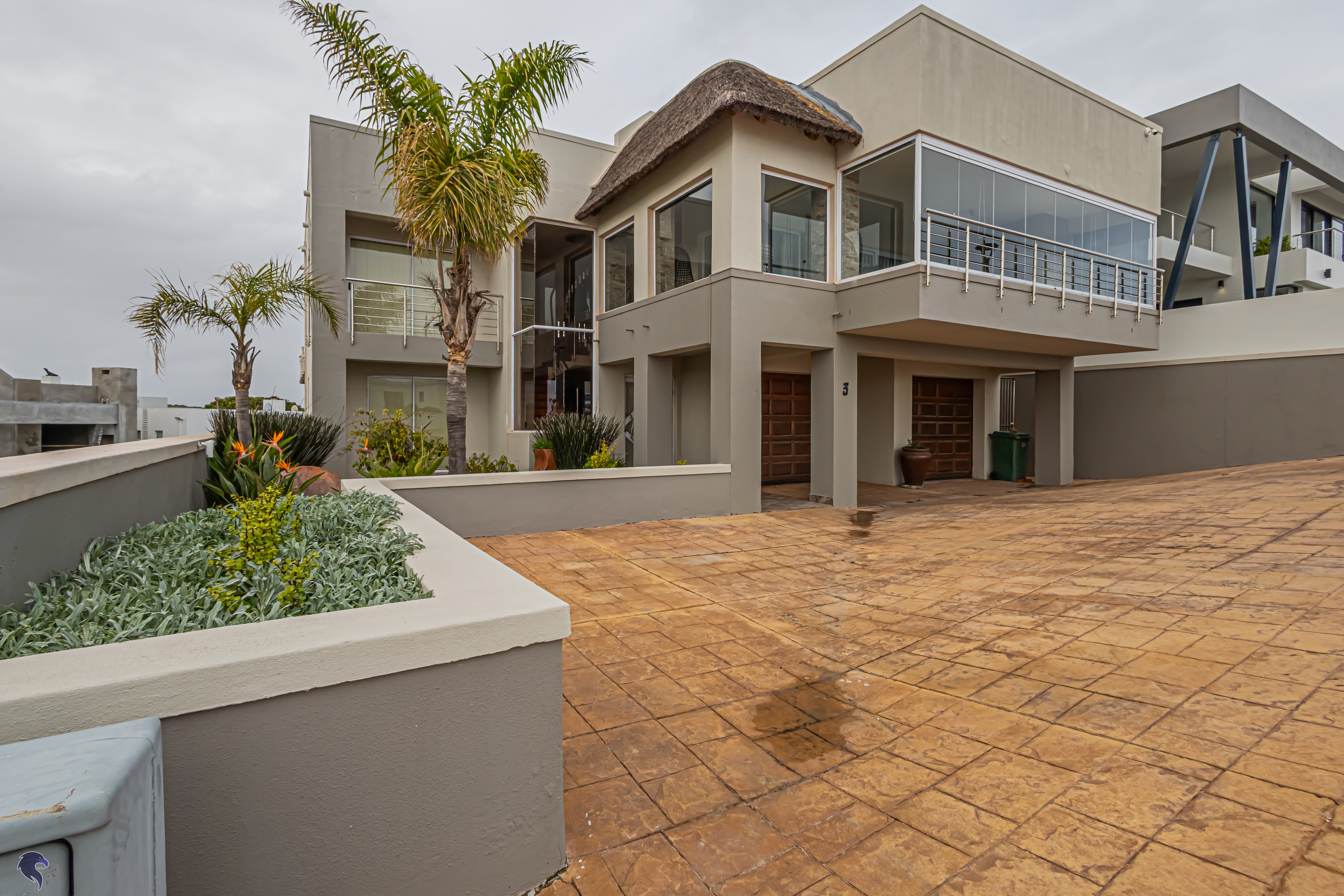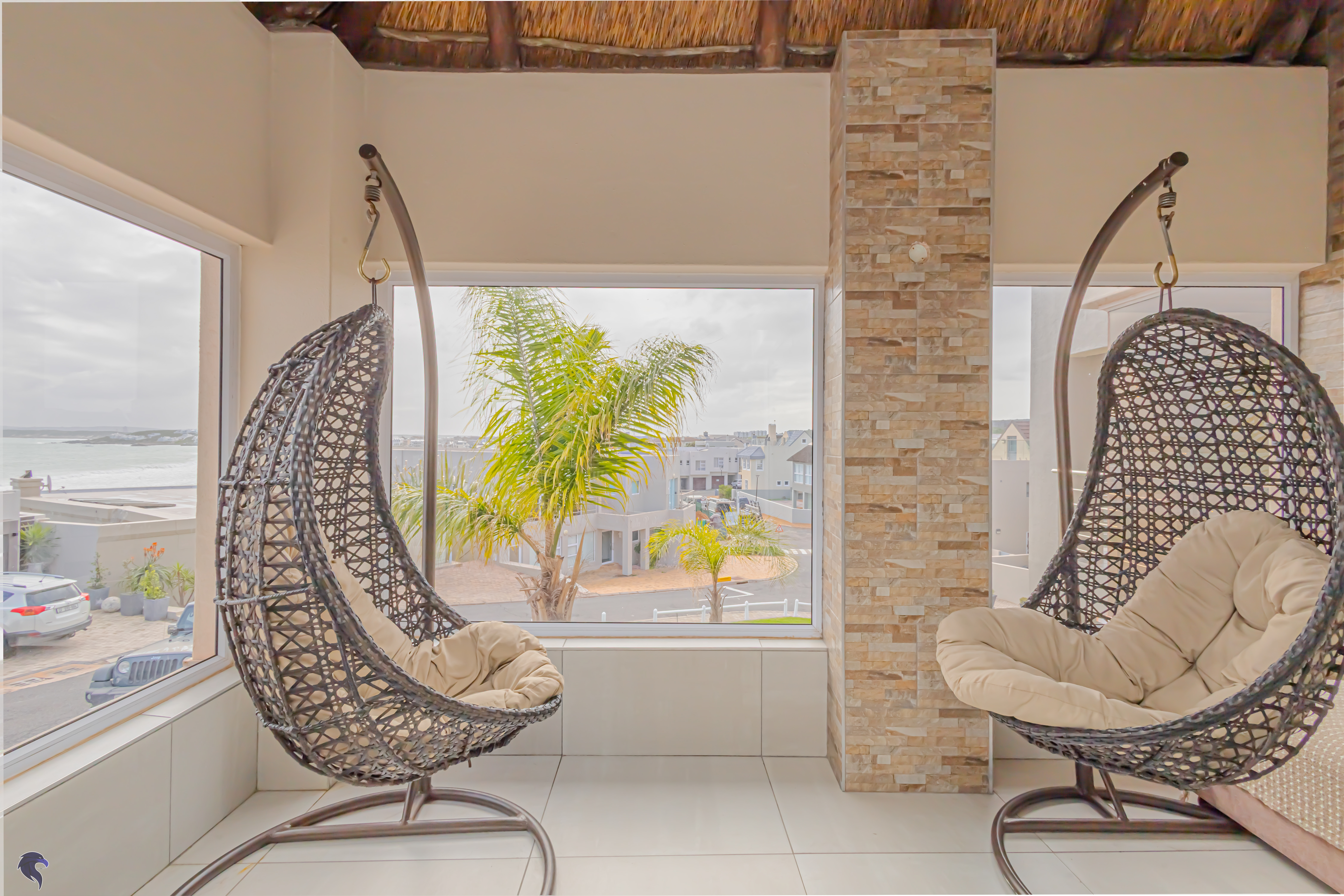 Designed for comfortable family living, the main residence spans two levels. The middle level features two spacious bedrooms, a full family bathroom, and a private study – perfect for working from home. Upstairs, the expansive open-plan living area includes a stylish lounge, dining space, and a fully fitted kitchen with separate scullery. The enclosed braai stoep is a true highlight, offering showstopping views across the bay. The master suite on this level boasts a walk-in closet and modern en-suite, while external stairs lead up to a rooftop terrace with panoramic sea views.