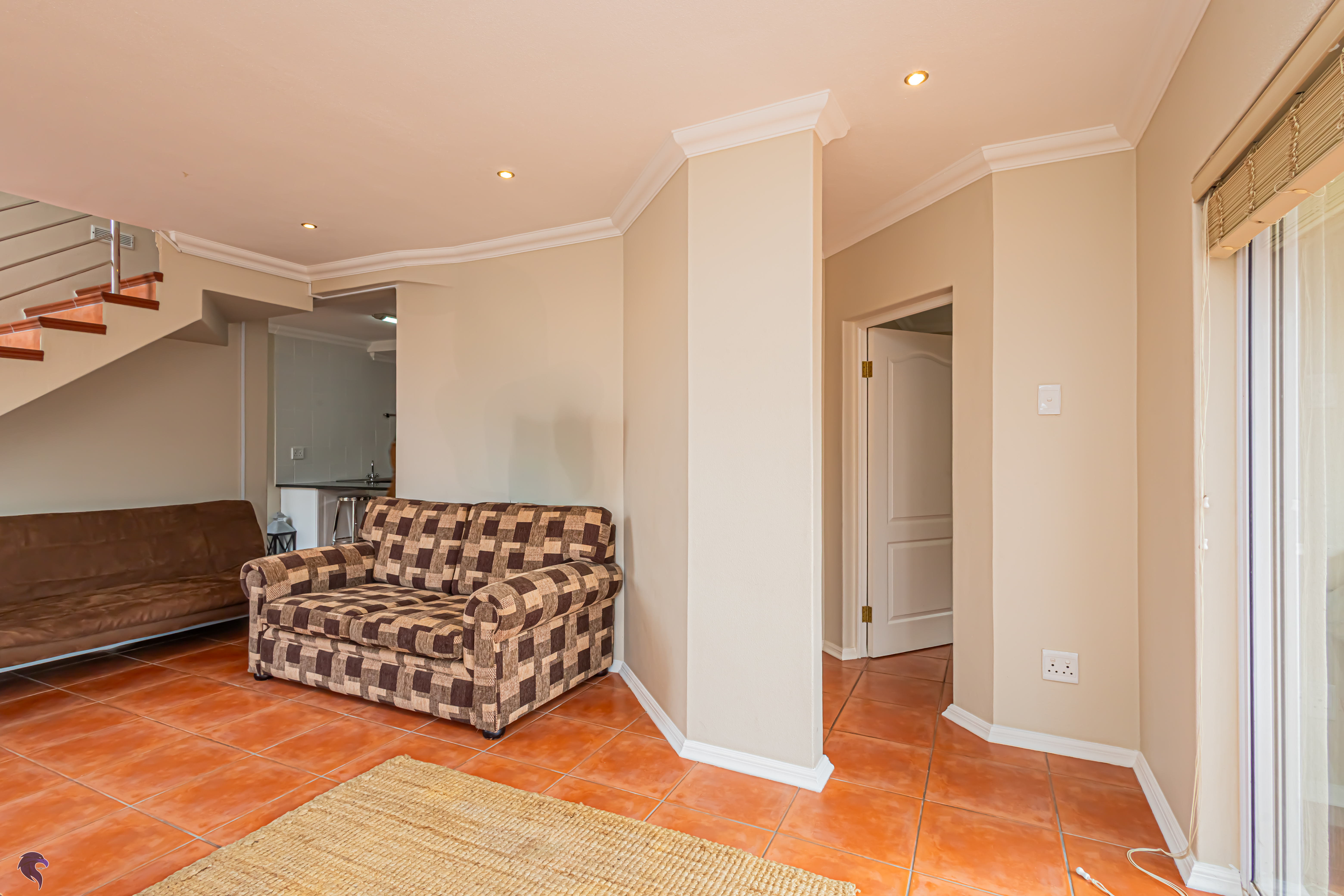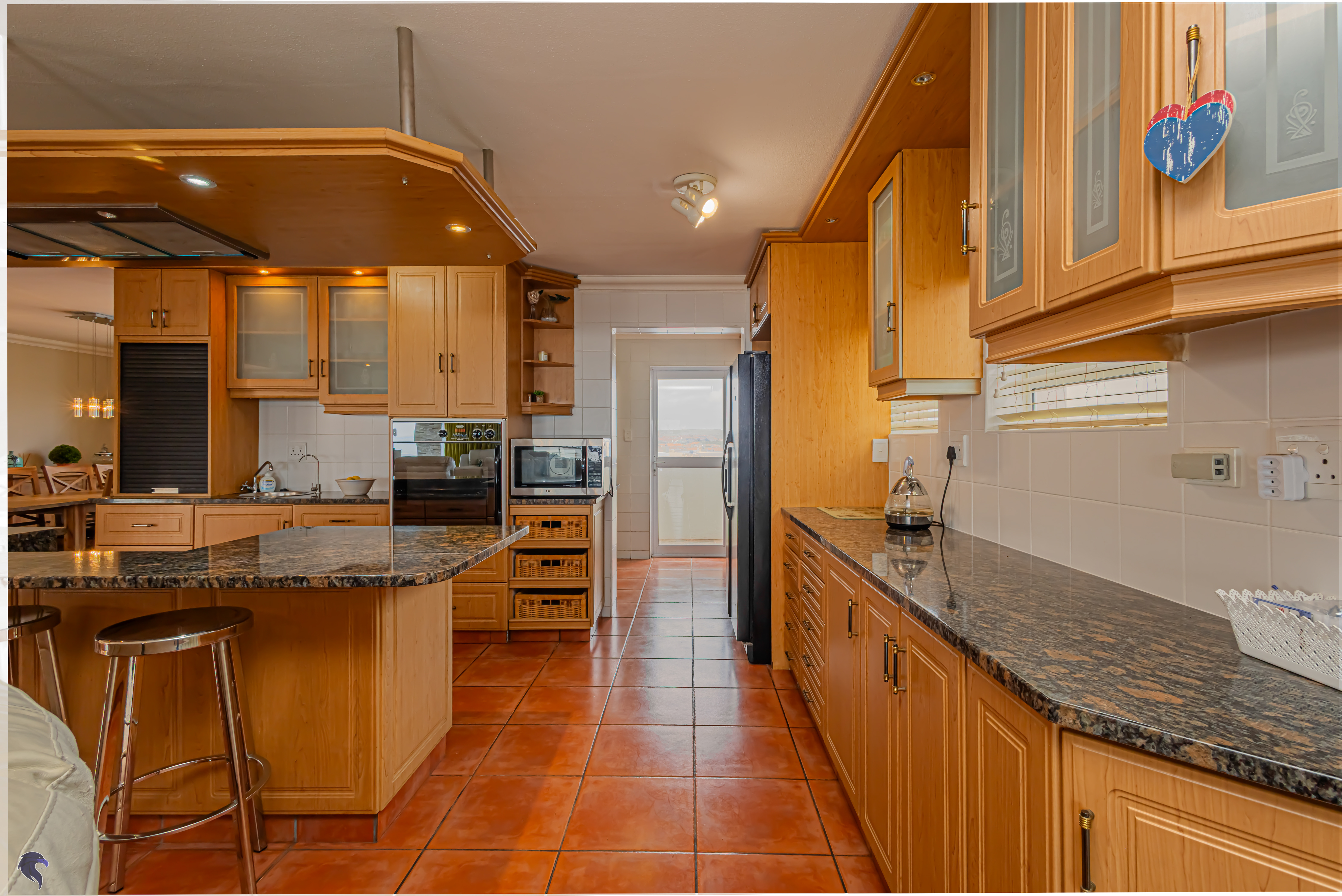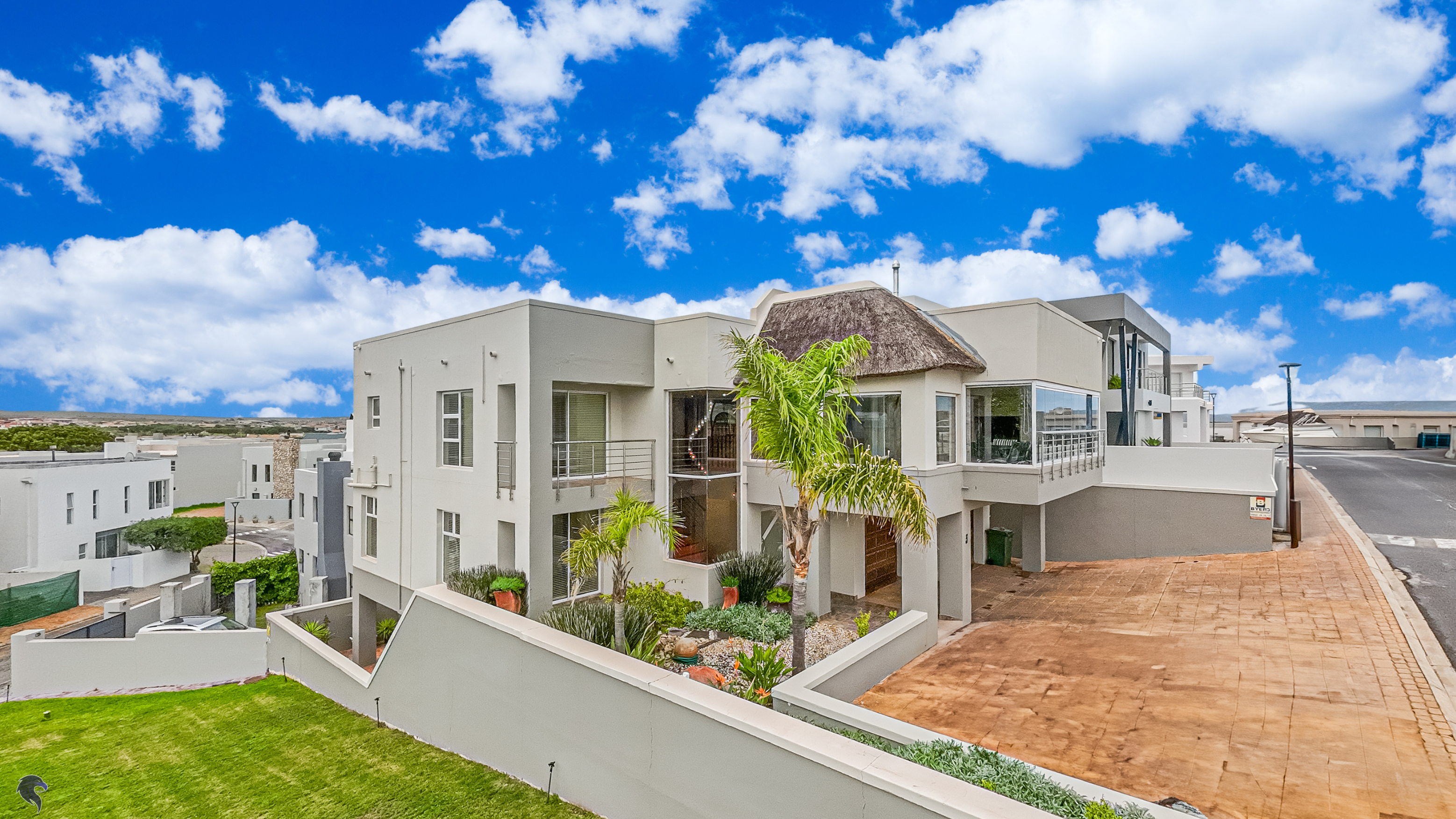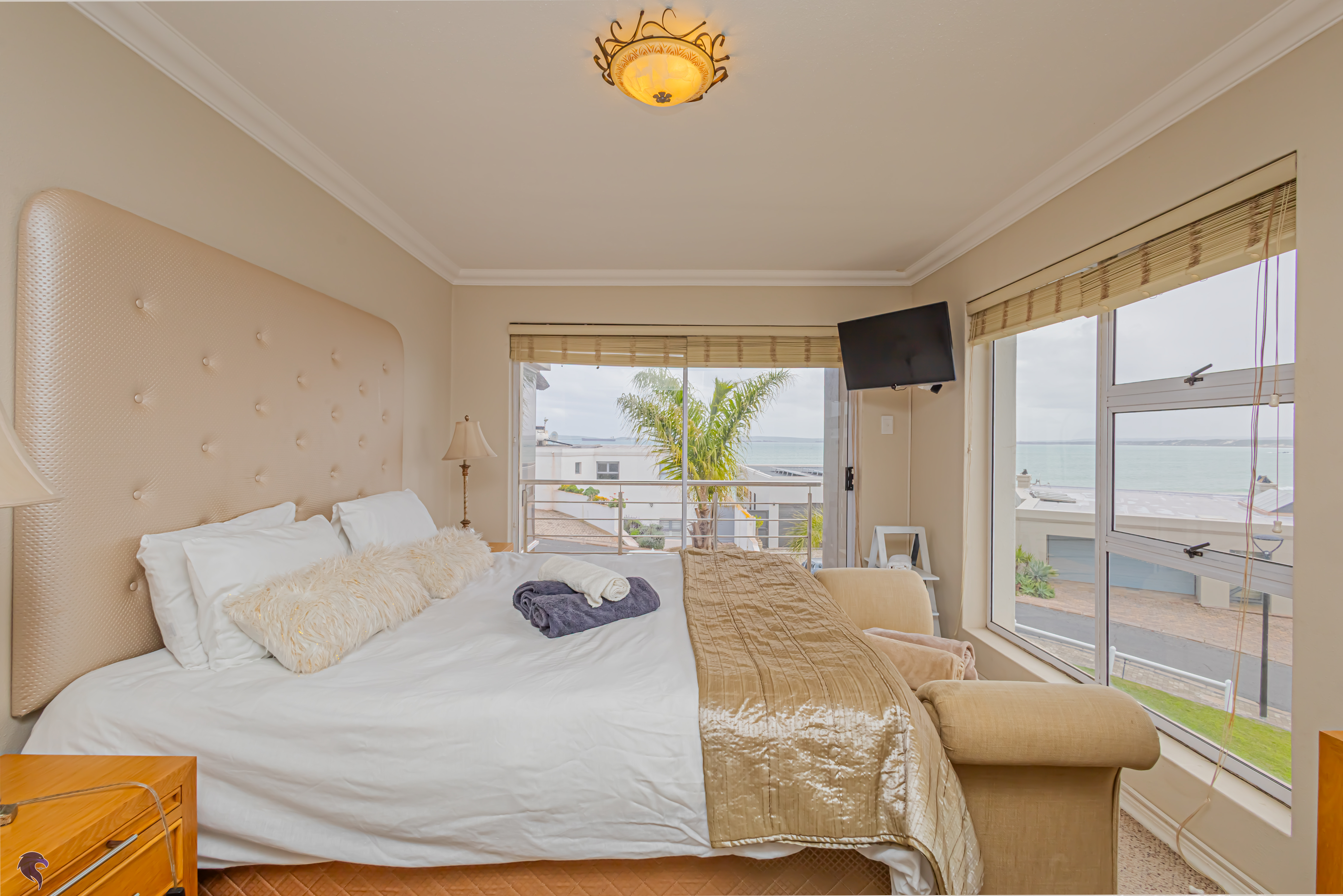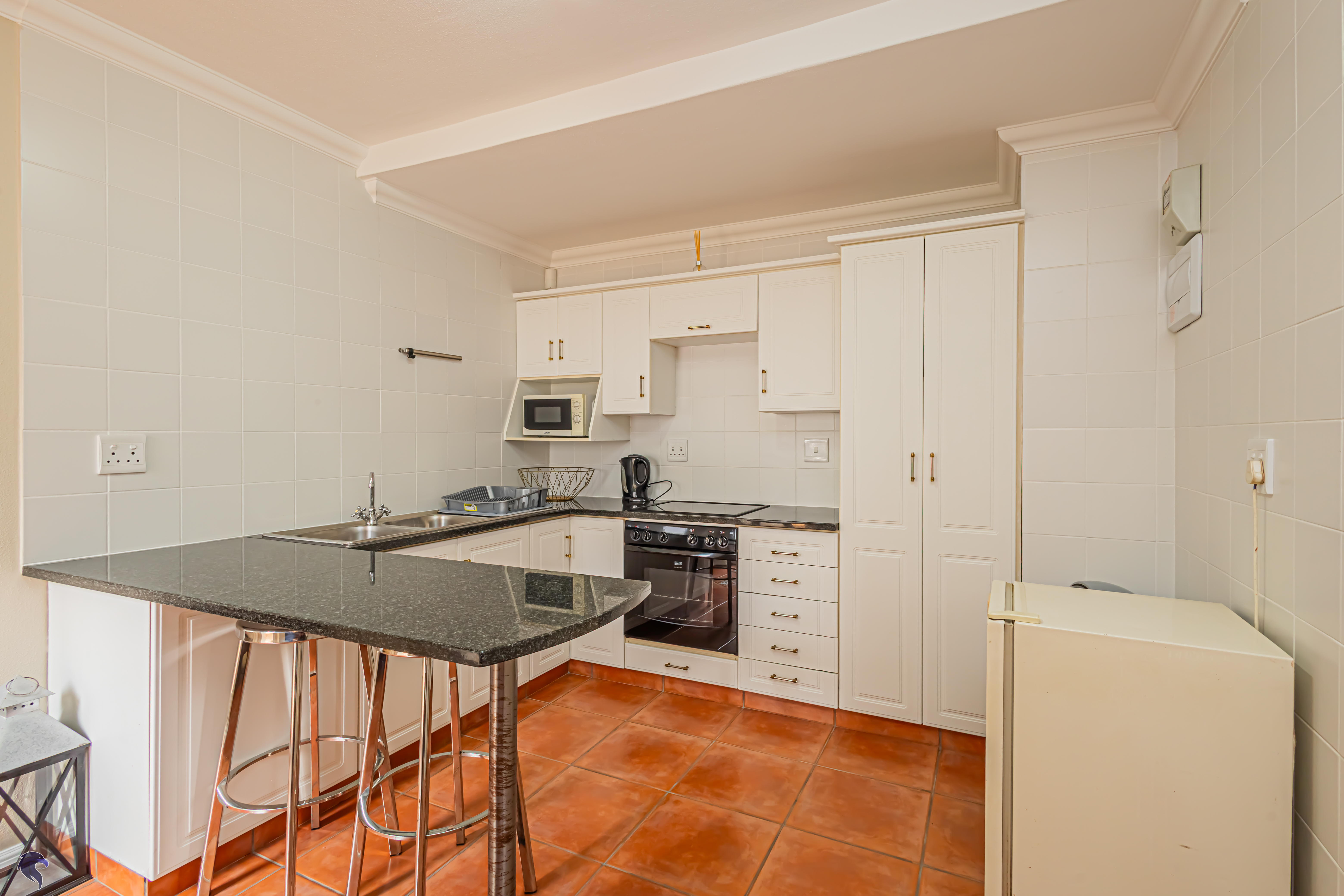 Designed for comfortable family living, the main residence spans two levels. The middle level features two spacious bedrooms, a full family bathroom, and a private study – perfect for working from home. Upstairs, the expansive open-plan living area includes a stylish lounge, dining space, and a fully fitted kitchen with separate scullery. The enclosed braai stoep is a true highlight, offering showstopping views across the bay. The master suite on this level boasts a walk-in closet and modern en-suite, while external stairs lead up to a rooftop terrace with panoramic sea views.