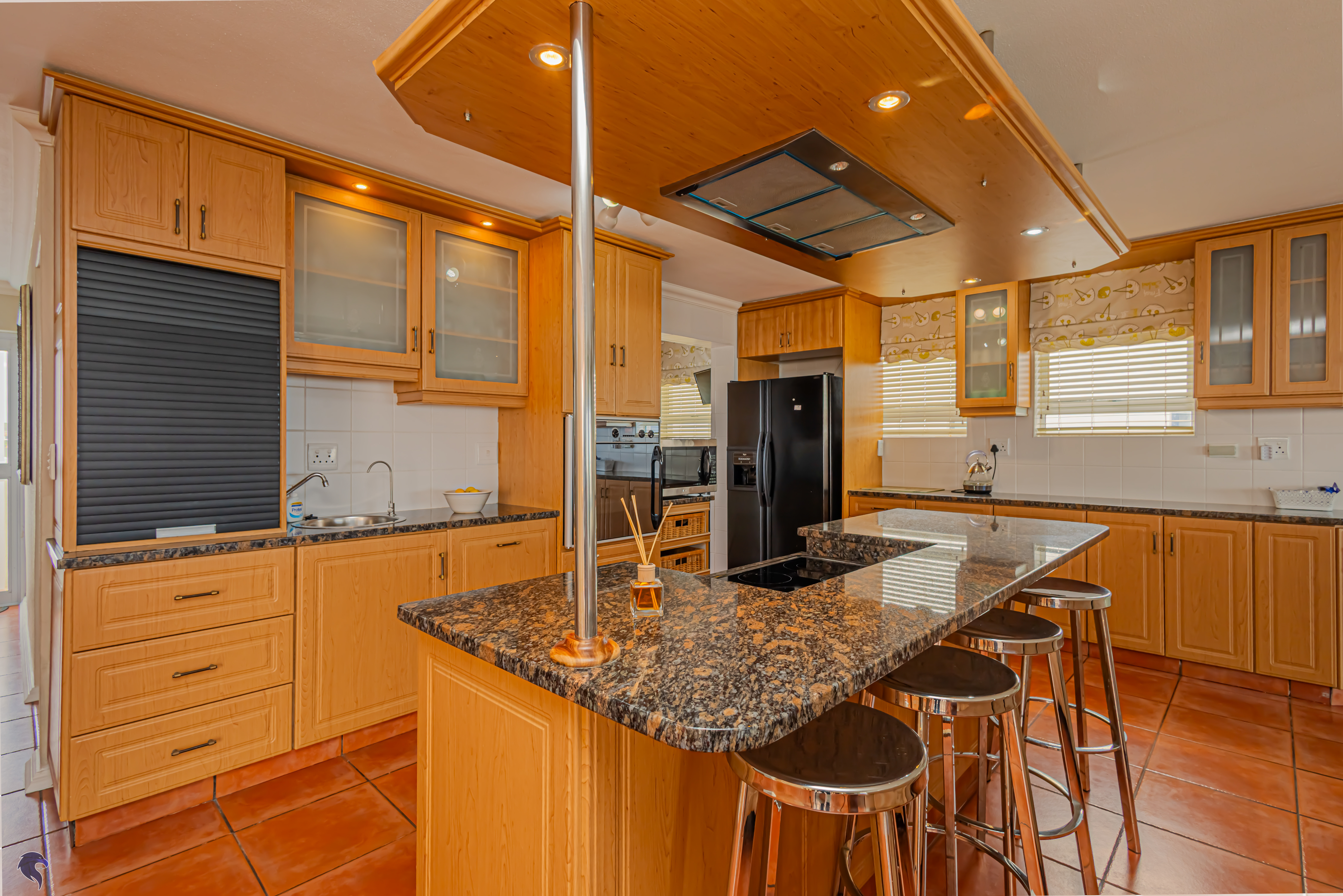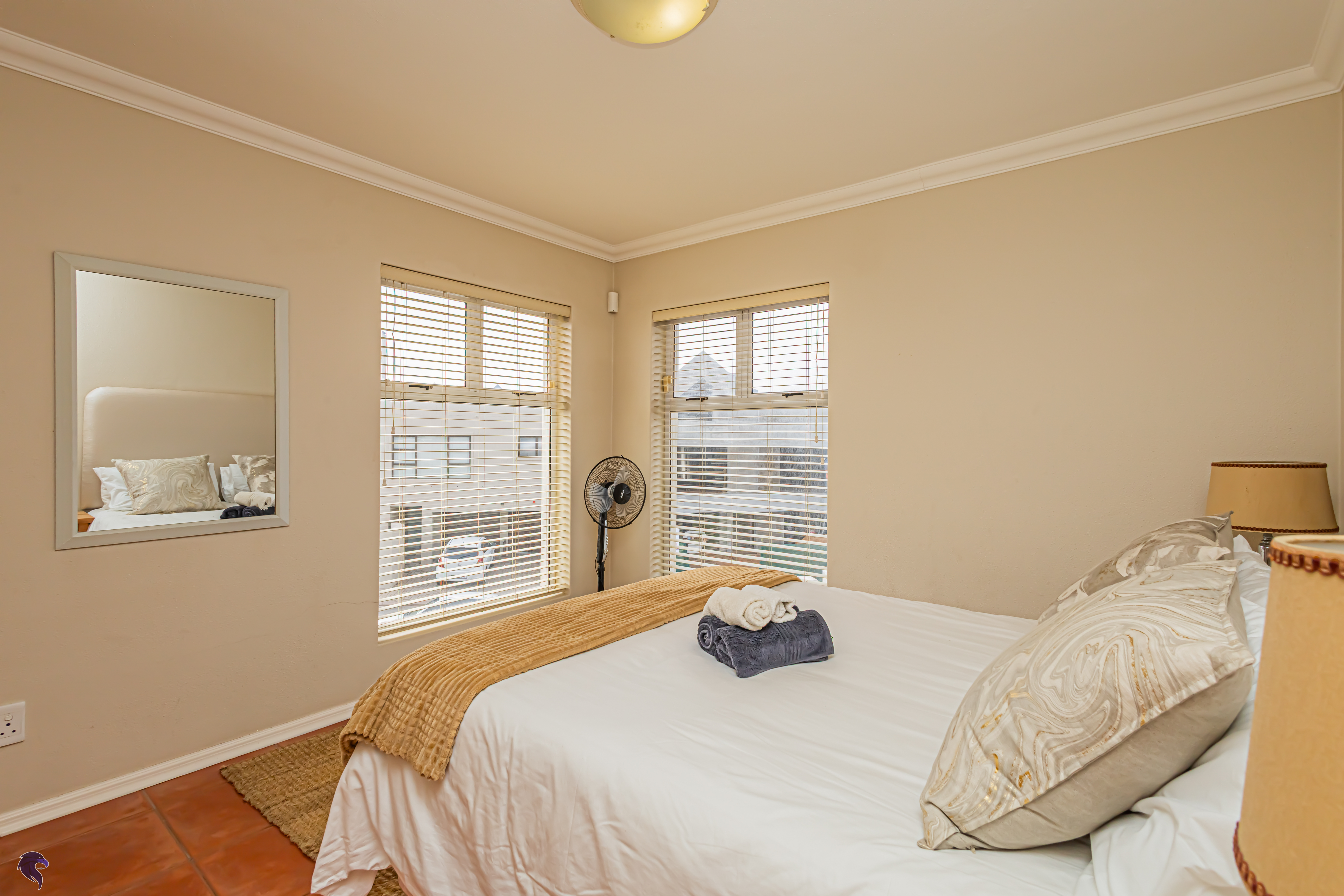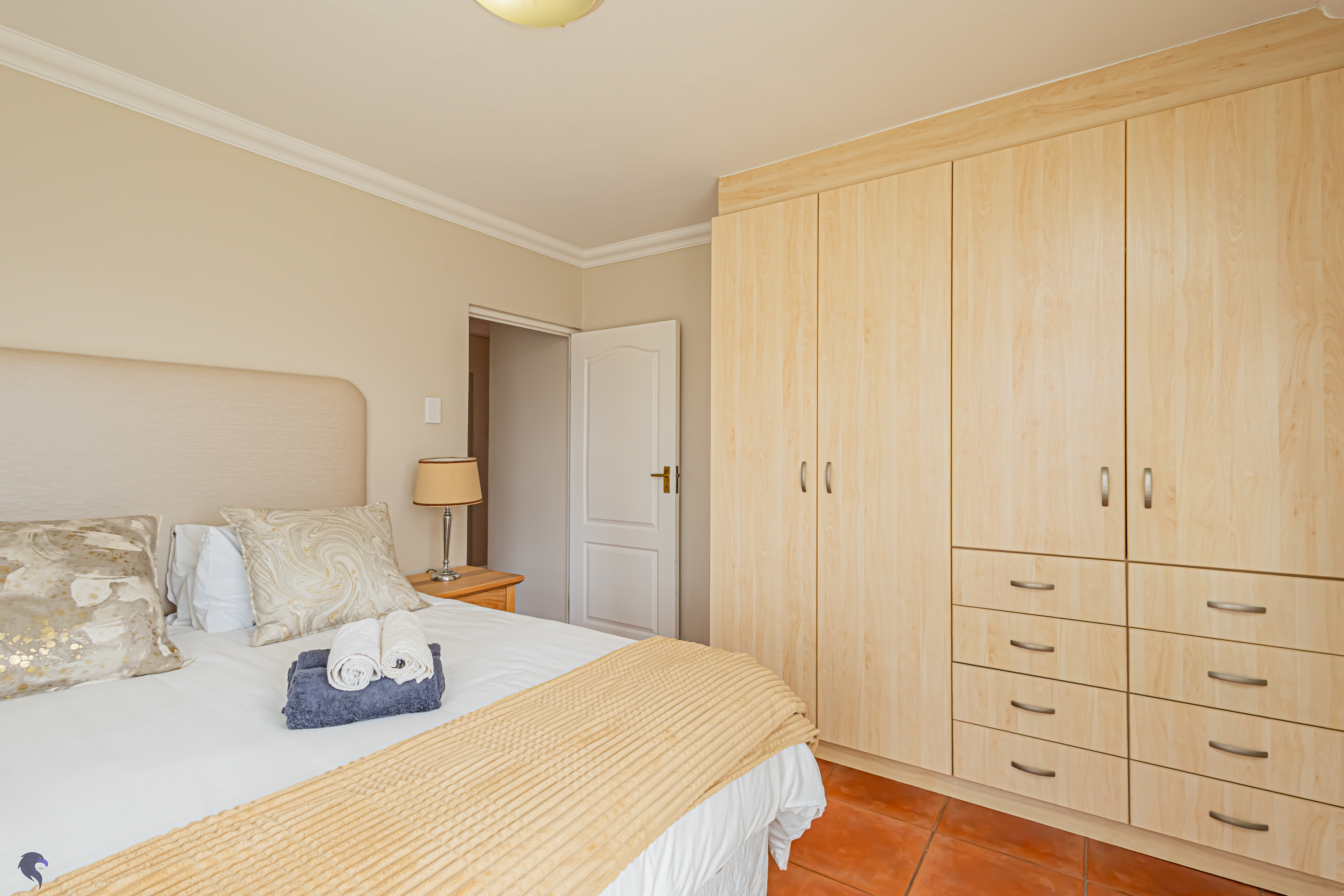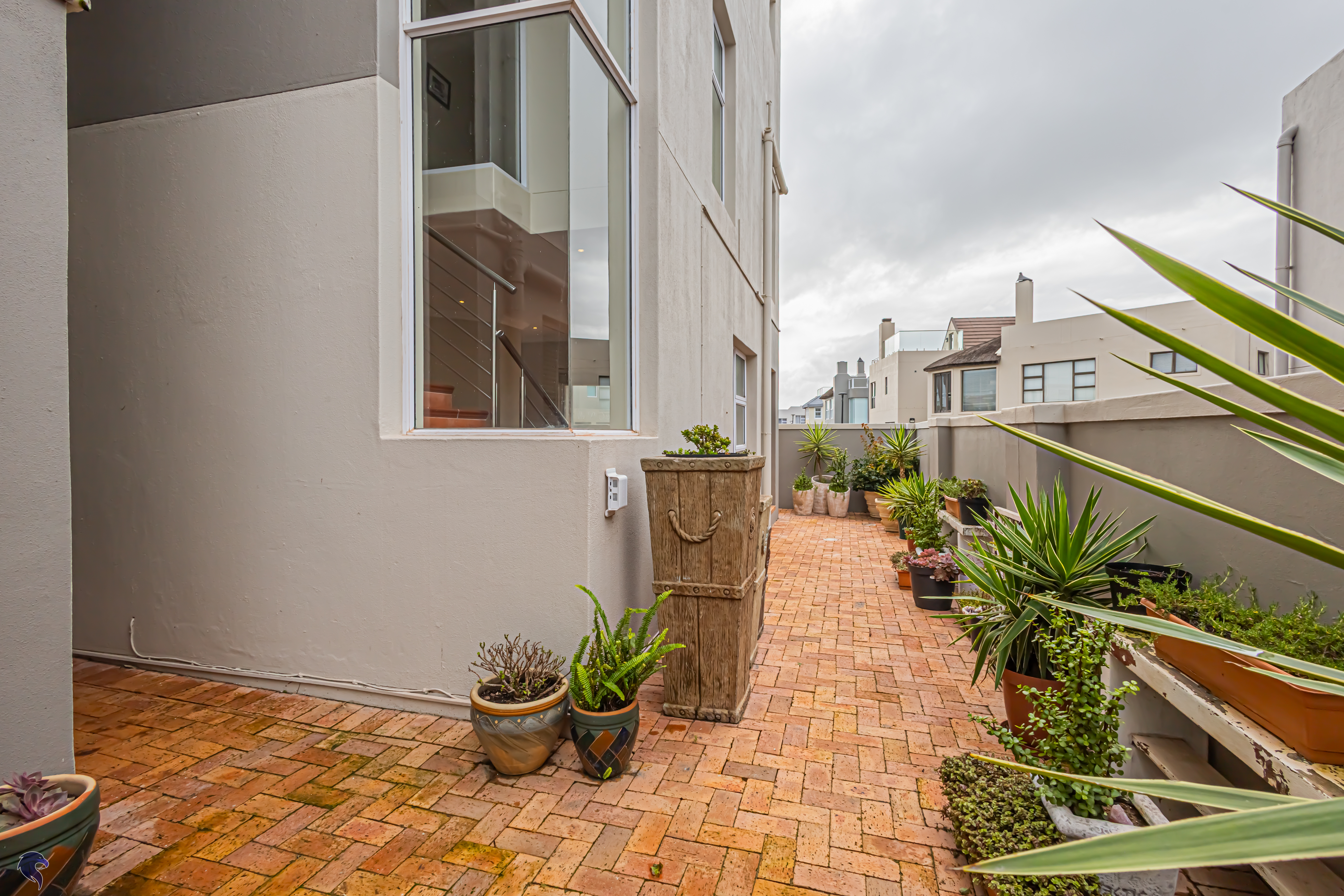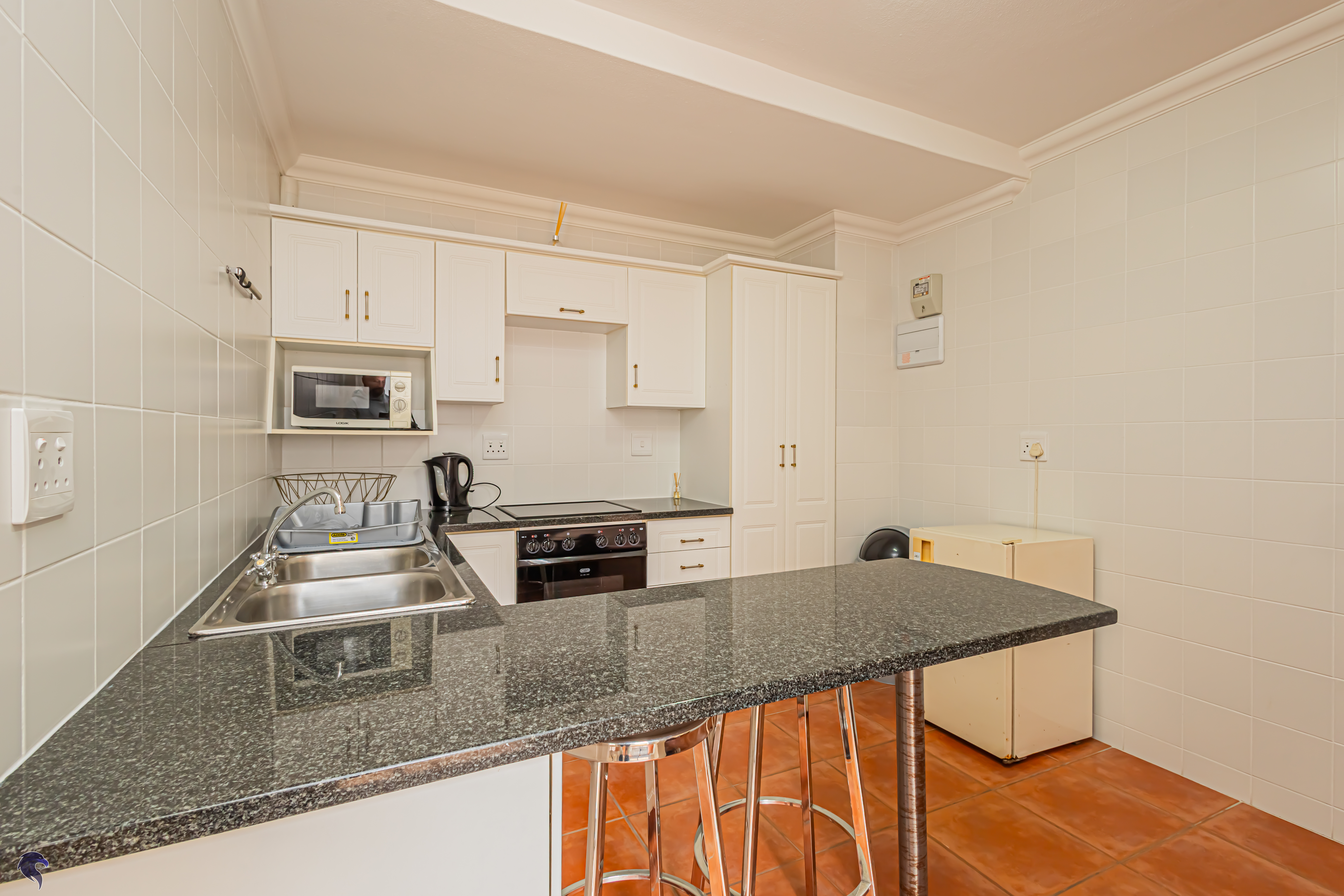 Designed for comfortable family living, the main residence spans two levels. The middle level features two spacious bedrooms, a full family bathroom, and a private study – perfect for working from home. Upstairs, the expansive open-plan living area includes a stylish lounge, dining space, and a fully fitted kitchen with separate scullery. The enclosed braai stoep is a true highlight, offering showstopping views across the bay. The master suite on this level boasts a walk-in closet and modern en-suite, while external stairs lead up to a rooftop terrace with panoramic sea views.