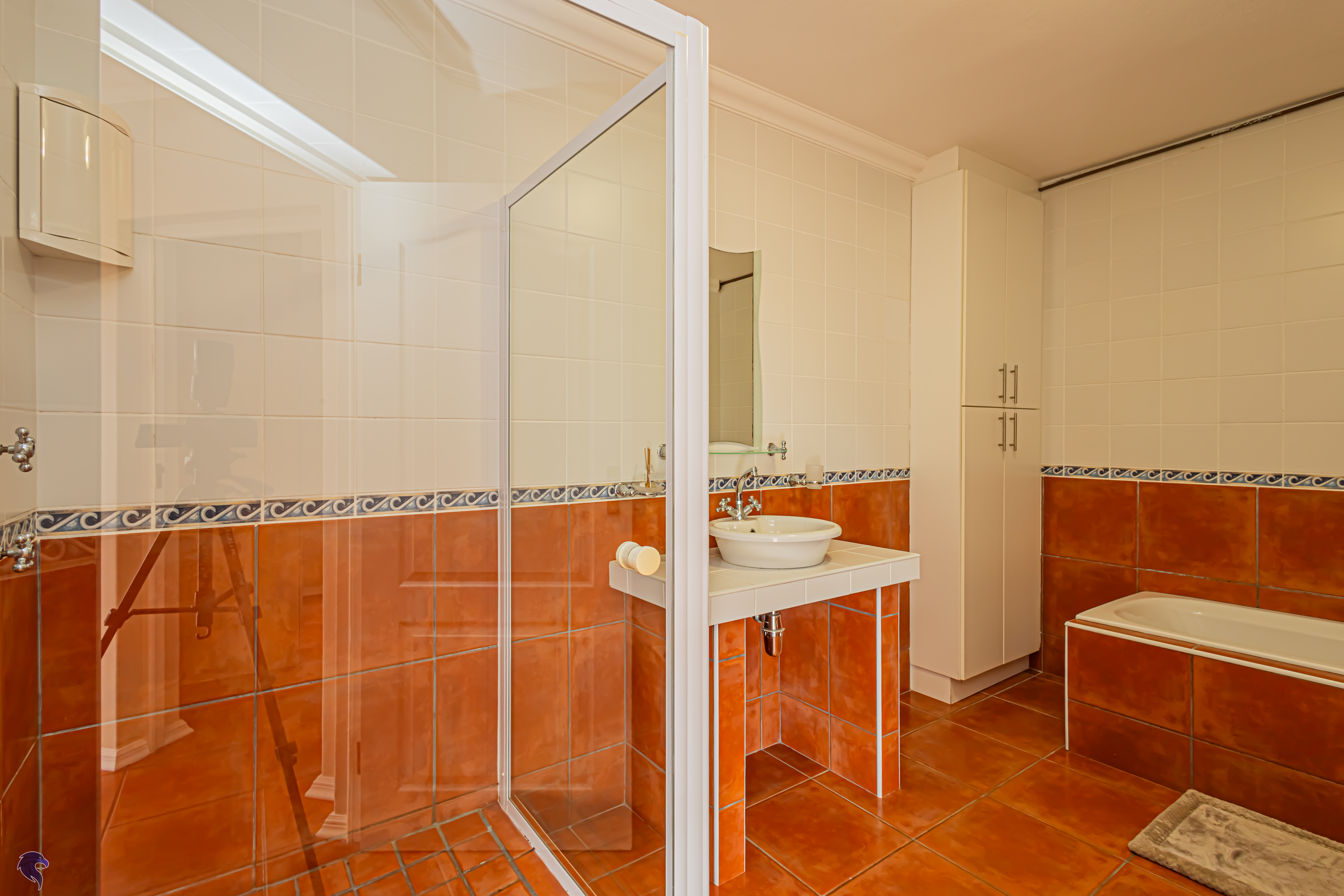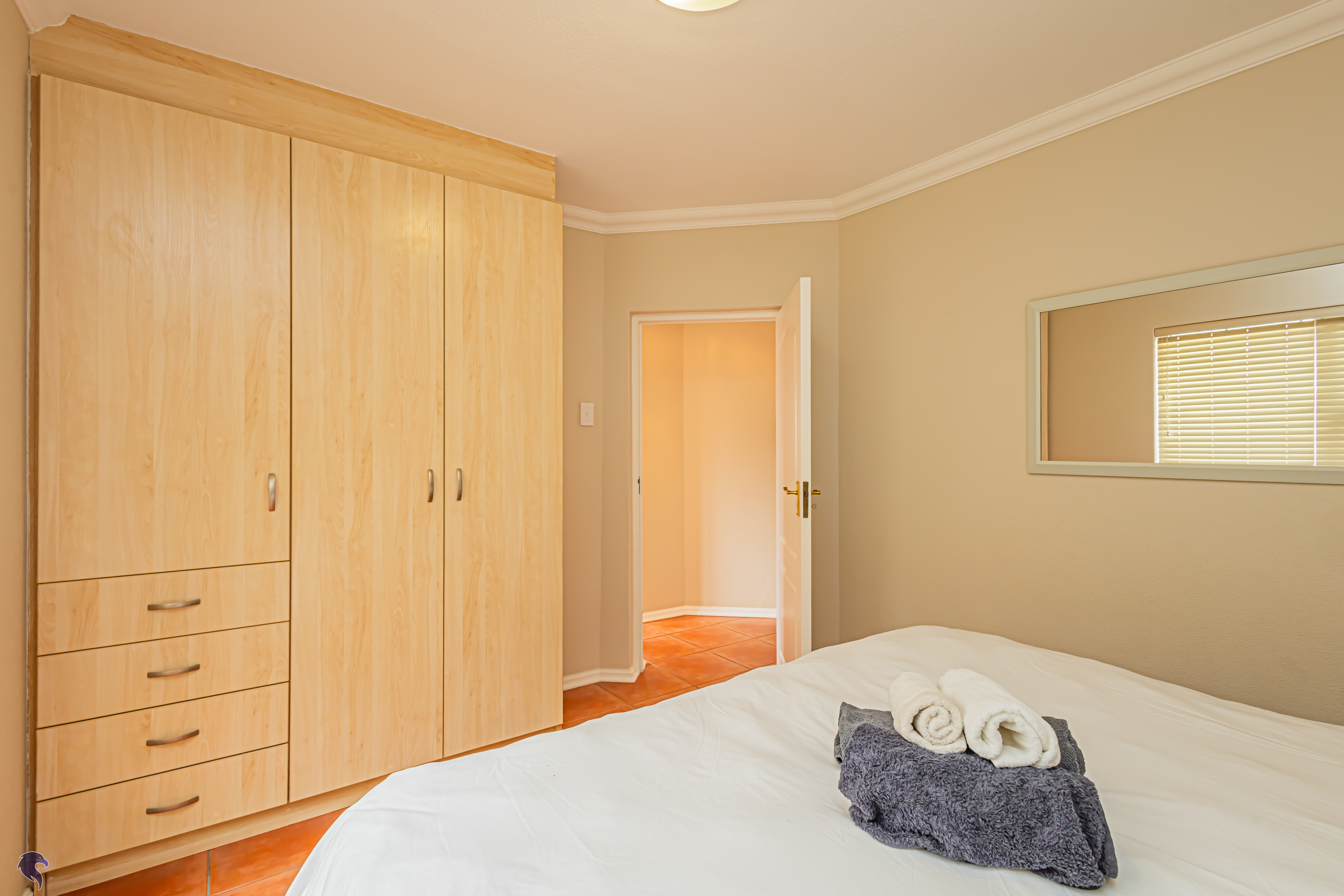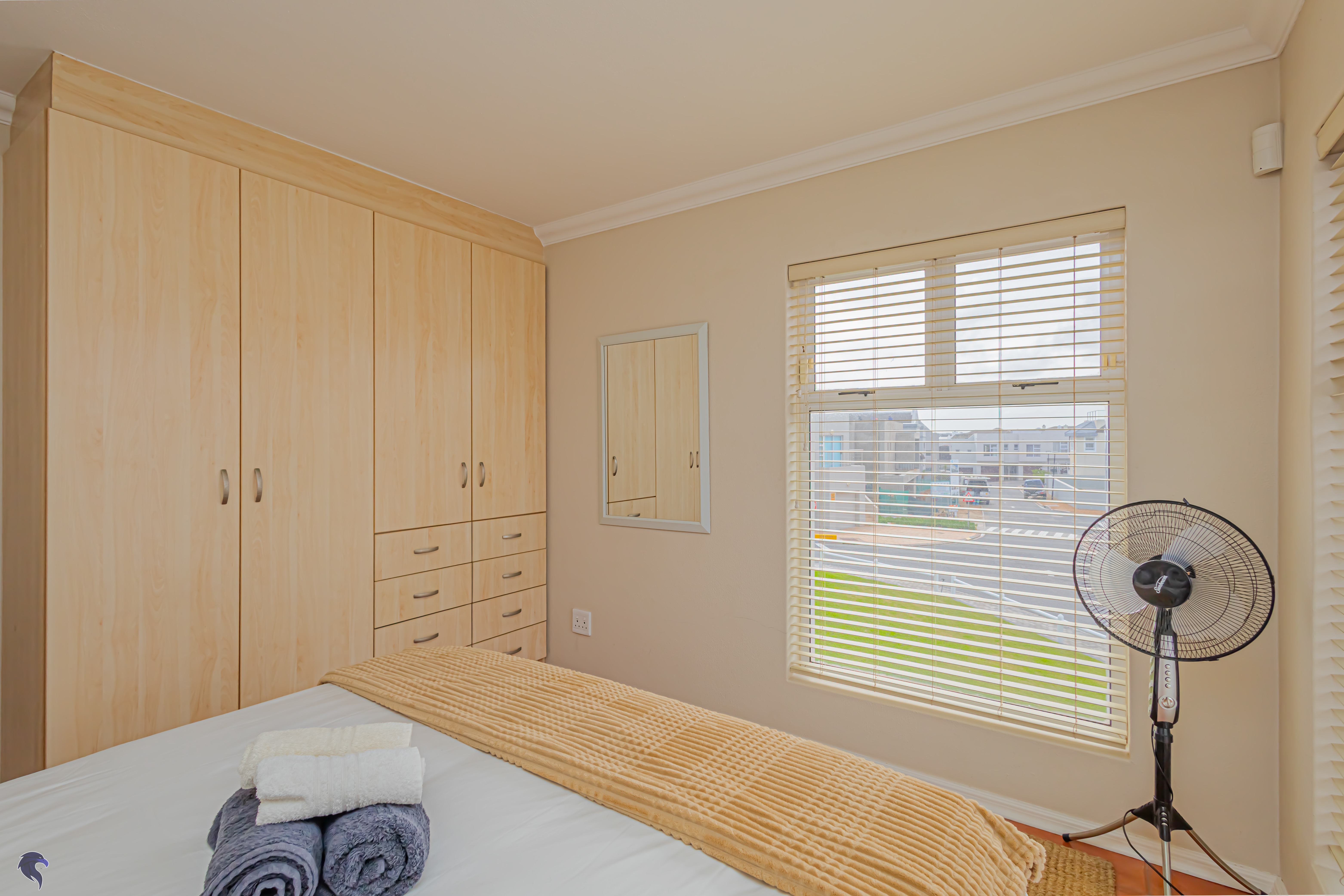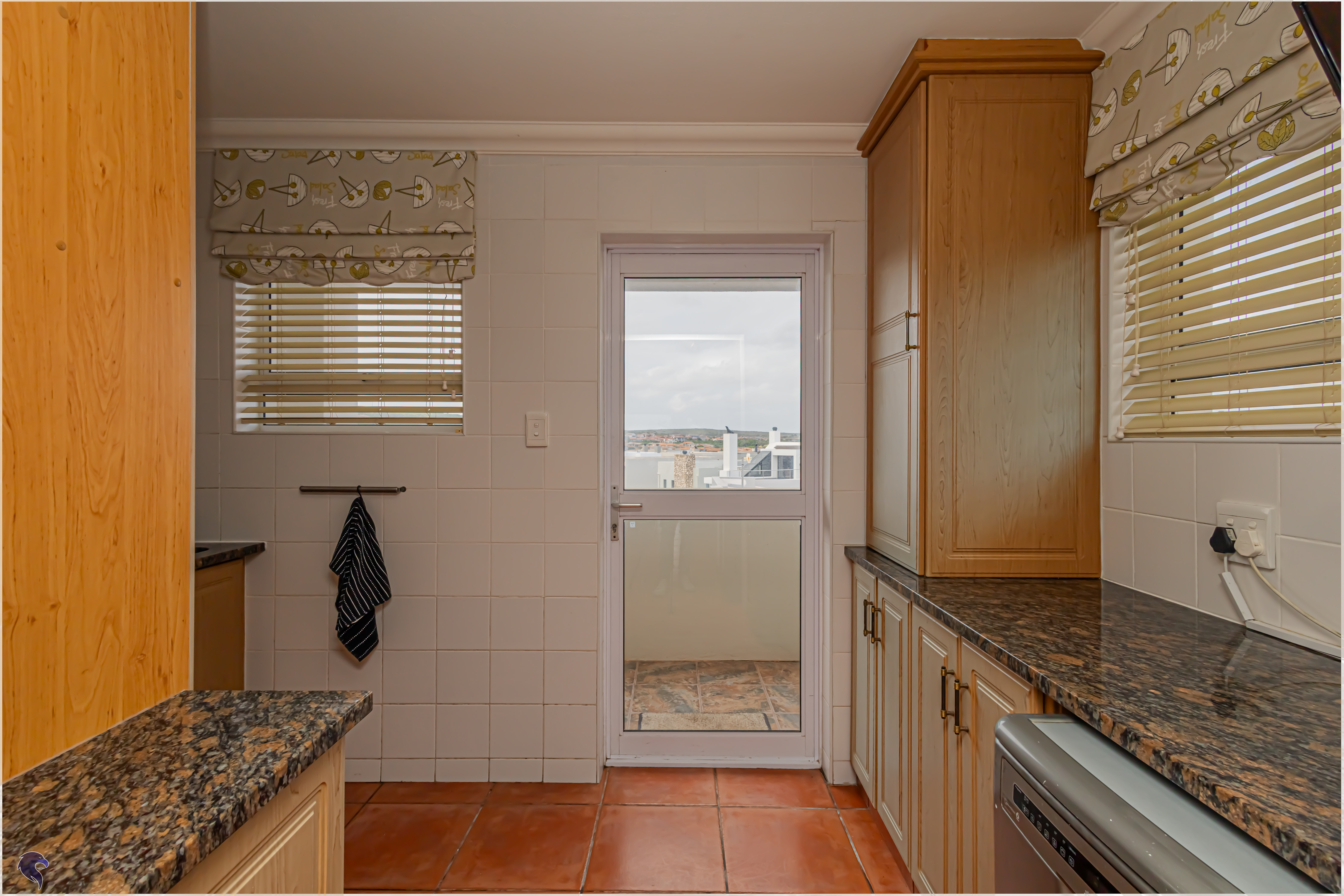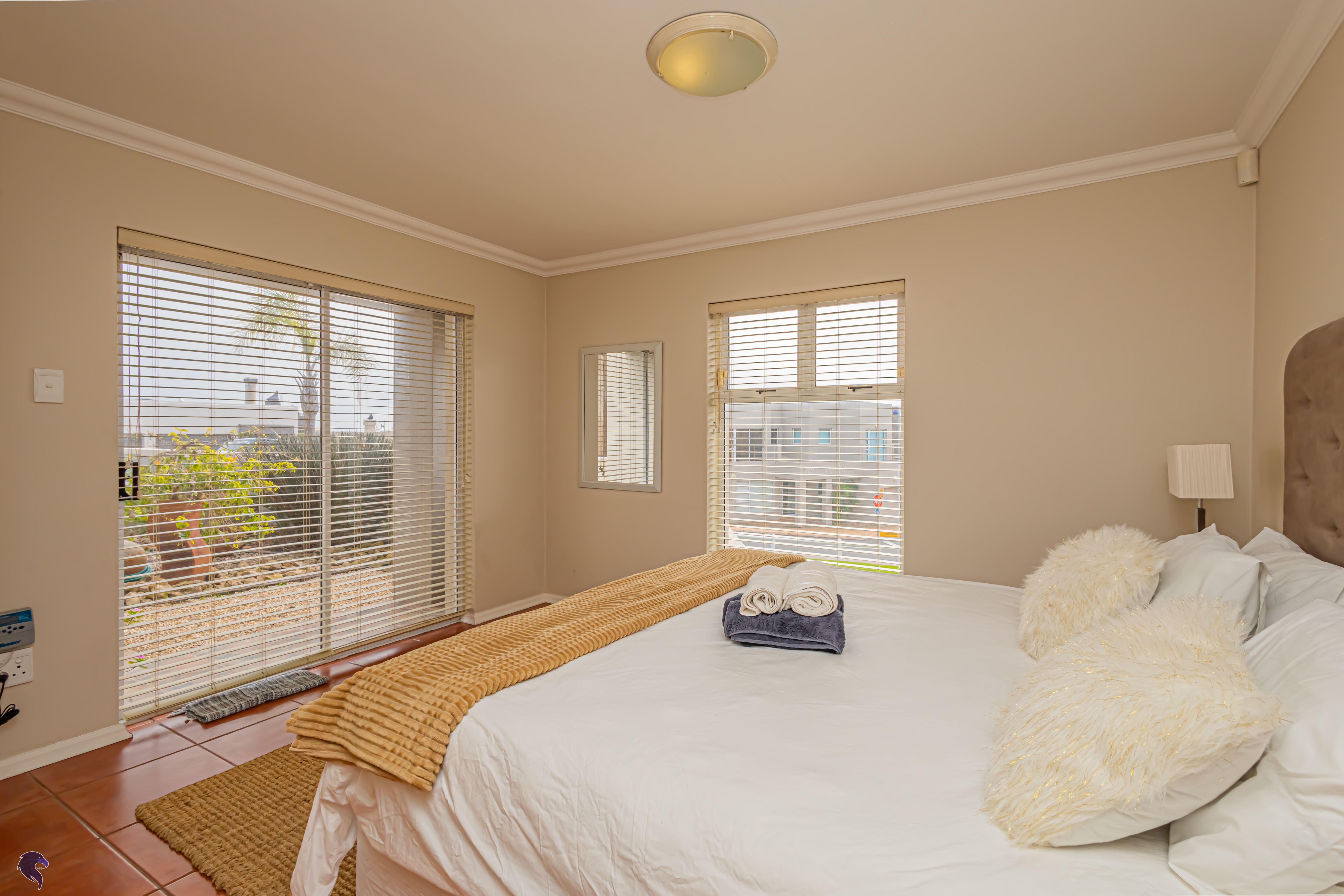 Designed for comfortable family living, the main residence spans two levels. The middle level features two spacious bedrooms, a full family bathroom, and a private study – perfect for working from home. Upstairs, the expansive open-plan living area includes a stylish lounge, dining space, and a fully fitted kitchen with separate scullery. The enclosed braai stoep is a true highlight, offering showstopping views across the bay. The master suite on this level boasts a walk-in closet and modern en-suite, while external stairs lead up to a rooftop terrace with panoramic sea views.