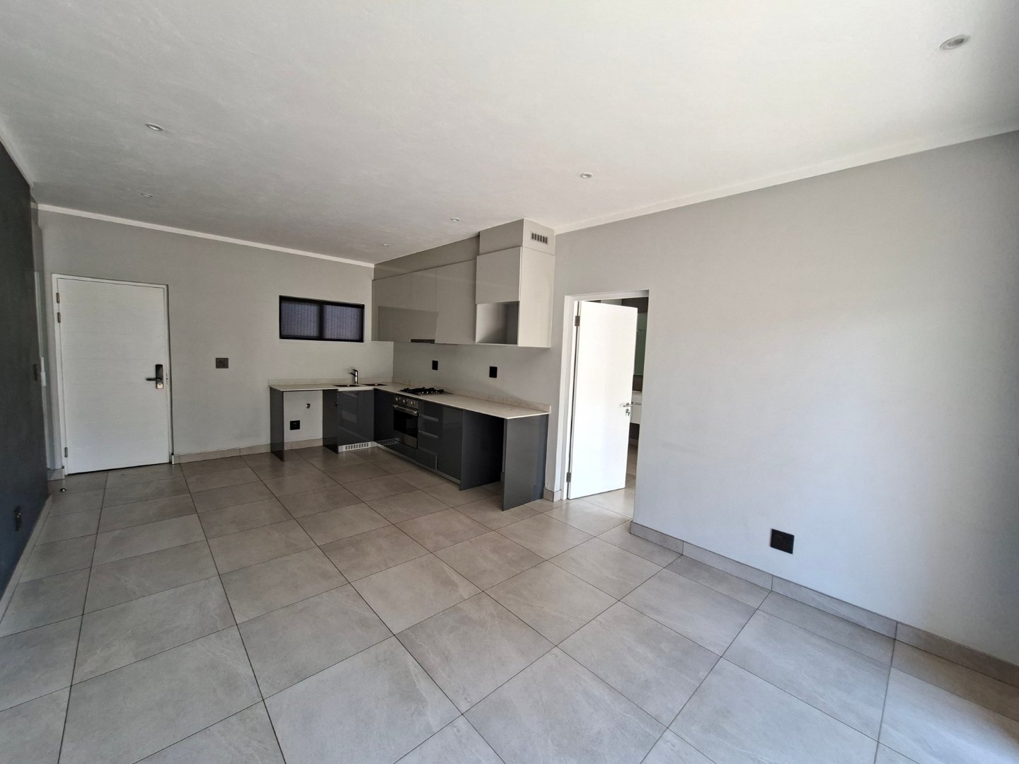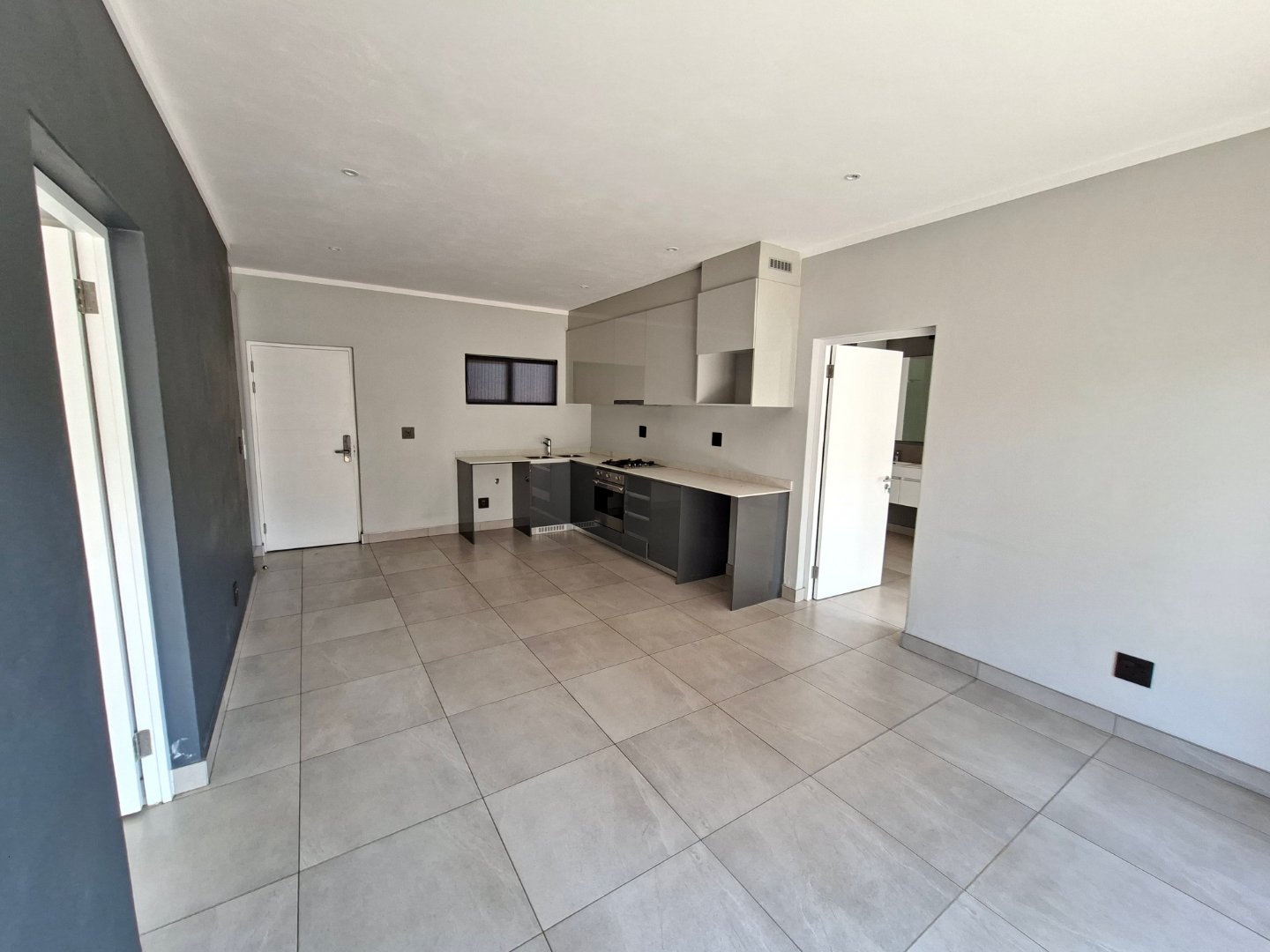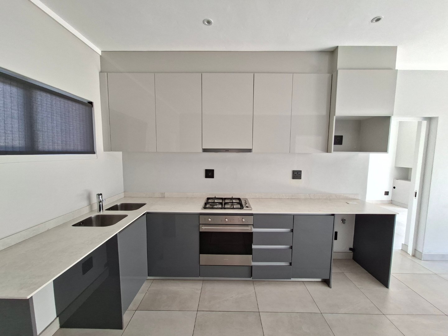 This modern two-bedroom, two-bathroom apartment is designed for a convenient and comfortable lifestyle. The open-plan living area features flooring and a neutral color palette with an accent wall, creating a spacious and inviting atmosphere. The kitchen seamlessly integrates with the living space, boasting glossy grey cabinetry, a gas stovetop (smeg) with an extractor fan, and a light-colored countertop.