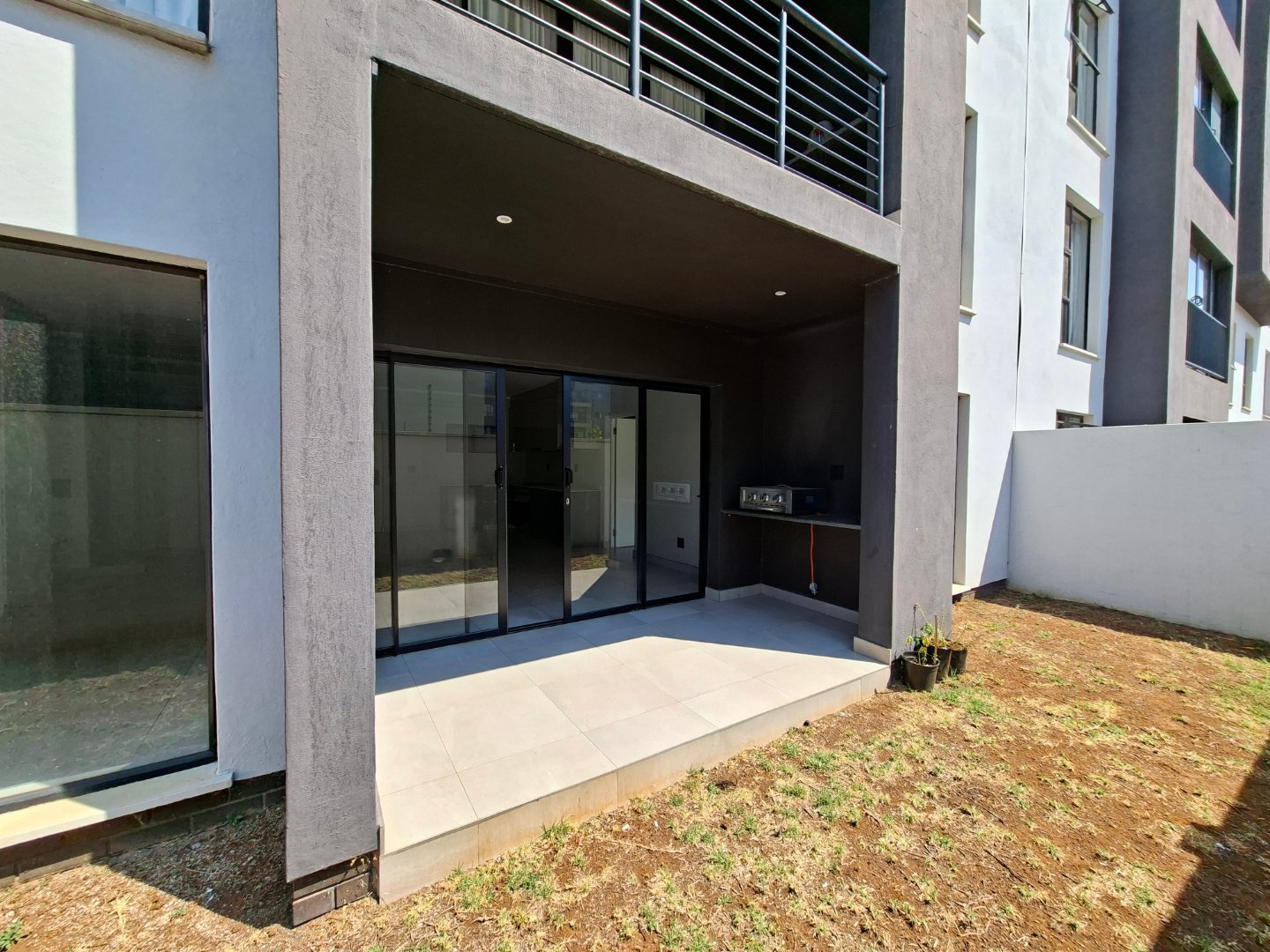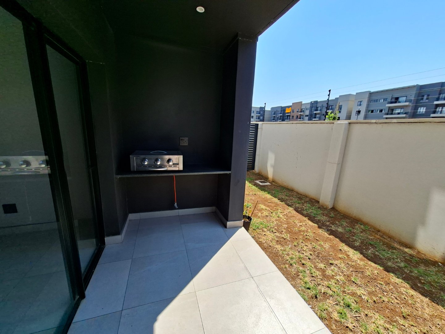 The living area extends through sliding glass doors to a private garden which offers a built-in countertop with a small prep area,and gas braai.