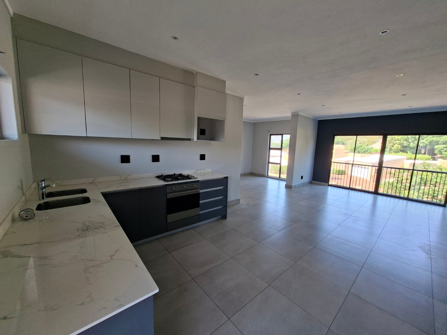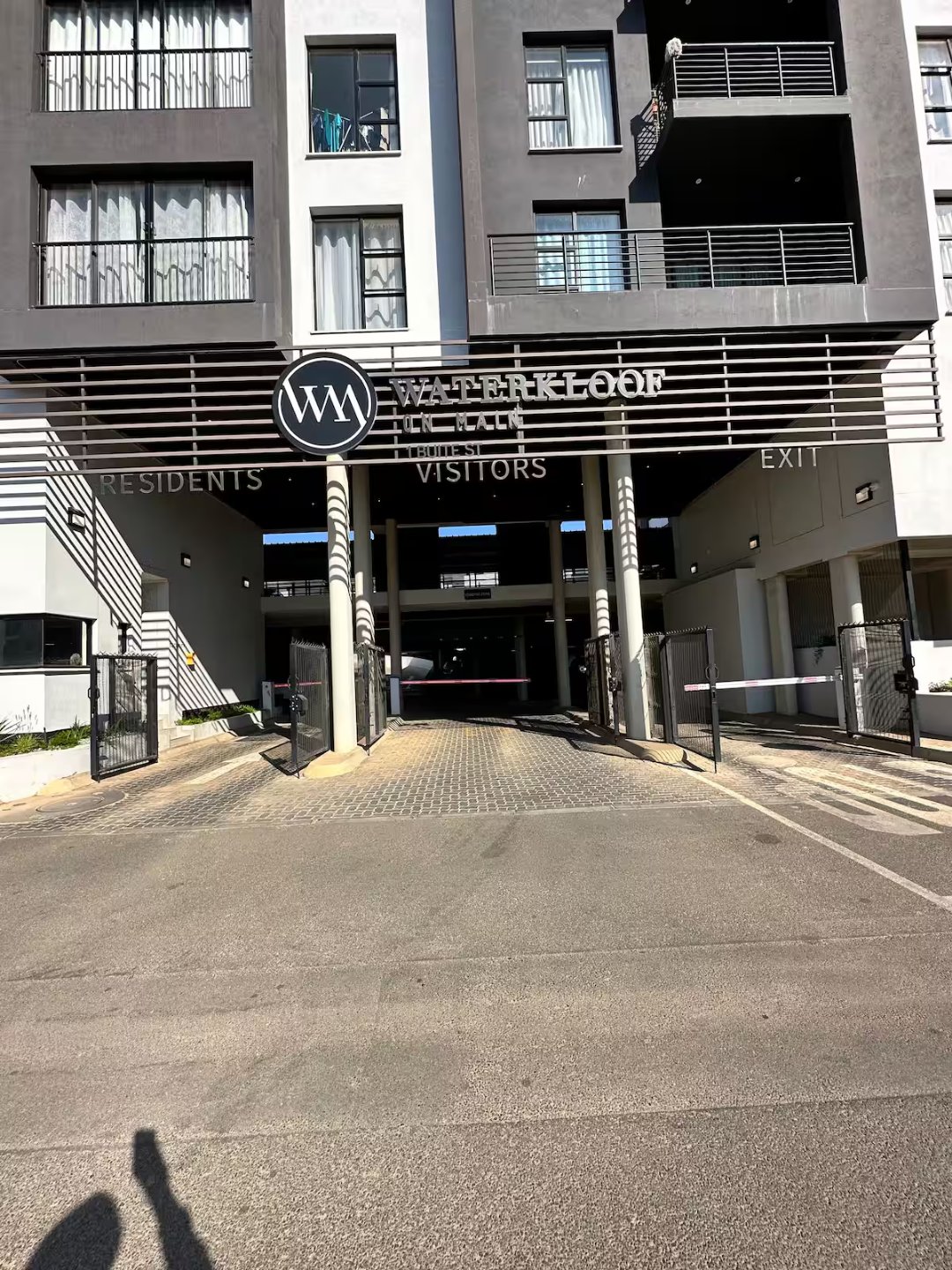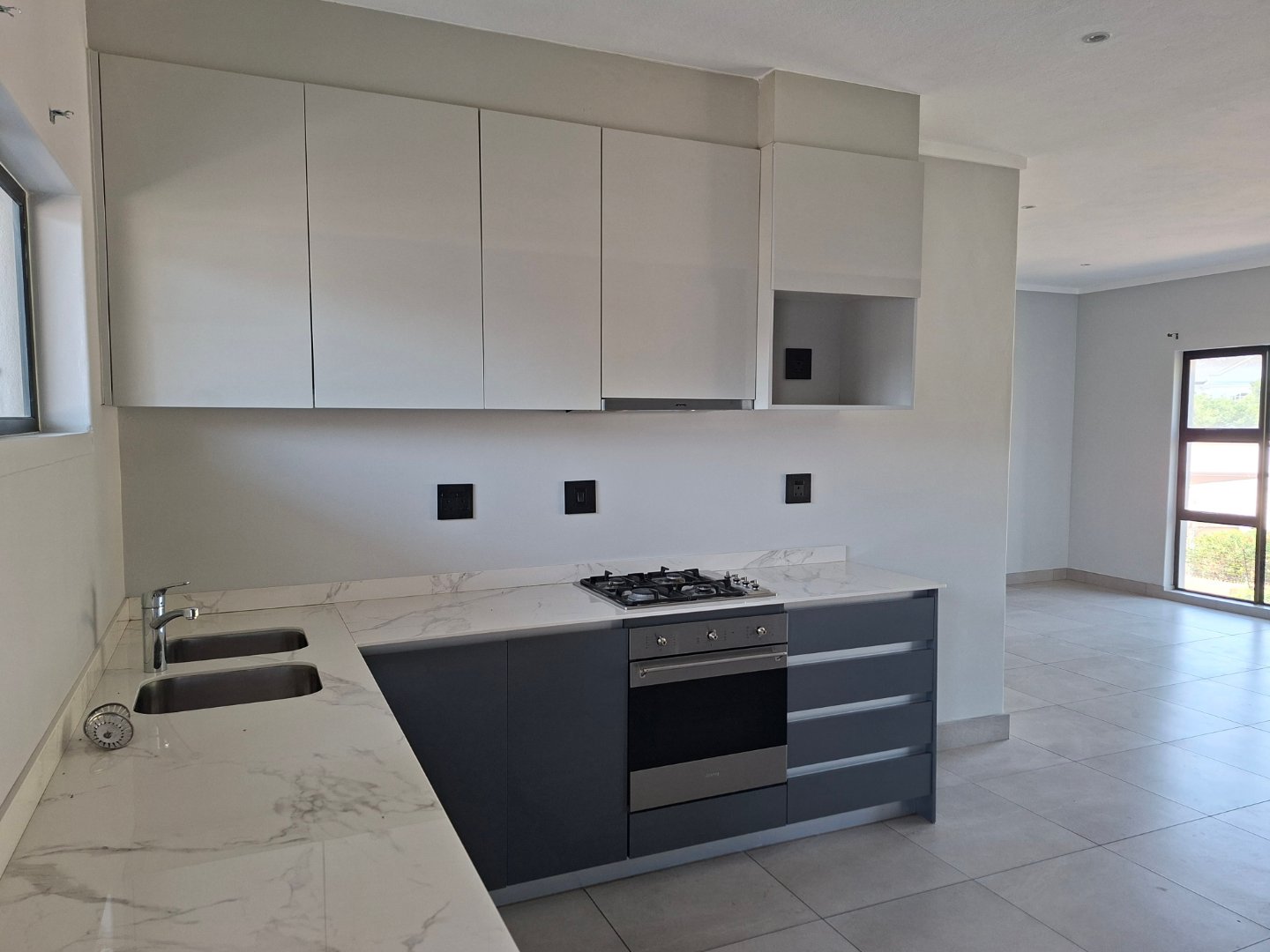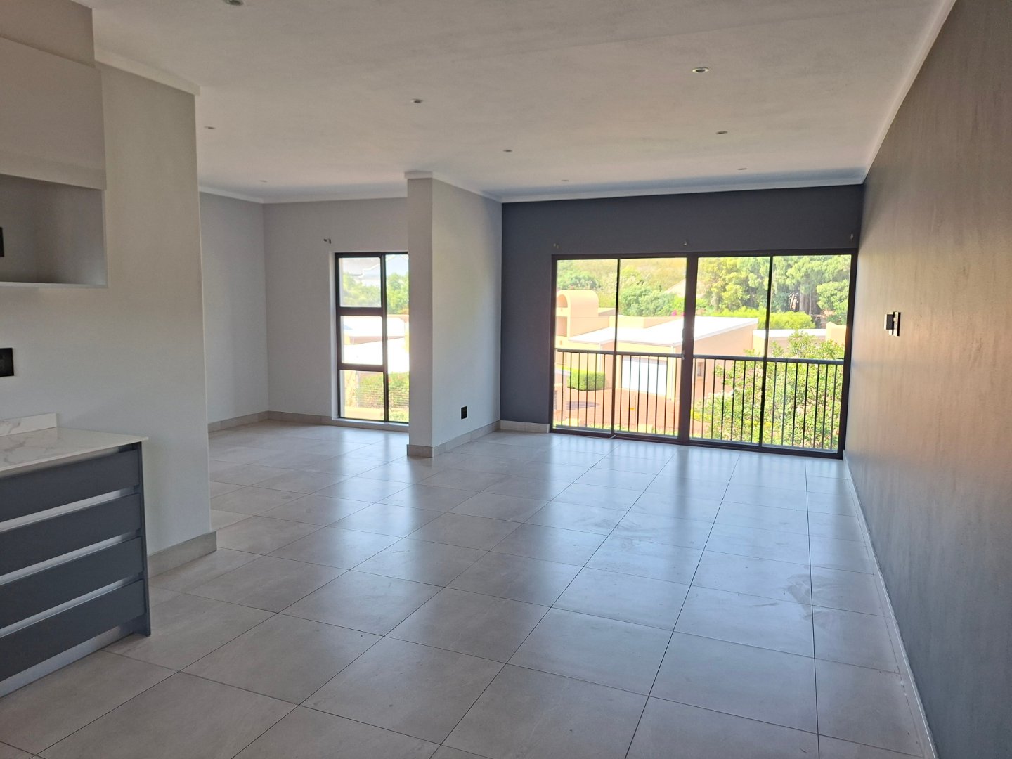 This modern one-bedroom, one-bathroom apartment is designed for a convenient and comfortable lifestyle. The open-plan living area features flooring and a neutral color palette with an accent wall, creating a spacious and inviting atmosphere. The kitchen seamlessly integrates with the living space, boasting glossy grey cabinetry, a gas stovetop (smeg) with an extractor fan, and a light-colored countertop.
