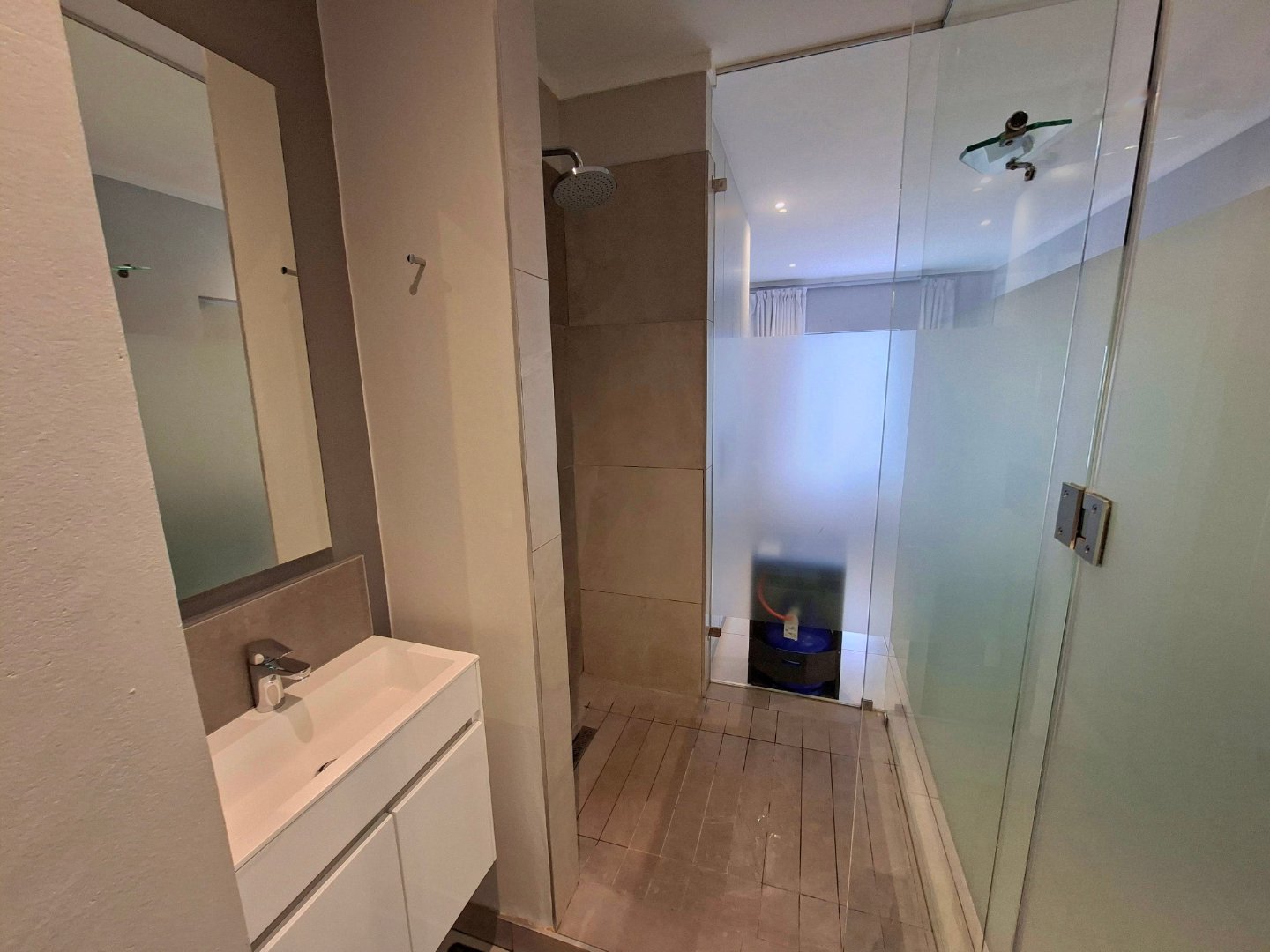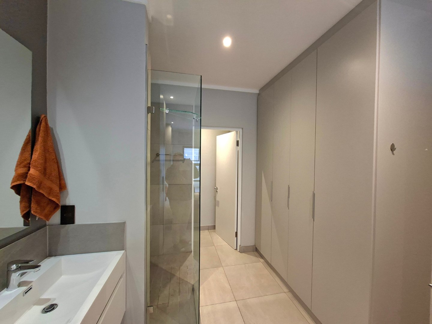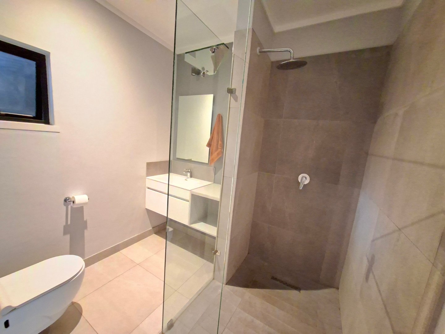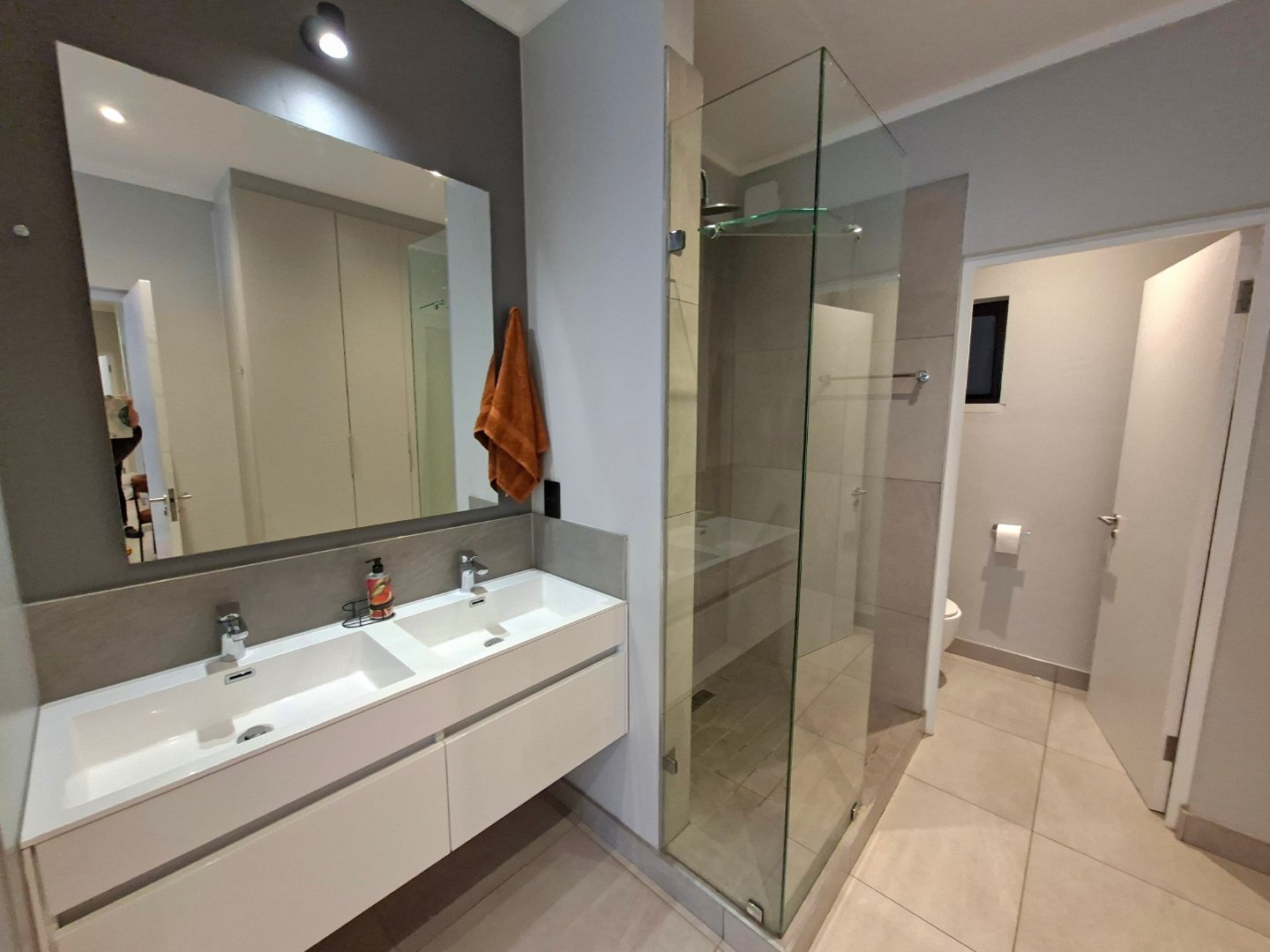 The two bedrooms are well-proportioned and feature tiled flooring, large windows, and built-in cupboards that offer excellent storage solutions. The main bedroom includes an en-suite bathroom.The main bathroom includes a large vanity with an integrated basin, and a separate walk-in shower with a glass enclosure. The second bathroom also has a walk-in shower with a glass enclosure and a vanity with a basin.