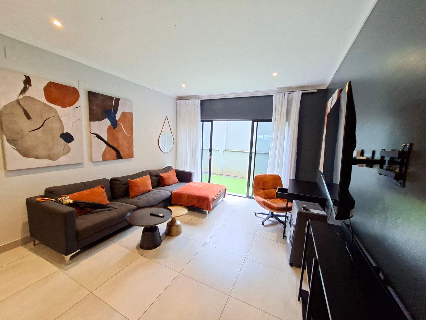 A modern two-bedroom, two-bathroom apartment is designed for a convenient and comfortable lifestyle. The open-plan living area features flooring and a neutral color palette with an accent wall, creating a spacious and inviting atmosphere. The kitchen seamlessly integrates with the living space, boasting glossy grey cabinetry, a gas stovetop (smeg) with an extractor fan, and a light-colored countertop.