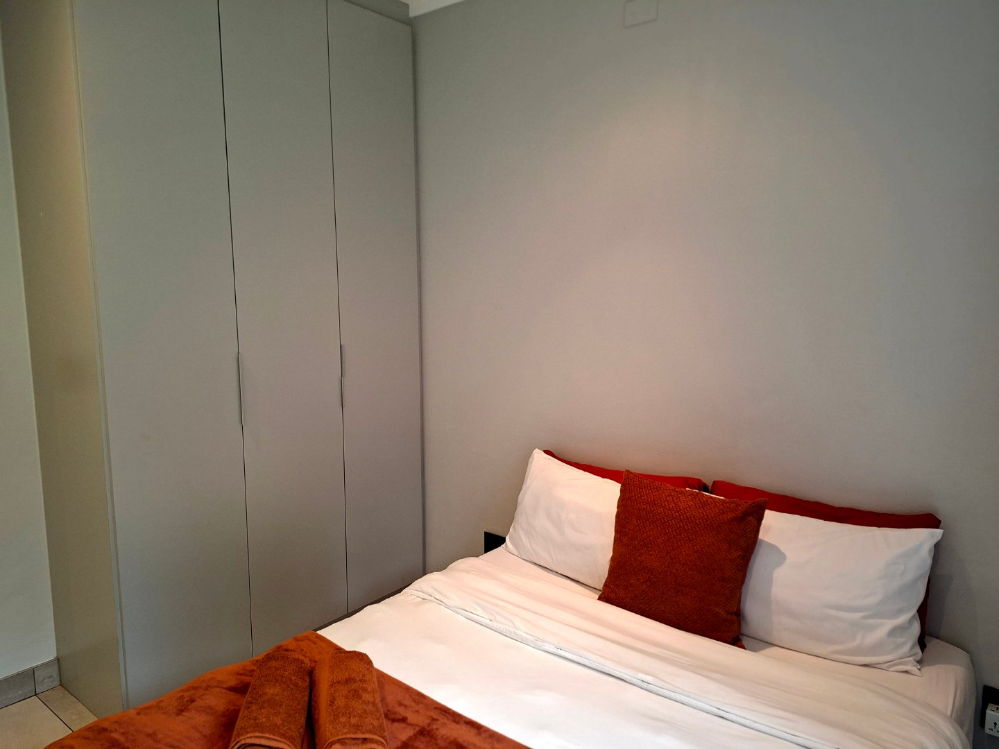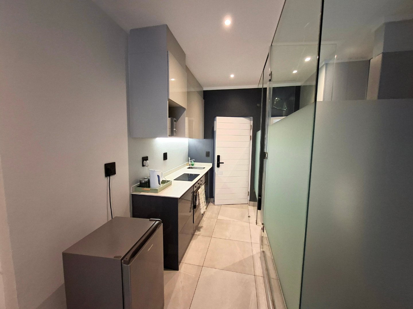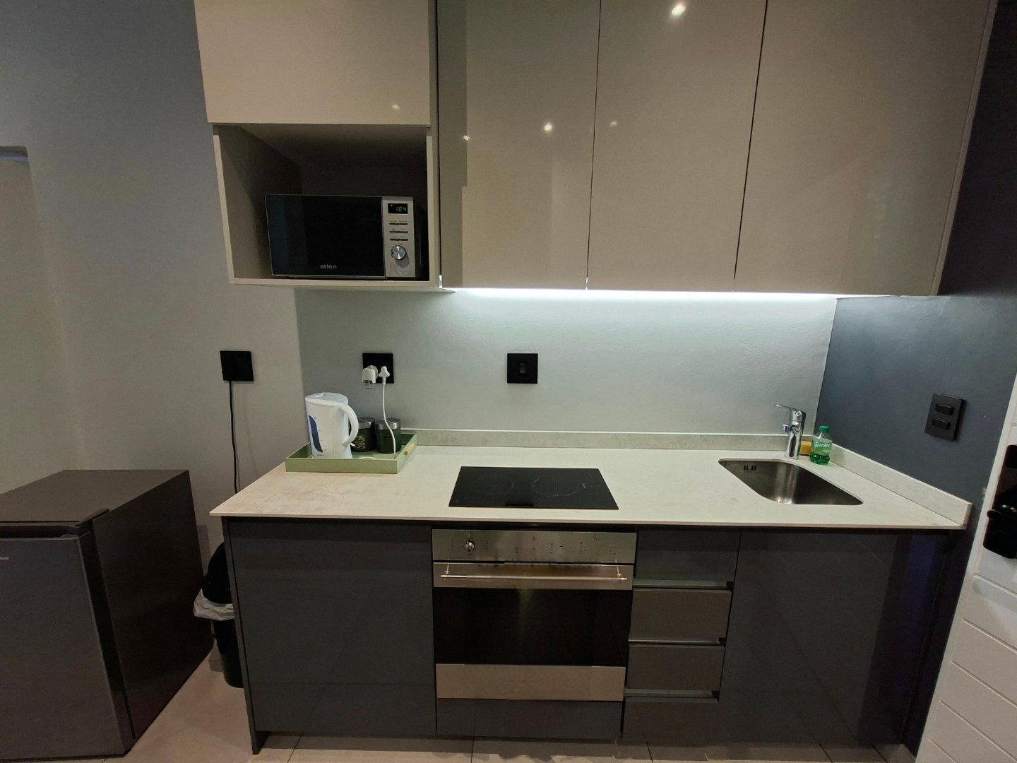 The one bedroom one bathroom unit offers a kitchenette with Smeg oven and hob. An en suite bathroom with a huge shower, basin and private toilet .