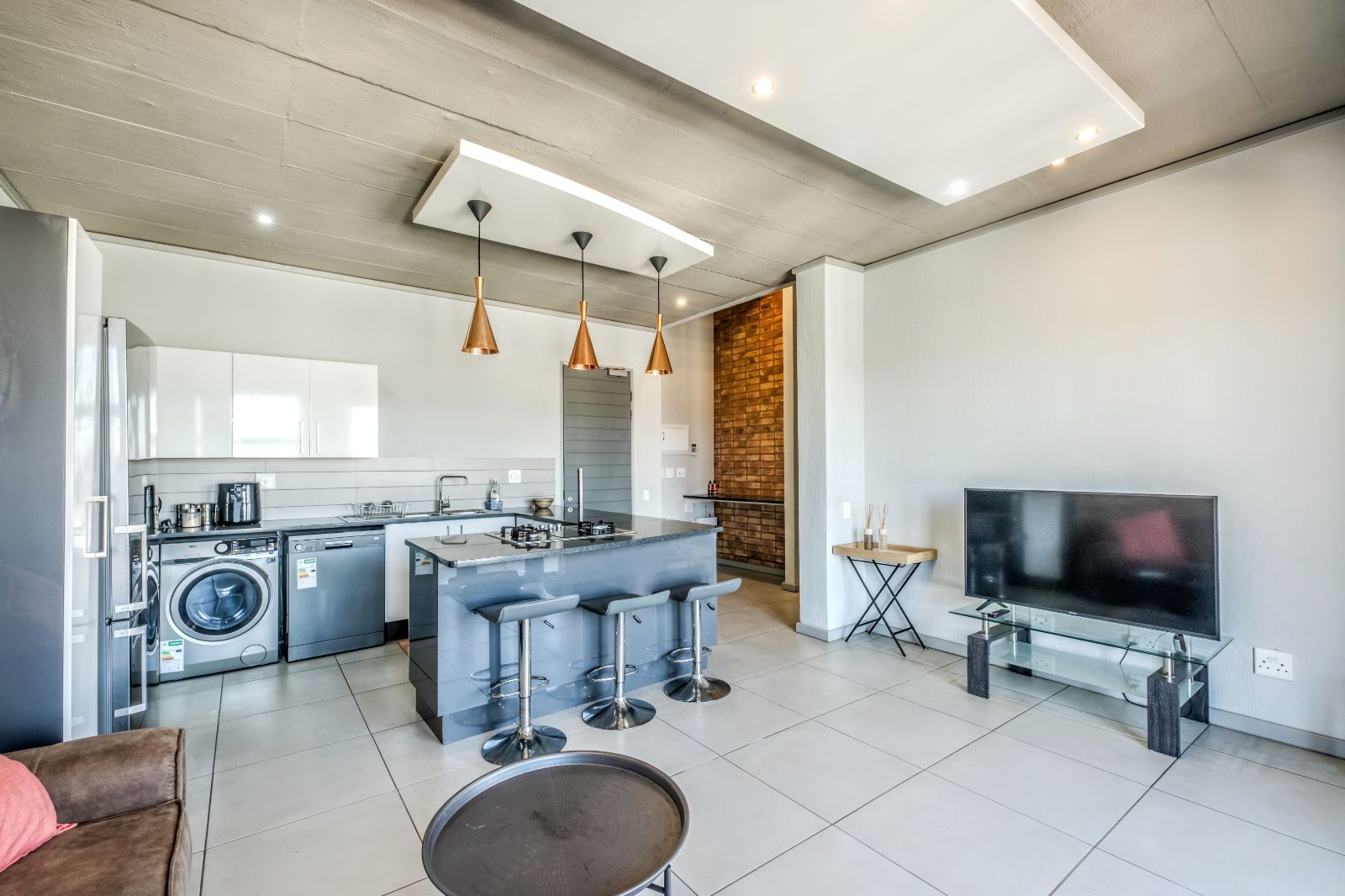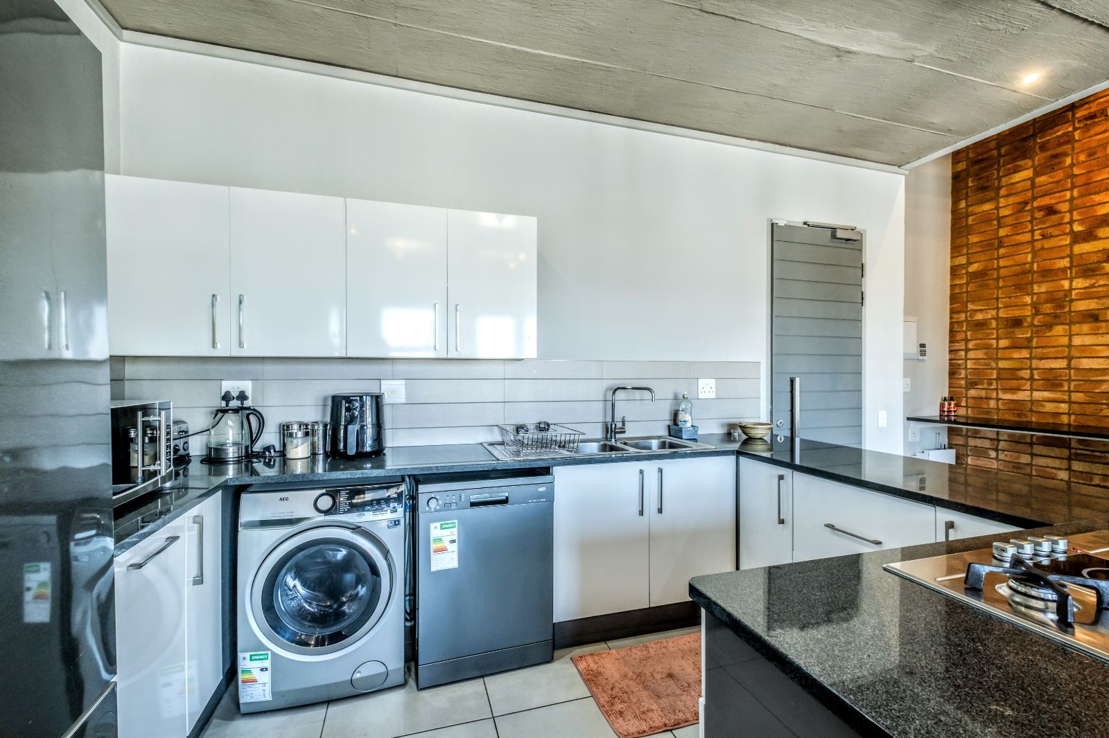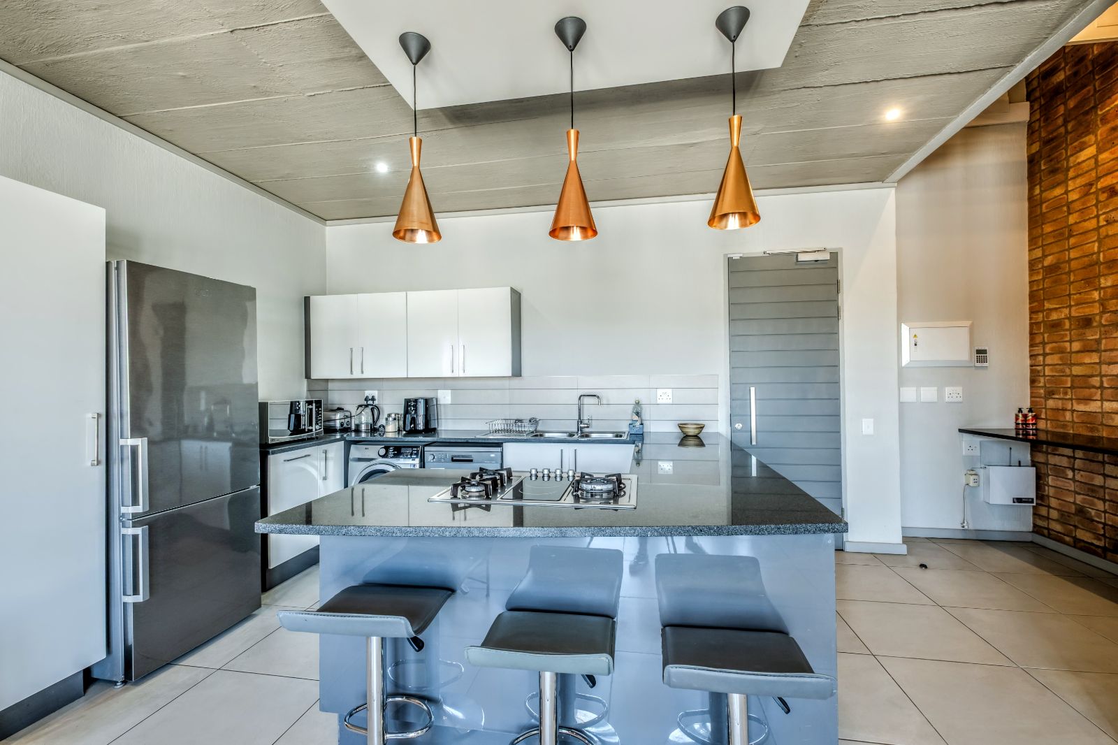 The kitchen combines sleek design with practicality: gas hob, electric oven, space for two under-counter appliances, and a semi-industrial flair that carries through to the rest of the unit. High-end finishes and modern tiling provide a cohesive and contemporary look.