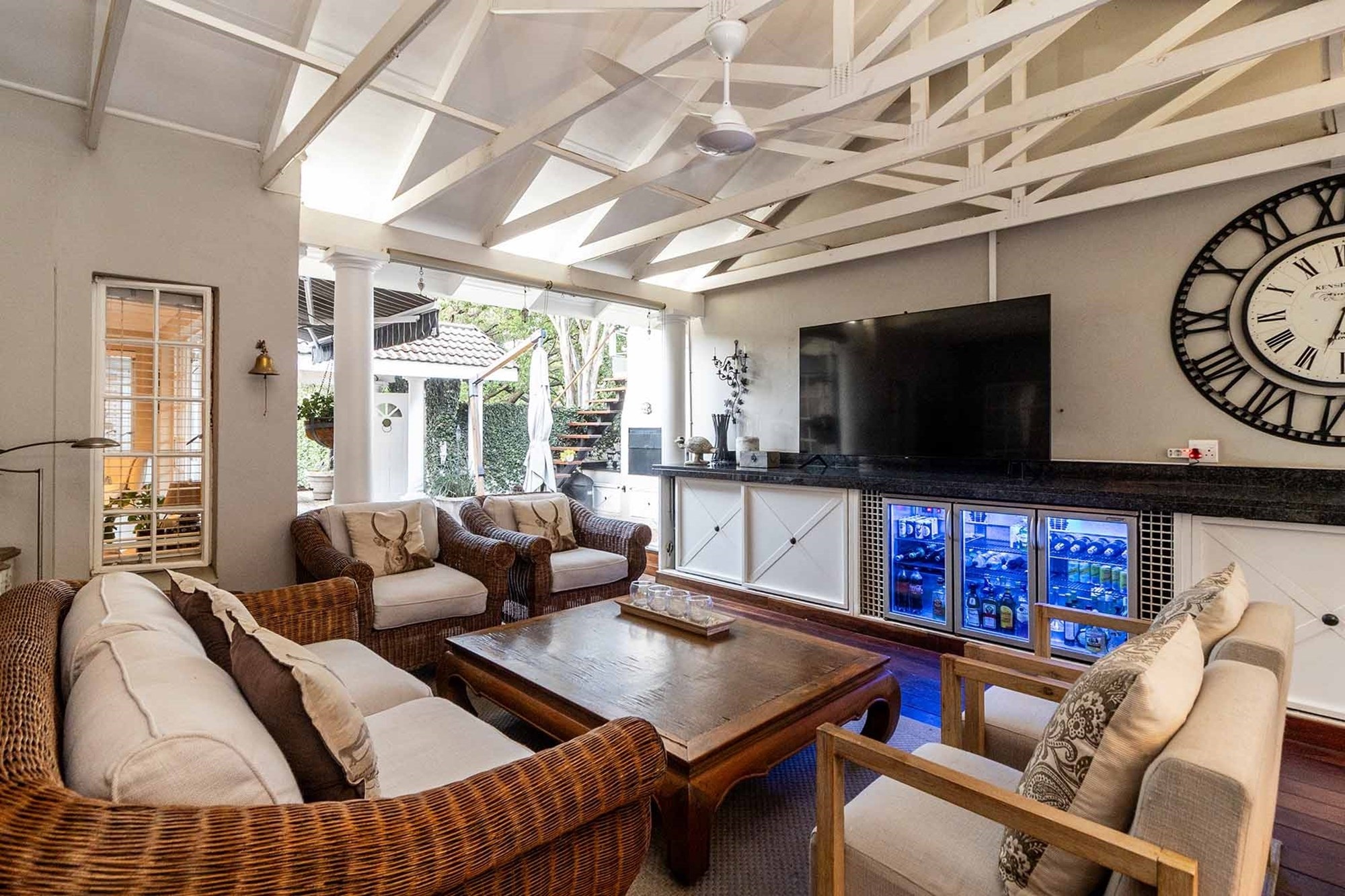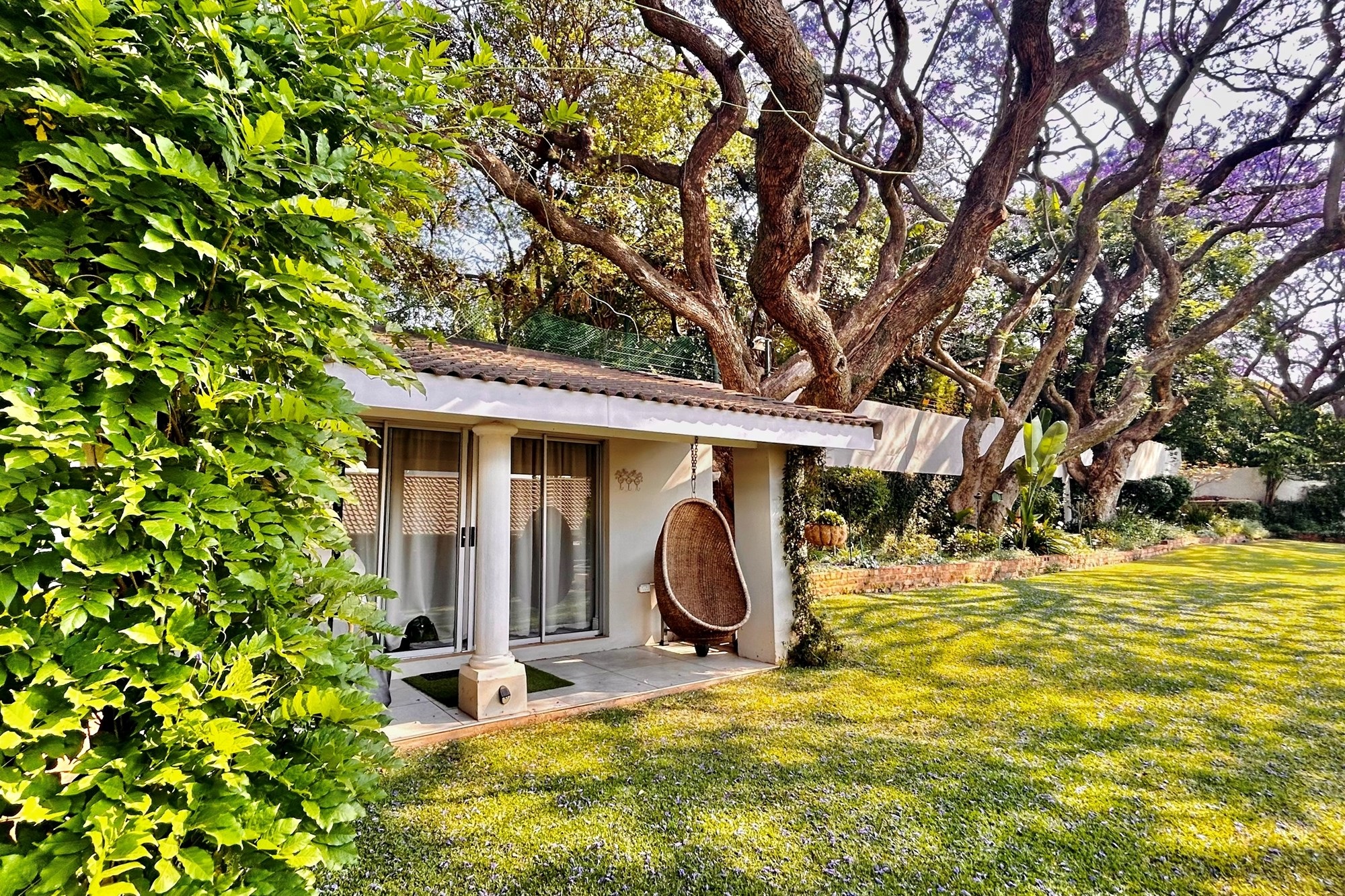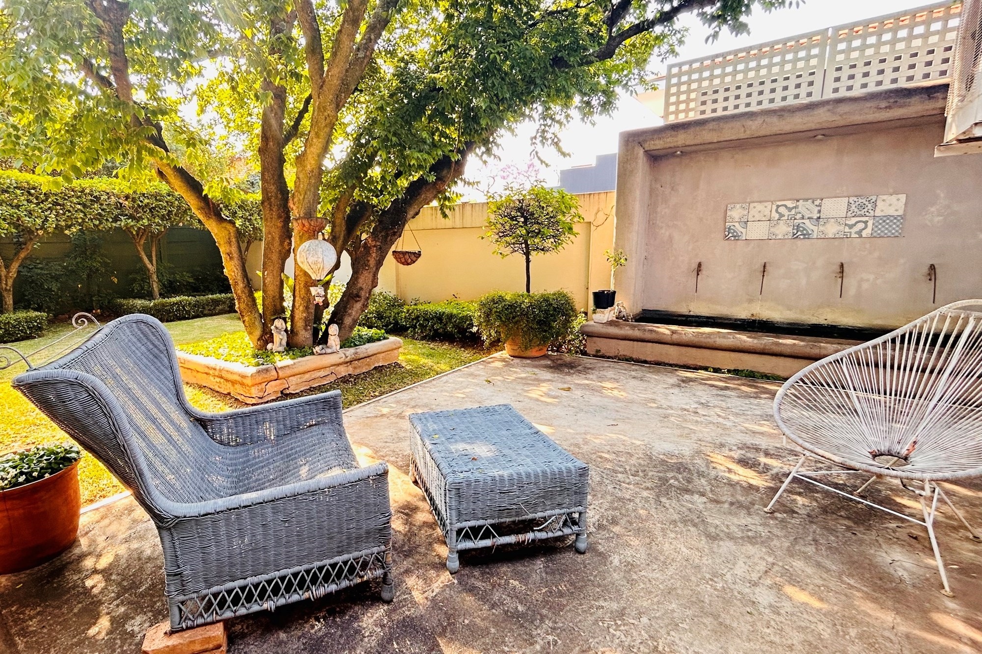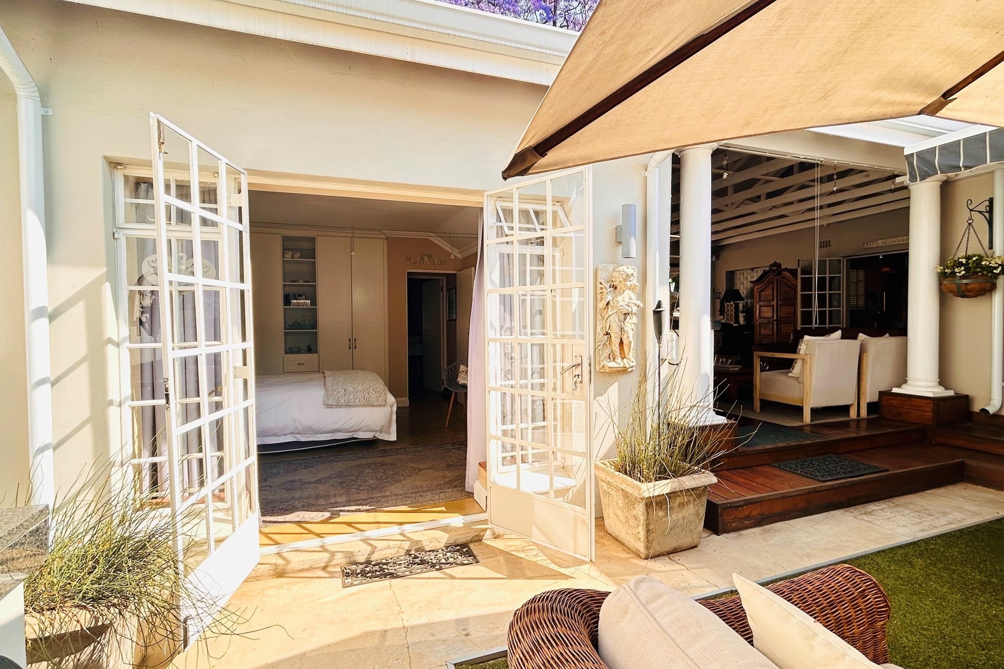 The private quarters are as exceptional as the living spaces. A massive master suite awaits with a generously sized dressing room, a beautifully styled bathroom featuring a freestanding bathtub, and a double walk-in shower. Step out to a tranquil, private courtyard with a soothing water feature, creating a personal sanctuary just steps from the bedroom. Two additional, elegantly appointed bedrooms offer their own sense of privacy, one with garden access leading to a grand boma area. The perfect spot for an evening around the fire, this outdoor space overlooks the lush lawn framed by towering jacaranda trees.