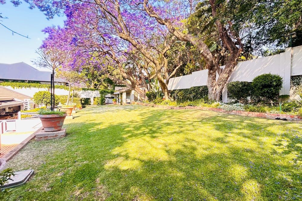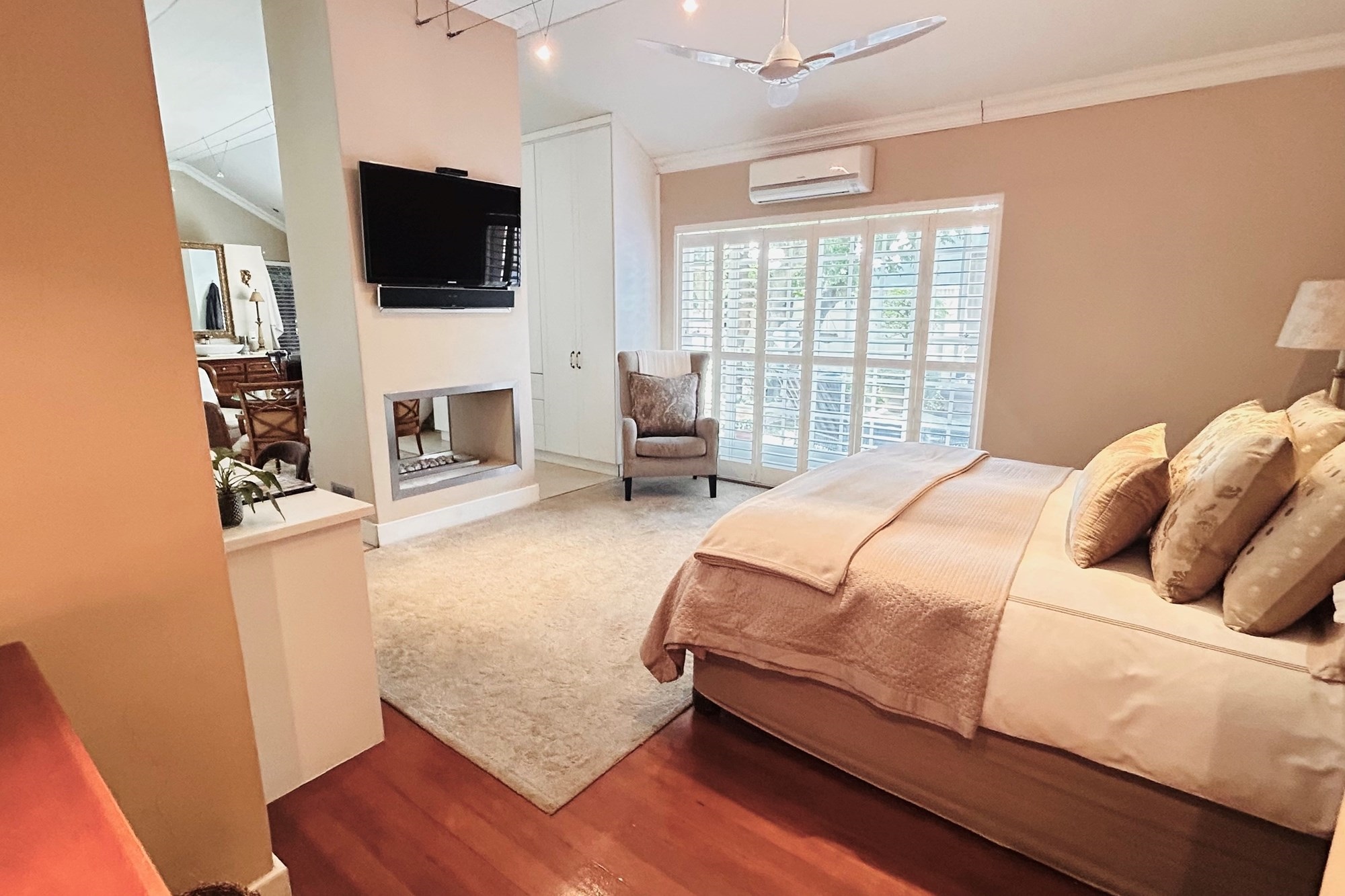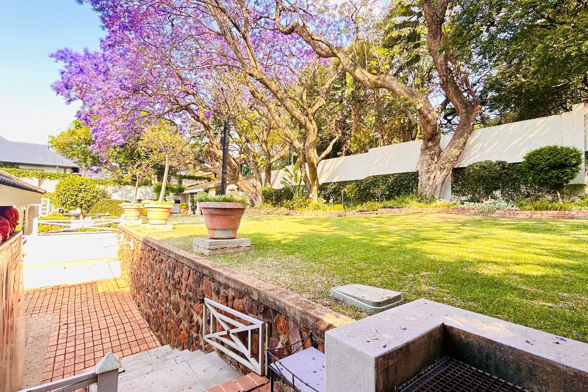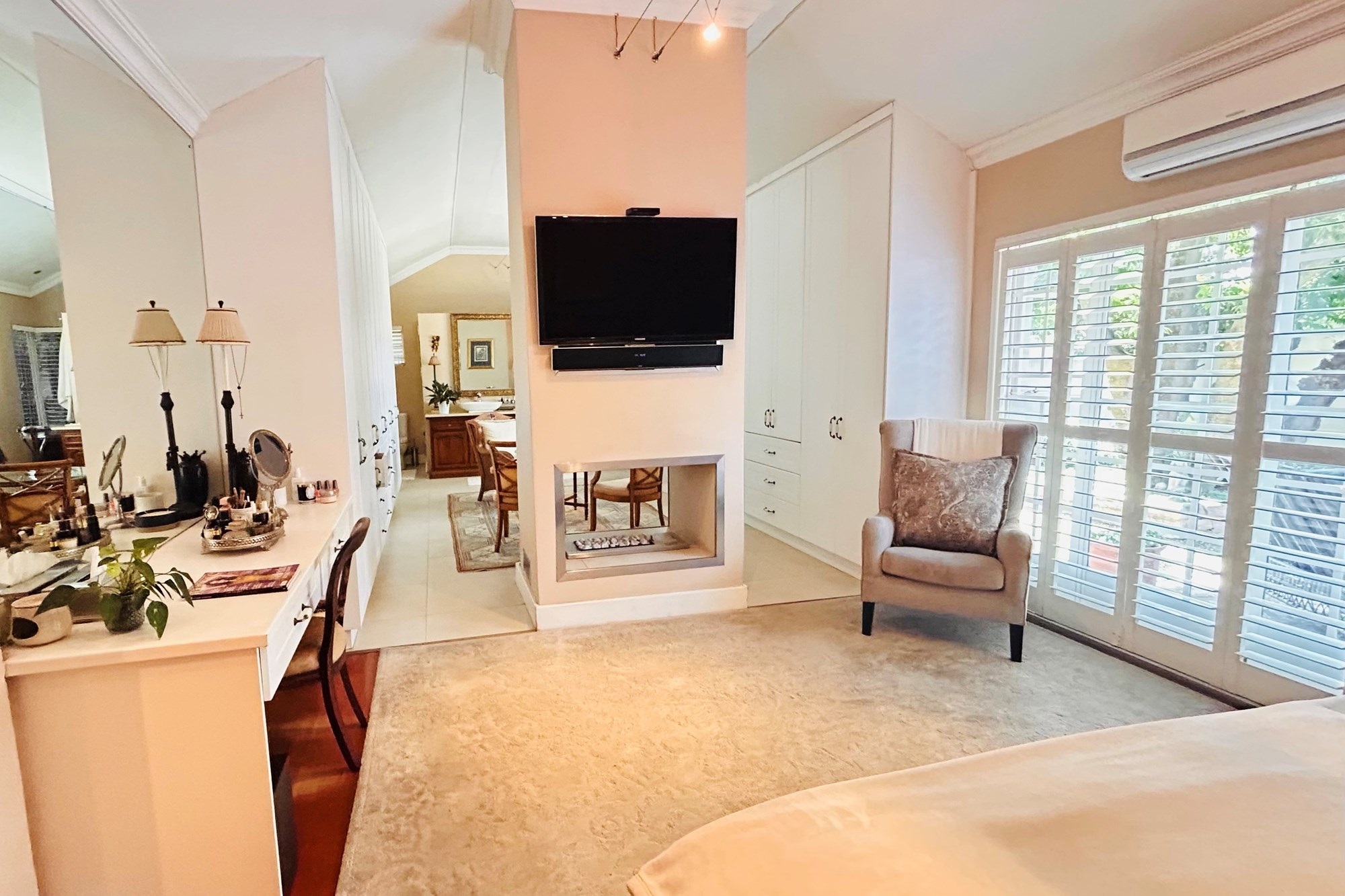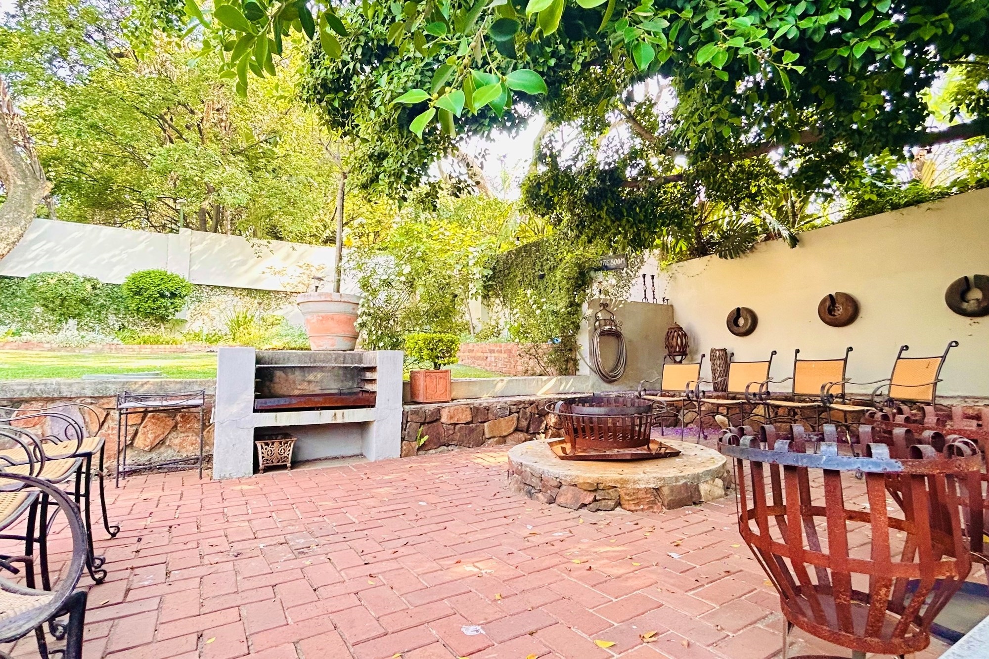 The private quarters are as exceptional as the living spaces. A massive master suite awaits with a generously sized dressing room, a beautifully styled bathroom featuring a freestanding bathtub, and a double walk-in shower. Step out to a tranquil, private courtyard with a soothing water feature, creating a personal sanctuary just steps from the bedroom. Two additional, elegantly appointed bedrooms offer their own sense of privacy, one with garden access leading to a grand boma area. The perfect spot for an evening around the fire, this outdoor space overlooks the lush lawn framed by towering jacaranda trees.