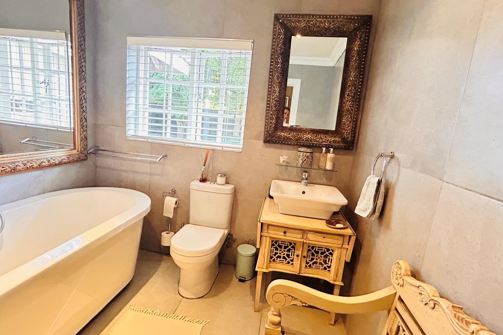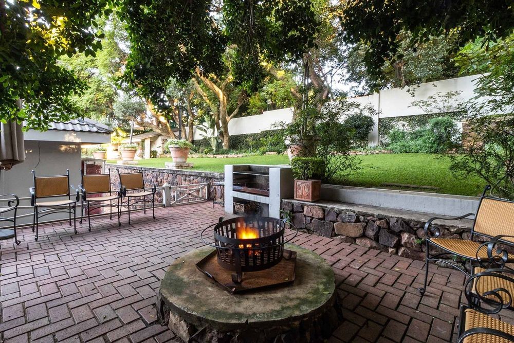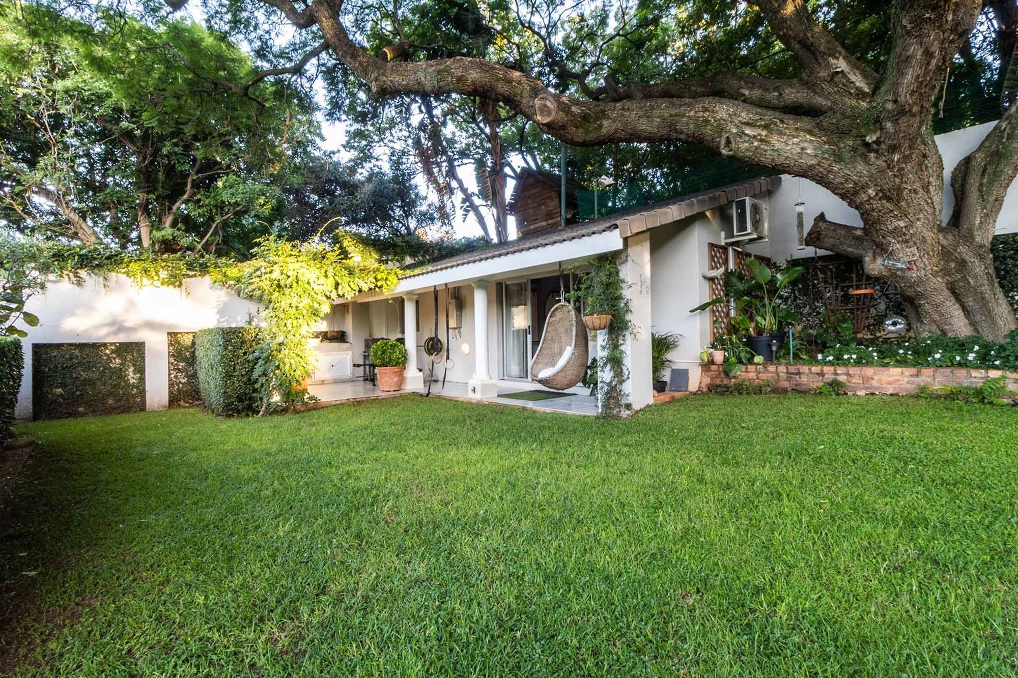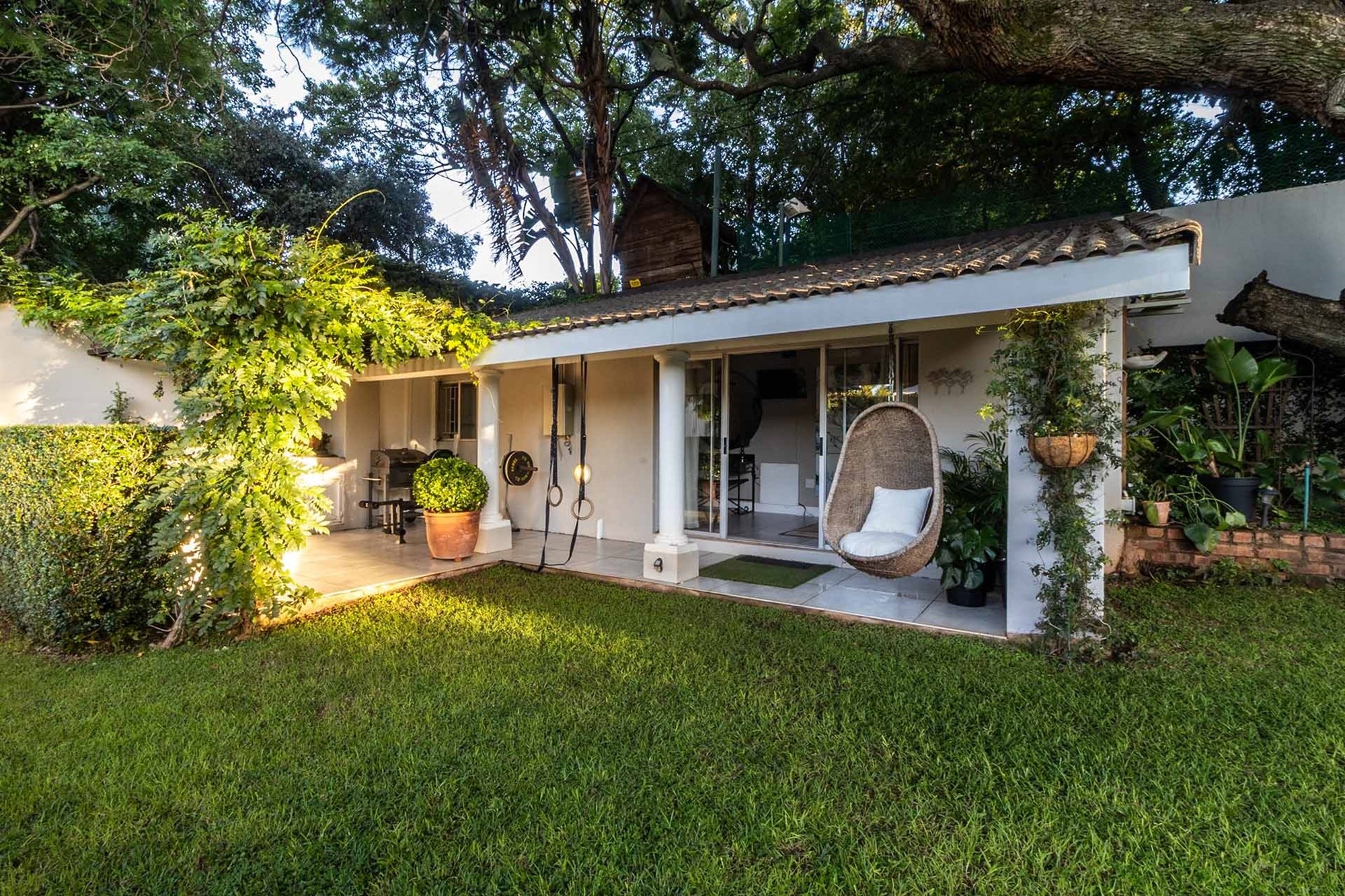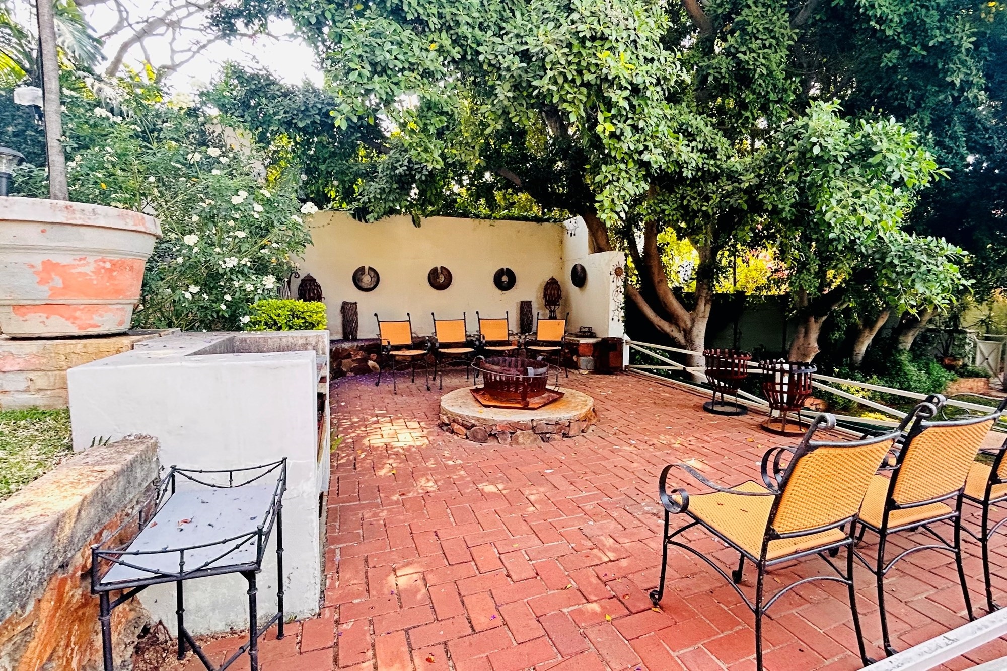 The private quarters are as exceptional as the living spaces. A massive master suite awaits with a generously sized dressing room, a beautifully styled bathroom featuring a freestanding bathtub, and a double walk-in shower. Step out to a tranquil, private courtyard with a soothing water feature, creating a personal sanctuary just steps from the bedroom. Two additional, elegantly appointed bedrooms offer their own sense of privacy, one with garden access leading to a grand boma area. The perfect spot for an evening around the fire, this outdoor space overlooks the lush lawn framed by towering jacaranda trees.