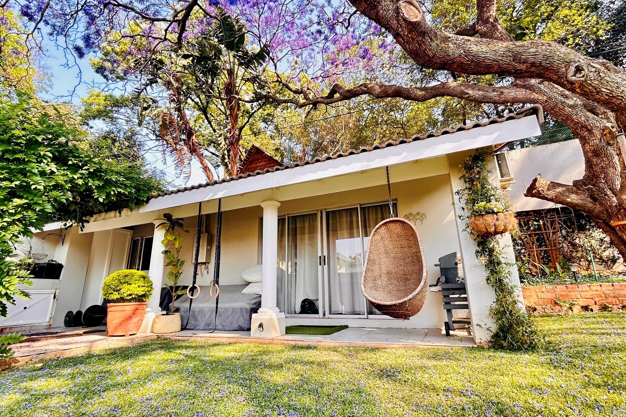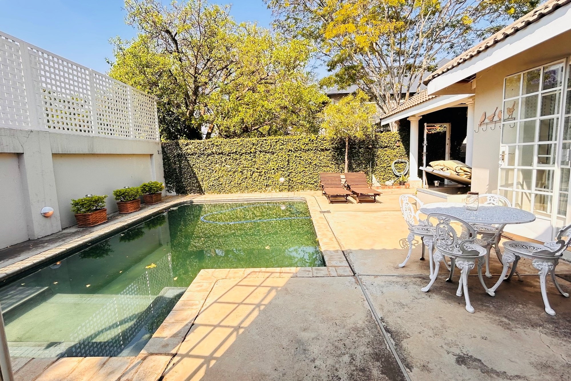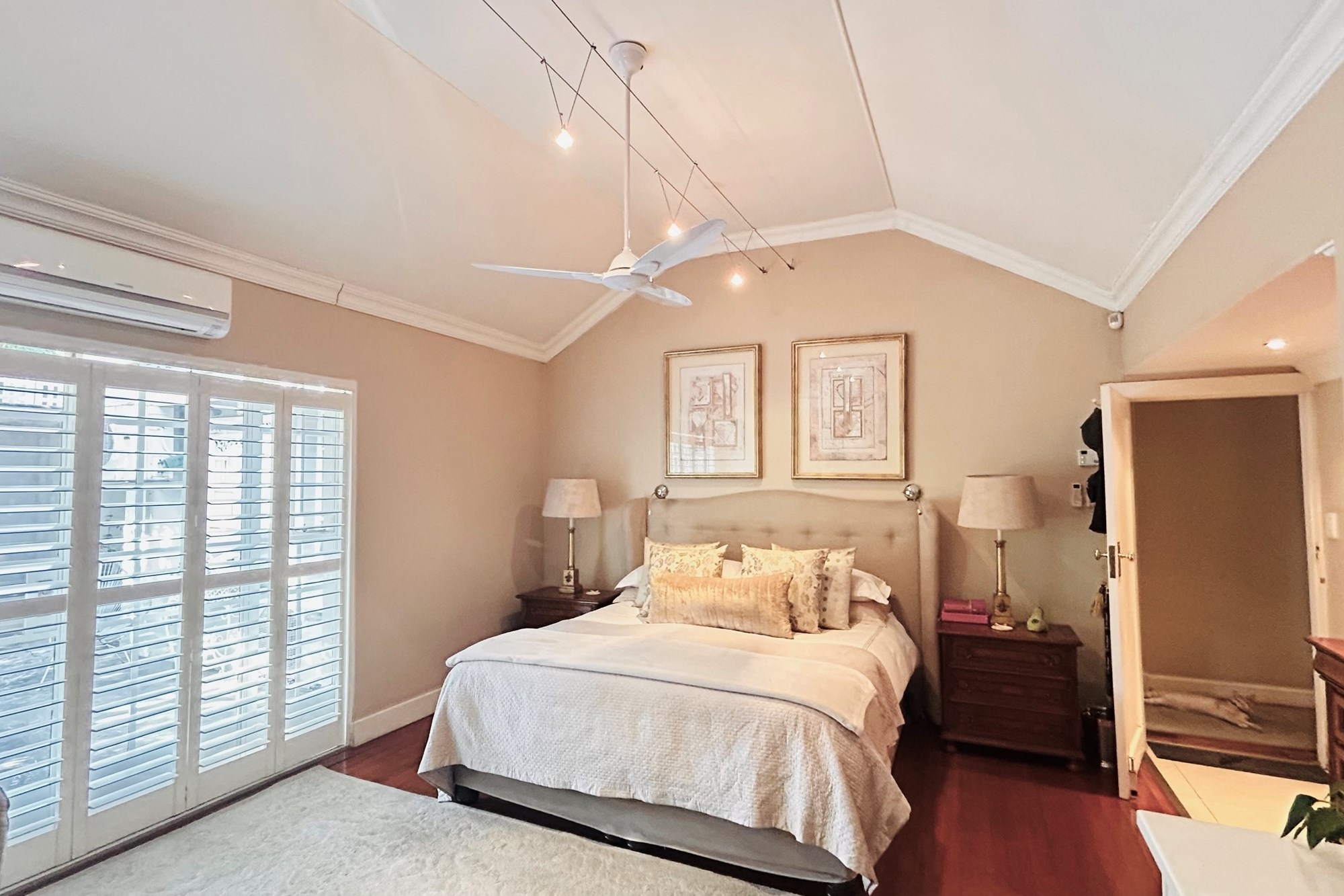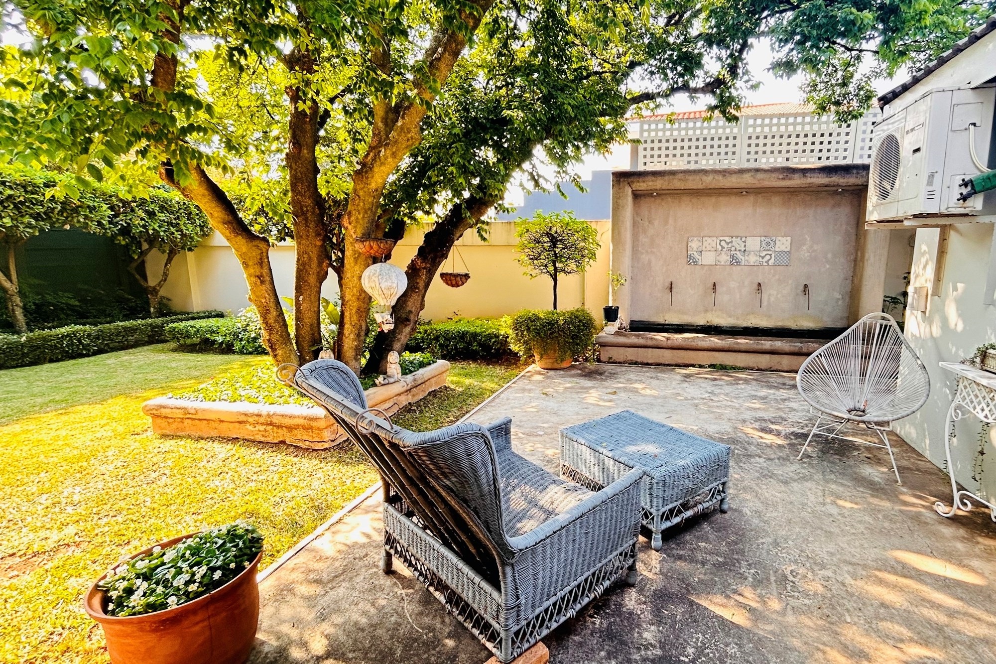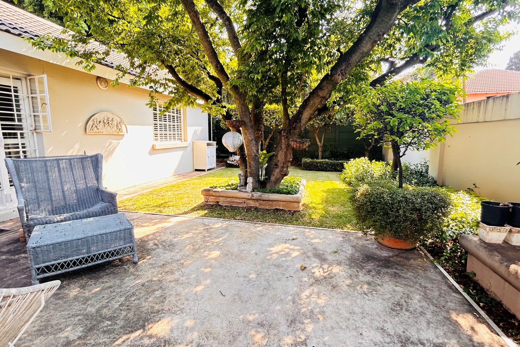 The private quarters are as exceptional as the living spaces. A massive master suite awaits with a generously sized dressing room, a beautifully styled bathroom featuring a freestanding bathtub, and a double walk-in shower. Step out to a tranquil, private courtyard with a soothing water feature, creating a personal sanctuary just steps from the bedroom. Two additional, elegantly appointed bedrooms offer their own sense of privacy, one with garden access leading to a grand boma area. The perfect spot for an evening around the fire, this outdoor space overlooks the lush lawn framed by towering jacaranda trees.