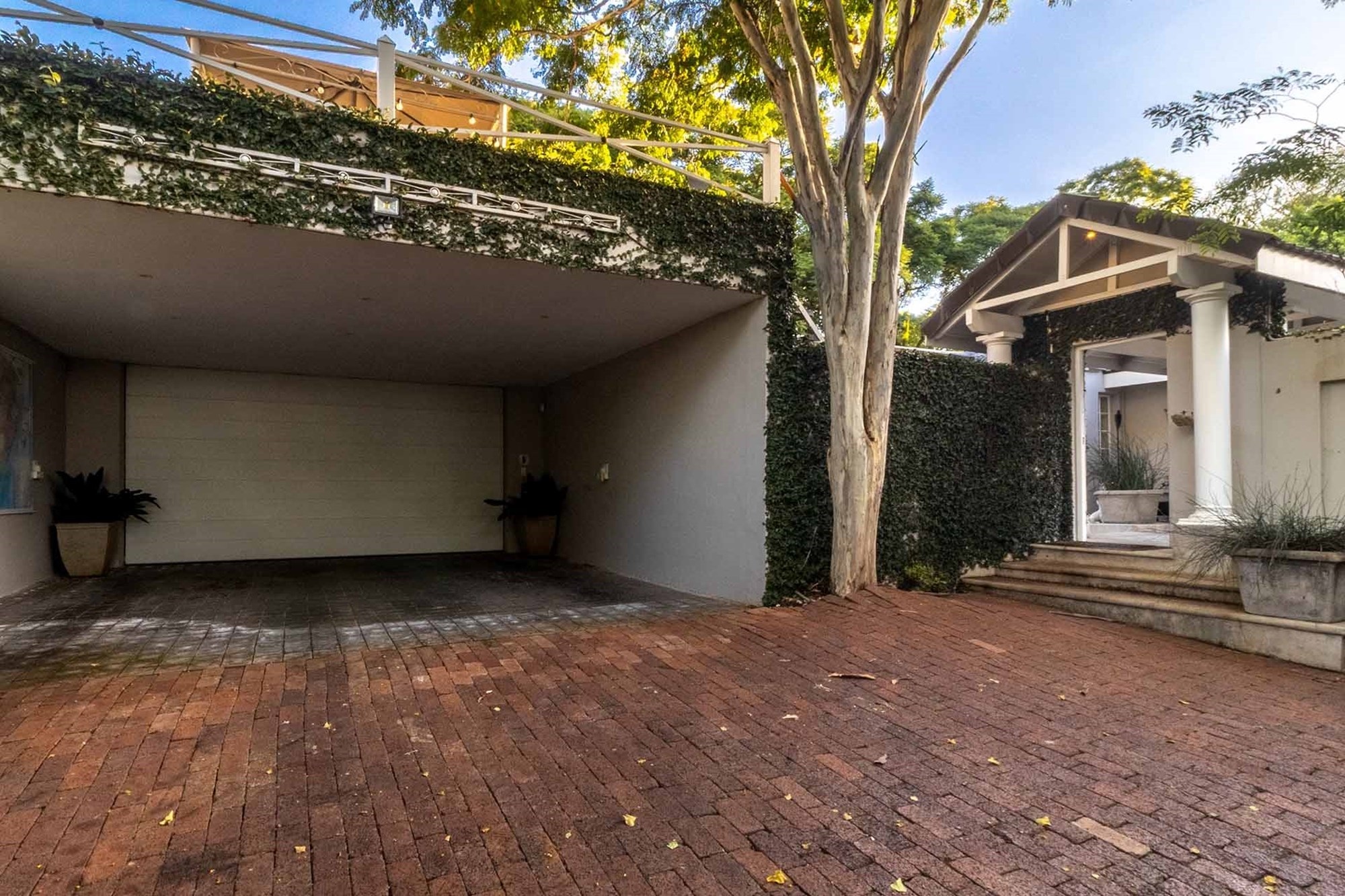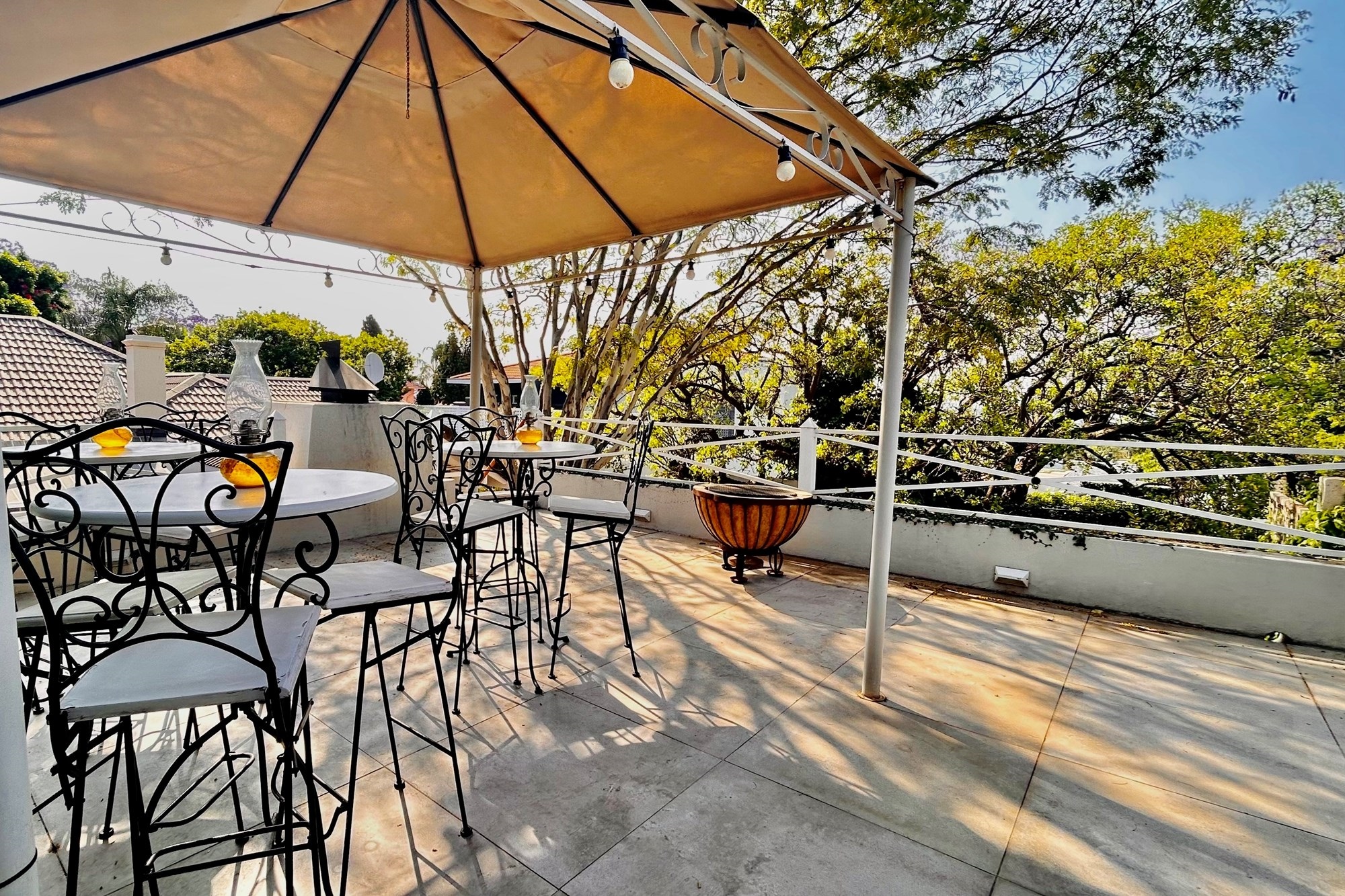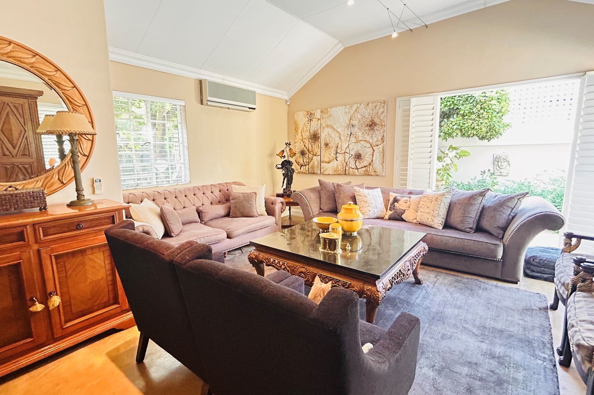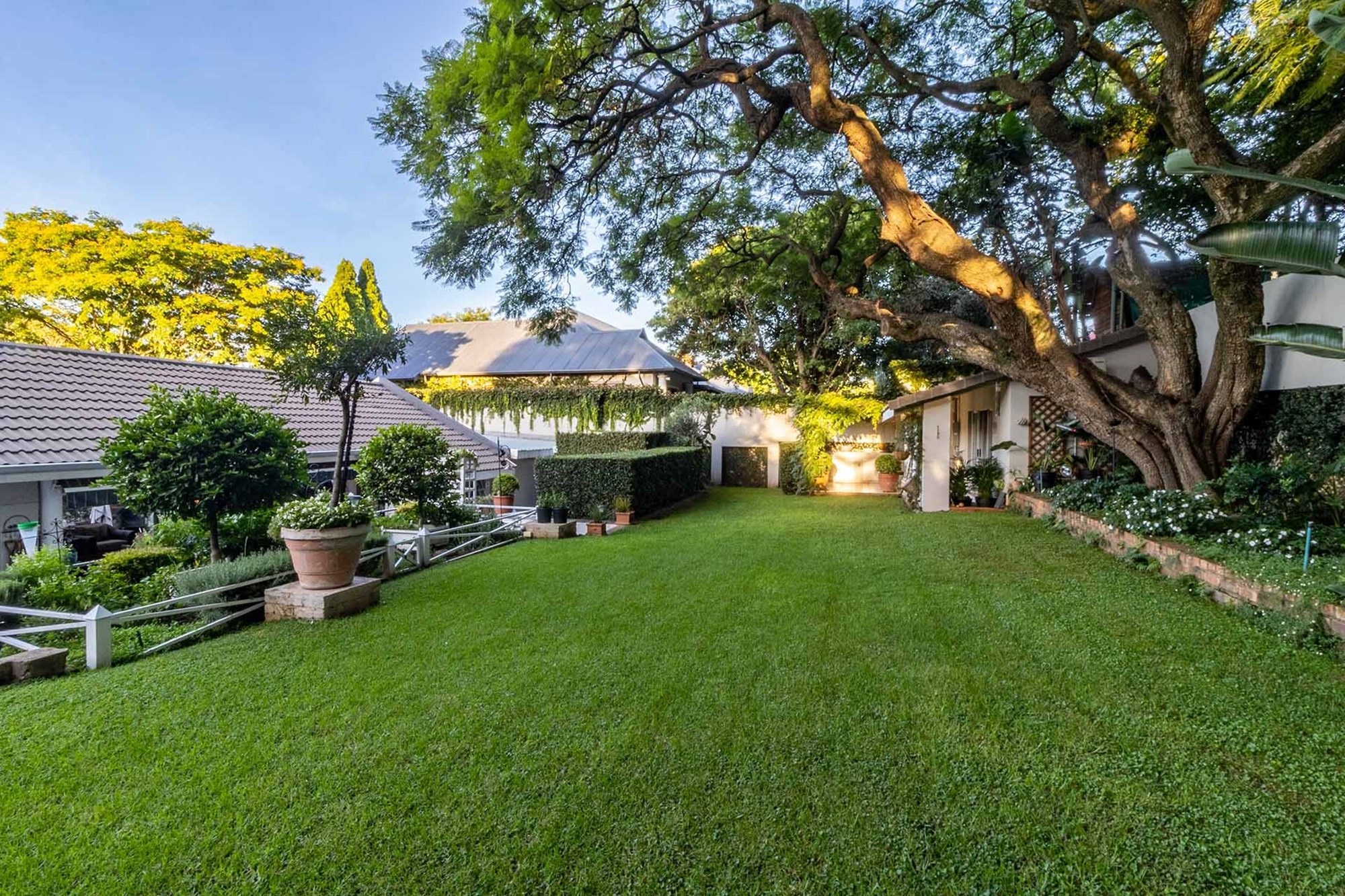 The private quarters are as exceptional as the living spaces. A massive master suite awaits with a generously sized dressing room, a beautifully styled bathroom featuring a freestanding bathtub, and a double walk-in shower. Step out to a tranquil, private courtyard with a soothing water feature, creating a personal sanctuary just steps from the bedroom. Two additional, elegantly appointed bedrooms offer their own sense of privacy, one with garden access leading to a grand boma area. The perfect spot for an evening around the fire, this outdoor space overlooks the lush lawn framed by towering jacaranda trees.