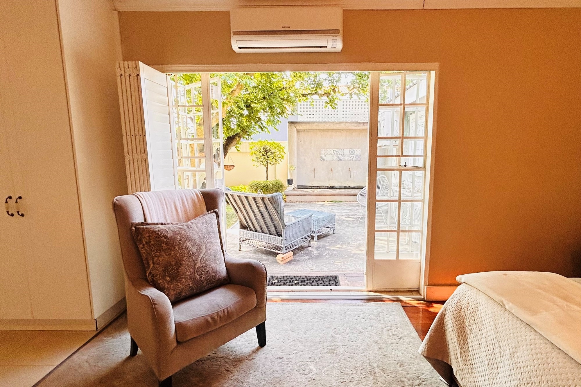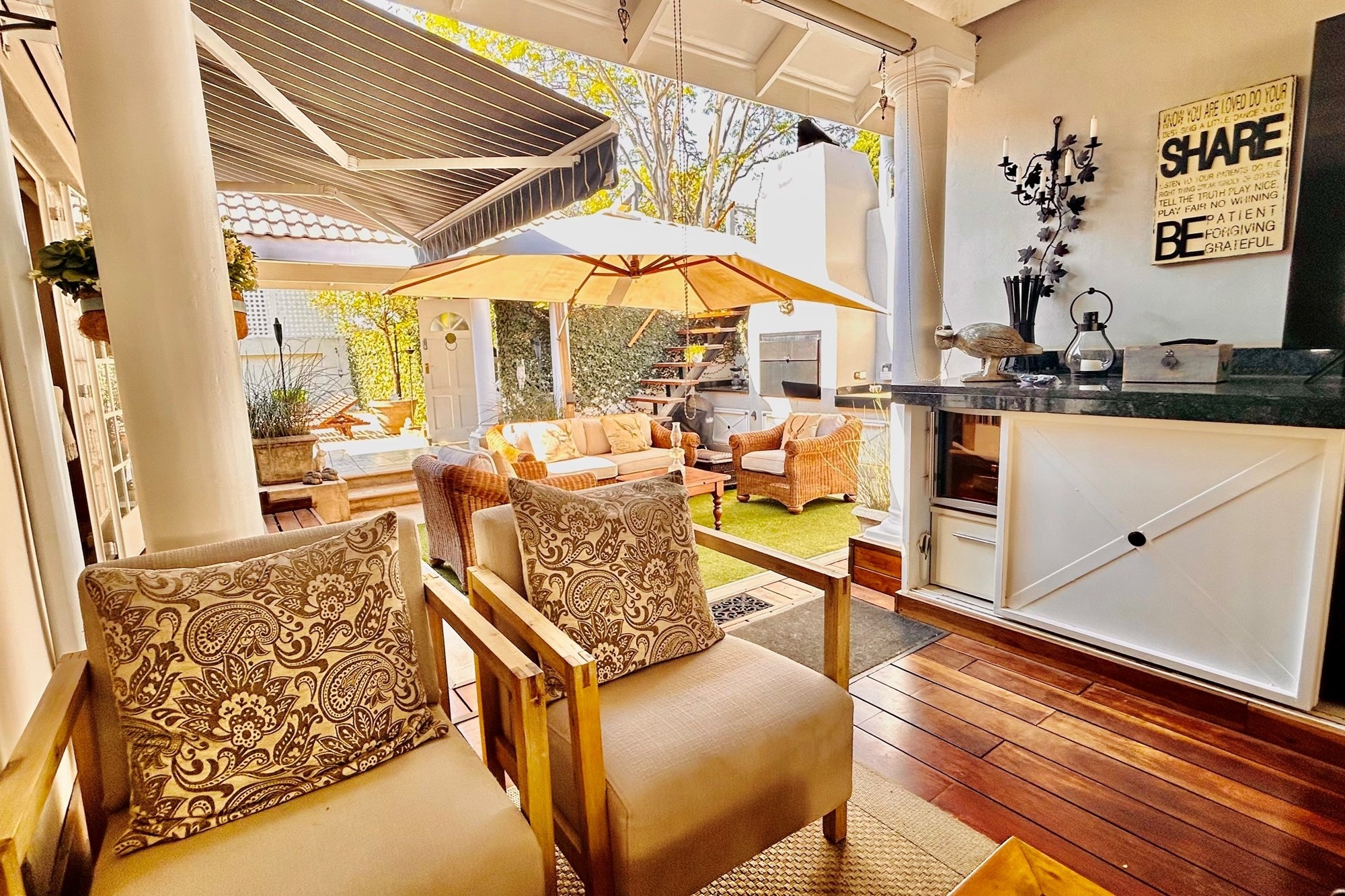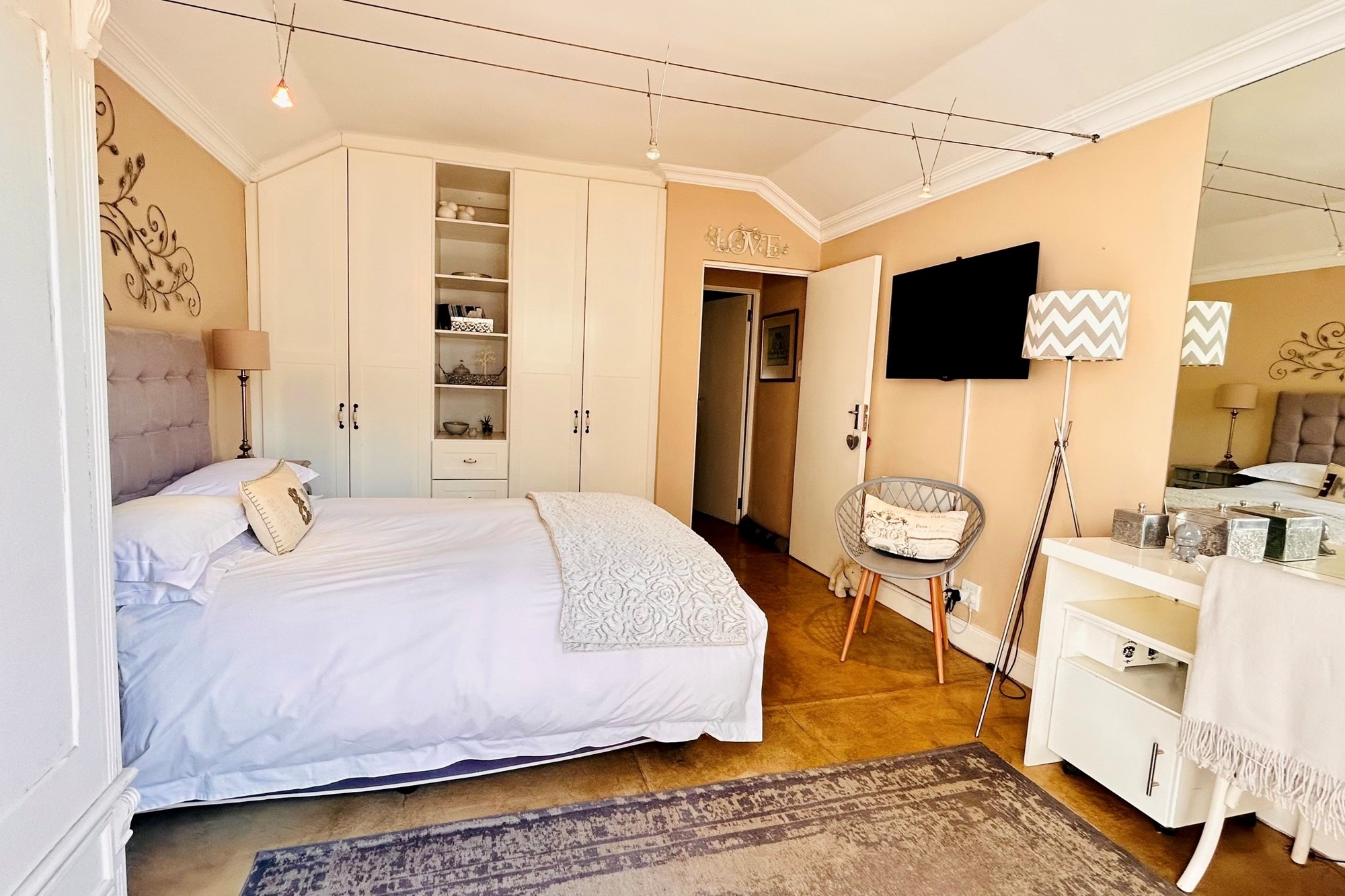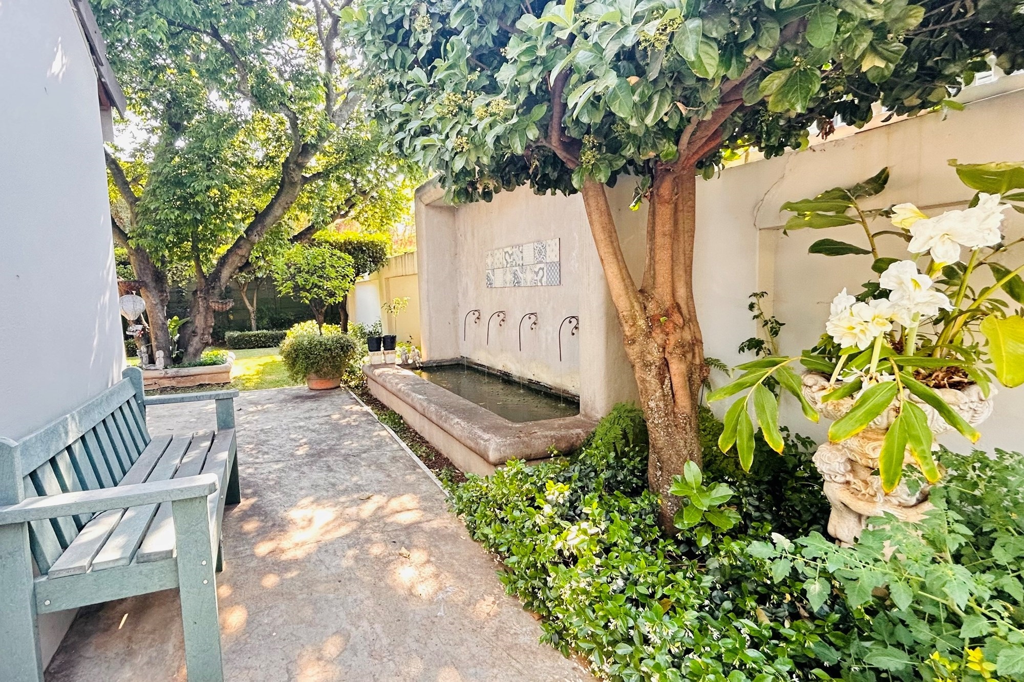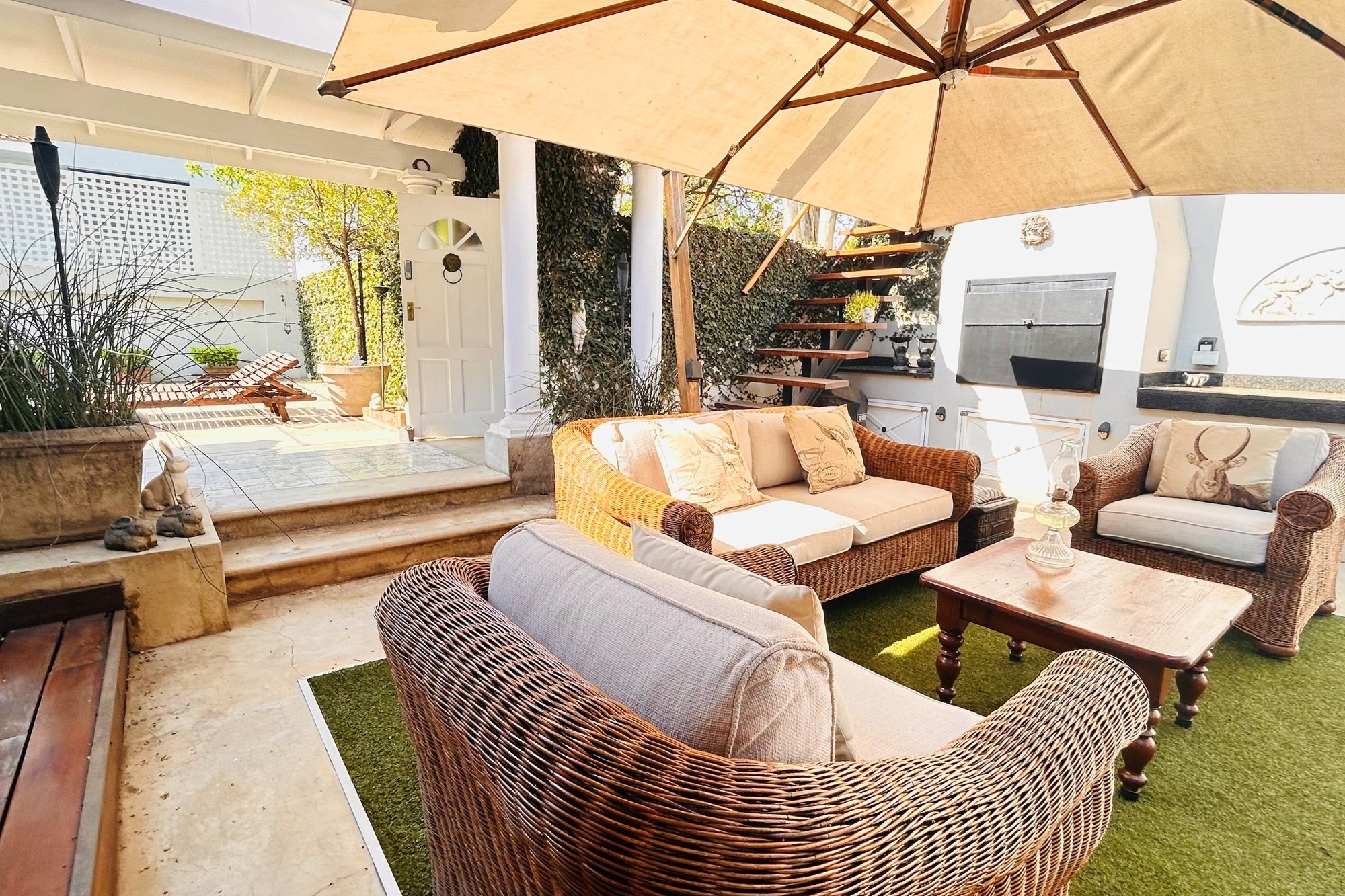 Tucked away in a peaceful corner of the garden, a charming flatlet offers a Cape-style retreat. Surrounded by trees and furnished with an ensuite, coffee station, and air conditioning, this standalone unit boasts an outdoor seating and braai area, ideal for guests or extended family. With a bright white, Winelands-inspired aesthetic, it’s a slice of pure serenity.